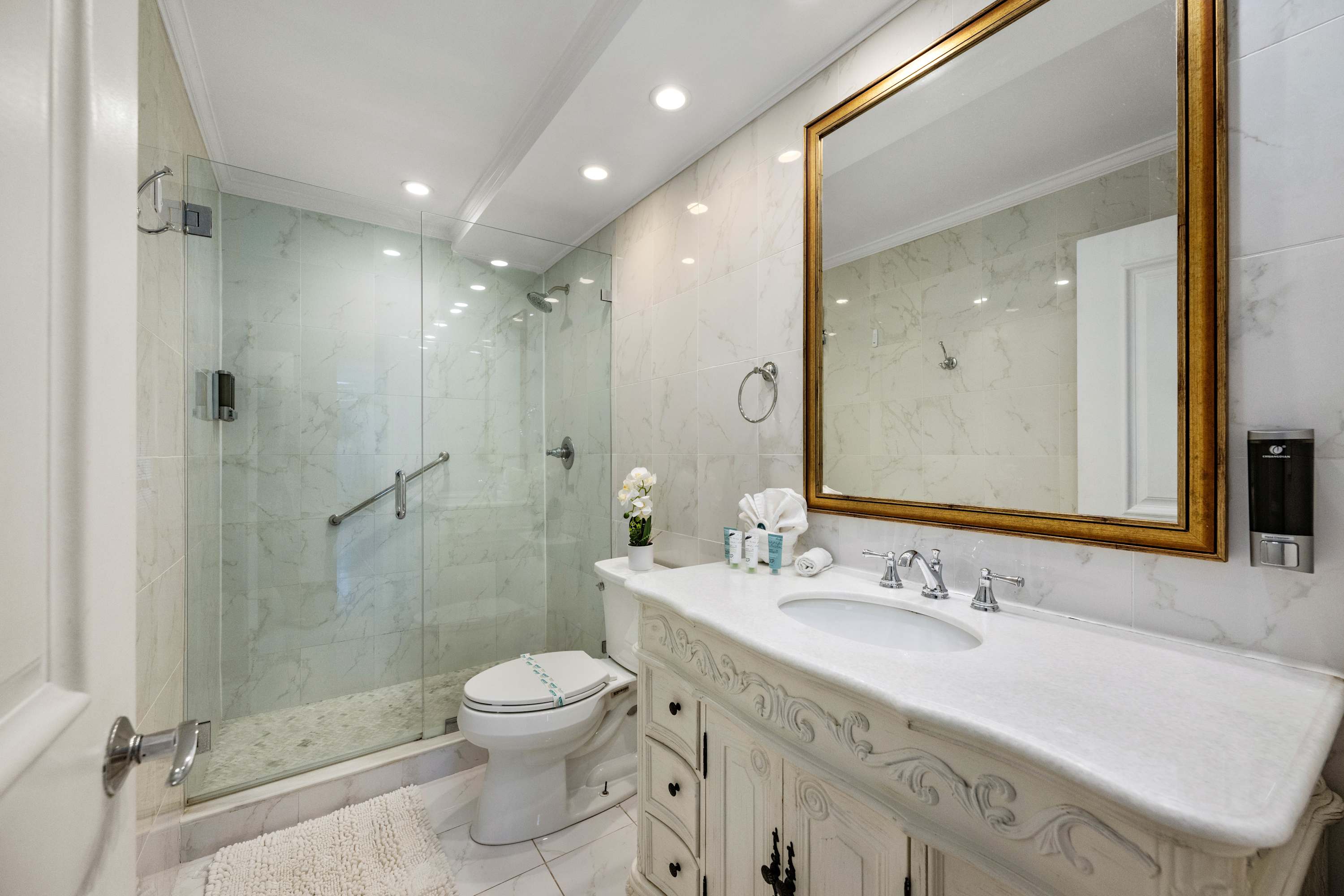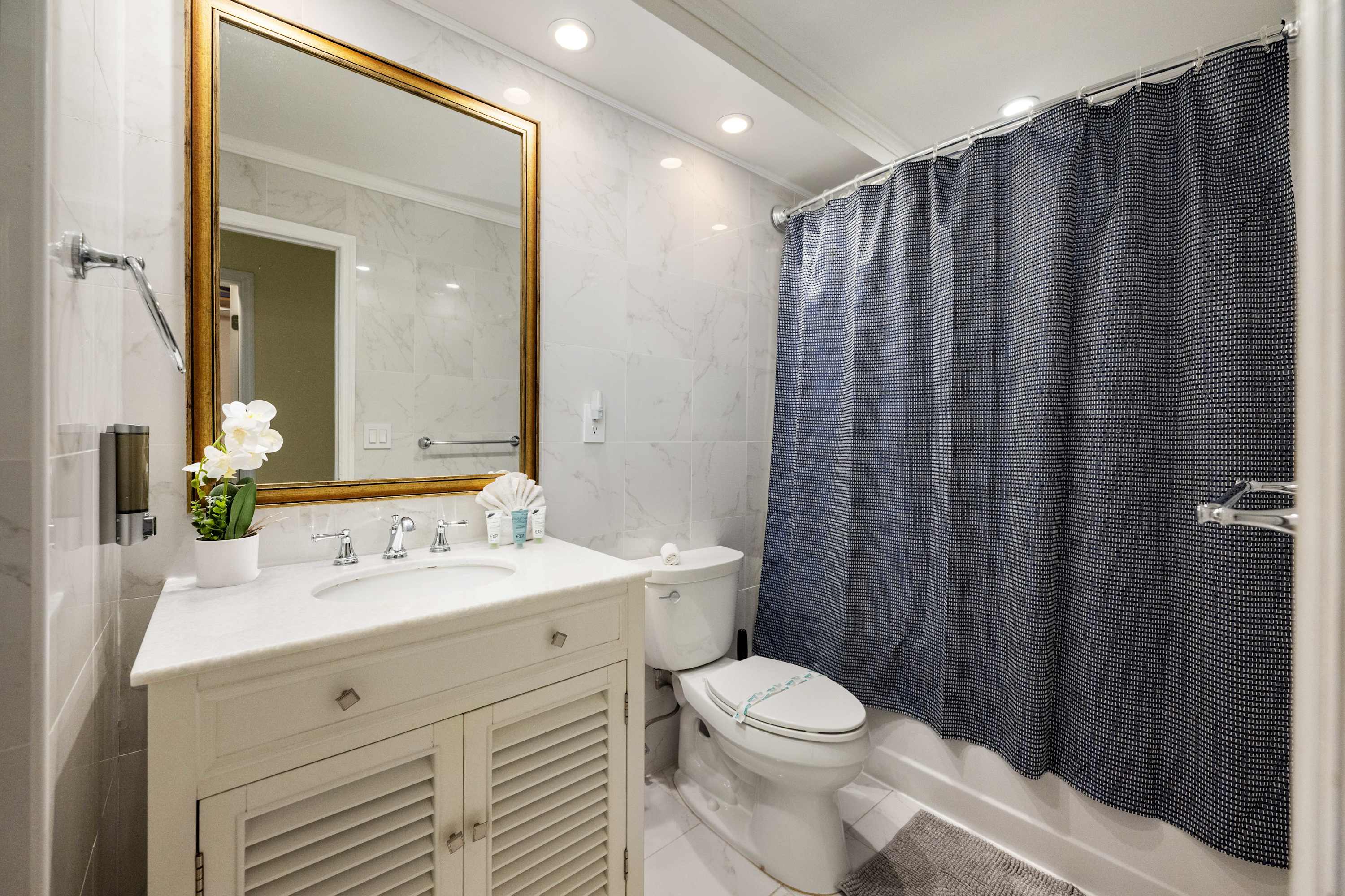 The home also includes 2 full guest bathrooms, the first with a single vanity and shower/tub combo and the second with a single vanity and glass walk-in shower.