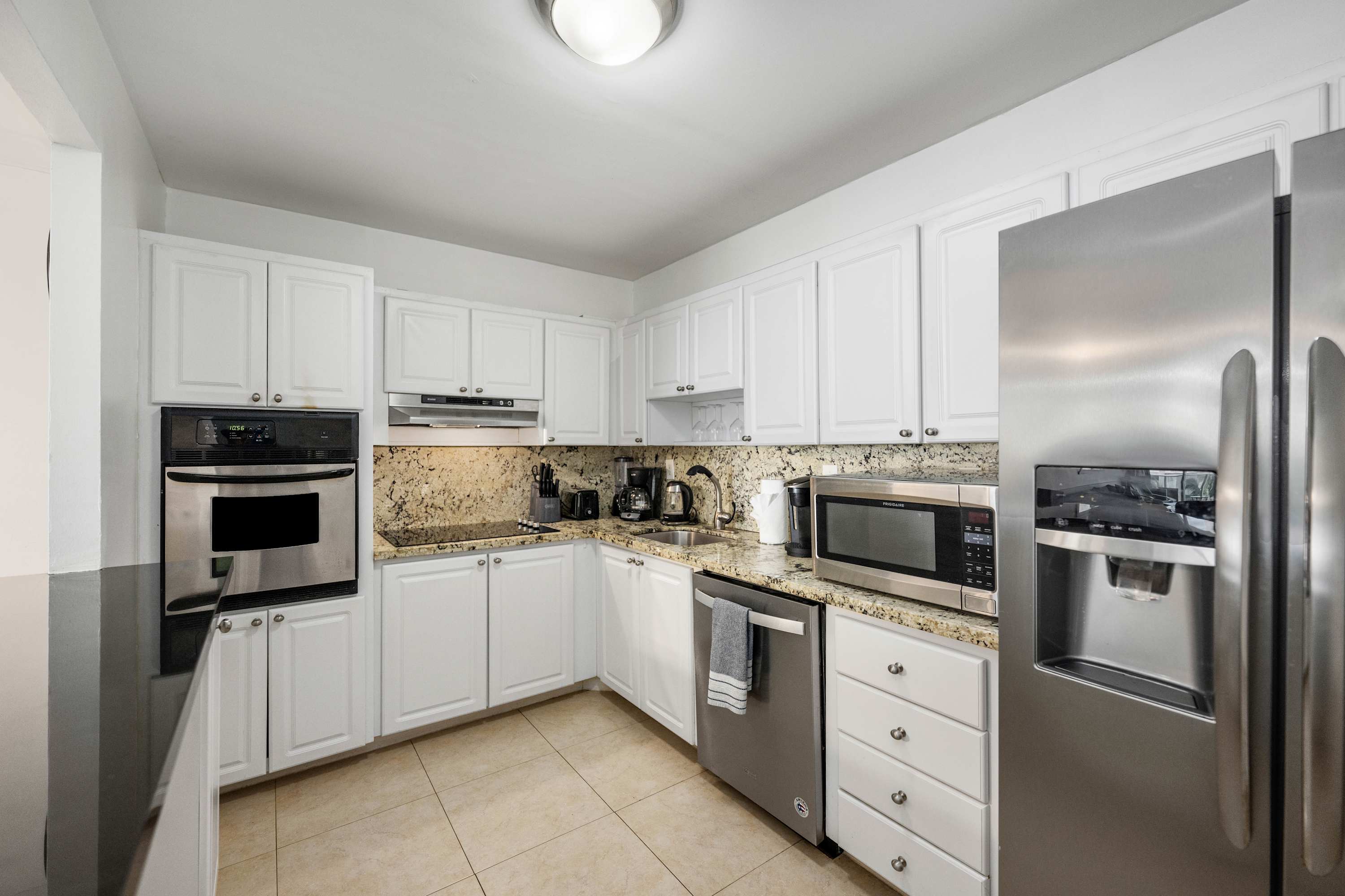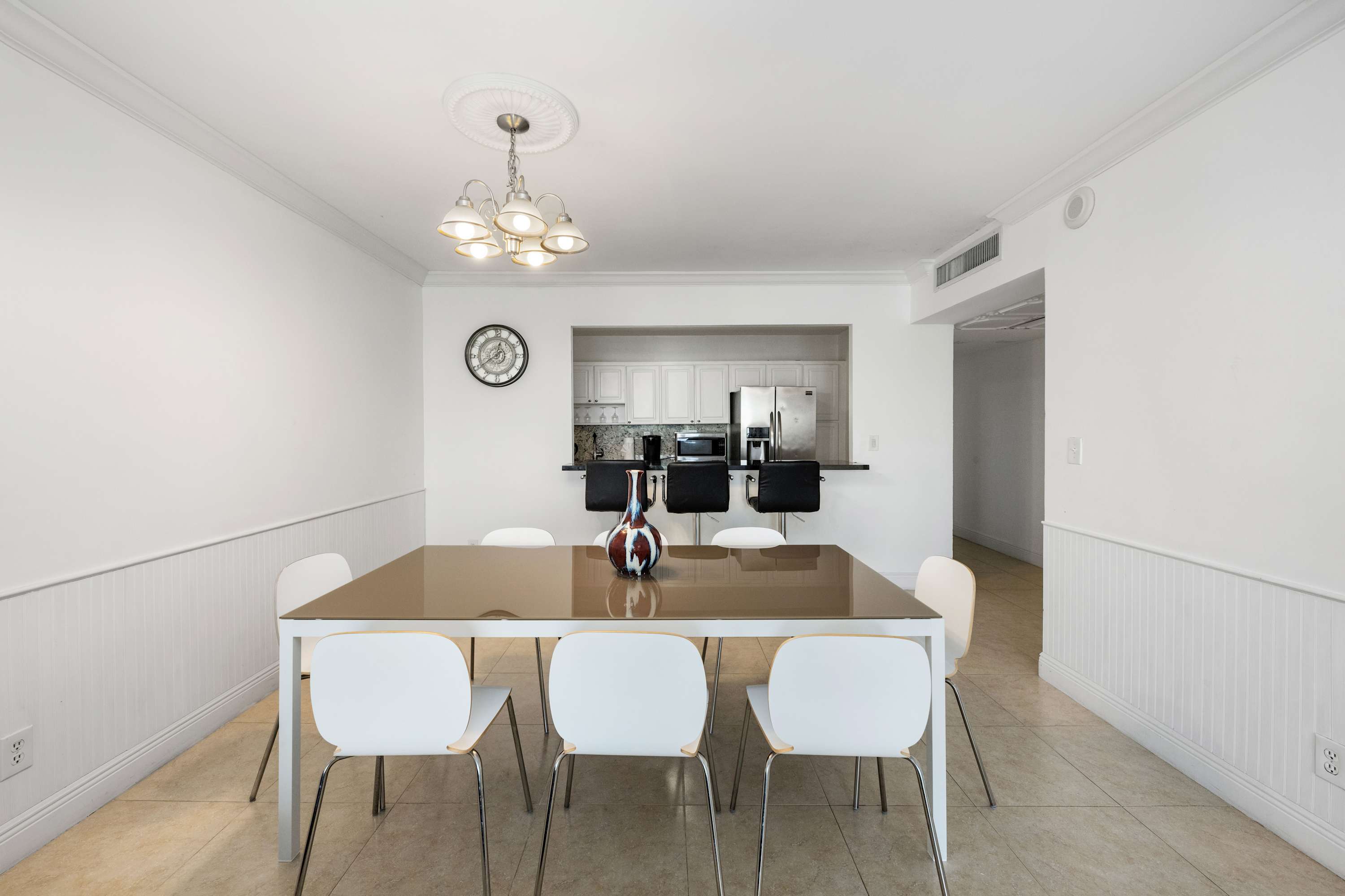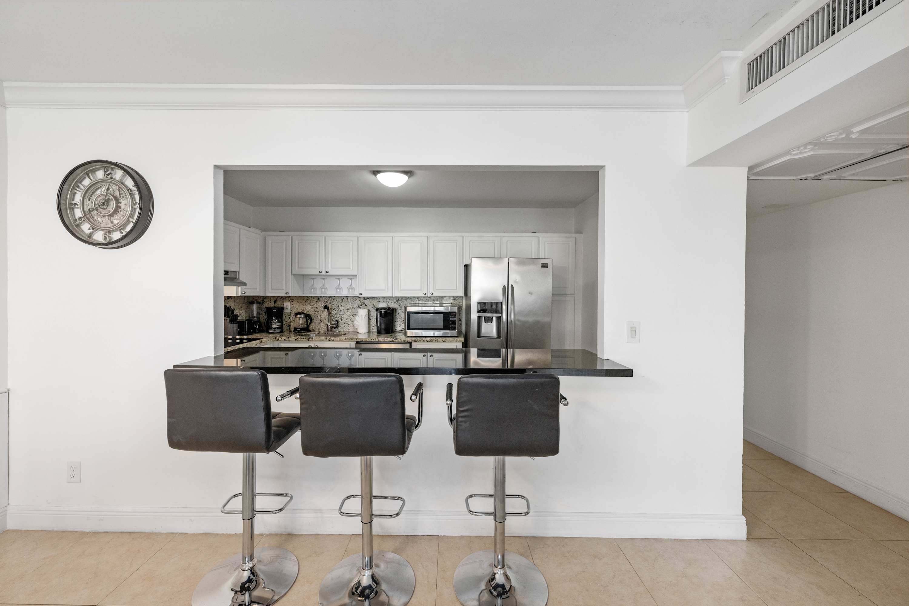 The home’s well-appointed interior is a welcome retreat from the heat, where cool tile flooring runs through spaces meticulously curated for both relaxation and entertainment. Curl up on plush living room sofa seating with chaise lounge to surf the channels or queue up a movie on the TV. No matter where you roam in the home, you’ll maintain line of sight on the sweeping views of the picturesque outdoors. A sliding door opens out onto the glass-rail balcony where you can sip on your morning coffee or an evening cocktail while you soak in the fresh ocean air. Back inside, the open floorplan leads you straight to the modern kitchen showcasing stainless steel appliances, glossy countertops, and sleek cabinetry stocked with cookware and dining ware. Grab a high-top stool at the counter for 3 to assist in meal prep or to nosh on a delicious spread of afternoon hors d’oeuvres. A formal dining table, steps away, can seat up to 8 for mealtimes or a spontaneous game night.