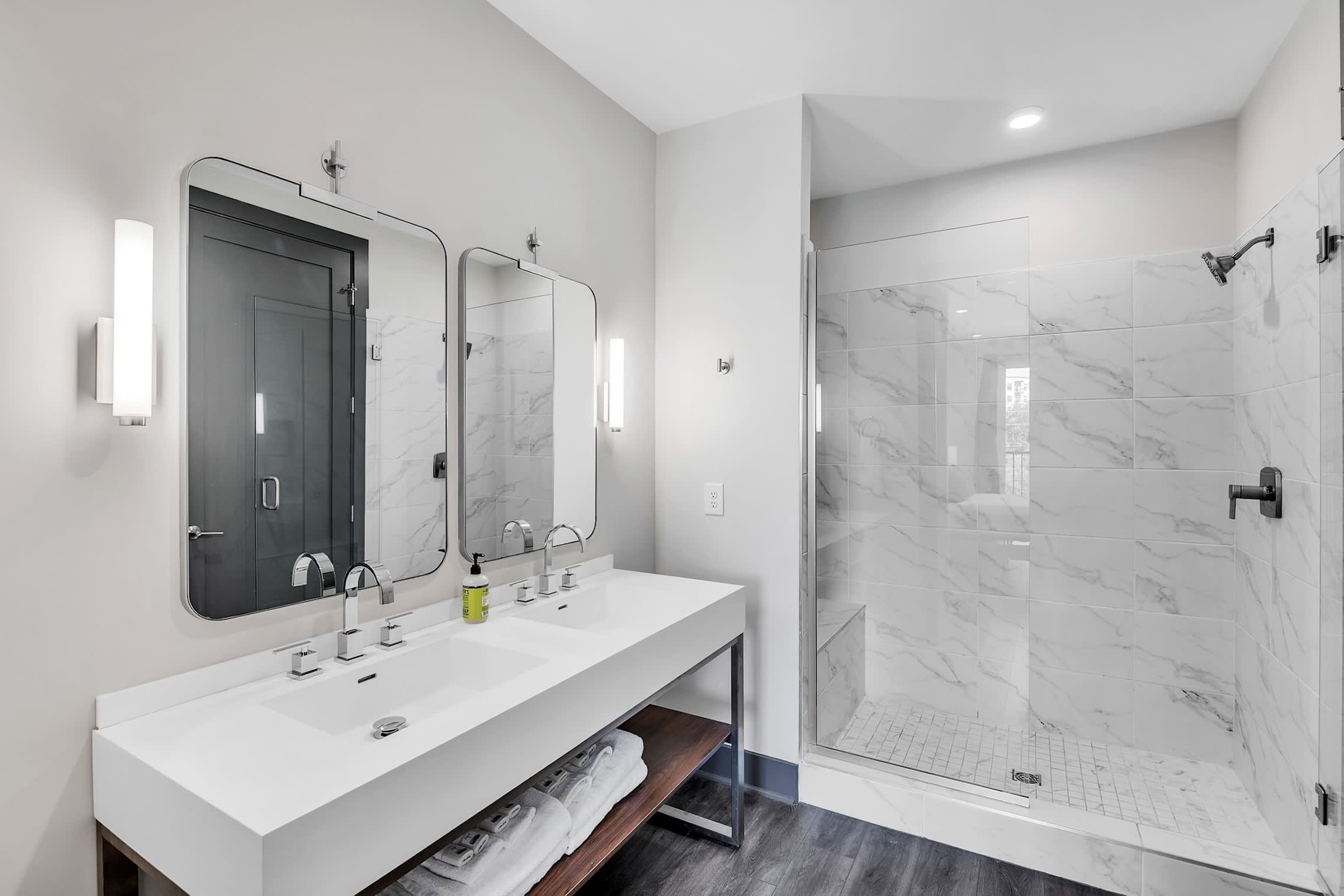 • Bedroom 1: Queen bed, smart TV, Juliet balcony; shared ensuite bathroom with dual vanity and shower/tub combo