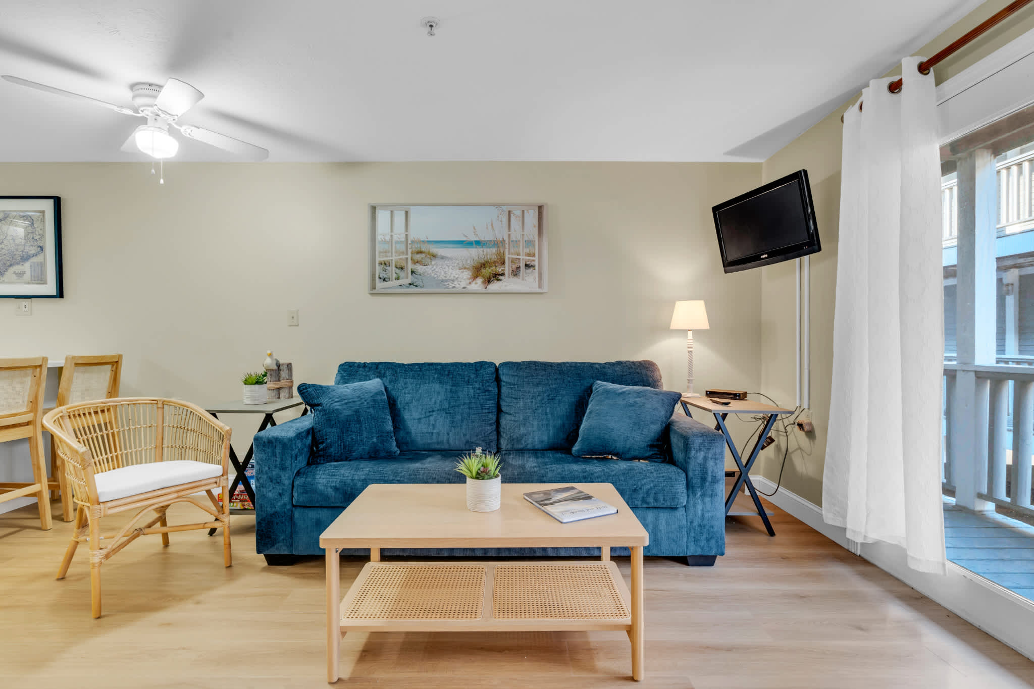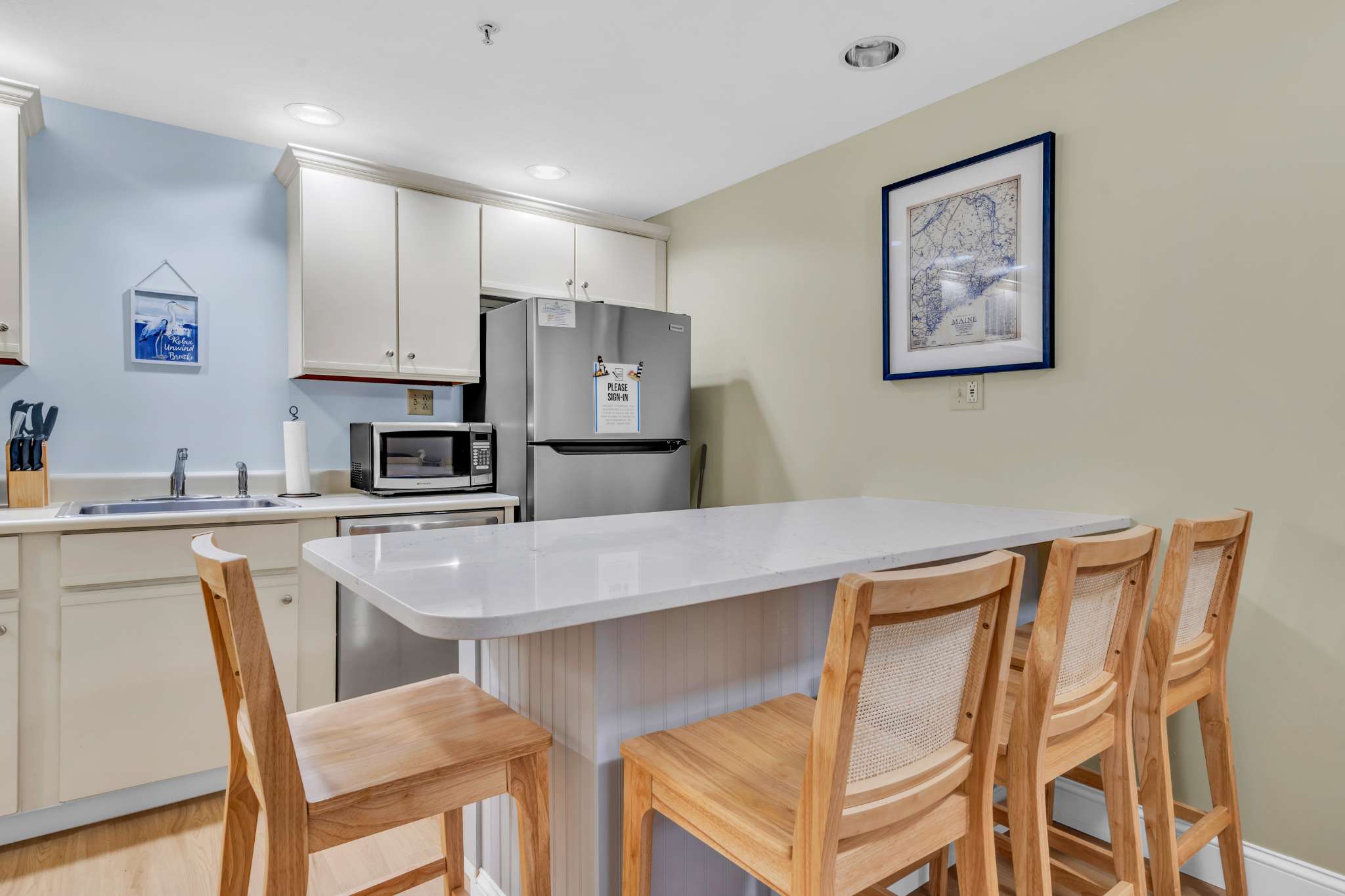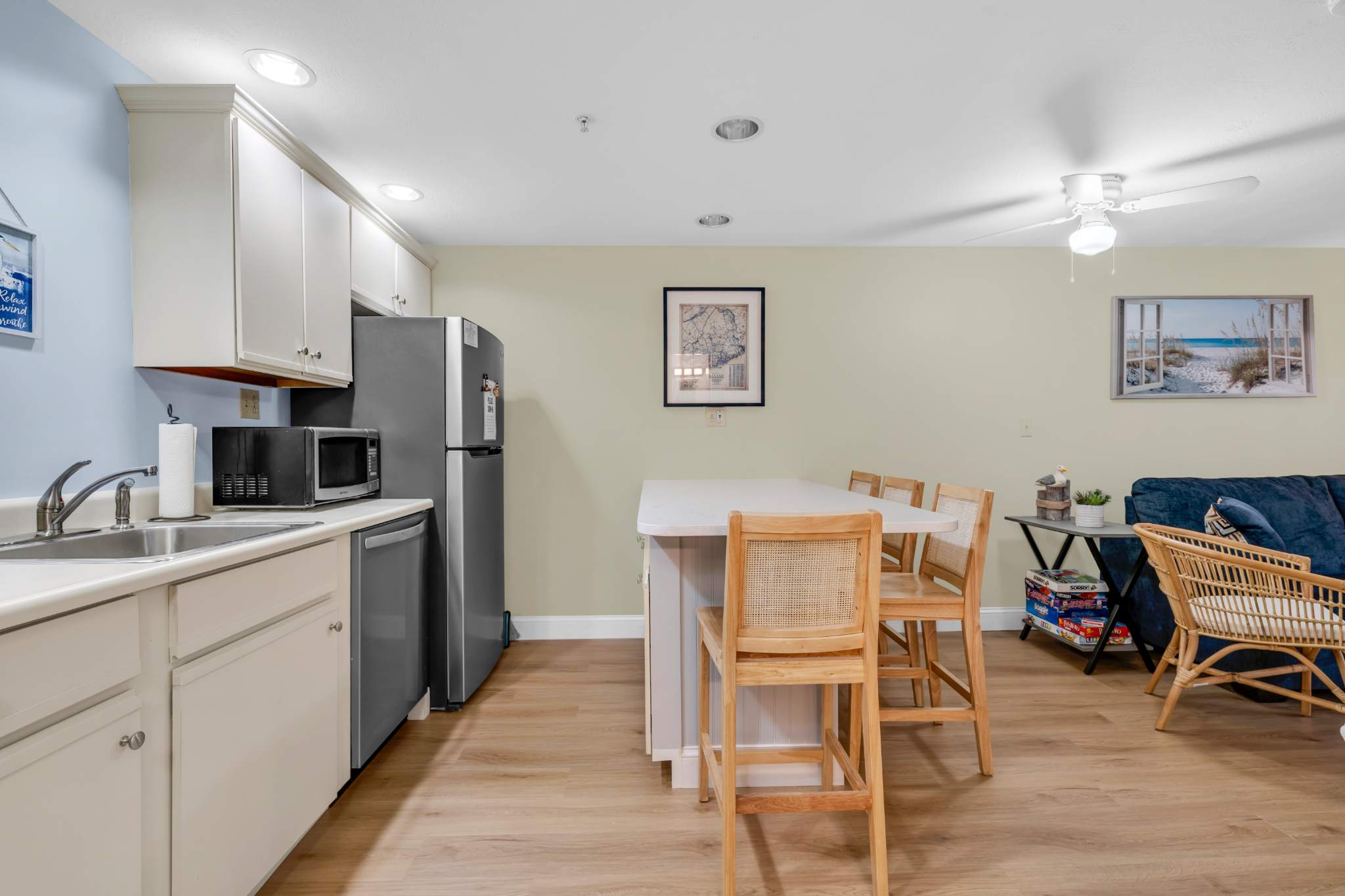 The home’s coastal charm blended with the comfortable furnishings and thoughtful décor creates an inviting seaside atmosphere. Curl up on the plush living room sofa as you stream a new movie or episodes of your favorite show on the smart TV. The fully equipped kitchen offers ample counterspace and cabinetry for meal preparation and storage. Vacation is also the perfect excuse to allow others to do the cooking and cleaning up, and with an abundance of delicious local restaurants to choose from, there will something new to try every day! The Keurig coffee maker will be your first stop in the morning, afterward taking your fresh cup onto the balcony to relax in the fresh air.