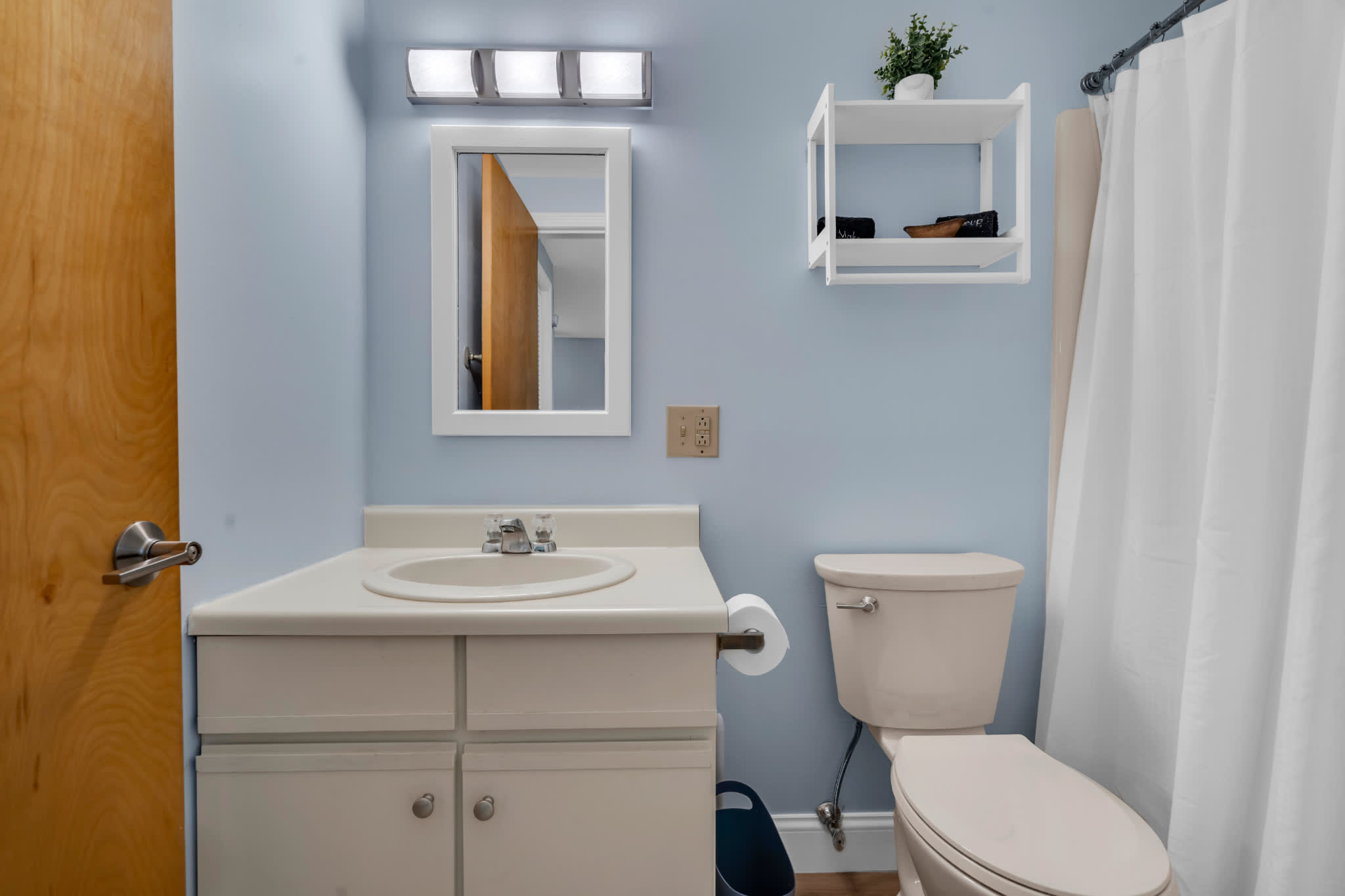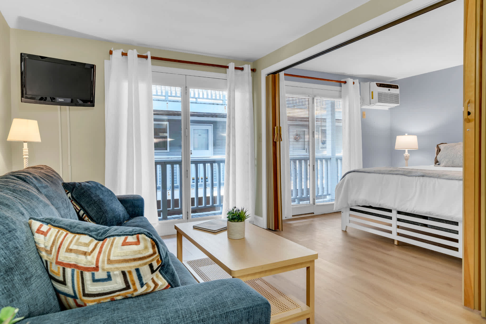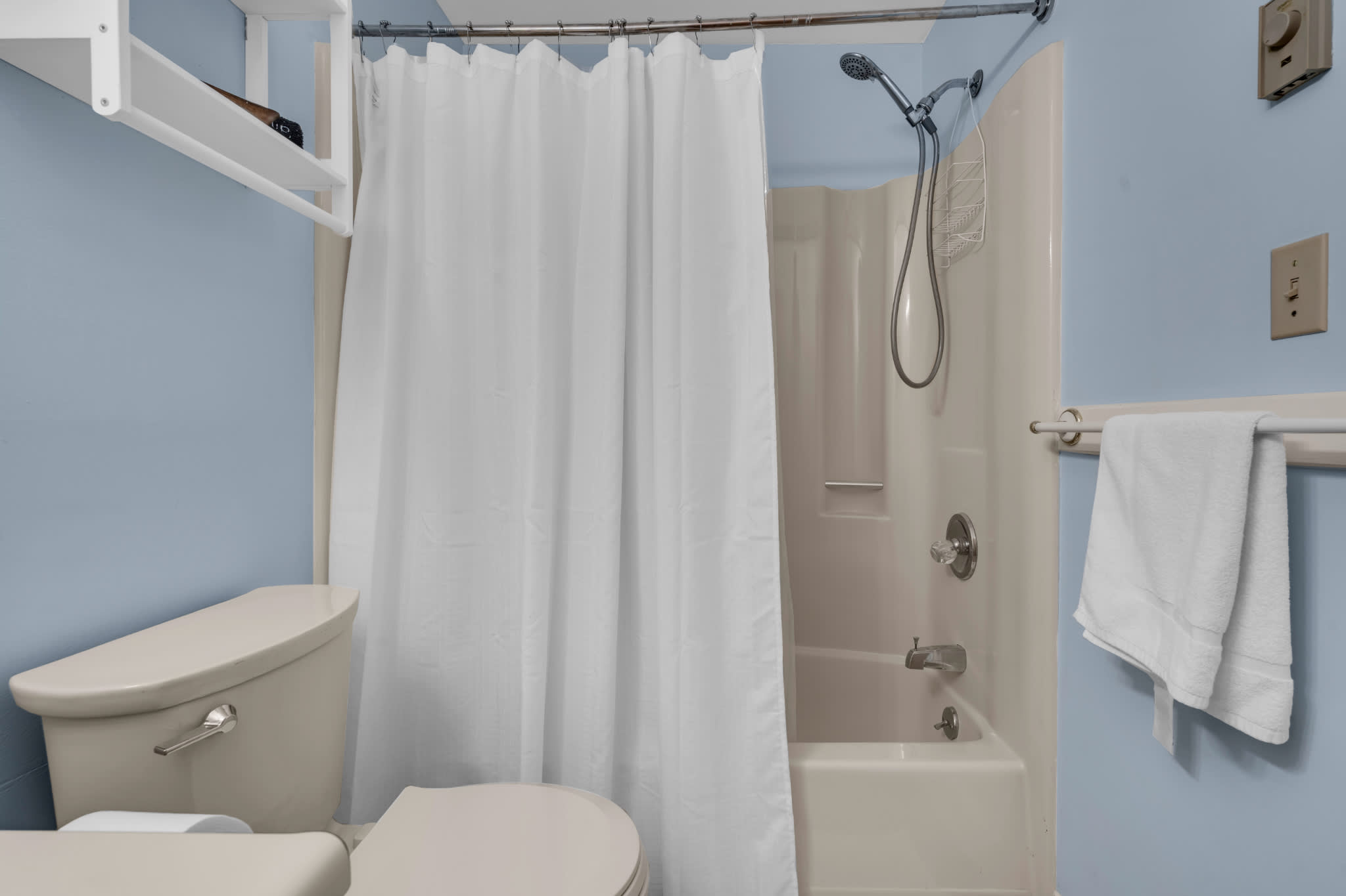 This home comfortably sleeps 4 guests between a private bedroom and a queen size sleeper sofa in the living room. The bedroom includes a luxurious king size bed fitted with crisp linens and soft blankets for a great night’s sleep. The home’s full guest bathroom includes a single vanity and shower/tub combo.