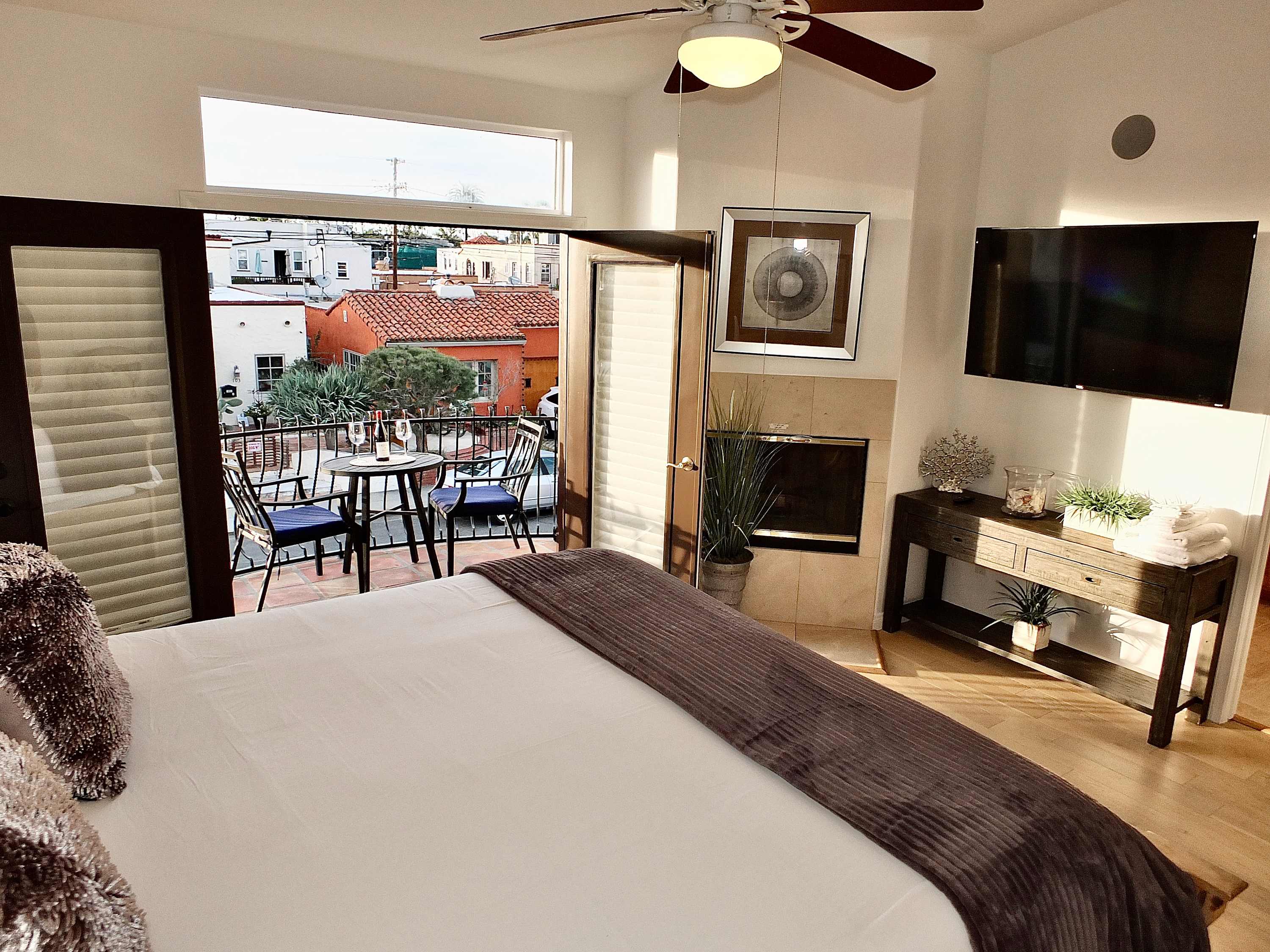 Bedroom #1 includes a king size bed, smart TV, fireplace, balcony, and ensuite bathroom with a dual vanity, jacuzzi bathtub, and glass walk-in shower.