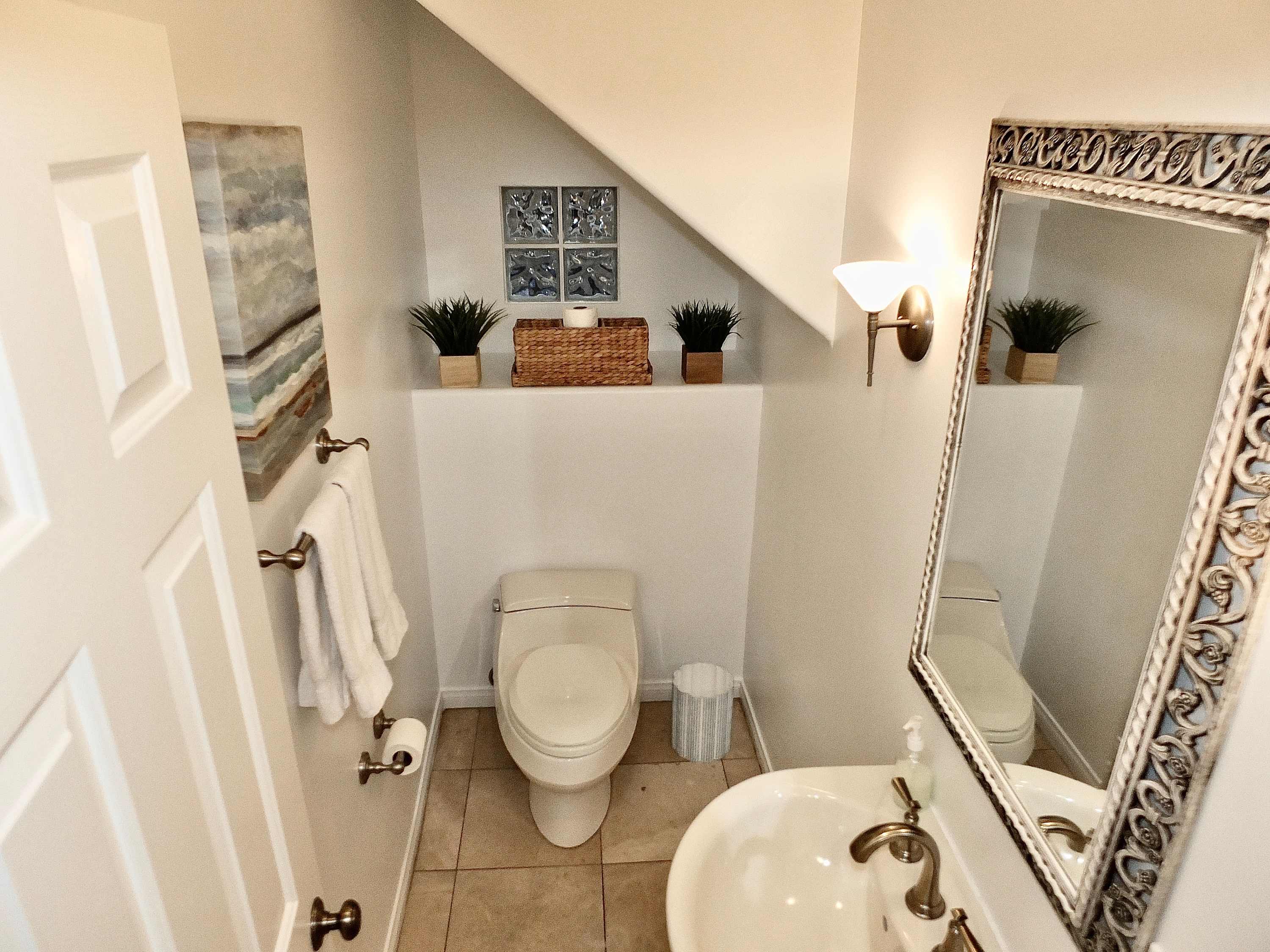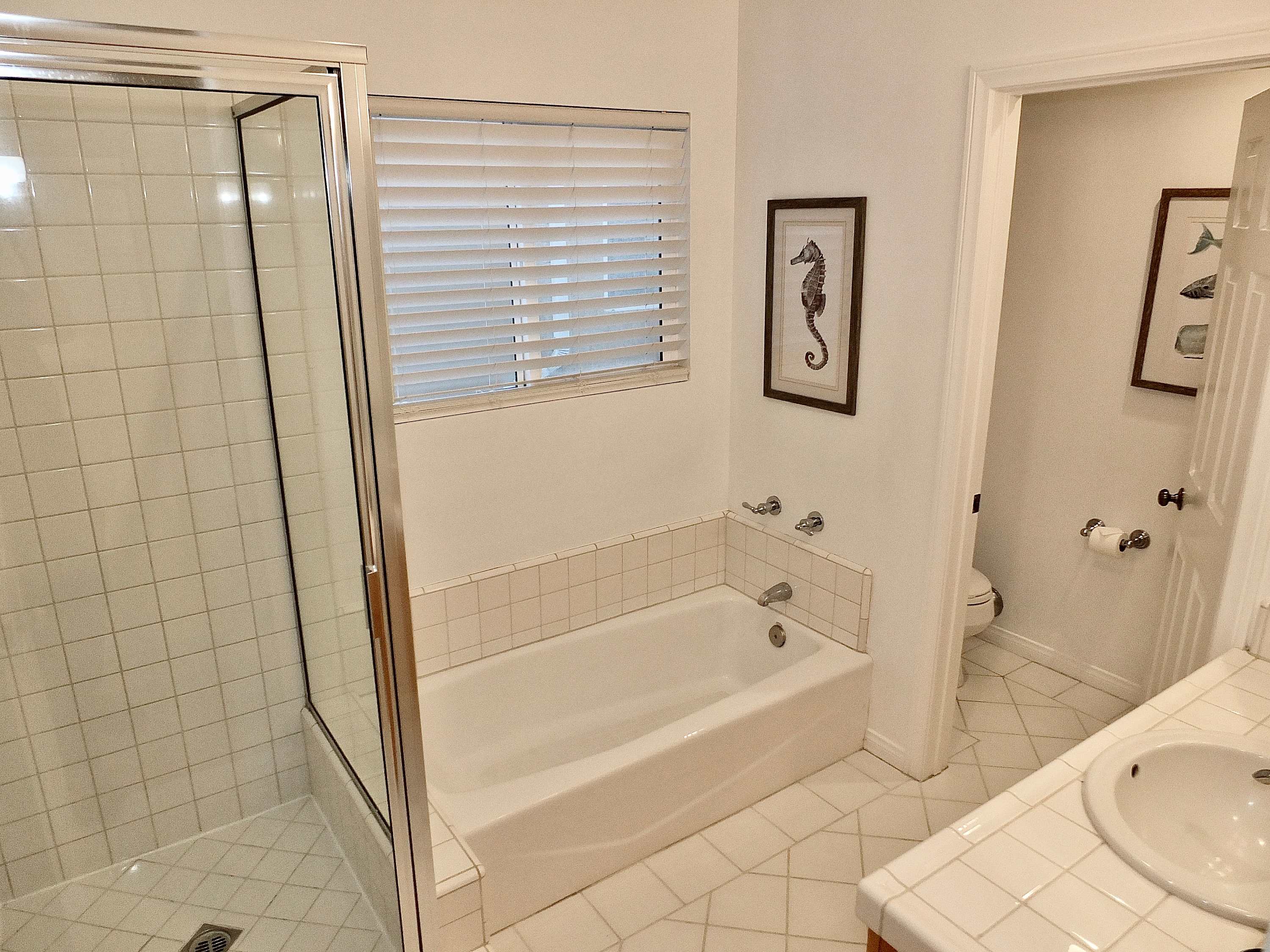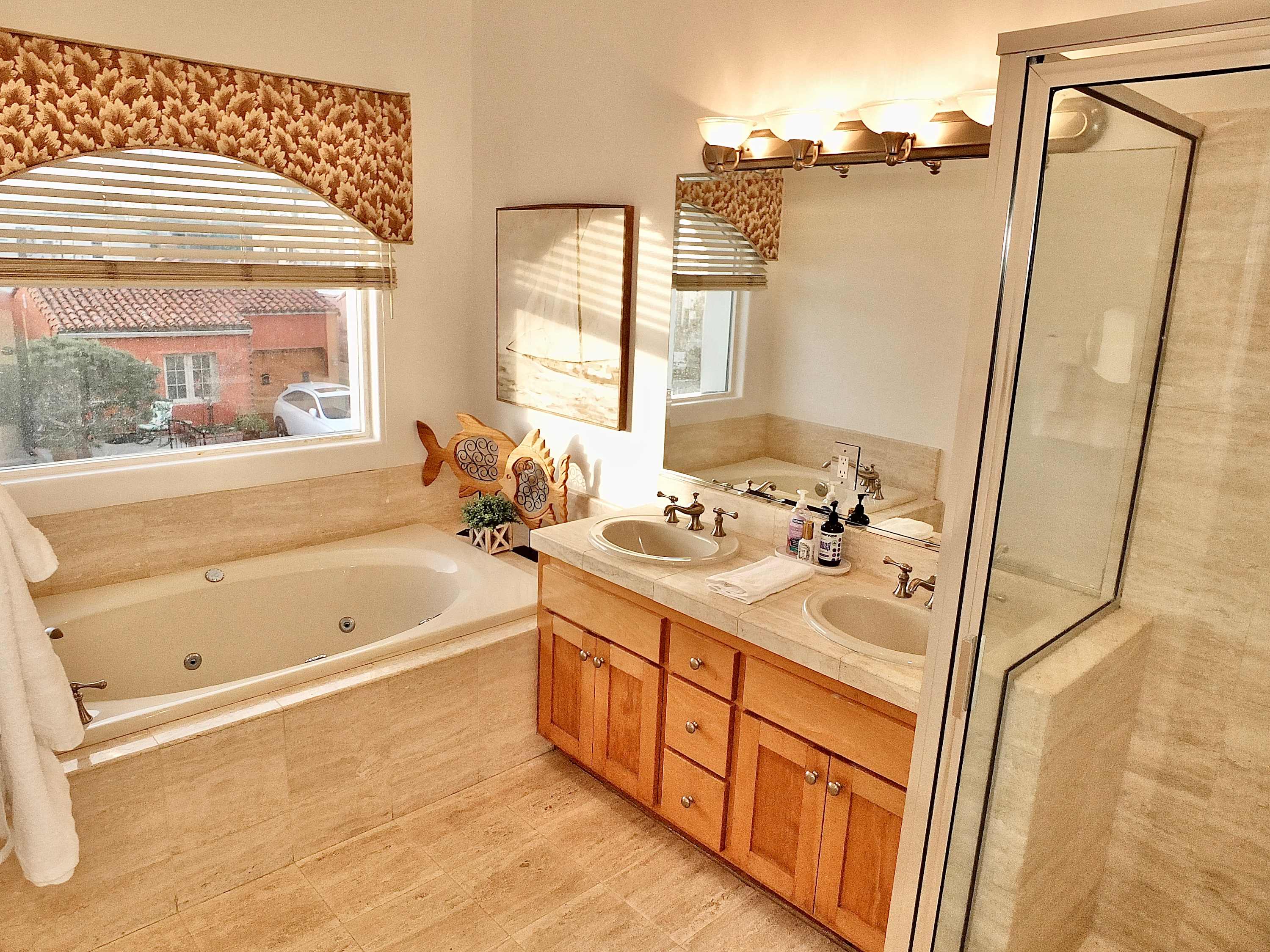 The home also includes a half bathroom as well as an additional full guest bathroom with a single vanity, soaking tub, and glass walk-in shower.