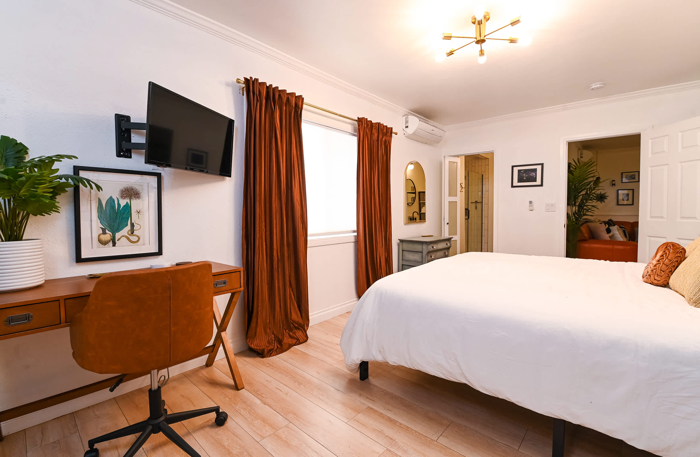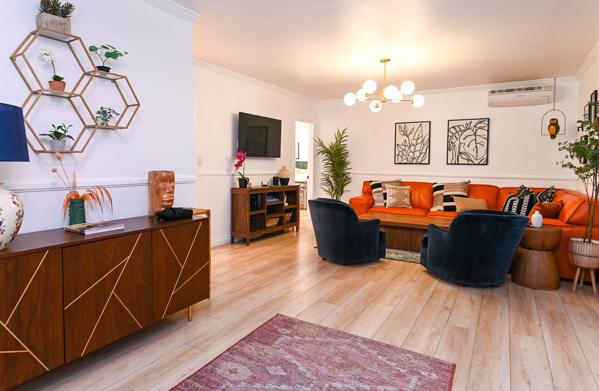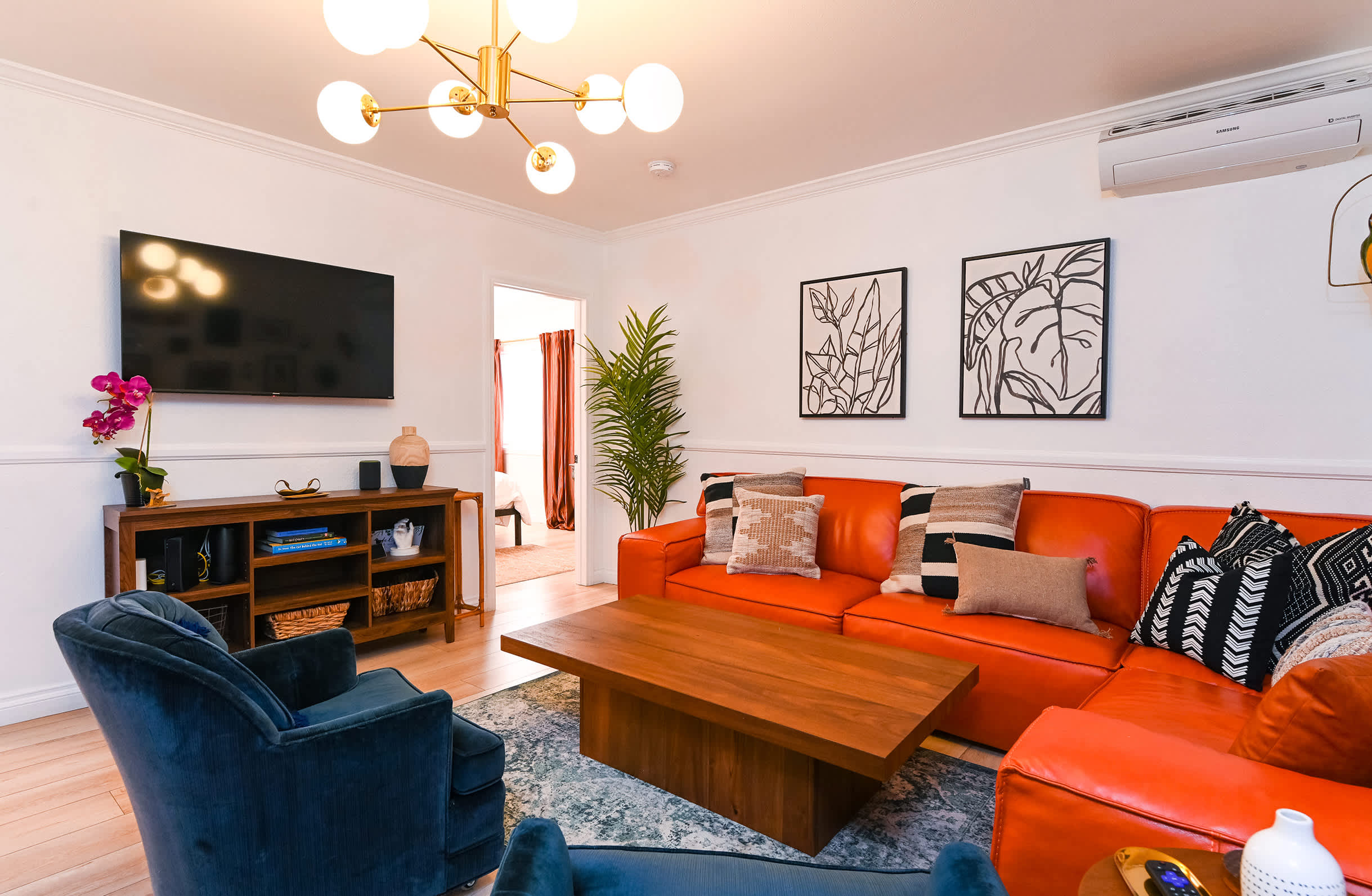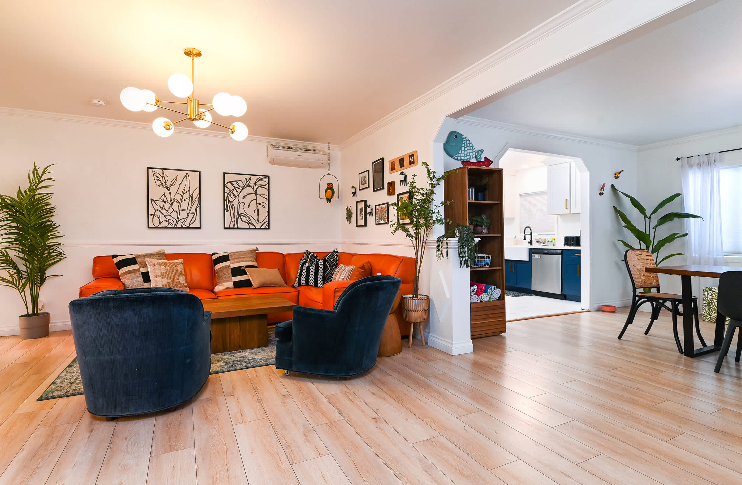 The home itself has been immaculately decorated with a funky, mid-century feel. Upon arrival, you’ll be greeted with a charming front garden offering a café table and chairs for 2, a spot practically designed for your morning cup of coffee. You’ll be delighted by the stylish yet functional furnishings and will even discover a few vintage pieces here and about. The living room features bright and comfortable leather sofa seating and plush armchairs, along with a smart TV for downtime streaming the latest episode of your favorite show. The open floor plan creates an organic flow between the living and dining areas, making both spaces the perfect place for hanging out and socializing. Enjoy casual conversation or mealtimes together at the dining room table with seating for 6. The spacious kitchen is on display with chic white-over-navy cabinetry, glossy countertops, and stainless steel appliances. Fully equipped with cookware and dining ware to take care of any and all of your mealtime needs, the only decision you’ll have to make is whether you want to prepare homecooked meals or enjoy a delicious variety of takeout night after night.