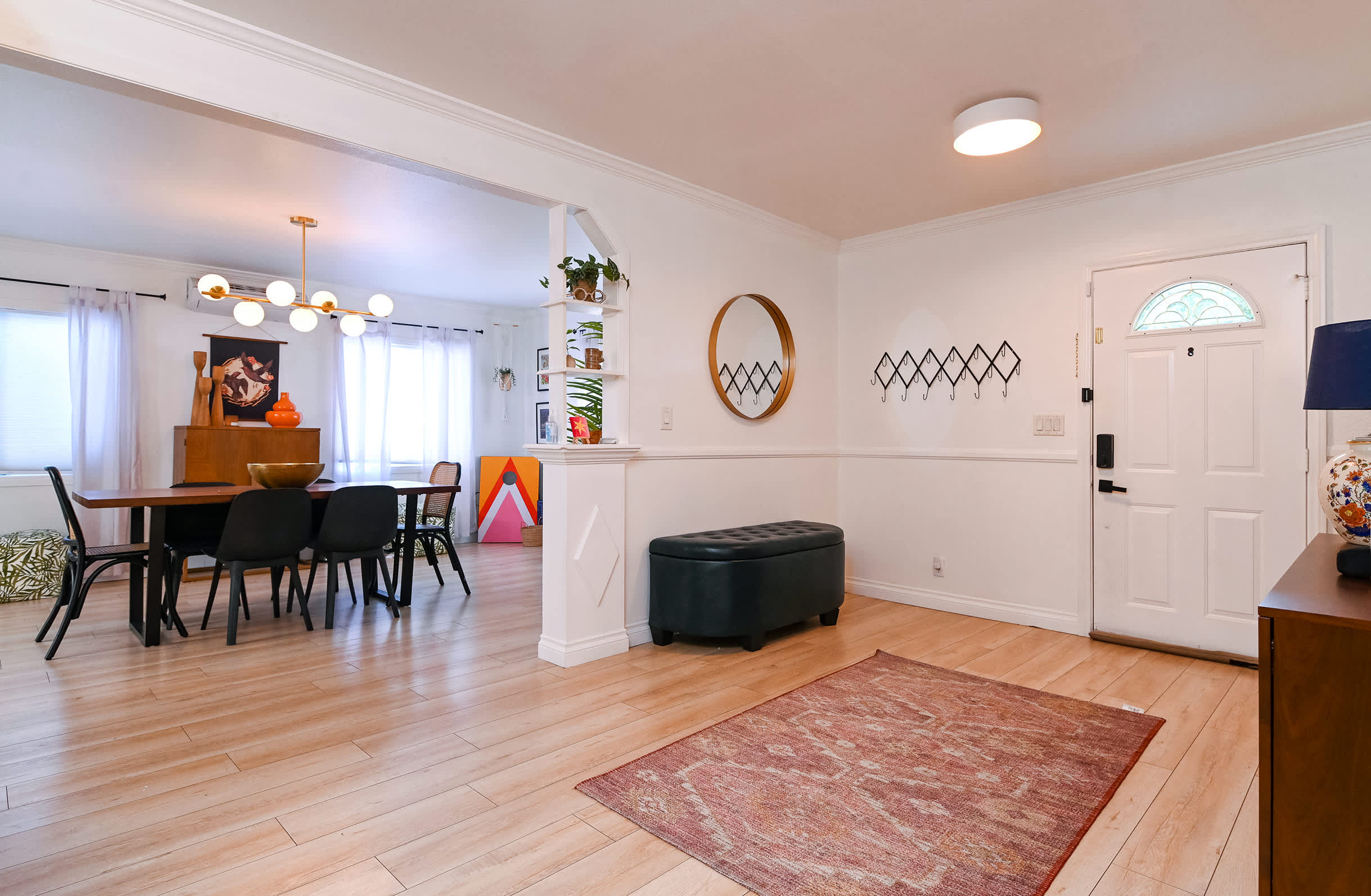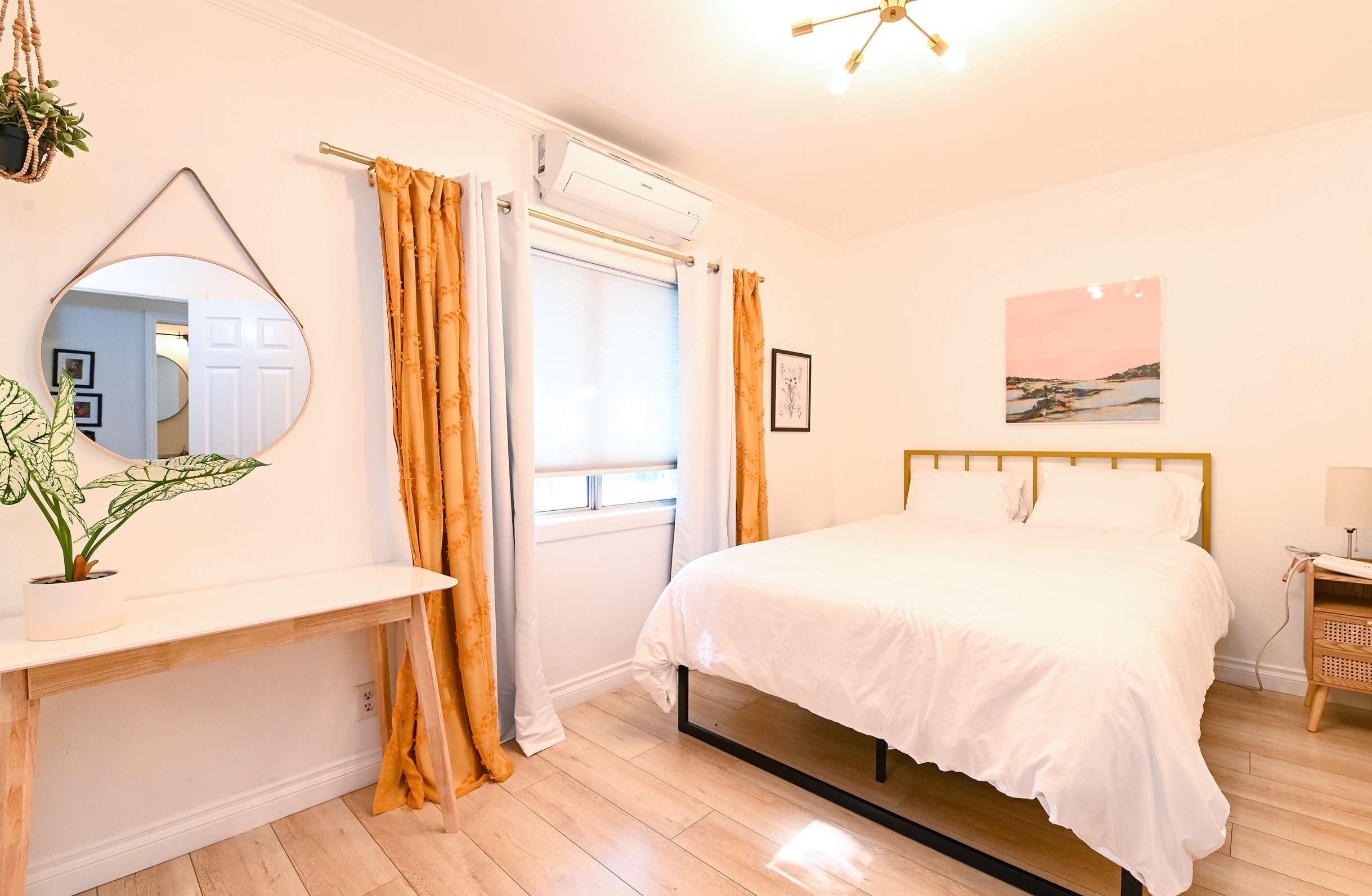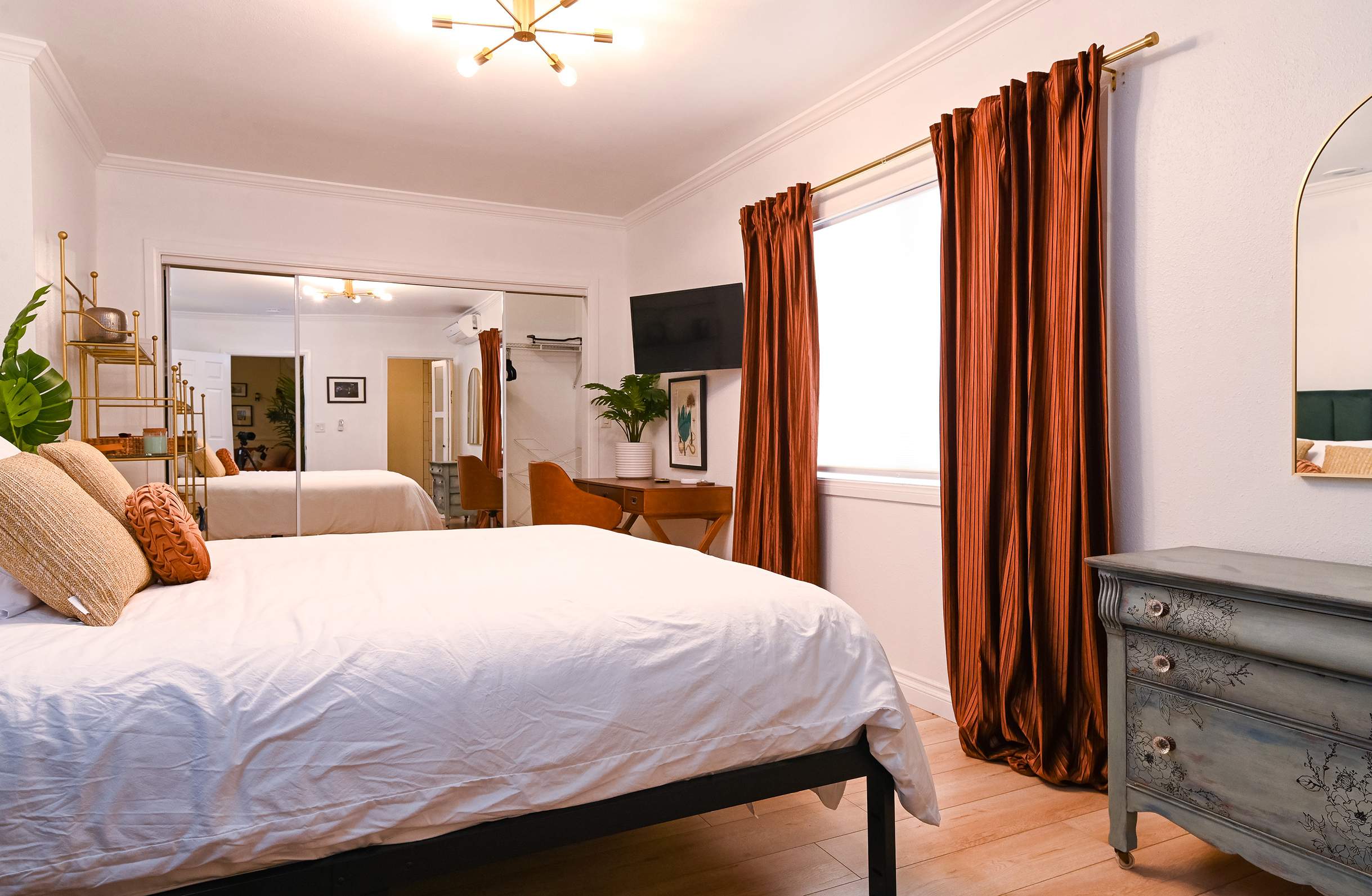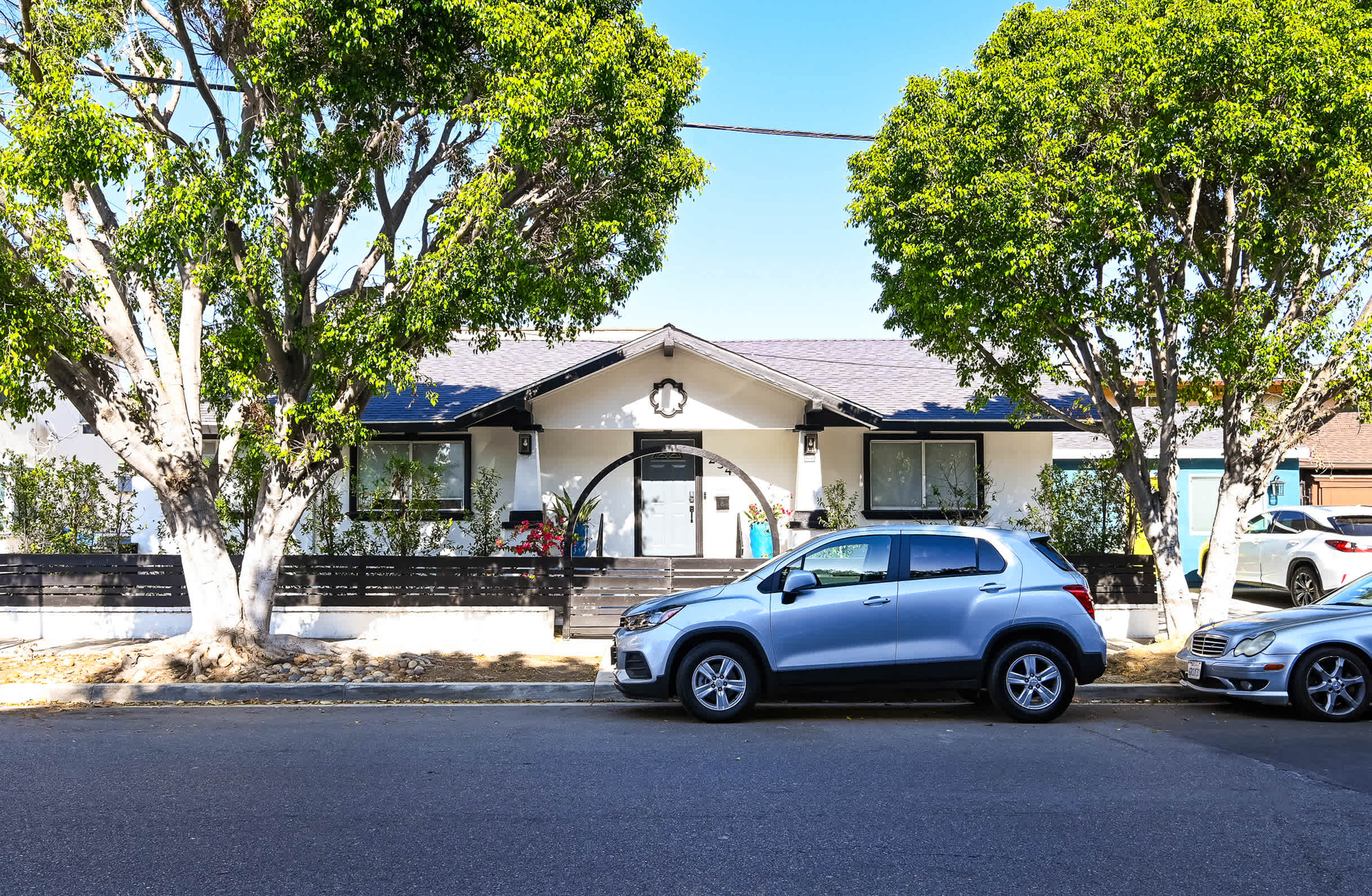The home itself has been immaculately decorated with a funky, mid-century feel. Upon arrival, you’ll be greeted with a charming front garden offering a café table and chairs for 2, a spot practically designed for your morning cup of coffee. You’ll be delighted by the stylish yet functional furnishings and will even discover a few vintage pieces here and about. The living room features bright and comfortable leather sofa seating and plush armchairs, along with a smart TV for downtime streaming the latest episode of your favorite show. The open floor plan creates an organic flow between the living and dining areas, making both spaces the perfect place for hanging out and socializing. Enjoy casual conversation or mealtimes together at the dining room table with seating for 6. The spacious kitchen is on display with chic white-over-navy cabinetry, glossy countertops, and stainless steel appliances. Fully equipped with cookware and dining ware to take care of any and all of your mealtime needs, the only decision you’ll have to make is whether you want to prepare homecooked meals or enjoy a delicious variety of takeout night after night.