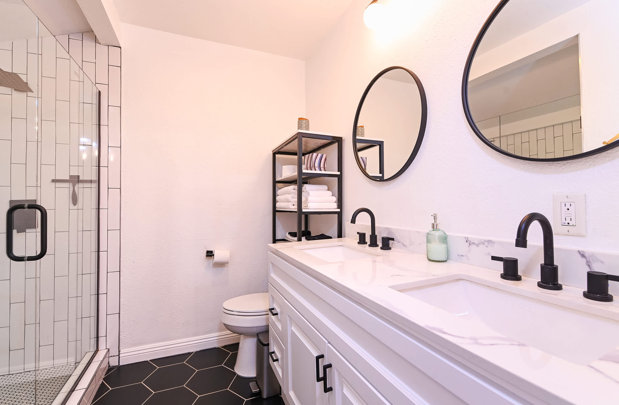 The home also includes an additional full bathroom with a dual vanity and shower/tub combo and a half bathroom.