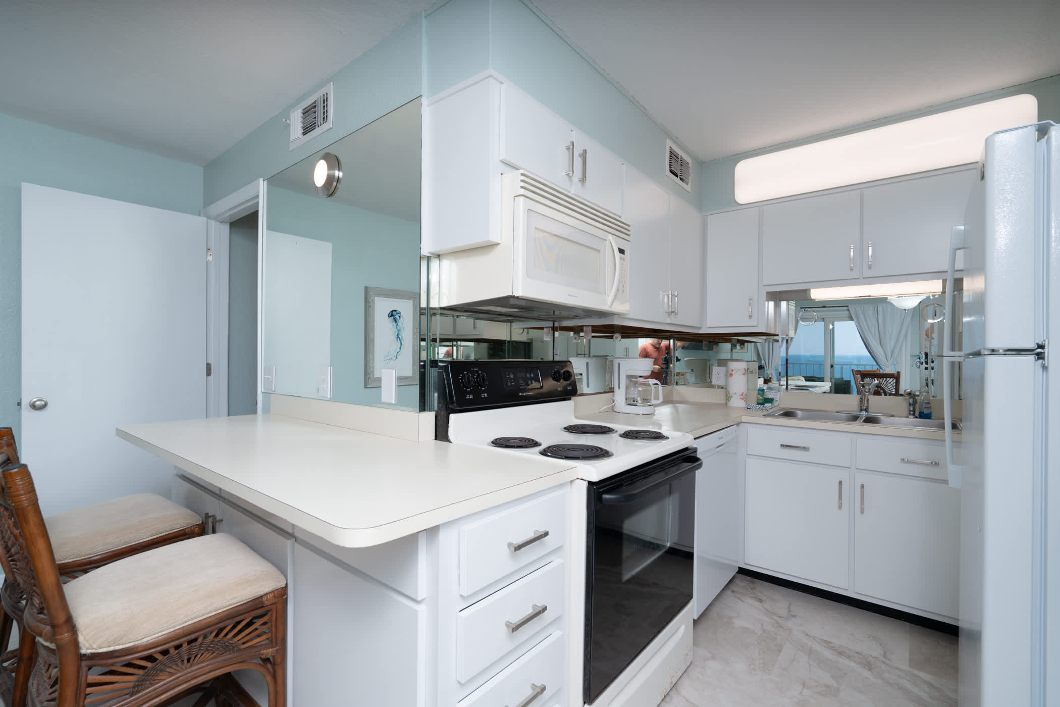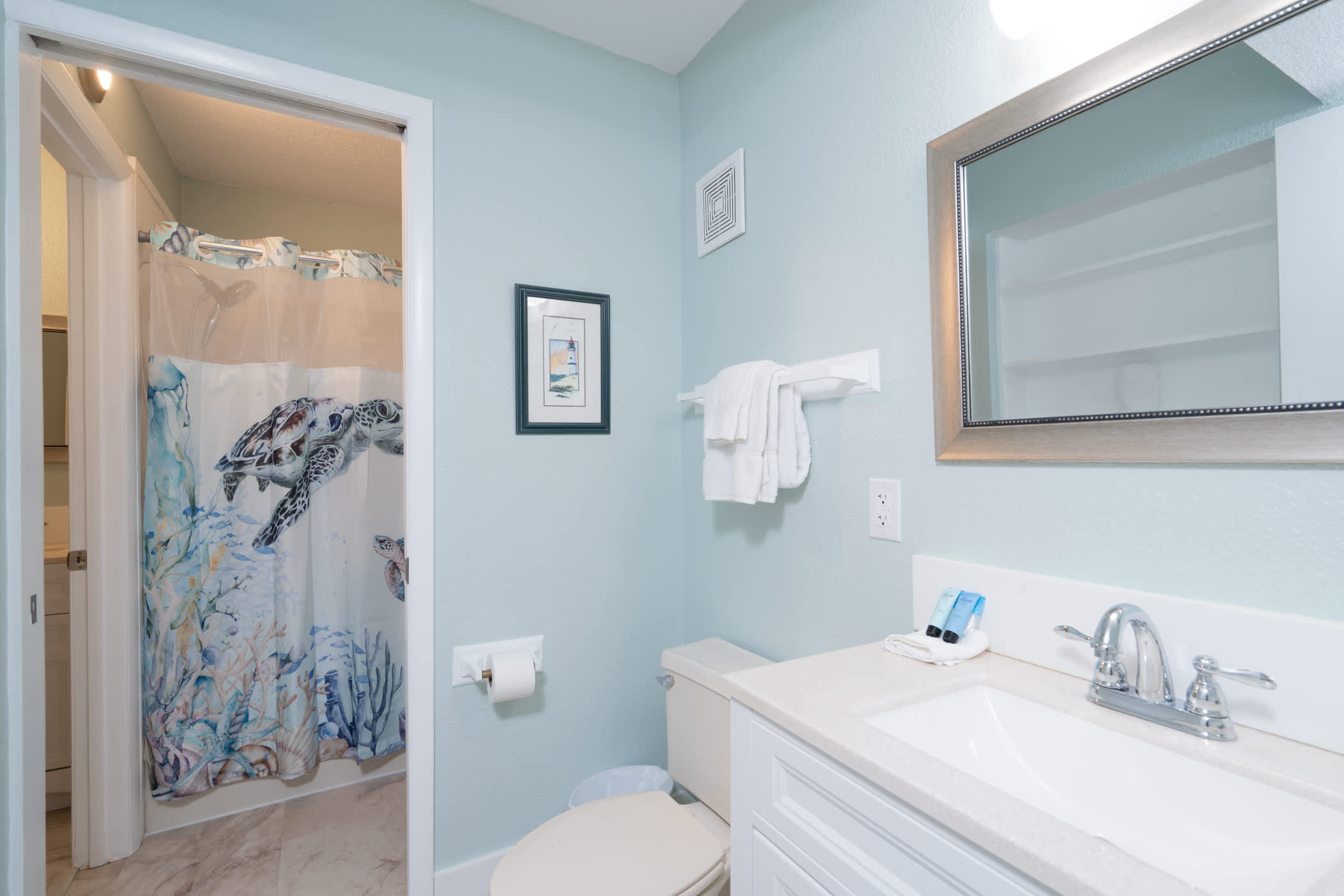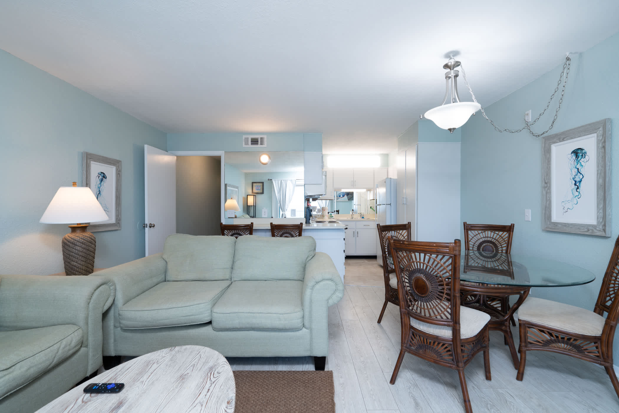 The home’s fresh and cool interior offers comfortable furnishings and coastal-chic décor, inviting you to kick up your feet and relax after long days exploring the great outdoors. Sink into plush sofa seating in the living room while you stream that new movie you’ve been saving on the mounted smart TV. The open floorplan organically flows you into the kitchen, well-equipped for all your mealtime endeavors with full-sized appliances and ample countertop space and cabinetry for preparation and storage. Between the formal table with seating for 4 and 2 high-top stools at the counter, everyone will have the opportunity to dine together in great company.