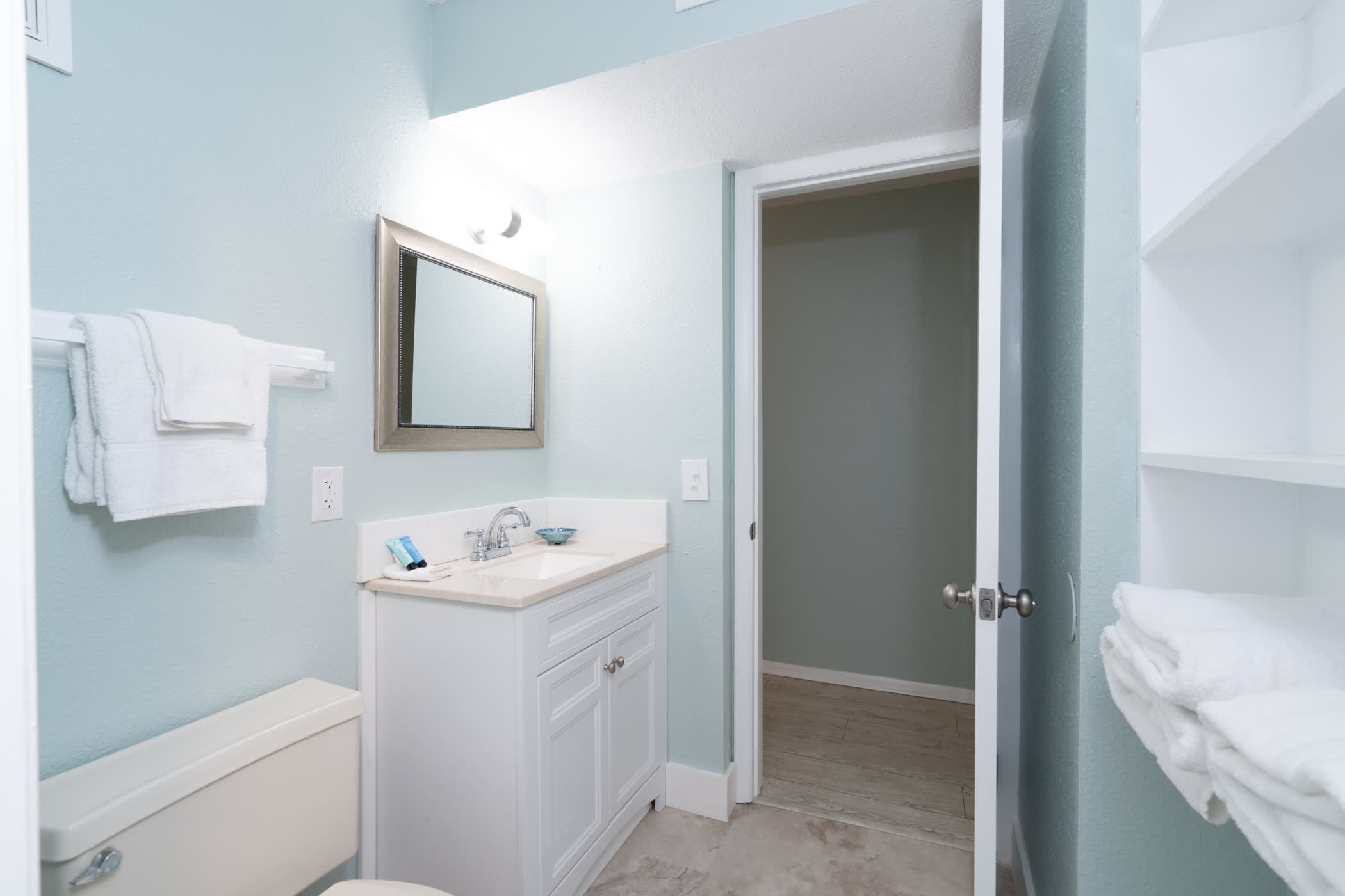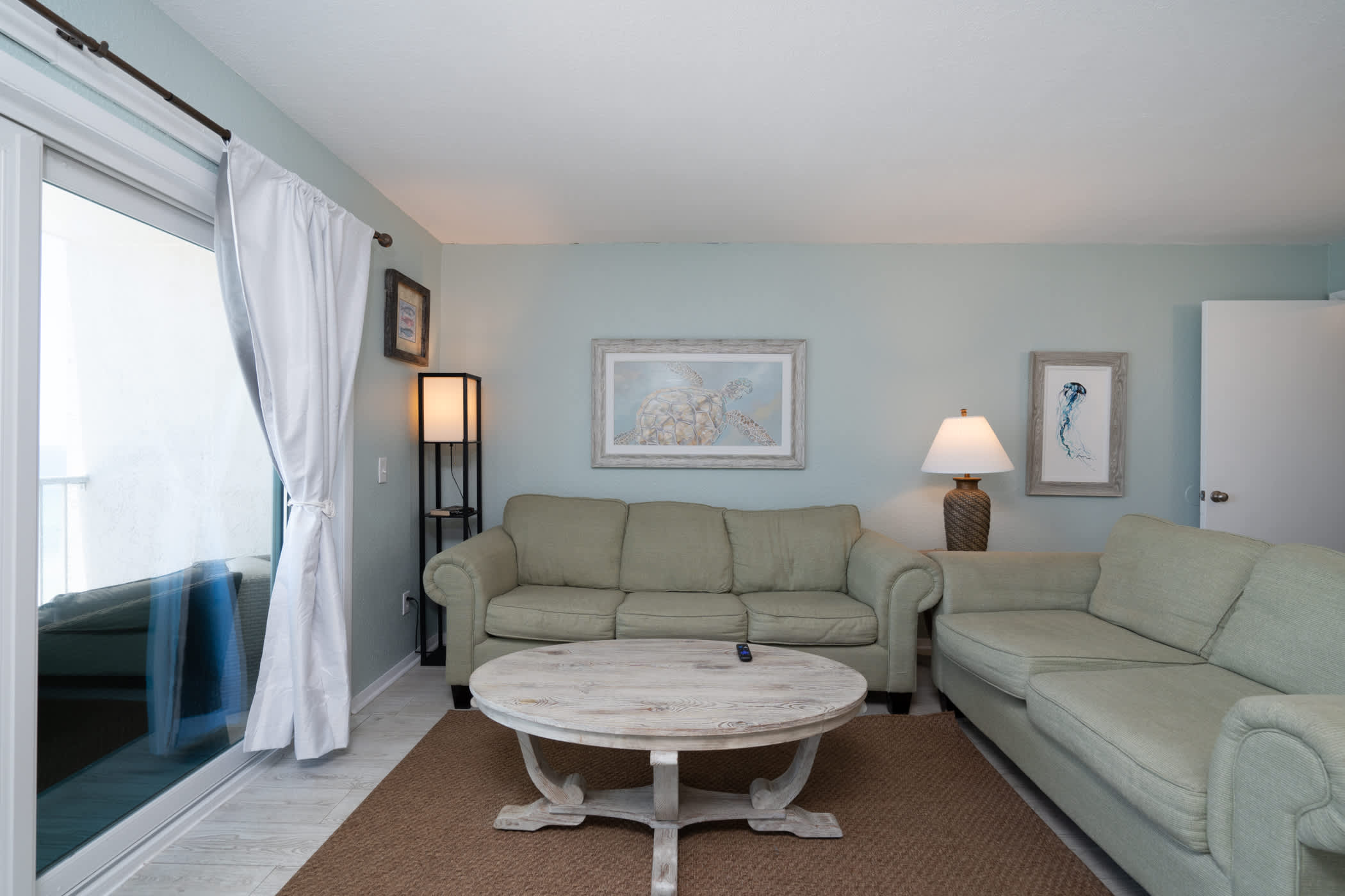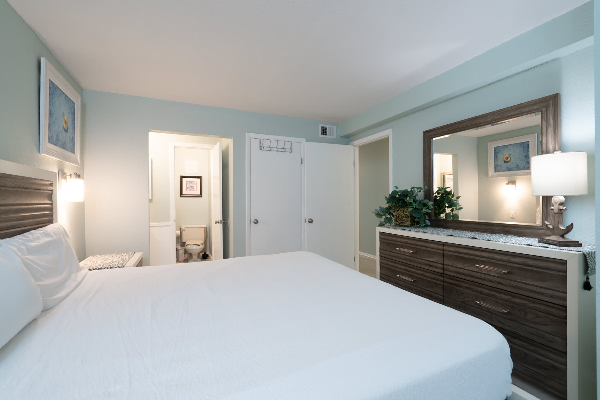 The home’s fresh and cool interior offers comfortable furnishings and coastal-chic décor, inviting you to kick up your feet and relax after long days exploring the great outdoors. Sink into plush sofa seating in the living room while you stream that new movie you’ve been saving on the mounted smart TV. The open floorplan organically flows you into the kitchen, well-equipped for all your mealtime endeavors with full-sized appliances and ample countertop space and cabinetry for preparation and storage. Between the formal table with seating for 4 and 2 high-top stools at the counter, everyone will have the opportunity to dine together in great company.