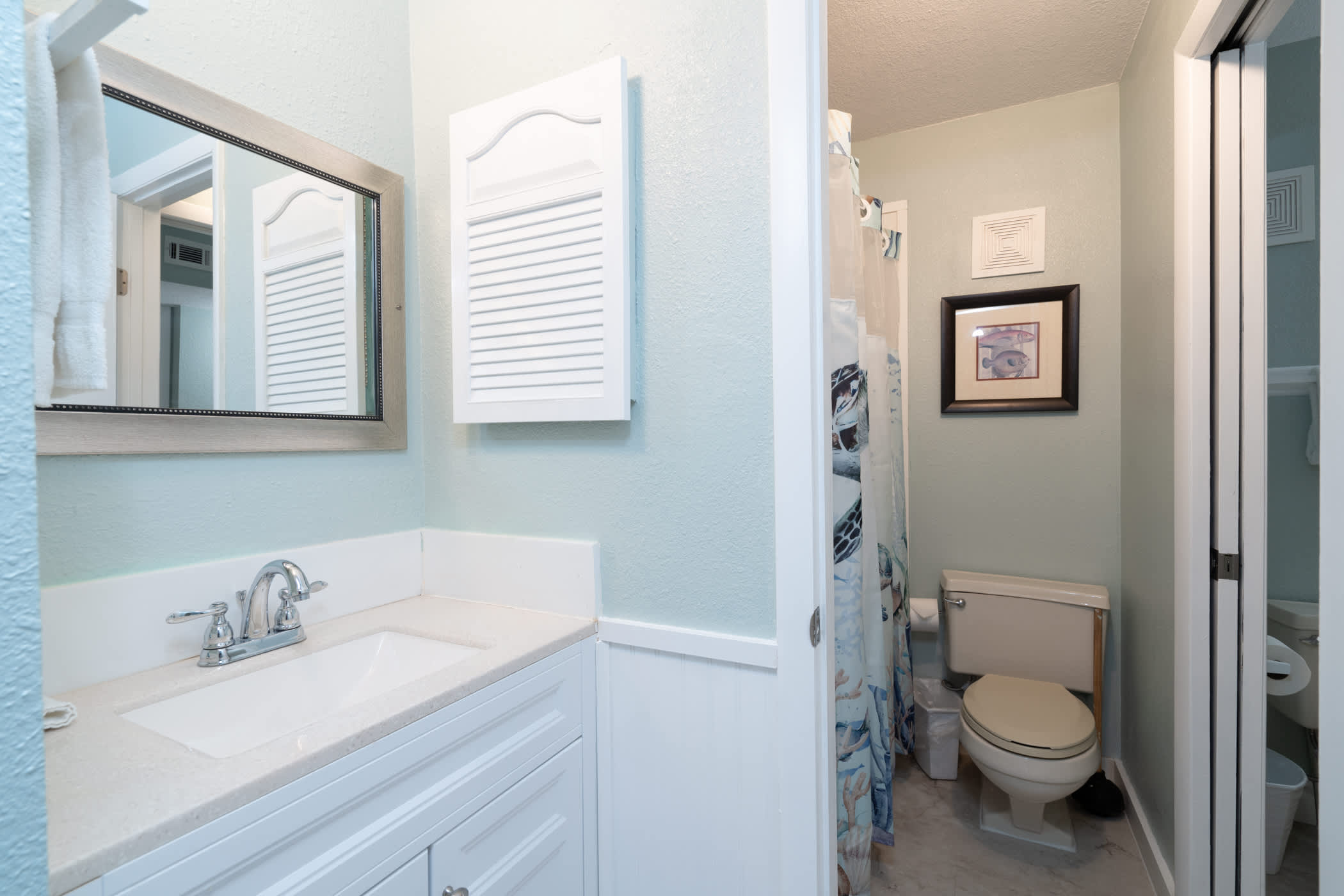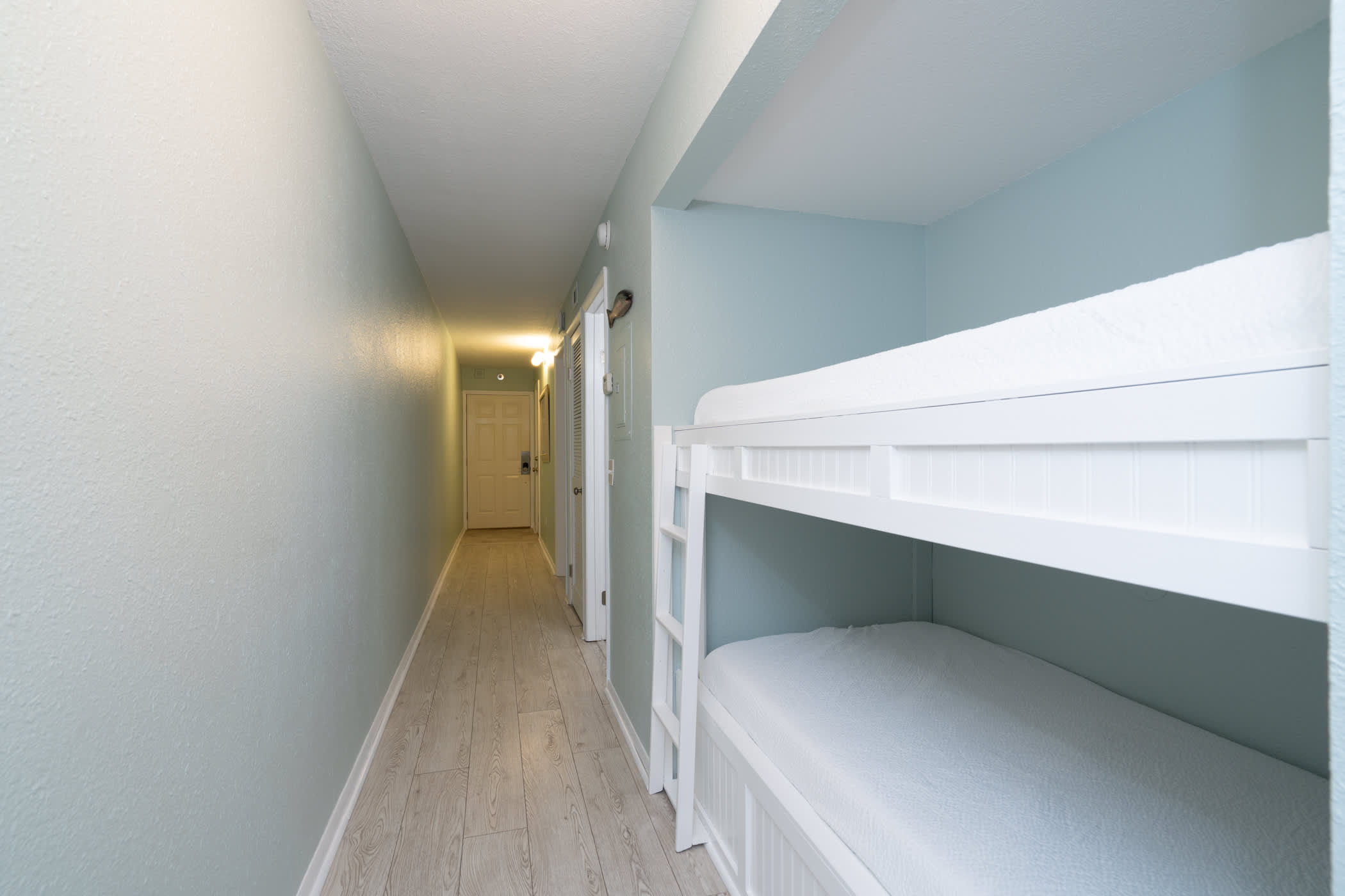 This home sleeps 5 guests between 1 private bedroom, a queen size sleeper sofa in the living room, and a hallway nook with a twin-over-twin bunk bed. The bedroom includes a luxurious king size bed fitted with crisp linens and soft blankets for a great night’s sleep, along with a smart TV. The Jack & Jill-style ensuite bathroom includes a single vanity and shower/tub combo.