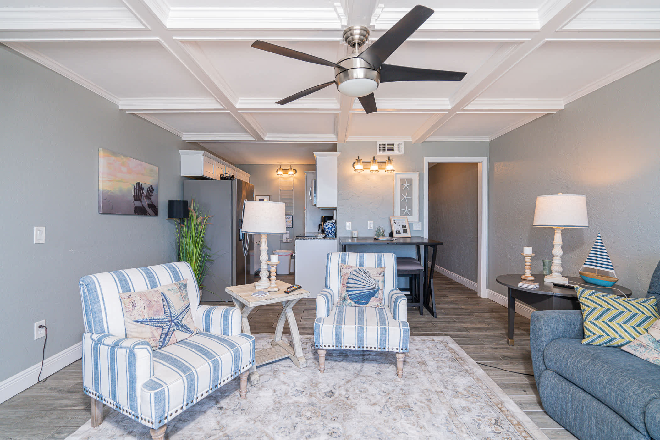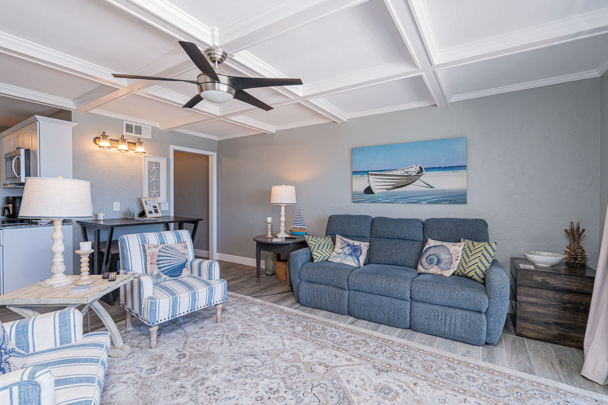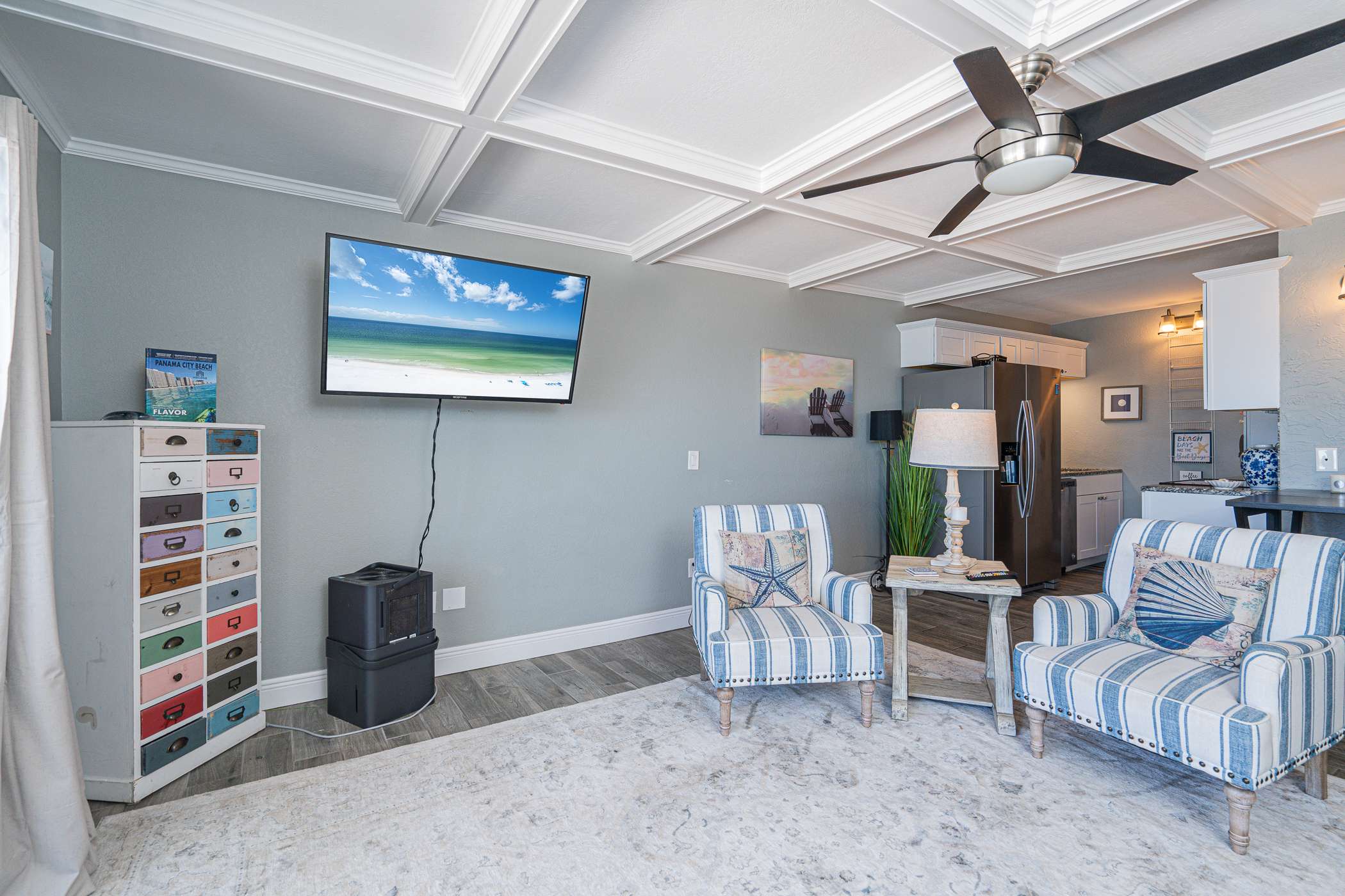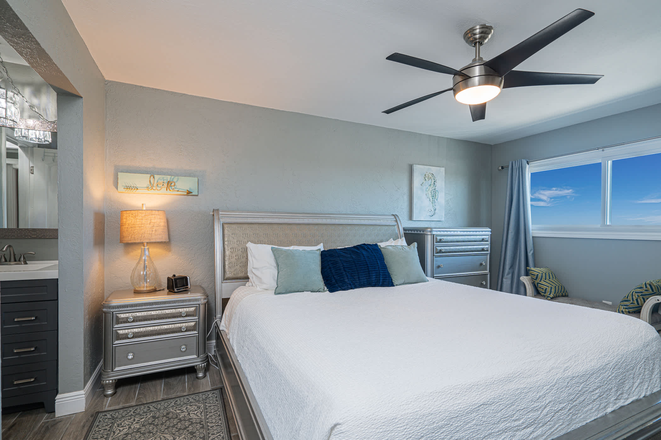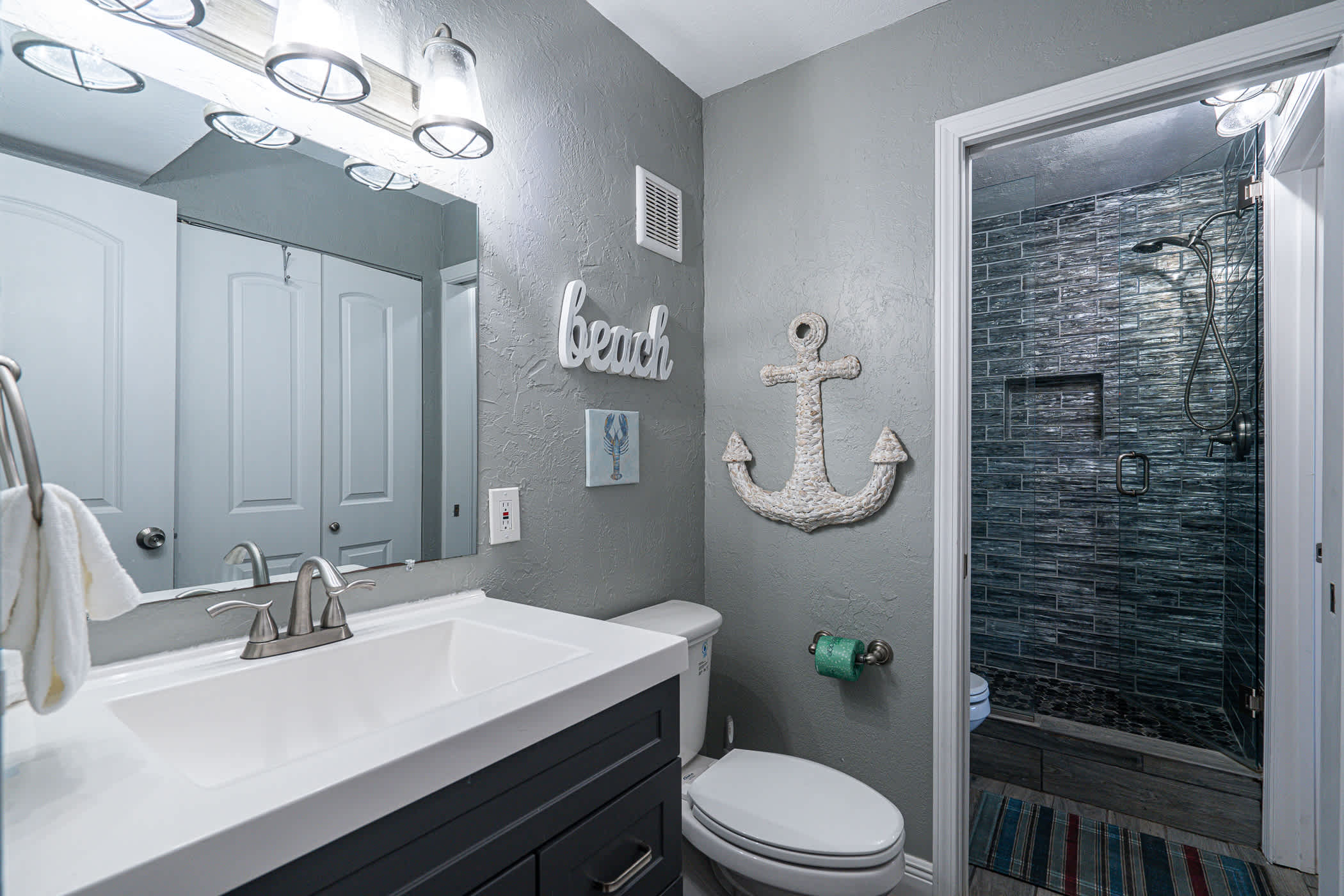 This home sleeps 4 guests between a private bedroom and a hallway nook with a twin-over-twin bunk bed. The bedroom includes a luxurious king size bed fitted with crisp linens and soft blankets for a great night’s sleep, along with a smart TV. The home’s full guest bathroom includes a single vanity and walk-in shower.