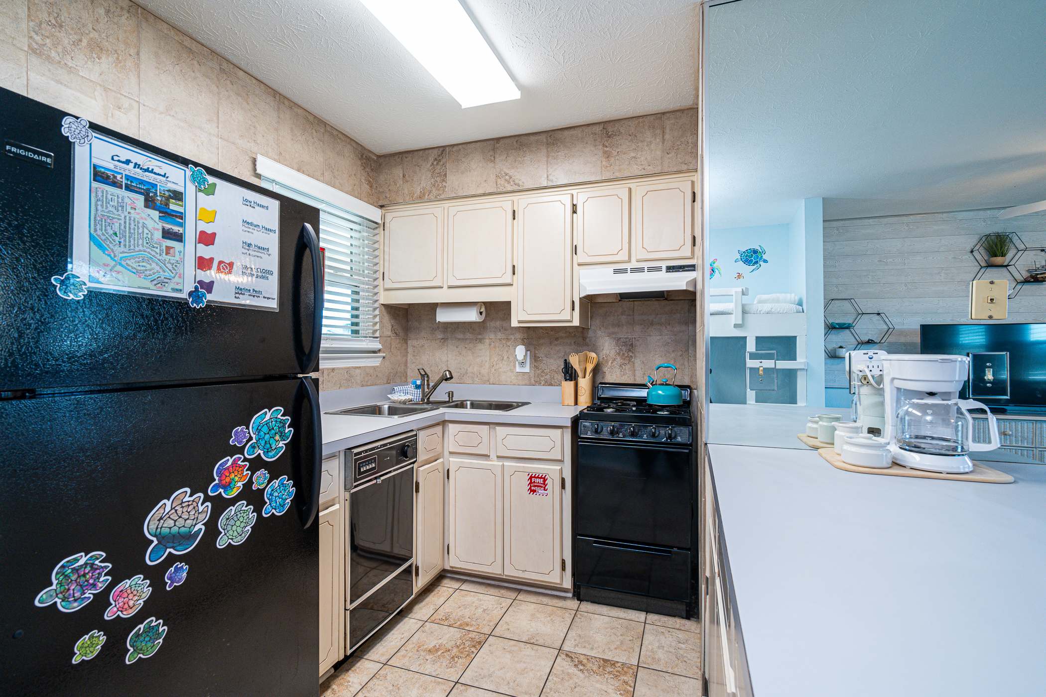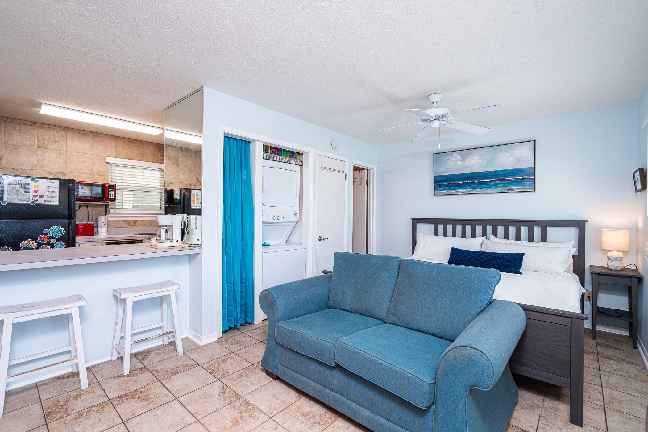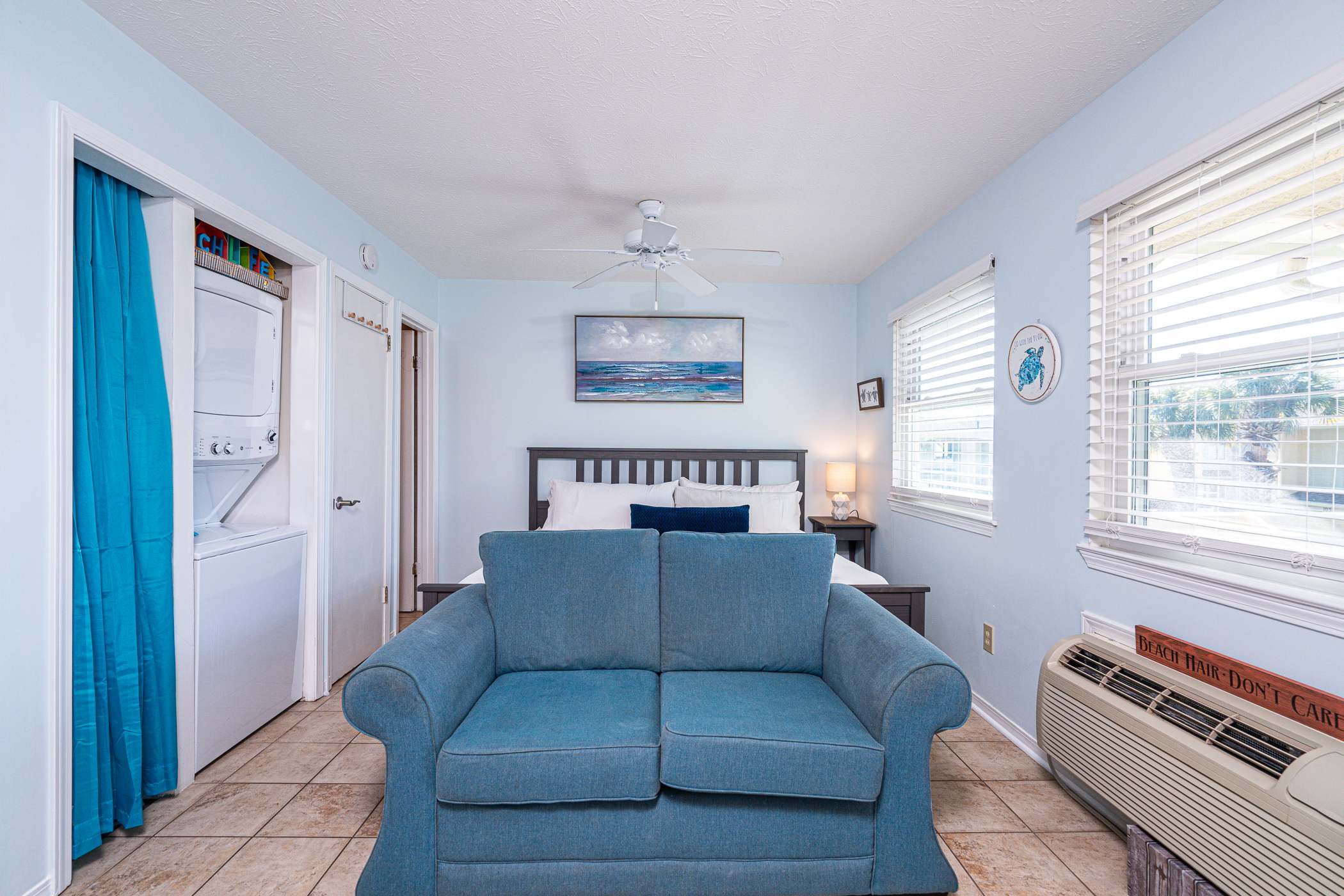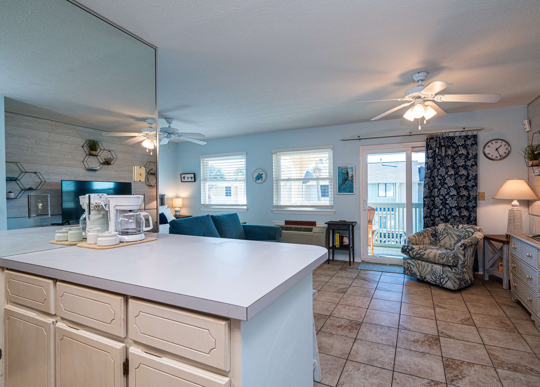 The home’s bright and fresh interior is a welcome sight at the end of long days spent in the sun, with cool tile flooring and soothing neutral tones helping to keep the heat at bay. The chic, coastal inspired décor ensures that the themes of sand and surf remain close to mind. Spend your well-earned downtime relaxing in the living room on the comfortable sofa or armchair while you stream episodes of your favorite show on the smart TV. The quaint kitchen comes well-equipped and ready to assist in preparing light meals and storing all your food supplies. Hop up to the counter on the high-top stools to enjoy a quick bite before heading out the door. Start your day off right with a fresh cup of coffee and step out onto the balcony to enjoy it in the plentiful sunshine as you breathe in the fresh ocean air.
