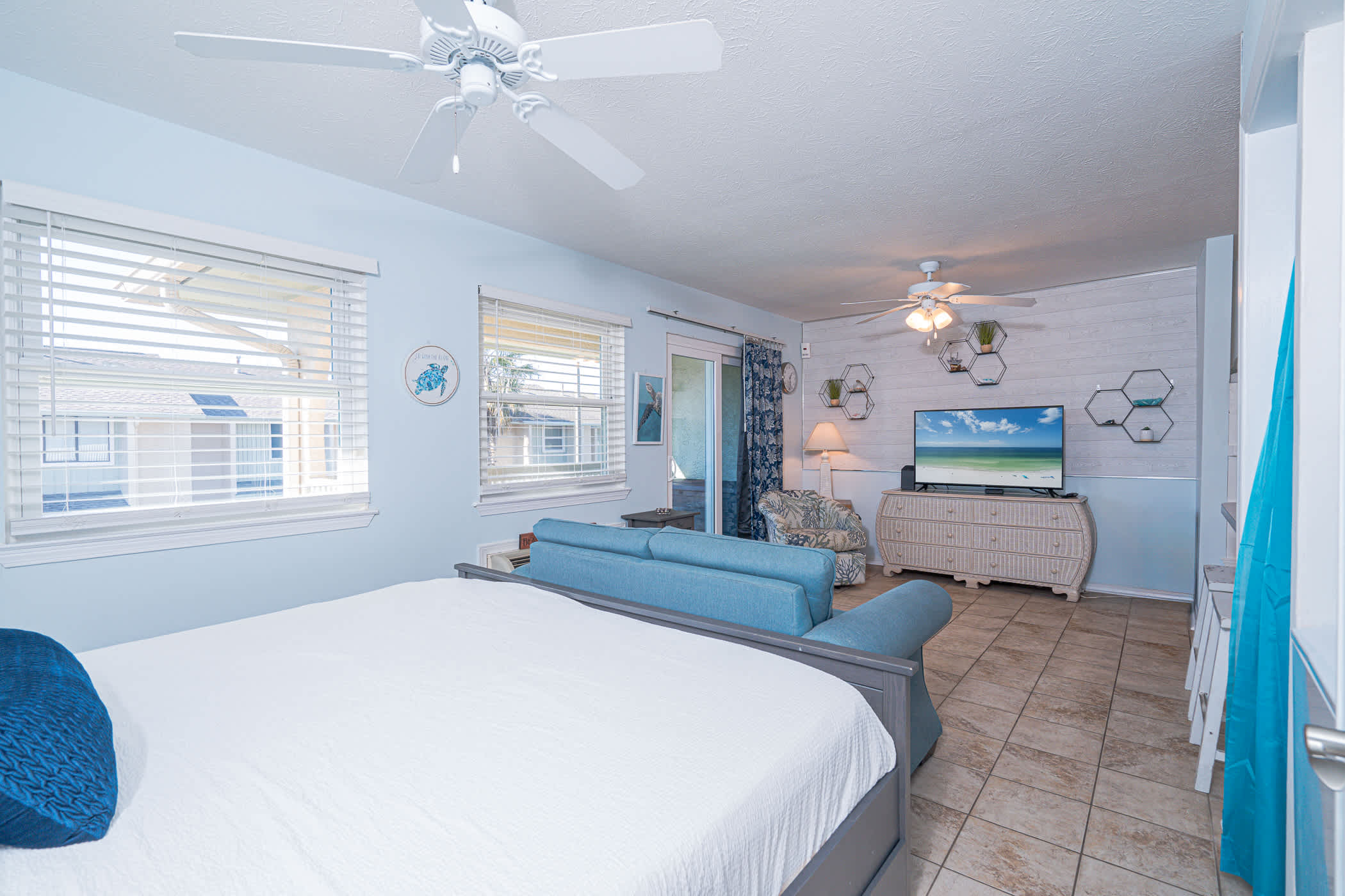 This studio home comfortably sleeps 3 guests between a spacious king size bed and a twin-over-twin bunk bed in an entryway nook. All beds have been fitted with crisp linens and soft blankets for a great night’s sleep. The home’s full guest bathroom includes a single vanity and walk-in shower.