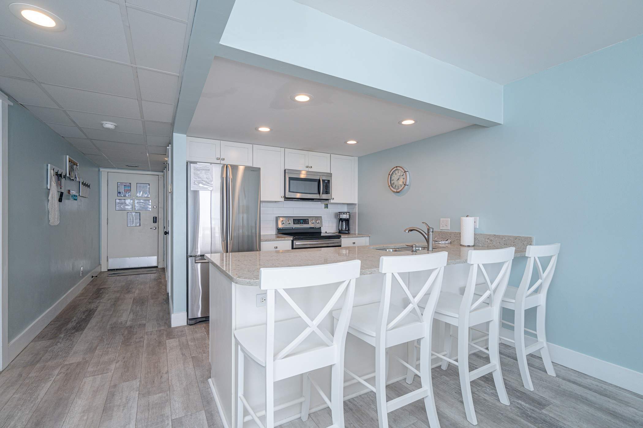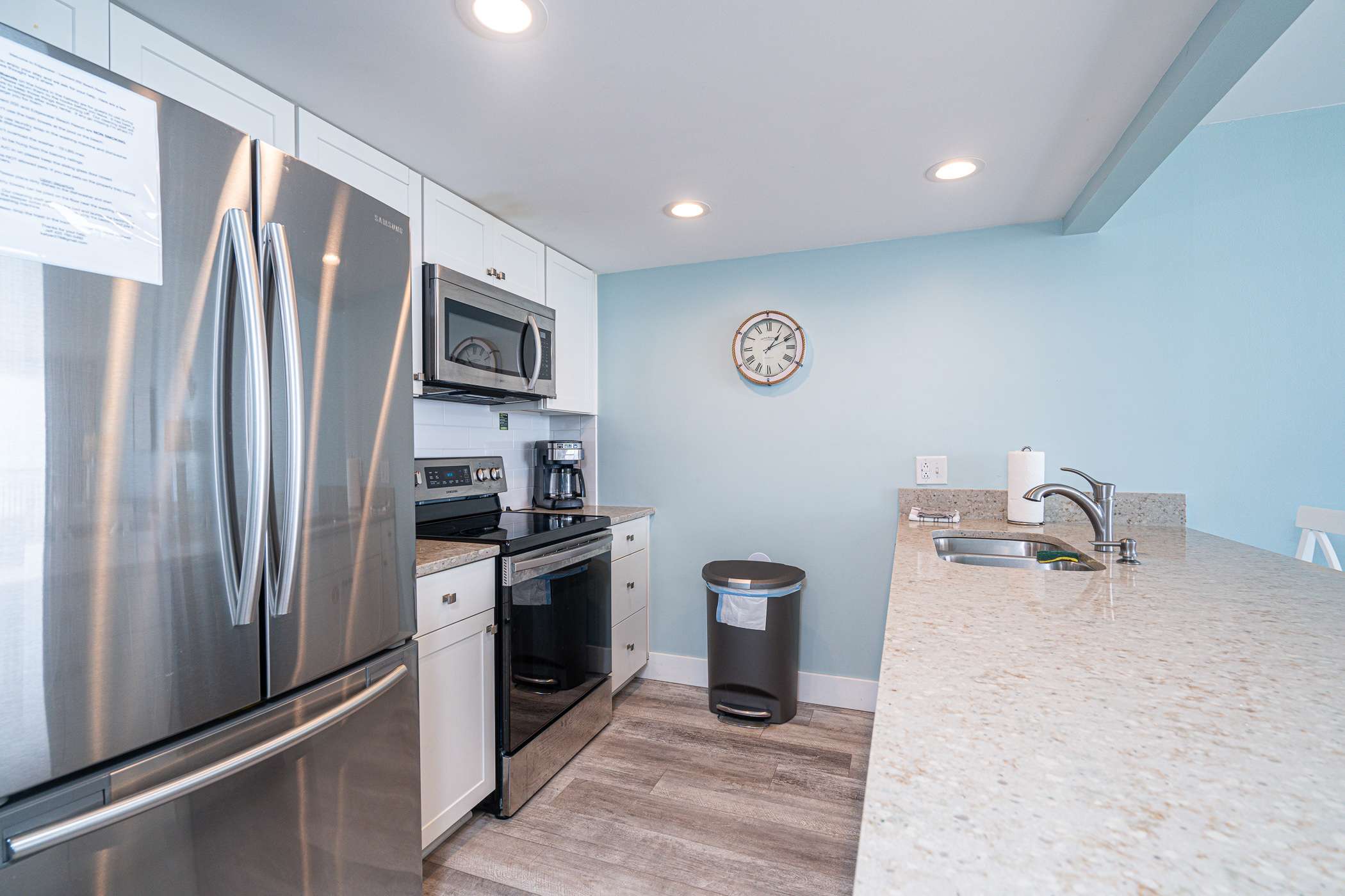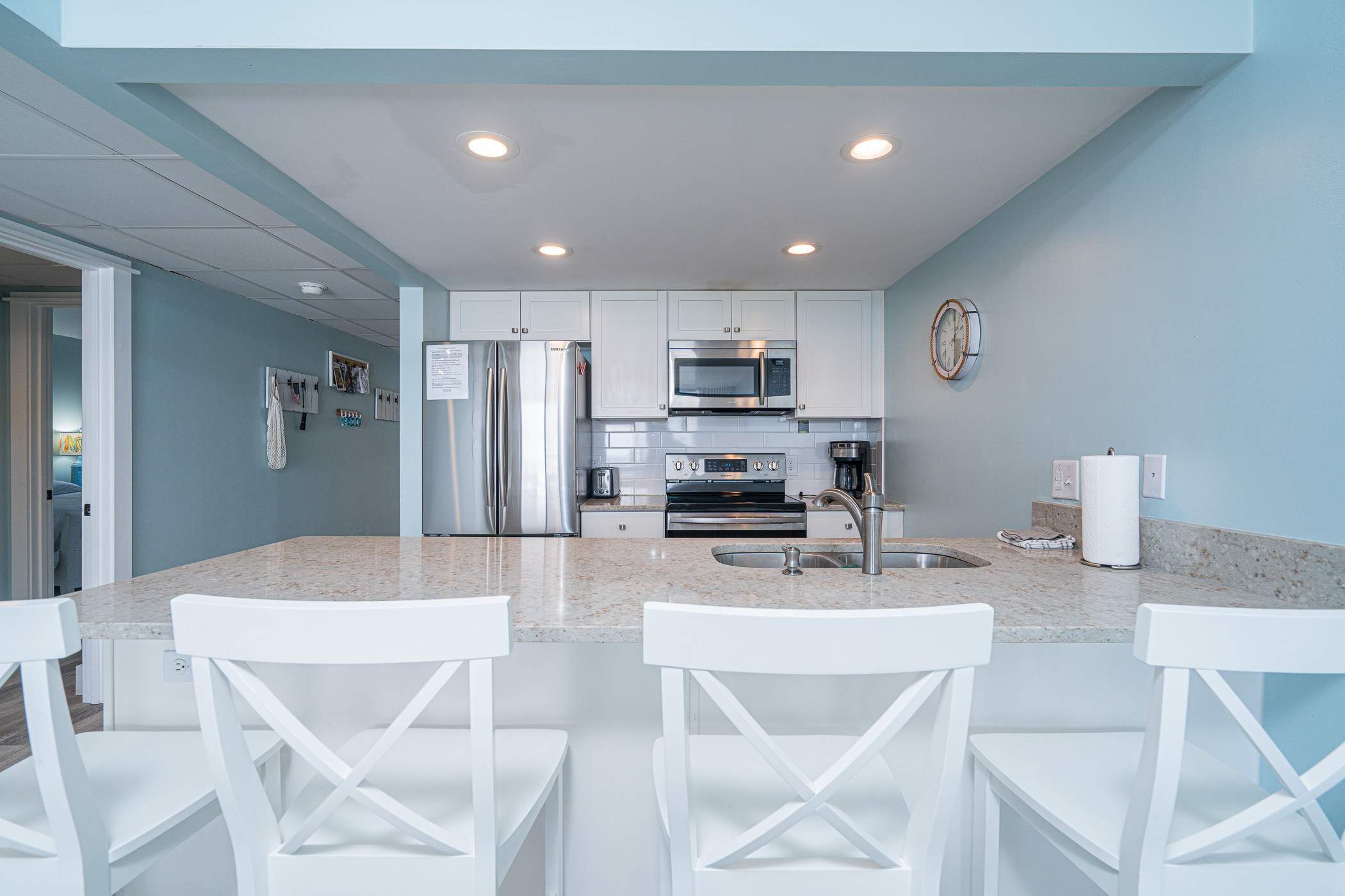 The home’s bright and cheerful interior keeps the sparkling waters front and center not just by way of the spectacular ocean views but also in the charming nautical themed décor. The spacious living room includes a plush sofa and loveseat along with a smart TV where downtime comes easy as you relax and stream all your favorite shows and movies. The modern kitchen showcases stainless steel appliances, stone countertops, and sleek cabinetry stocked with cookware and dining ware for all your meal prep and planning endeavors. Dine together at the kitchen counter courtesy of the 4 high-top bar stools.