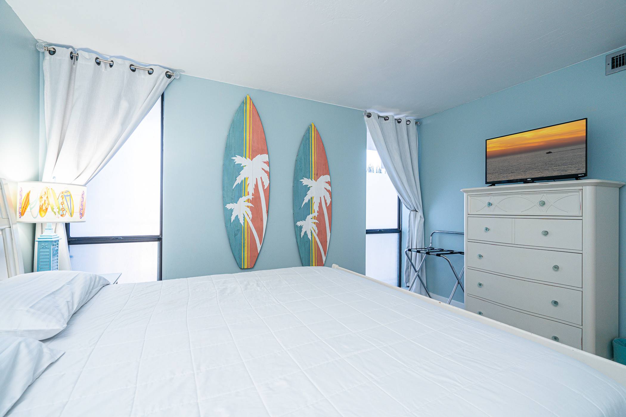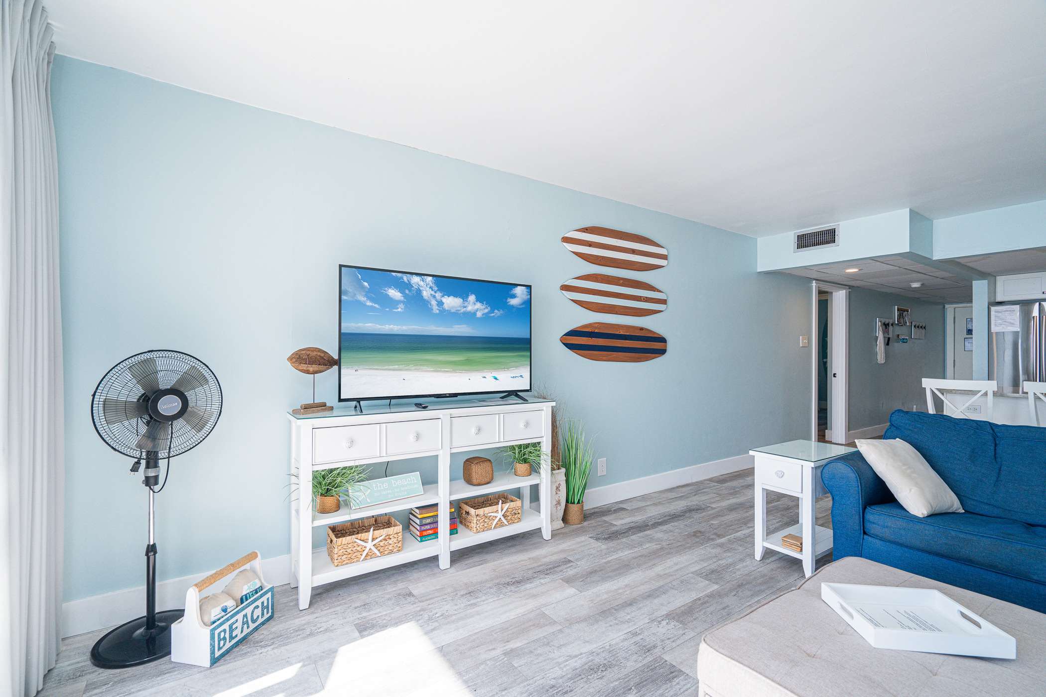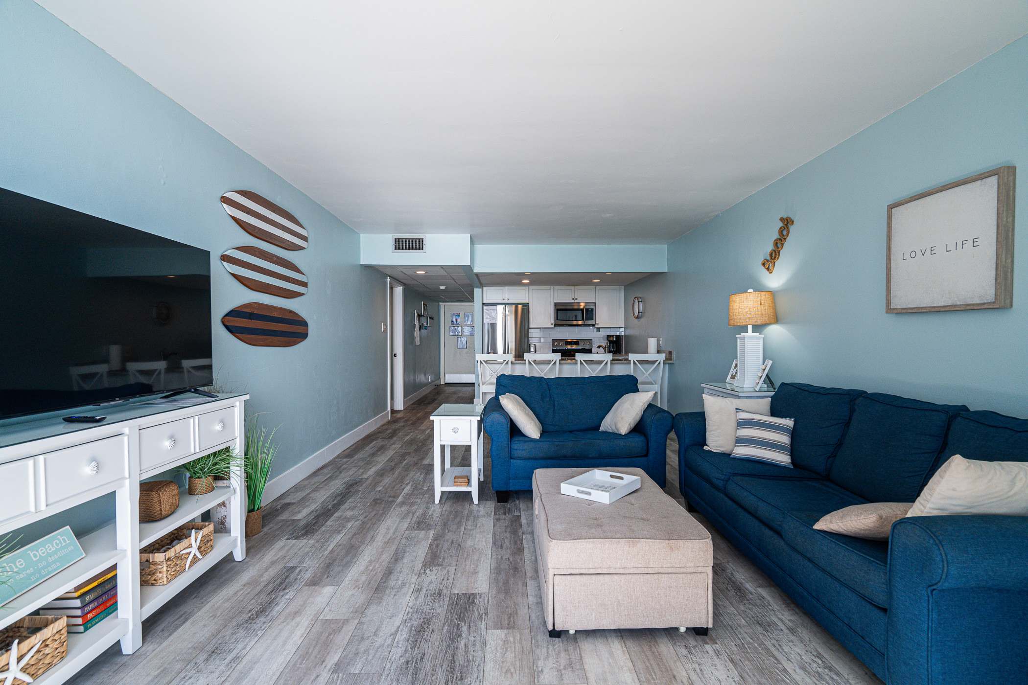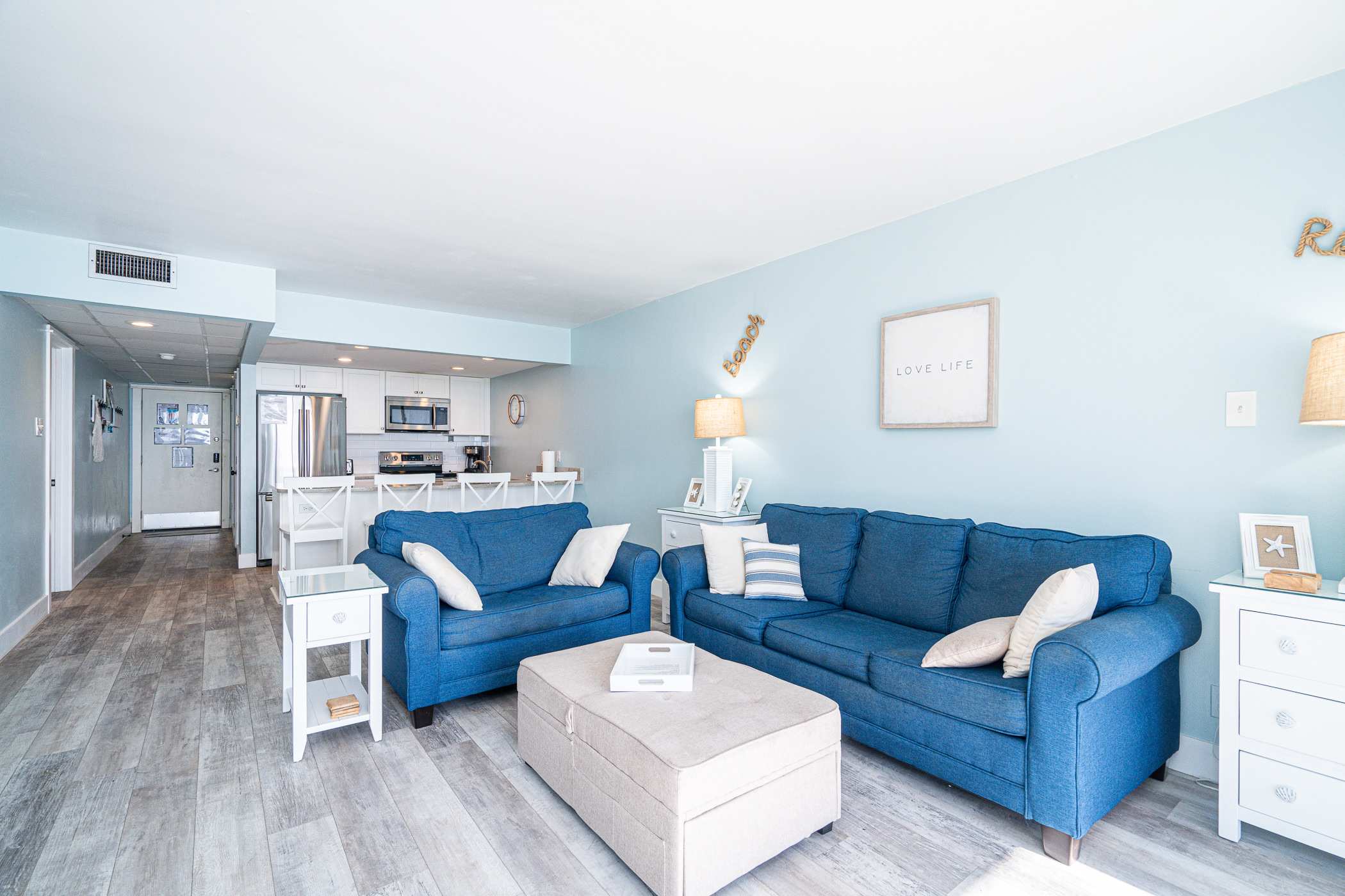 The home’s bright and cheerful interior keeps the sparkling waters front and center not just by way of the spectacular ocean views but also in the charming nautical themed décor. The spacious living room includes a plush sofa and loveseat along with a smart TV where downtime comes easy as you relax and stream all your favorite shows and movies. The modern kitchen showcases stainless steel appliances, stone countertops, and sleek cabinetry stocked with cookware and dining ware for all your meal prep and planning endeavors. Dine together at the kitchen counter courtesy of the 4 high-top bar stools.