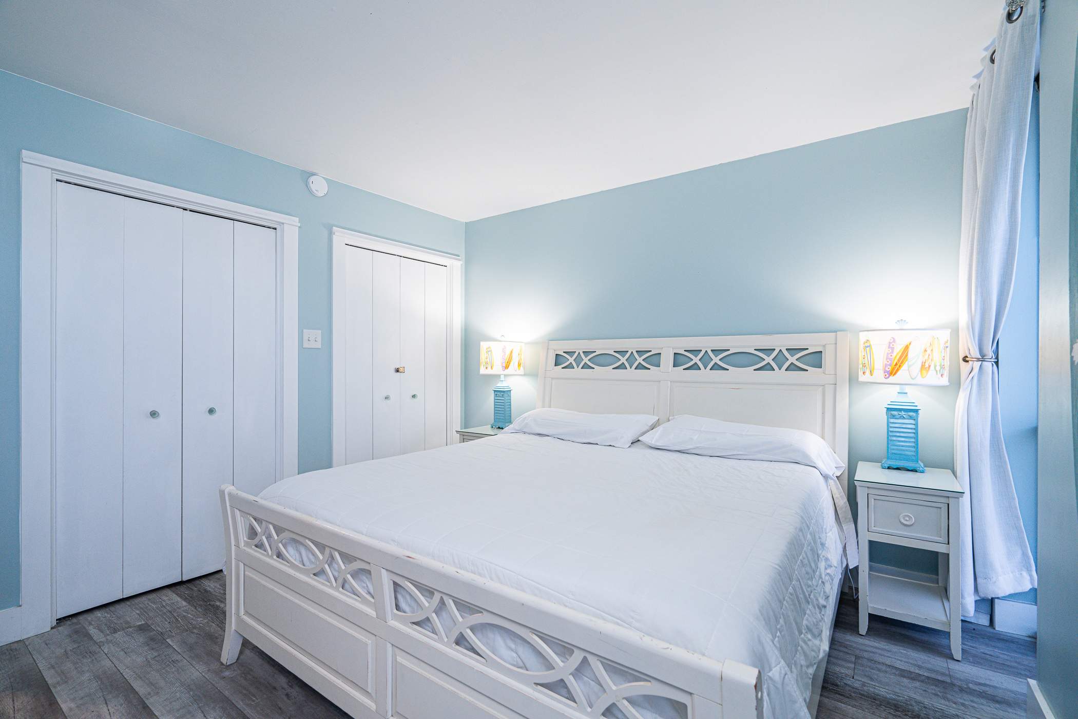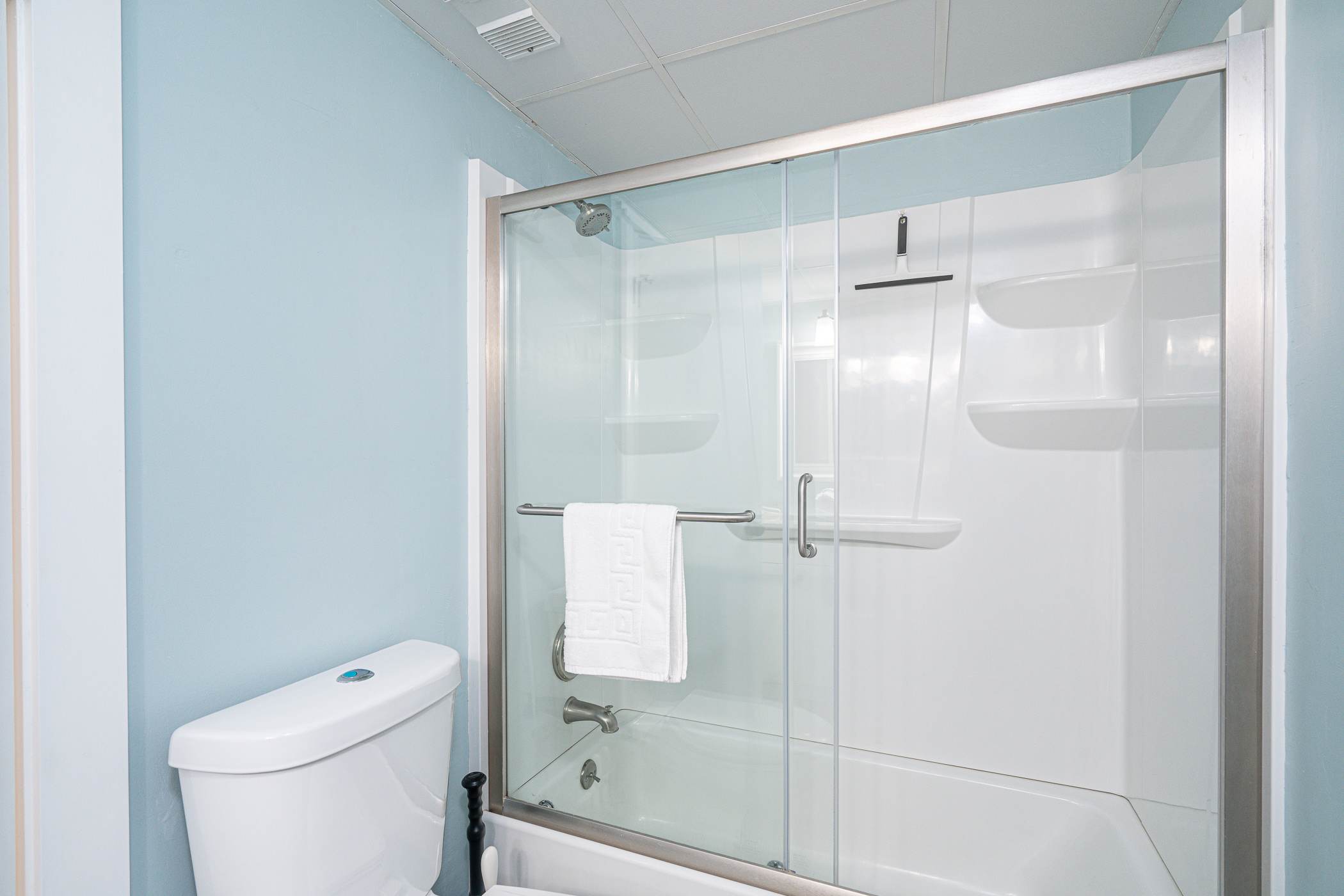 This home comfortably sleeps up to 5 guests between 1 private bedroom, a queen and twin size sleeper sofa in the living room. The bedroom includes a spacious king size bed with fresh linens and soft blankets for a great night’s sleep, along with a smart TV. The home also includes 2 full guest bathrooms, the first with a single vanity and shower/tub combo and the second with a single vanity and glass walk-in shower.