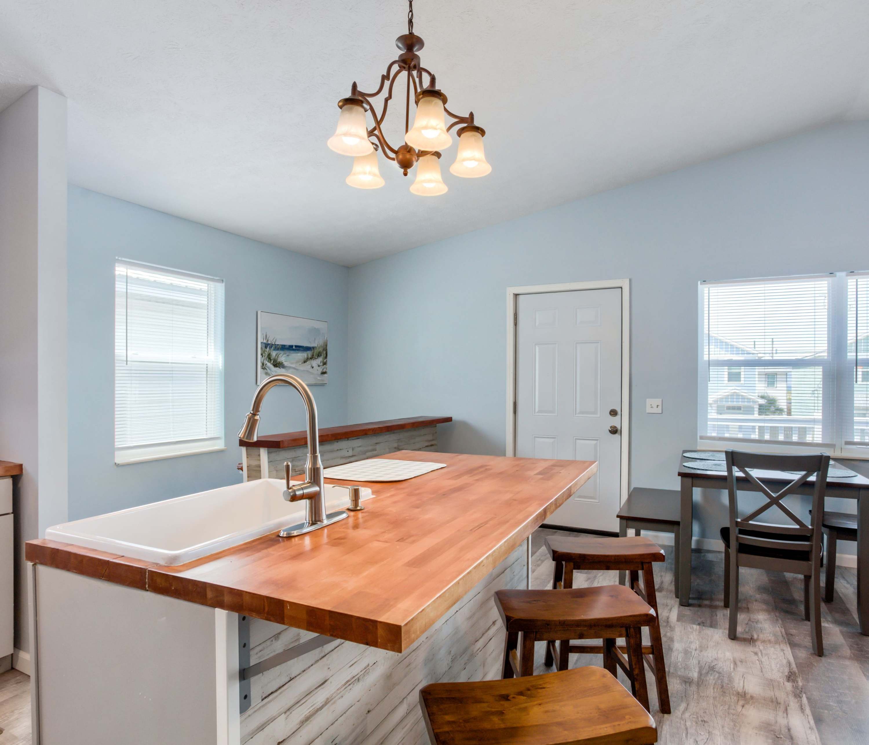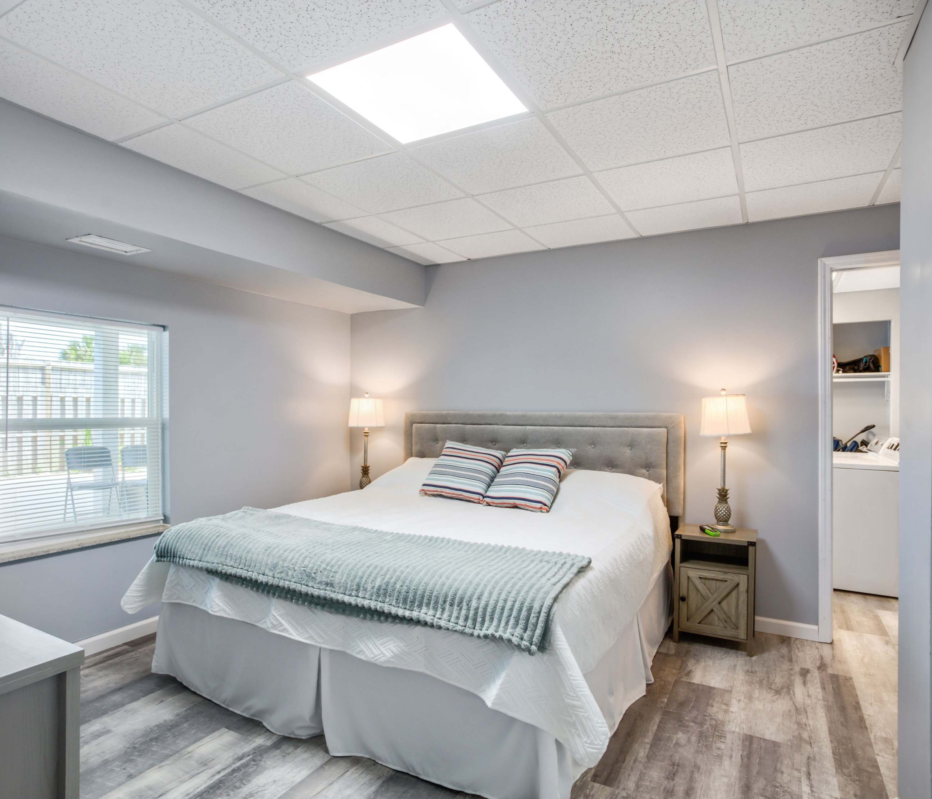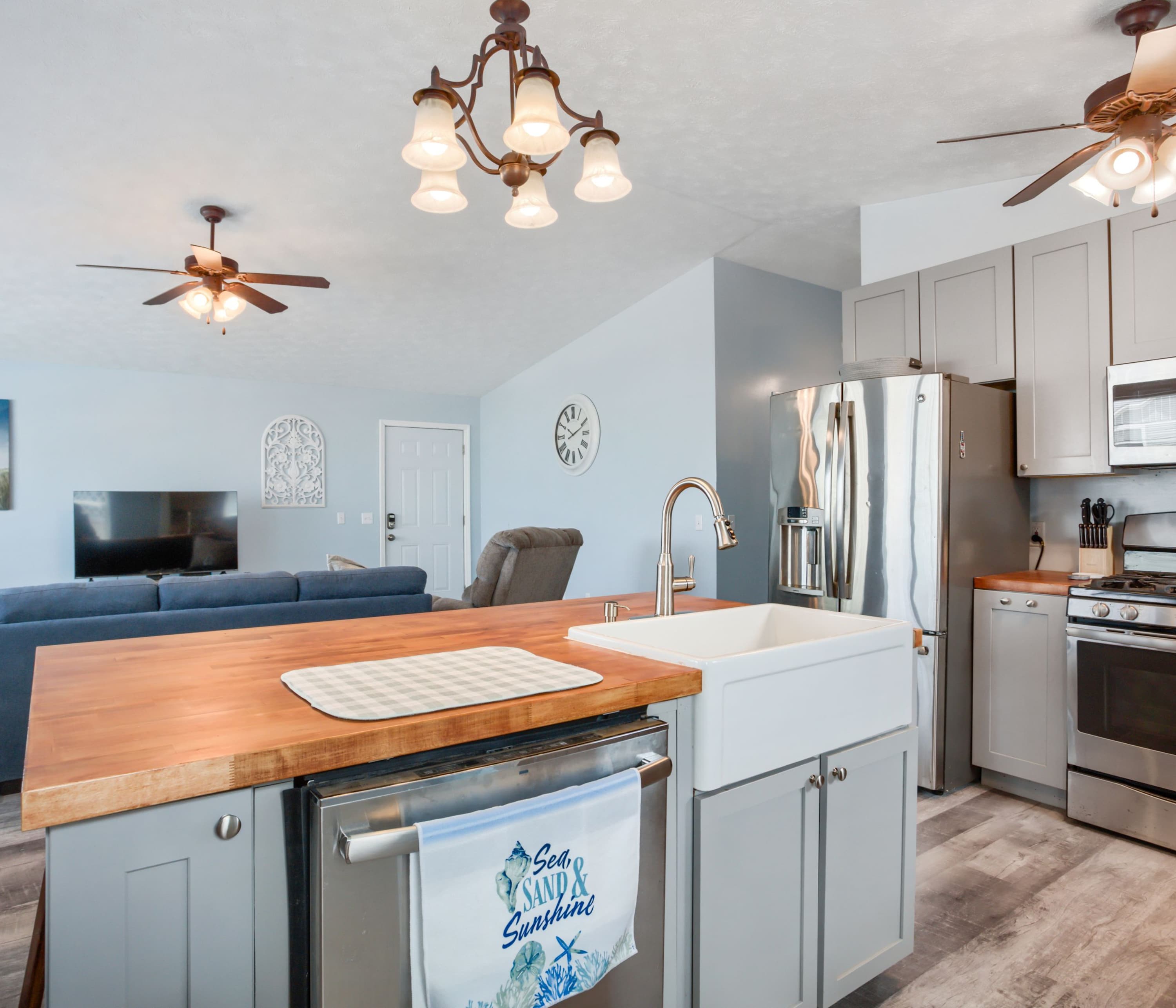 Relax with your crew in the living room featuring comfortable seating and a smart TV, while the lucky chef gets to enjoy working their magic in the adjacent kitchen. This home is fully equipped for all culinary needs - from stainless steel appliances to coffee maker and cookware – ensuring an effortless preparation of beachside picnics or family-style meals to share at the dining table. And don't forget about movie nights either; snuggle up around another smart TV downstairs on cozy couches. Finish off your days outside under sunset skies at our ground-level patio equipped with grill and picnic table—perfect for BBQs and al fresco meals!