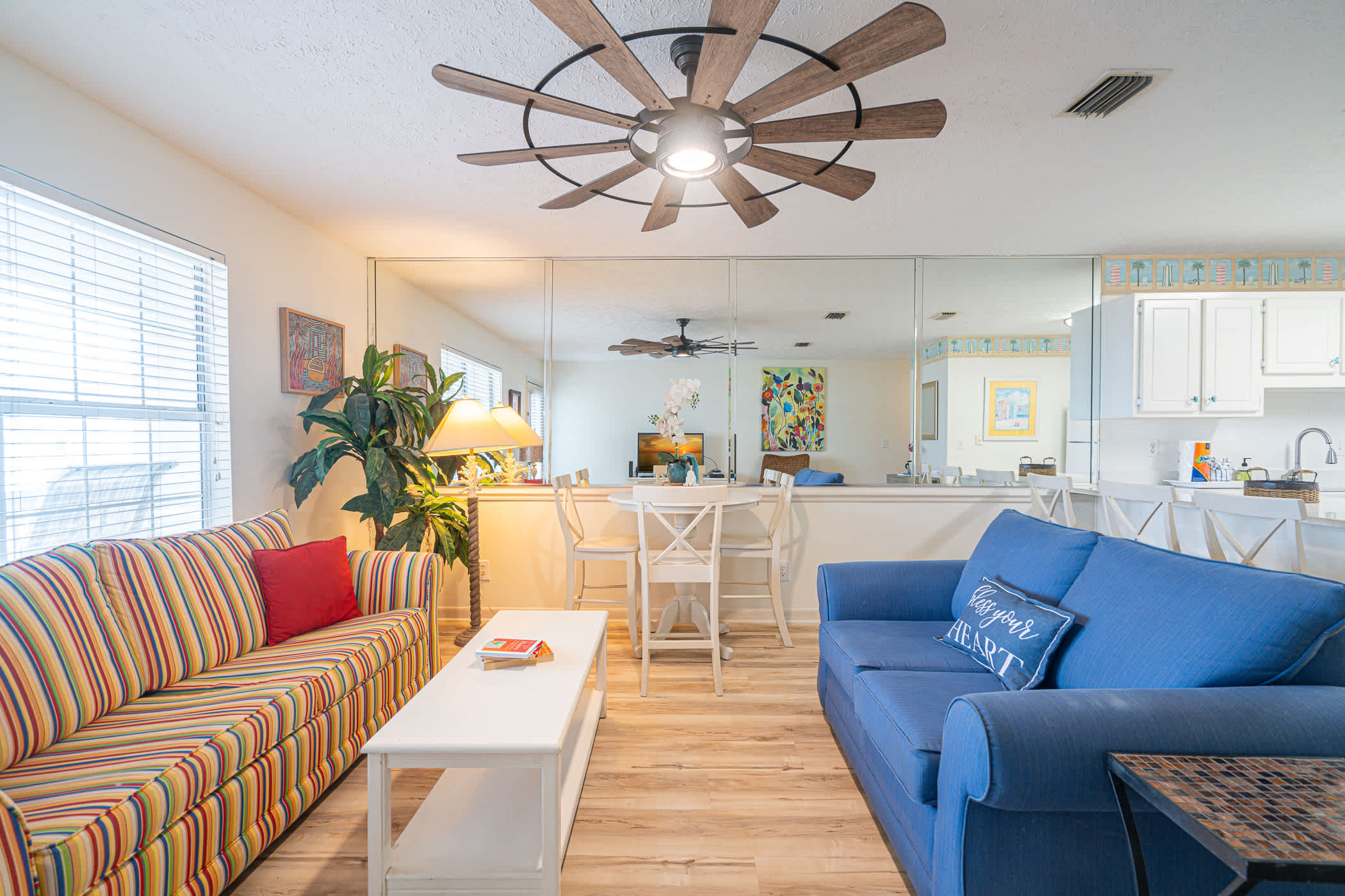 The living room has a soft, calming white-and-blue palette, offset by sudden pops of color. Large picture windows allow ample natural light, and view of the gulf. A comfy seating area around a smart TV is perfect for leisurely times indoors. The balcony is airy and spacious, with a seating arrangement for 3, the gulf can be seen from her as well.