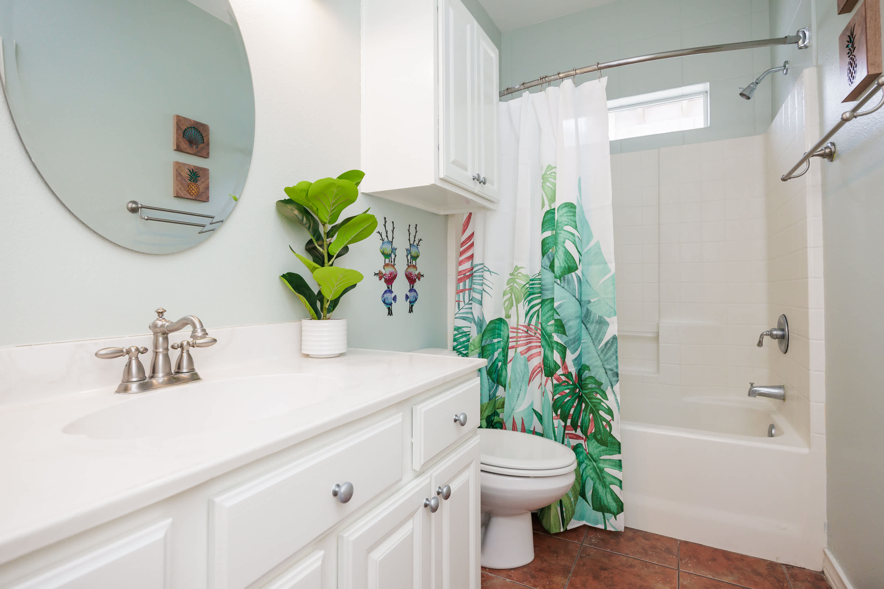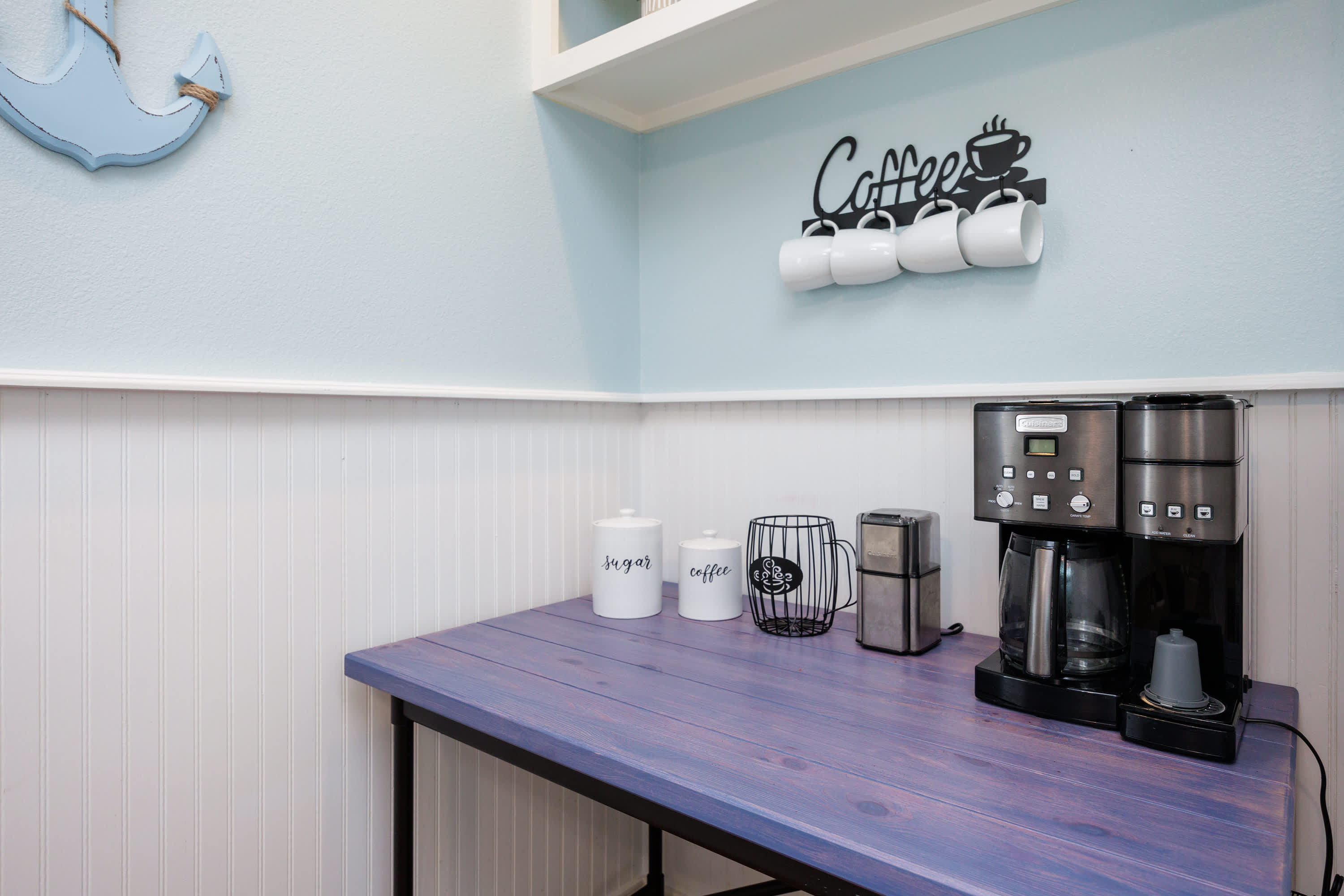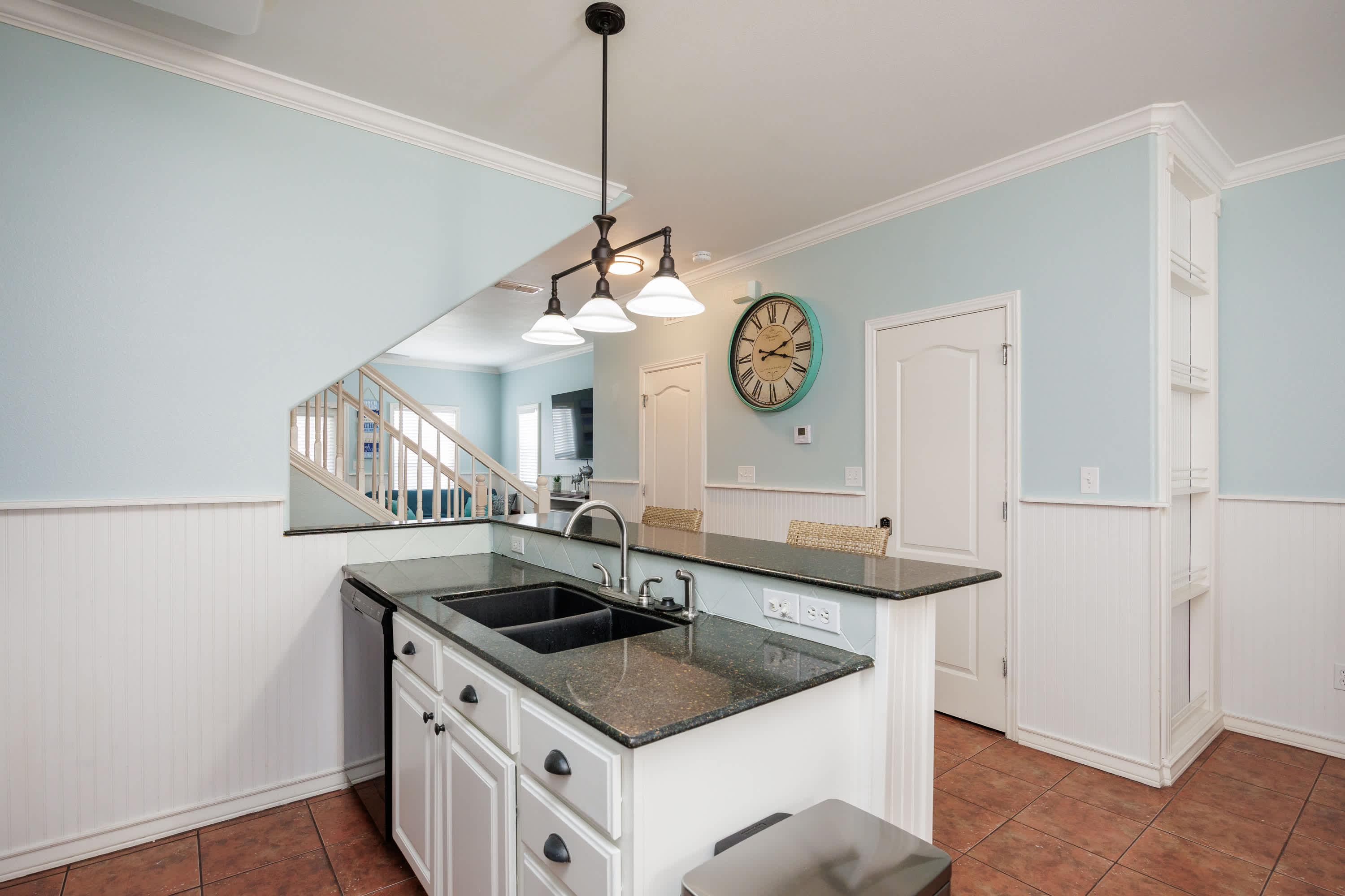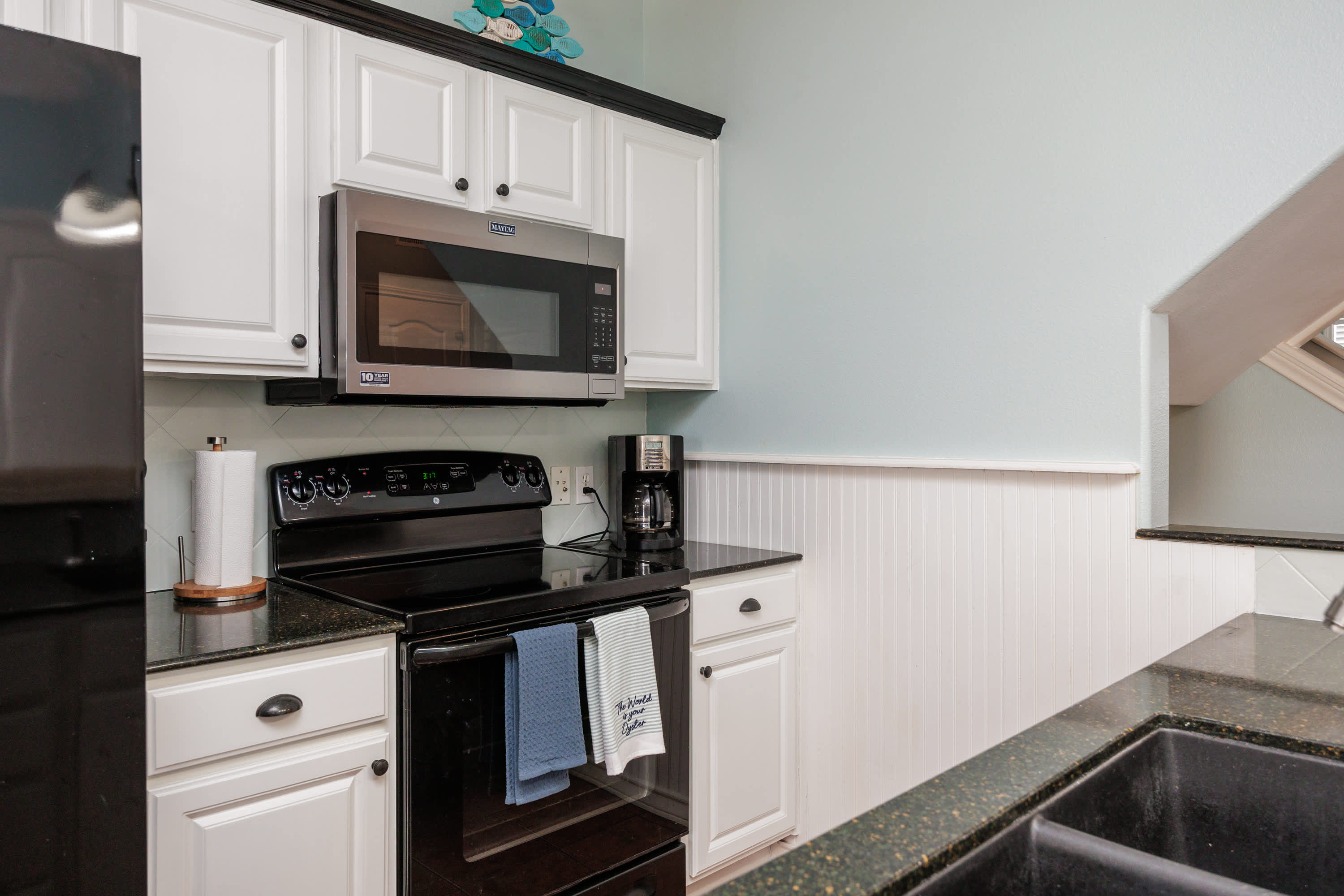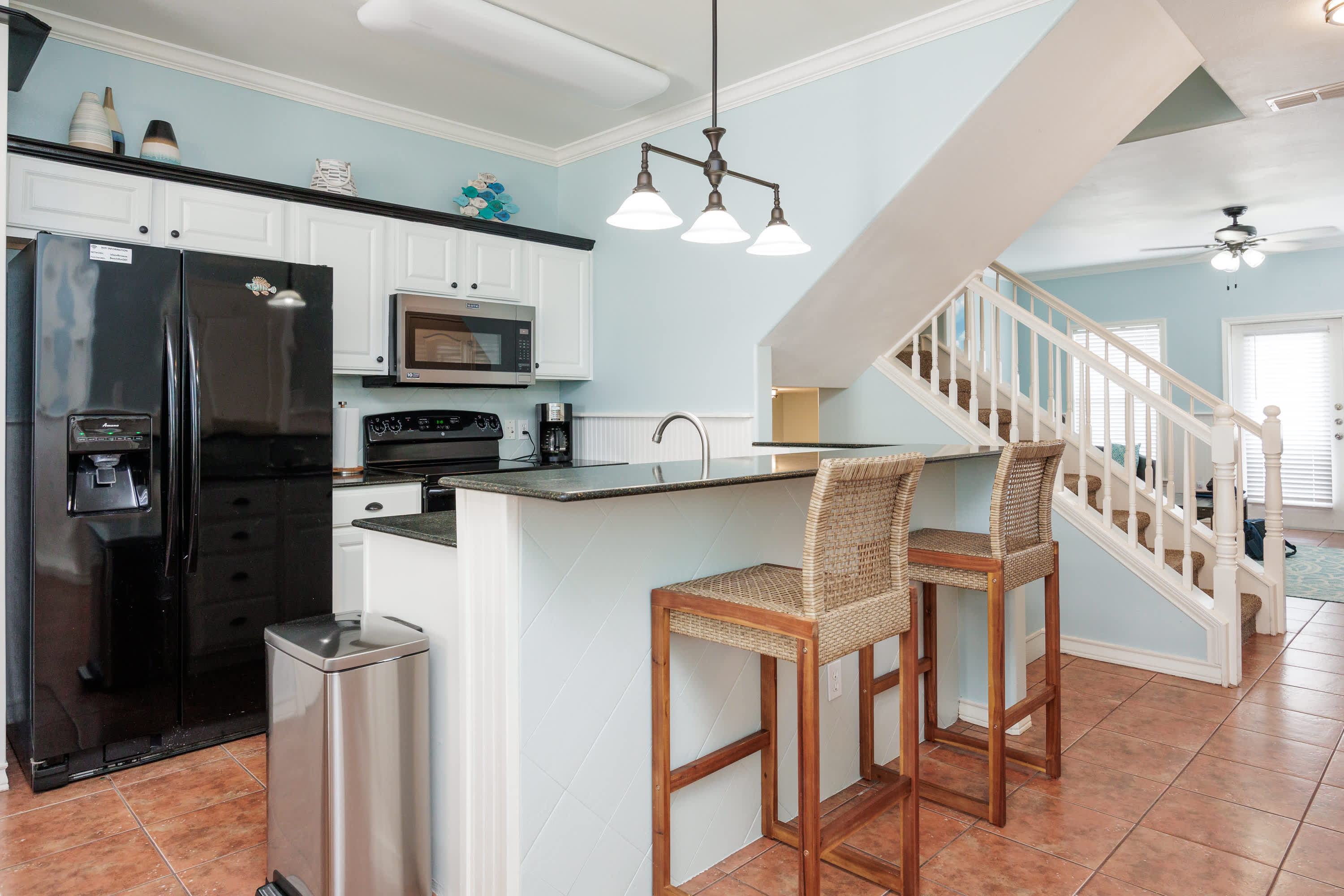 The living room offers a plush sofa and armchair seating as well as a large, mounted smart TV for spending your downtime catching up on episodes of your favorite shows. Steps away, the fully equipped kitchen showcases all-black appliances, glossy granite countertops, and sleek white cabinetry stocked with all the cookware and dining ware needed to whip up convenient meals at home. Gather the group together for formal dining at the table with seating for 6 or on 2 additional high-top stools at the counter. Let the coffee bar be your first stop in the morning on your way out to the shaded balcony, soaking in the fresh salty air as those first few sips help get you ready for another exciting day in paradise.