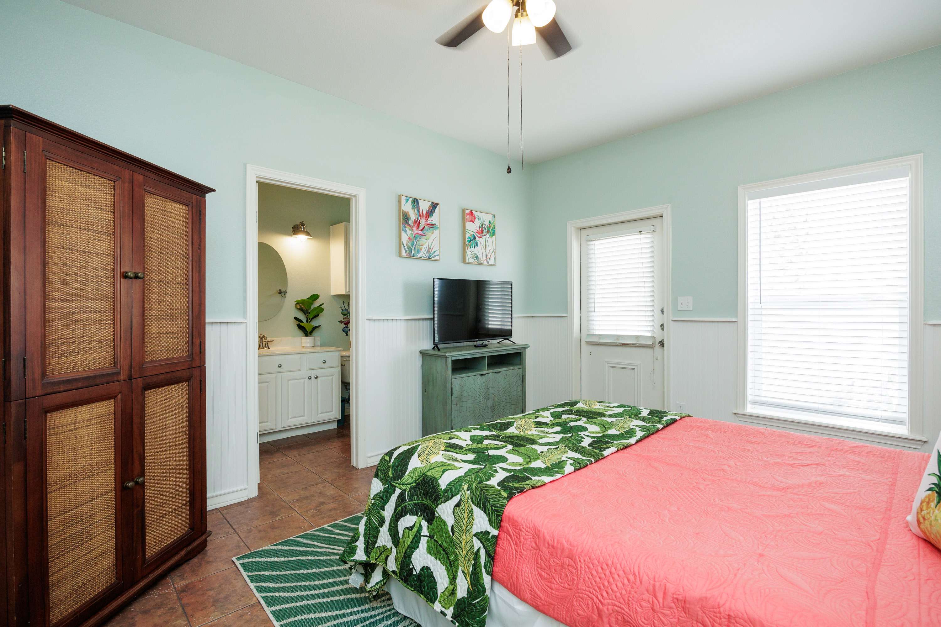 Bedroom #1 includes a queen size bed, patio access, and ensuite bathroom with a single vanity and shower/tub combo.