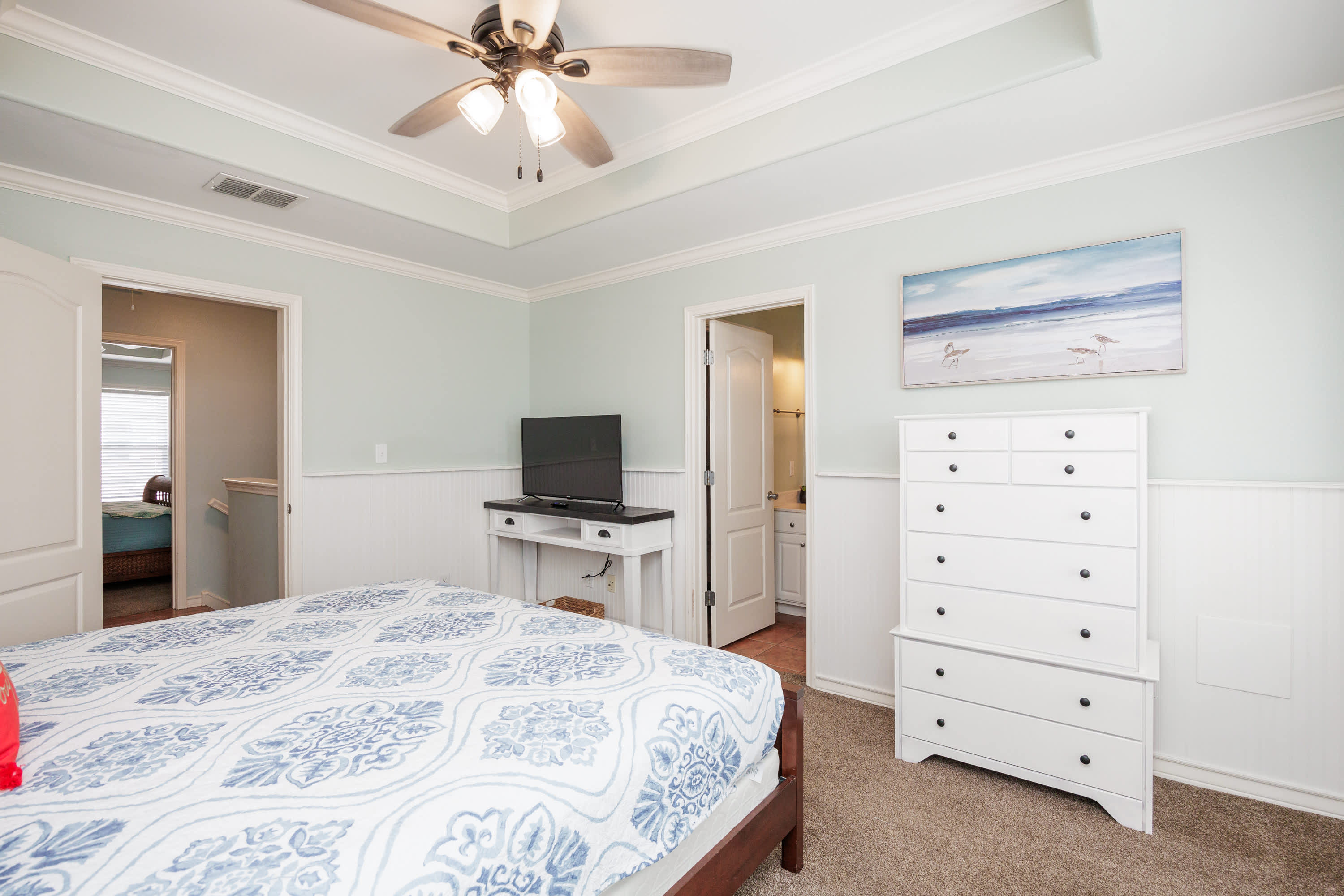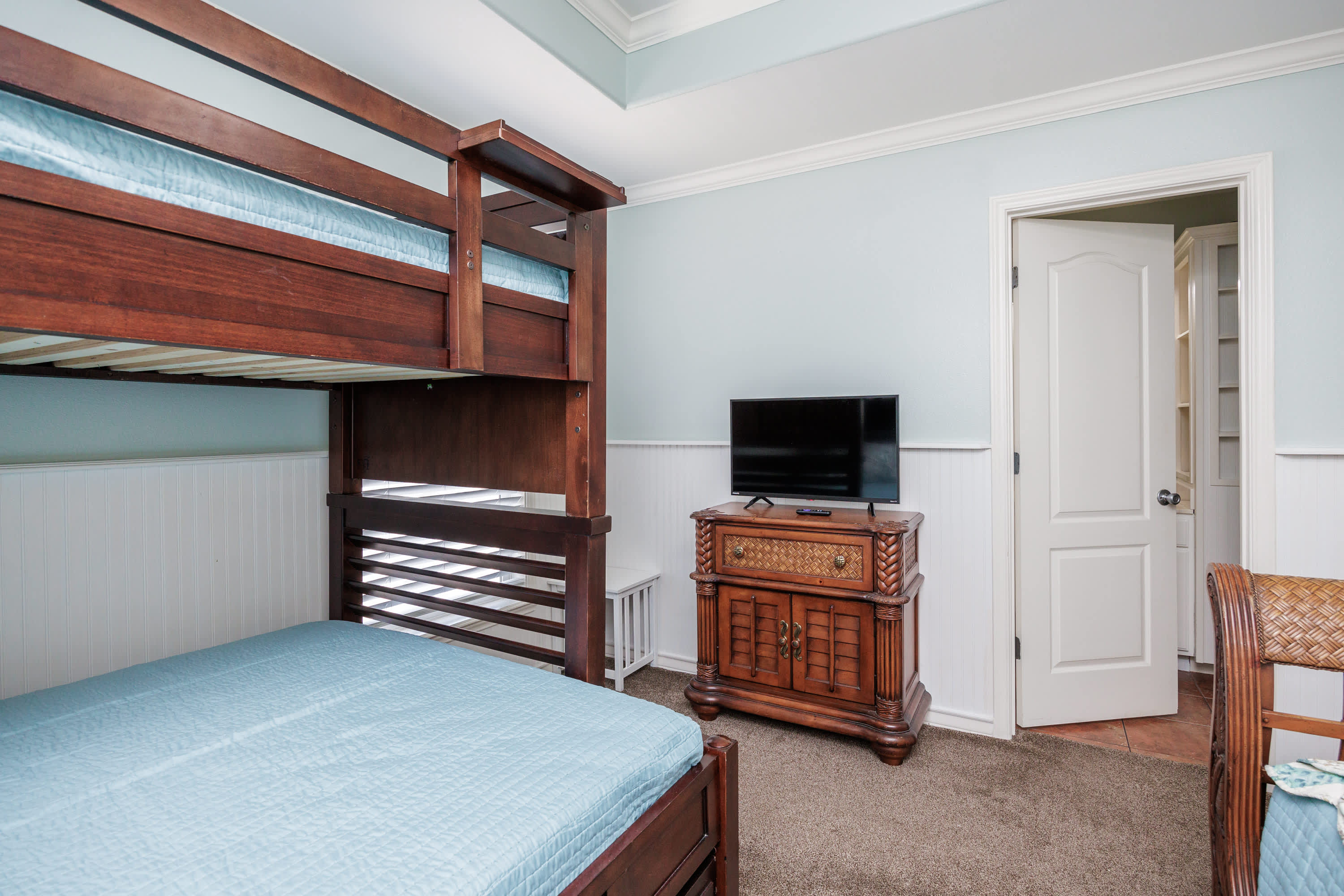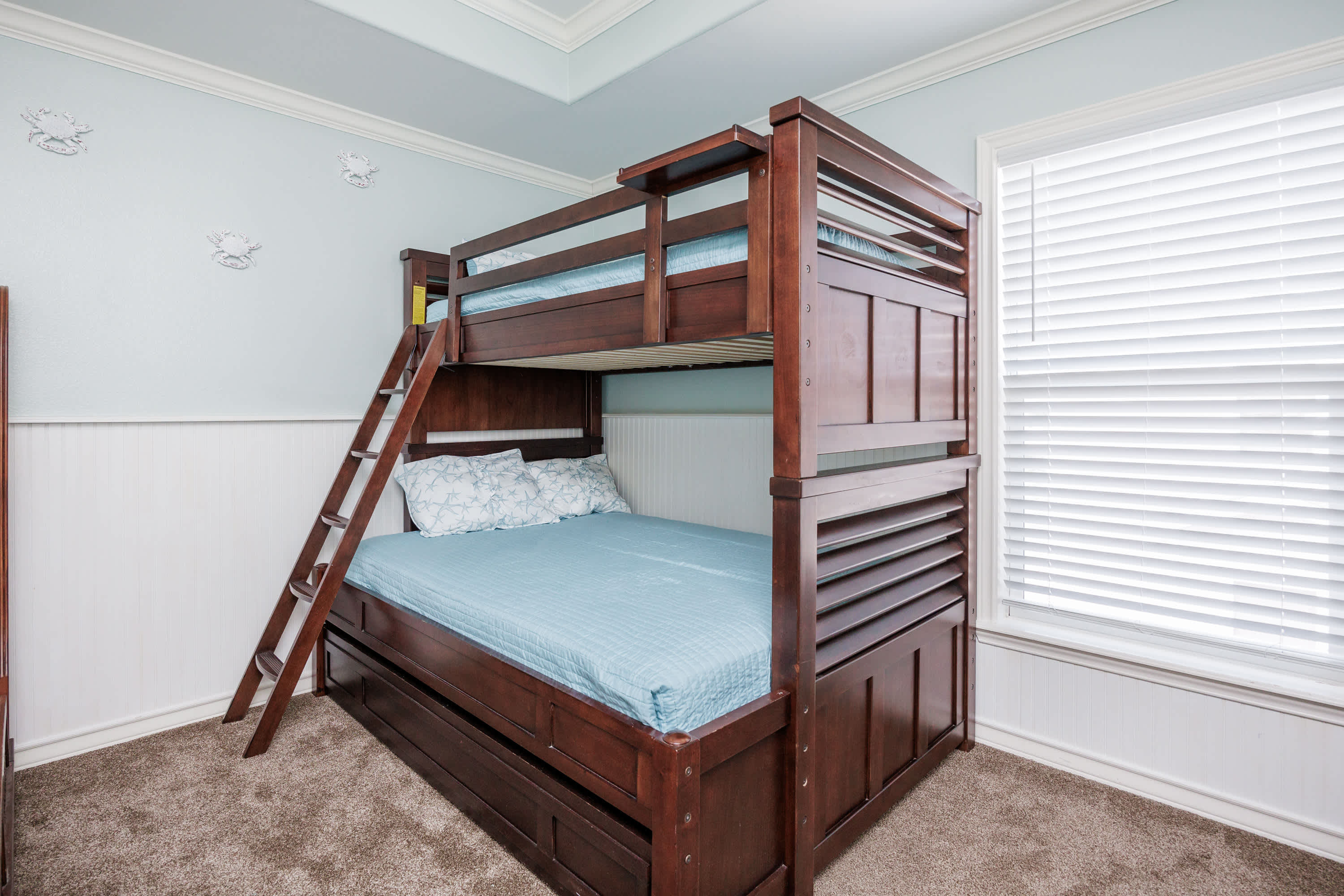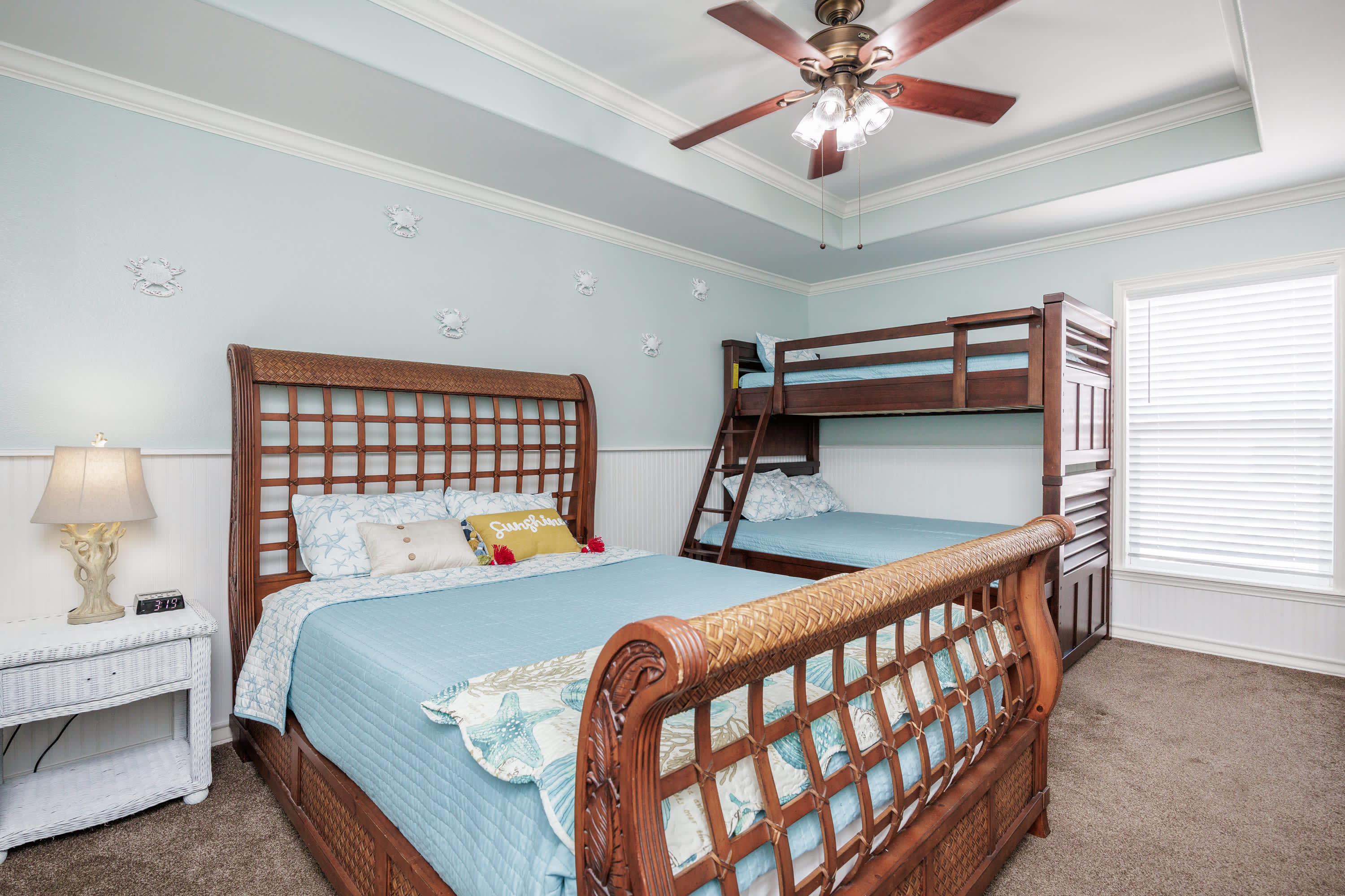 Bedroom #3 includes a queen size bed, a twin-over-full bunkbed, and ensuite bathroom with a single vanity and shower/tub combo.