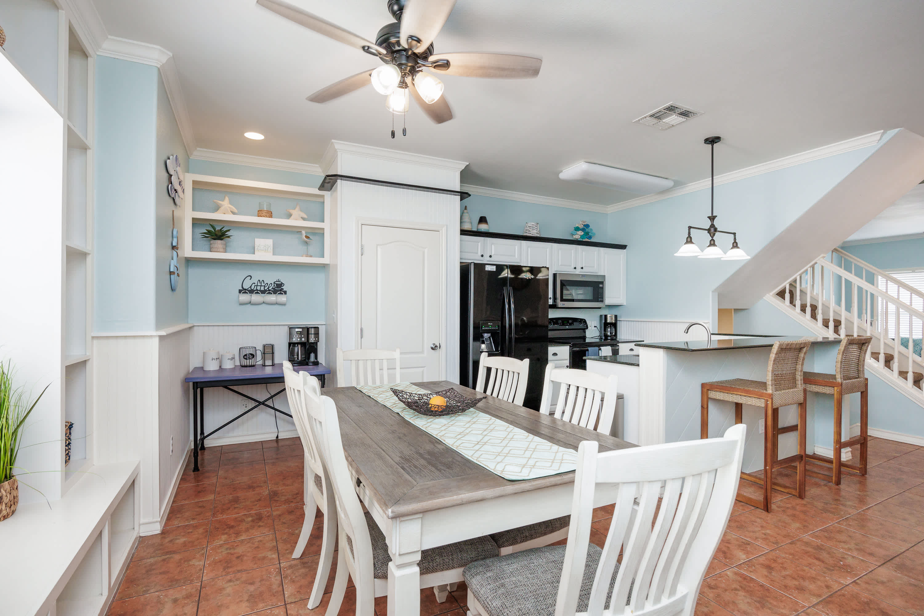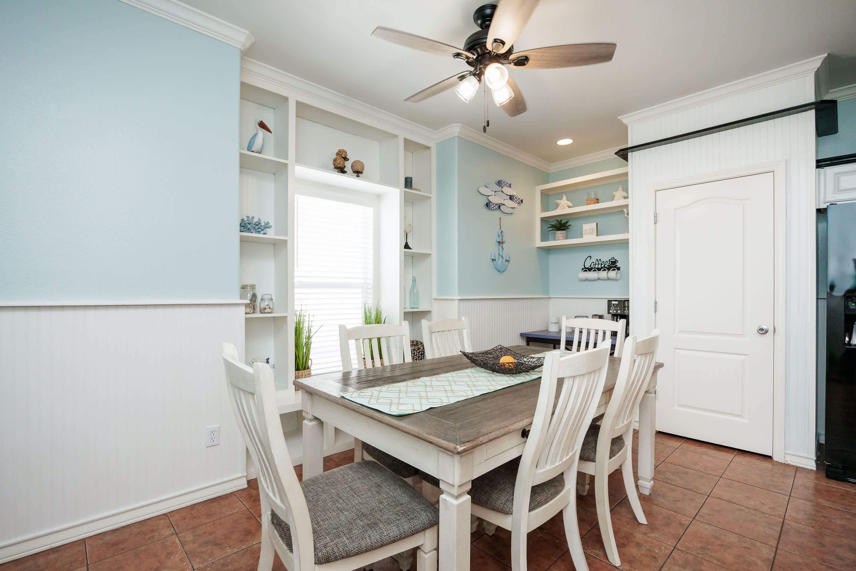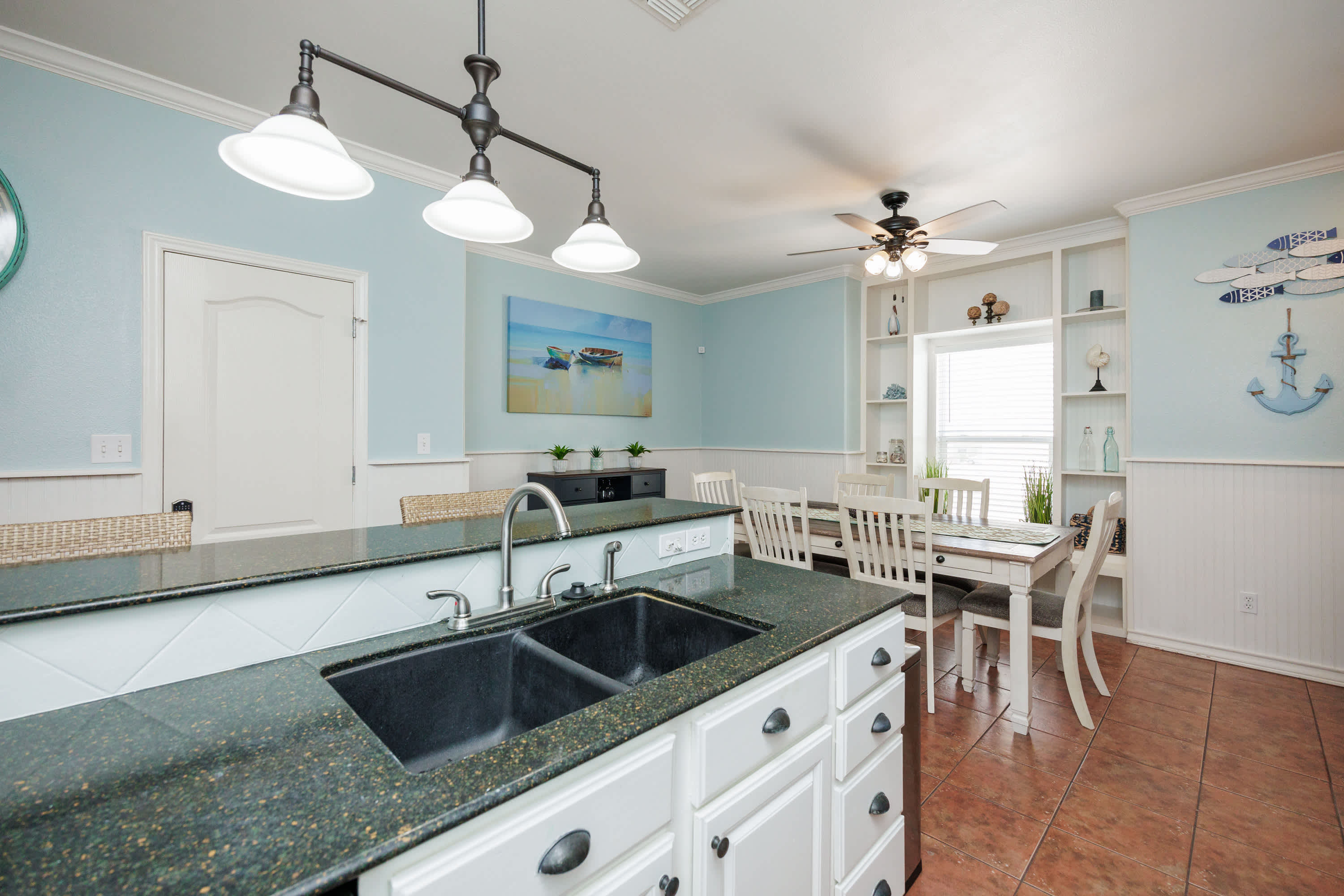 At the home, you’ll be within walking distance of the sandy beaches and sparkling waters of the Texas Gulf and the North Padre Island Seawall. For cooling off a little closer, the complex’s outdoor pool is a tropical oasis, enveloped by palm trees inviting you to feel the refreshing breeze while you take a dip or stretch out in one of the loungers. Dining and shopping are just a stone’s throw away from your front door, and you can opt to explore by foot or via the included, optional 6-person golf cart.