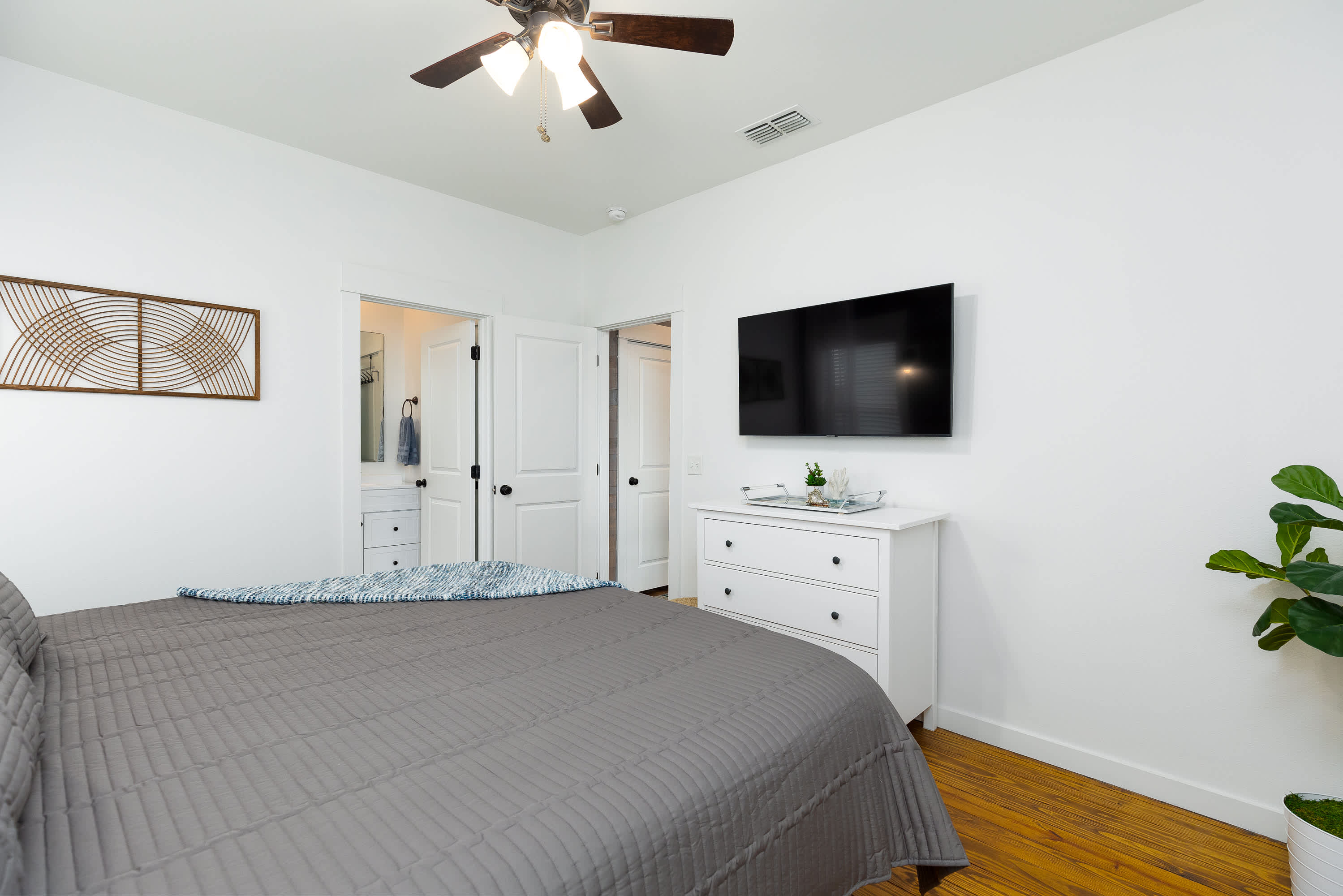 Bedroom #3 includes a king size bed, TV, and ensuite bathroom with a single vanity and shower/tub combo.