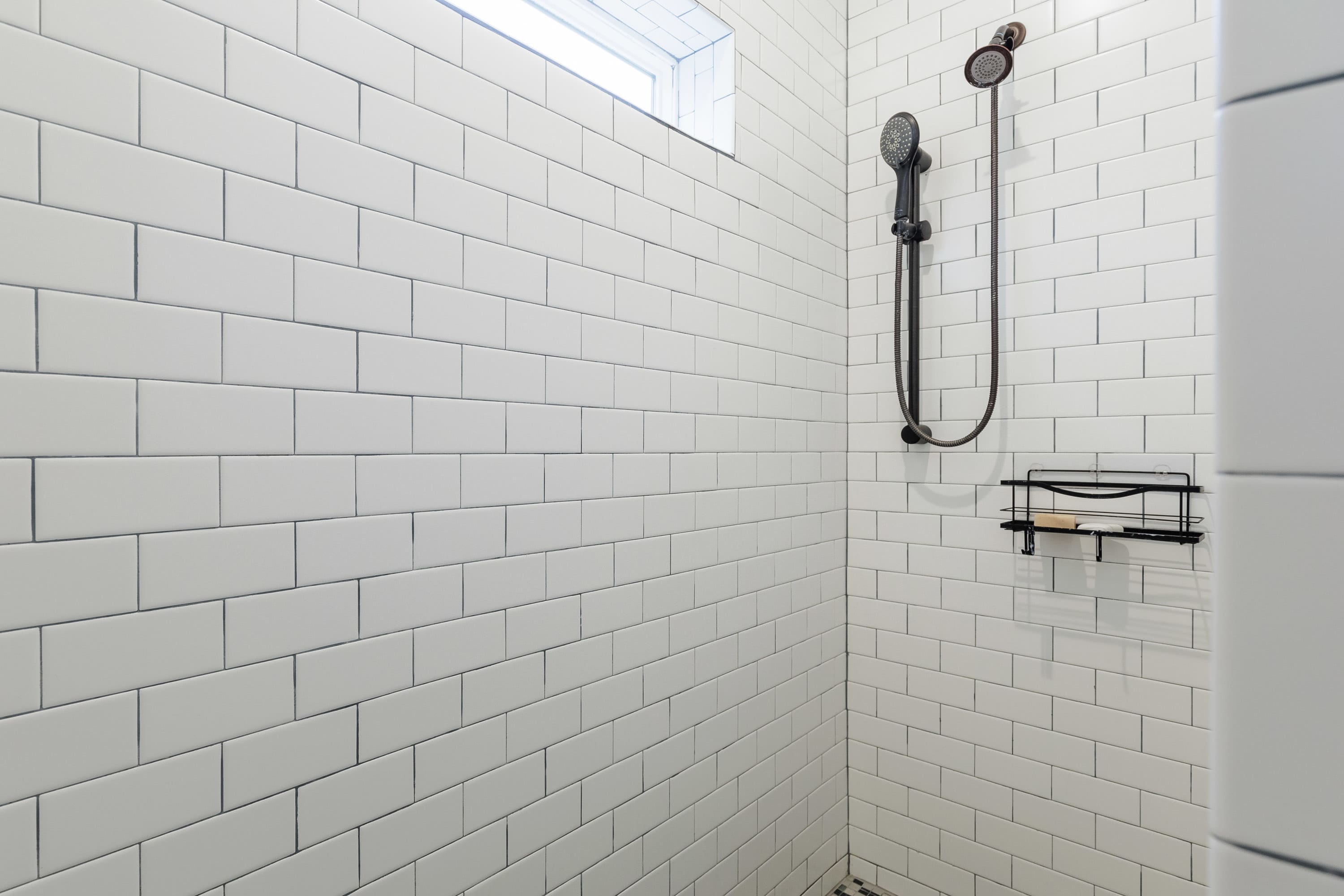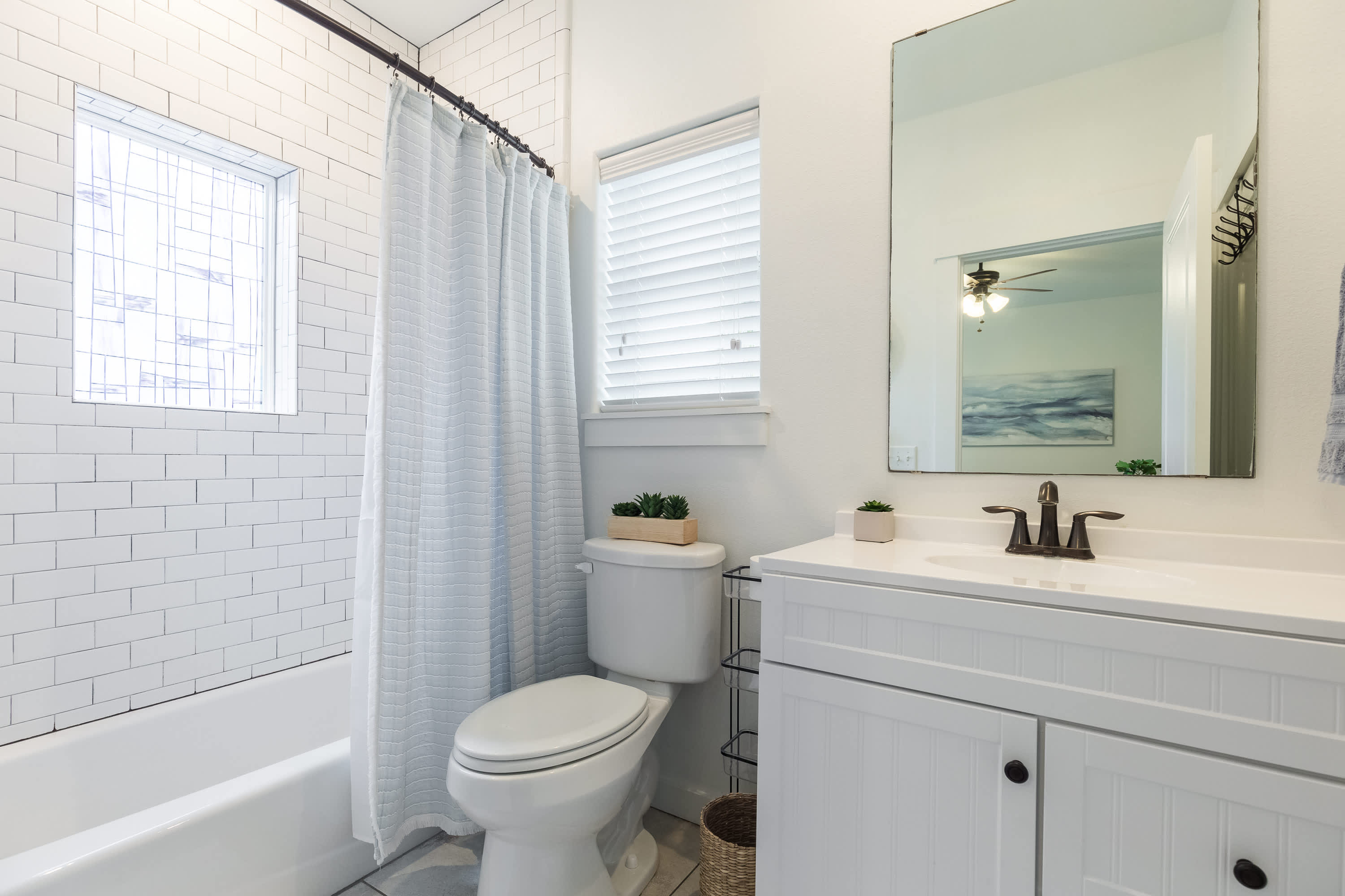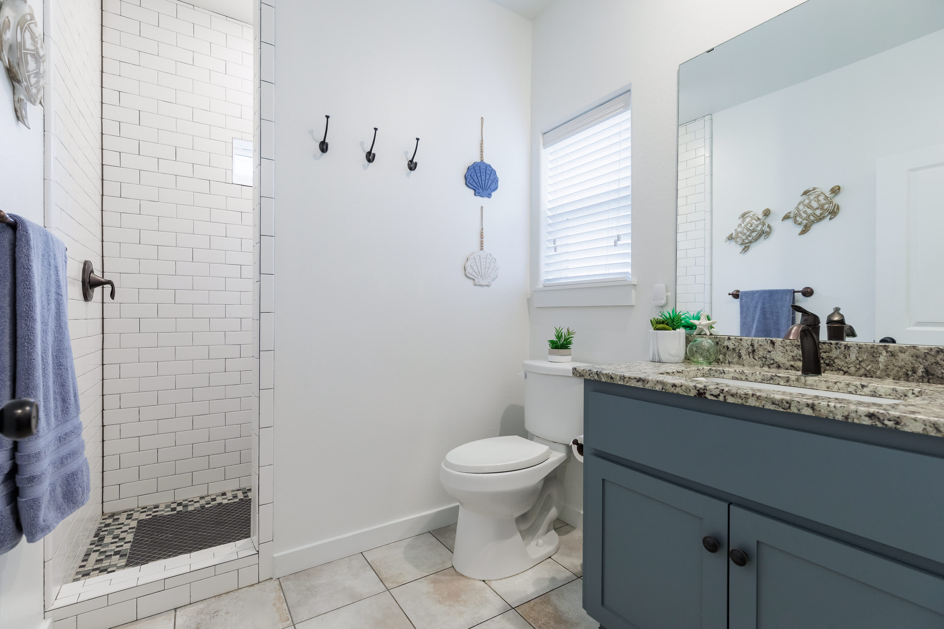 The home also includes an additional full guest bathroom with a single vanity and walk-in shower, on the ground floor.