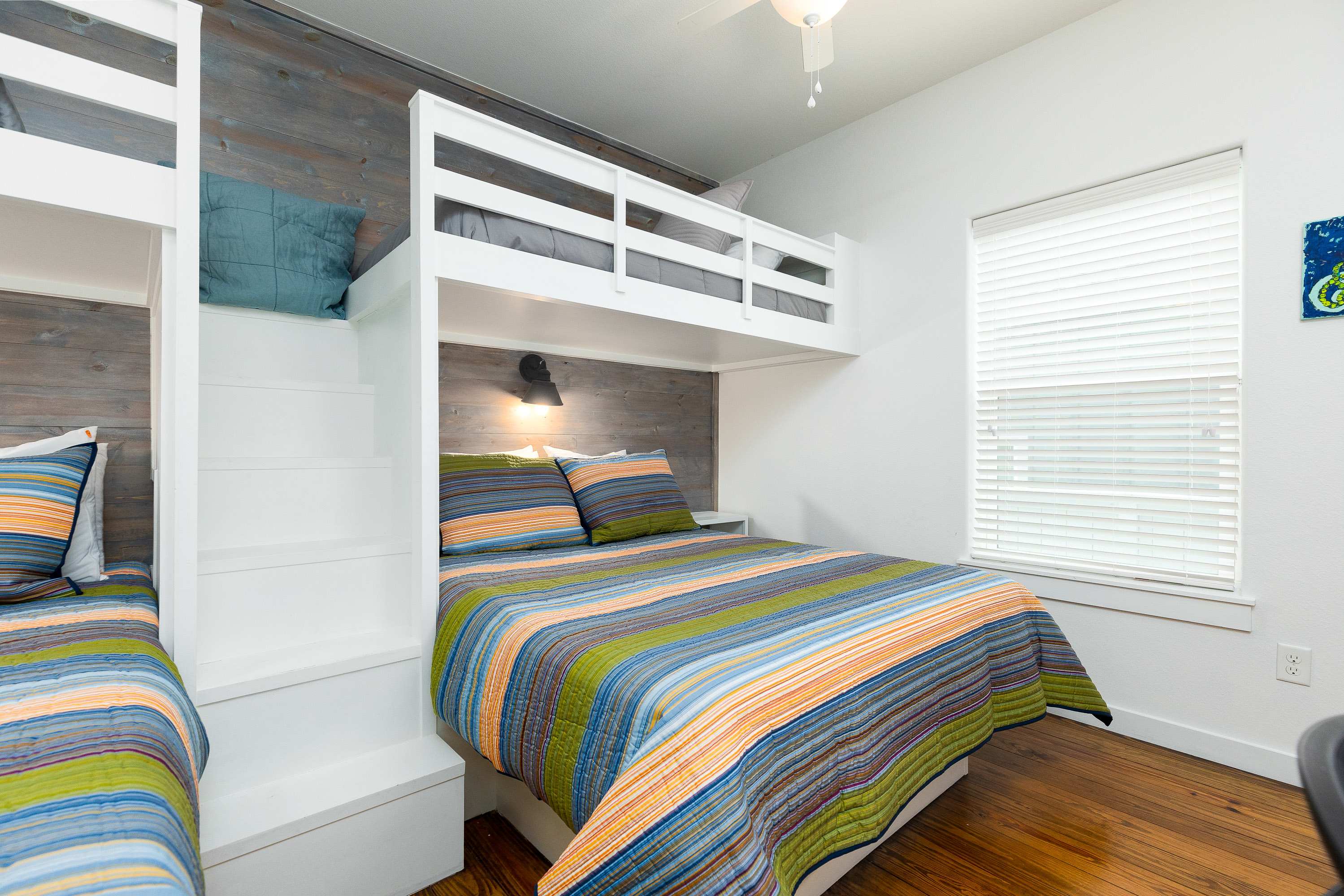 Bedroom #1 includes 2 twin-over-queen built-in bunk beds and a dedicated workspace.