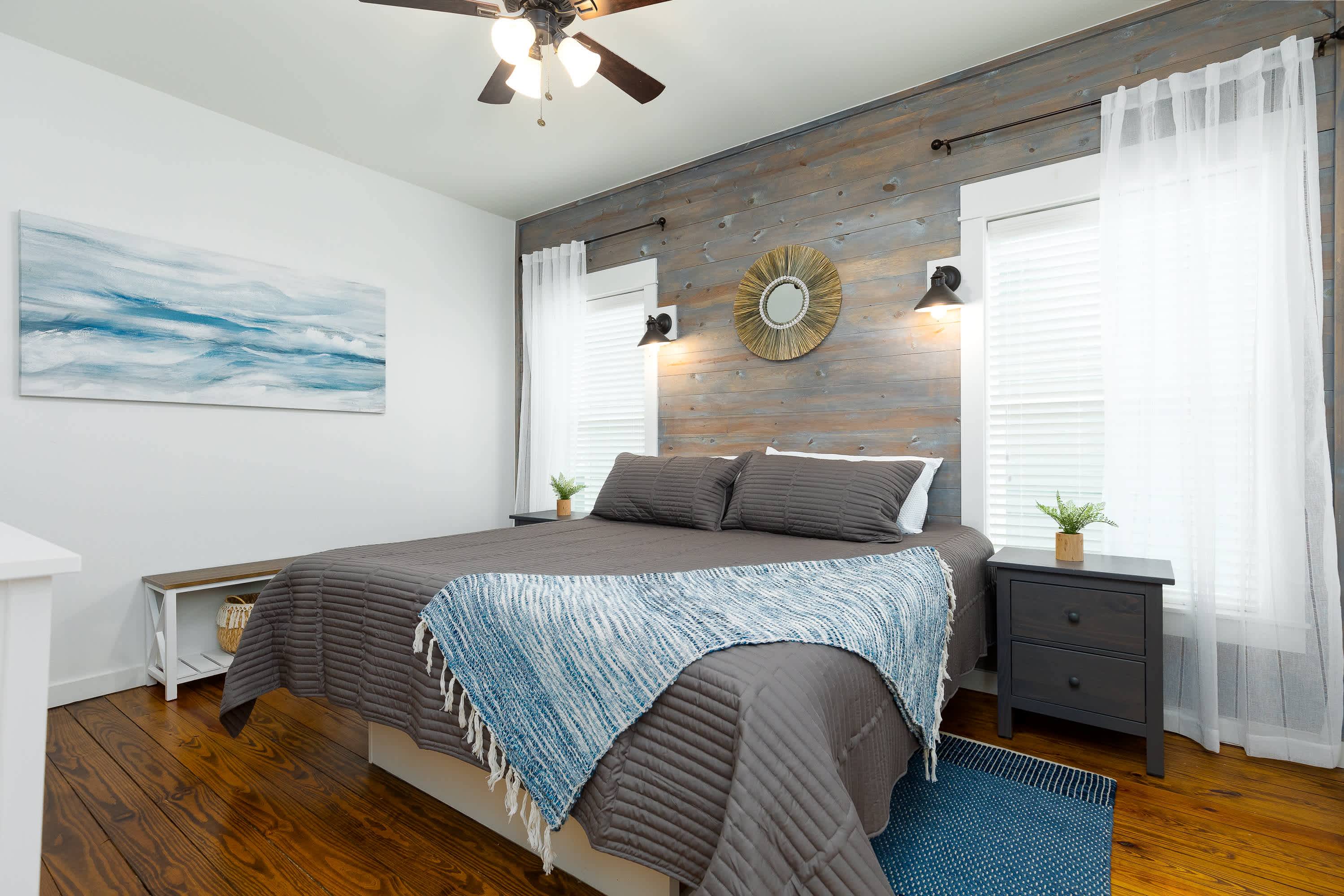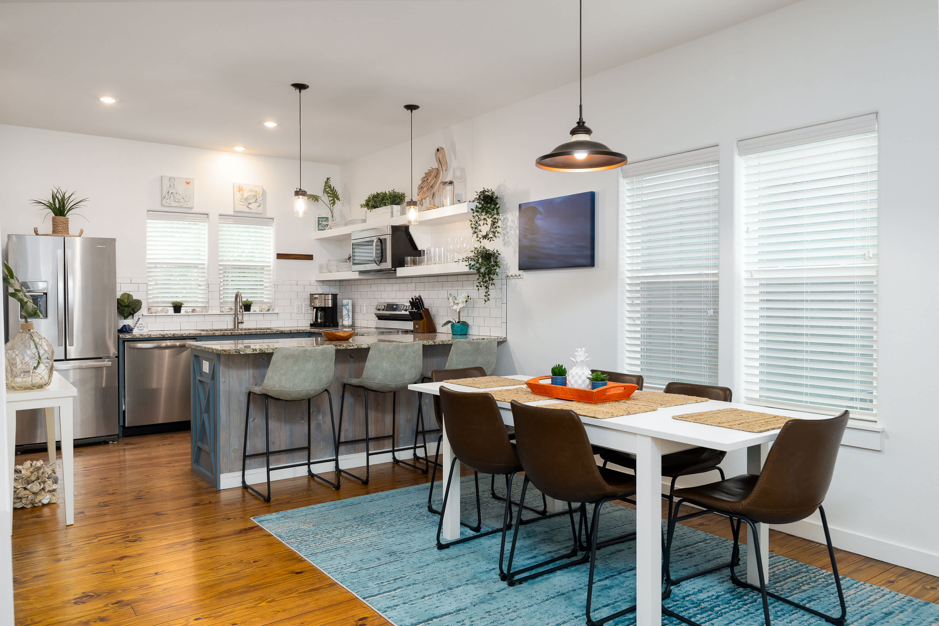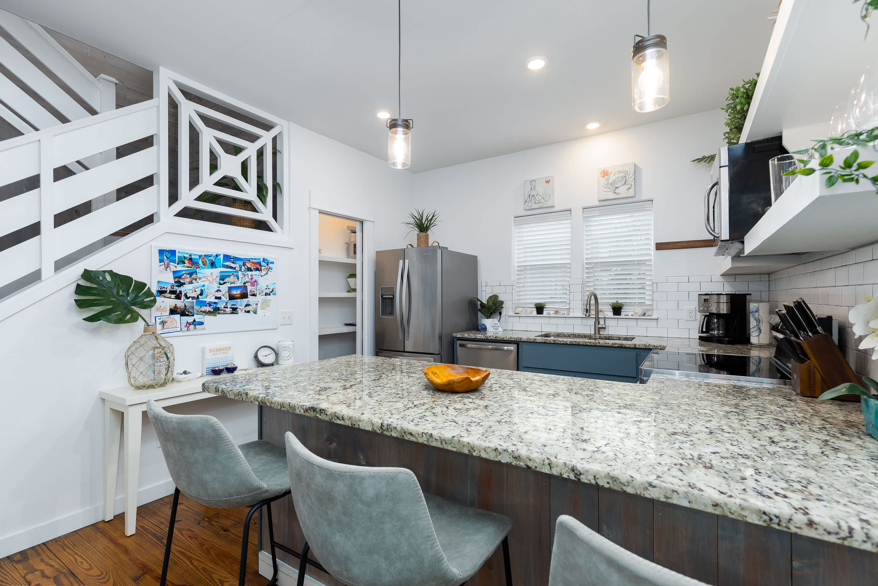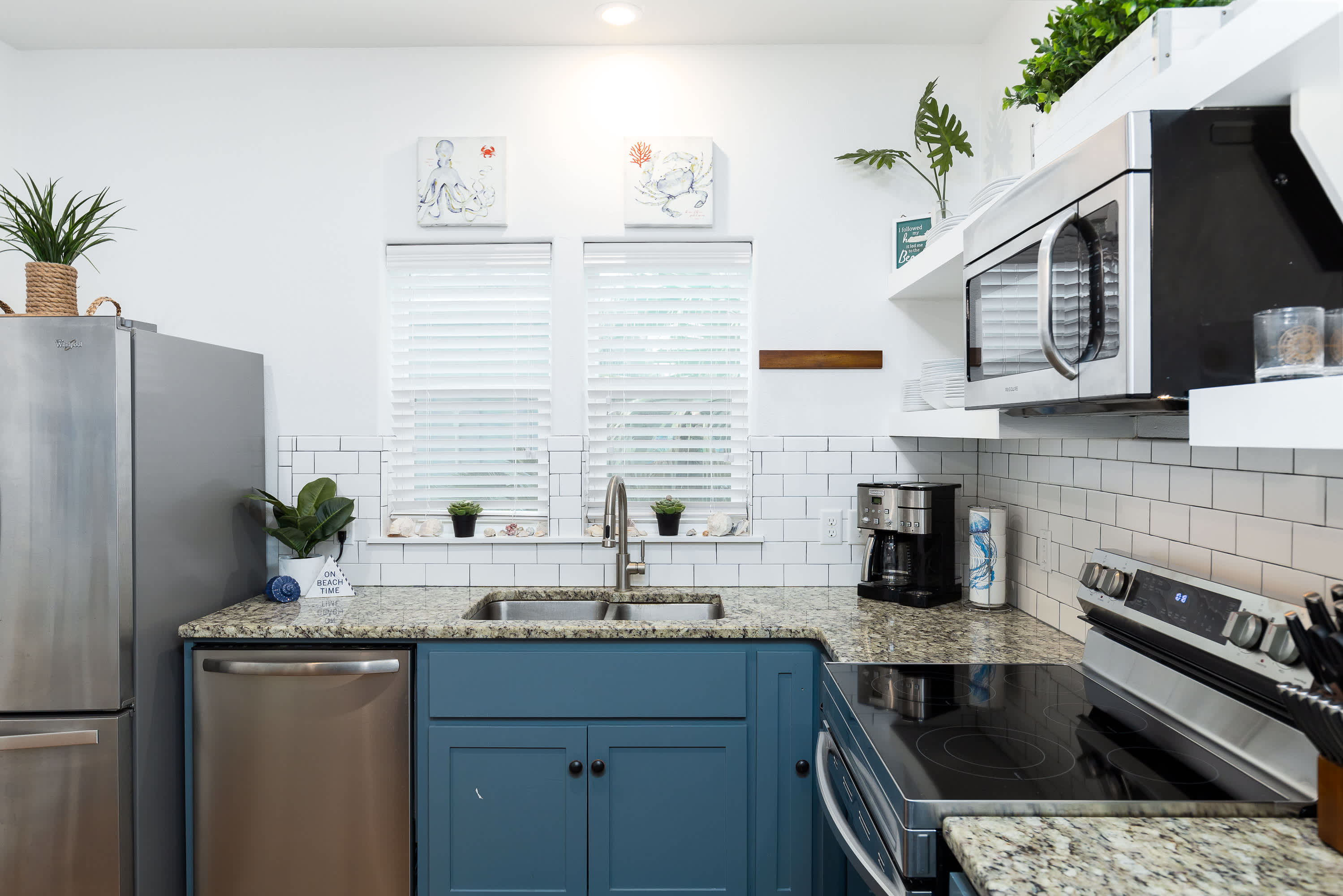 The home’s interior is as bright and welcoming as the surrounding outdoors, where soothing neutral tones meet bright pops of color in the furnishings and décor. The plush U-shaped sofa in the living room is an optimal spot to unwind and catch a game or a movie on the smart TV. Steps away, host a family game night at the dining room table or gather around for formal meals while maintaining views of the scenic outdoors. The modern kitchen showcases stainless steel appliances, granite countertops, and beautiful blue cabinetry stocked with cookware and dining ware for all your culinary aspirations. Enjoy your fresh cup of morning coffee or an evening cocktail under the stars out on the home’s front porch, an available grill also on hand to help you whip up a delicious barbeque lunch.