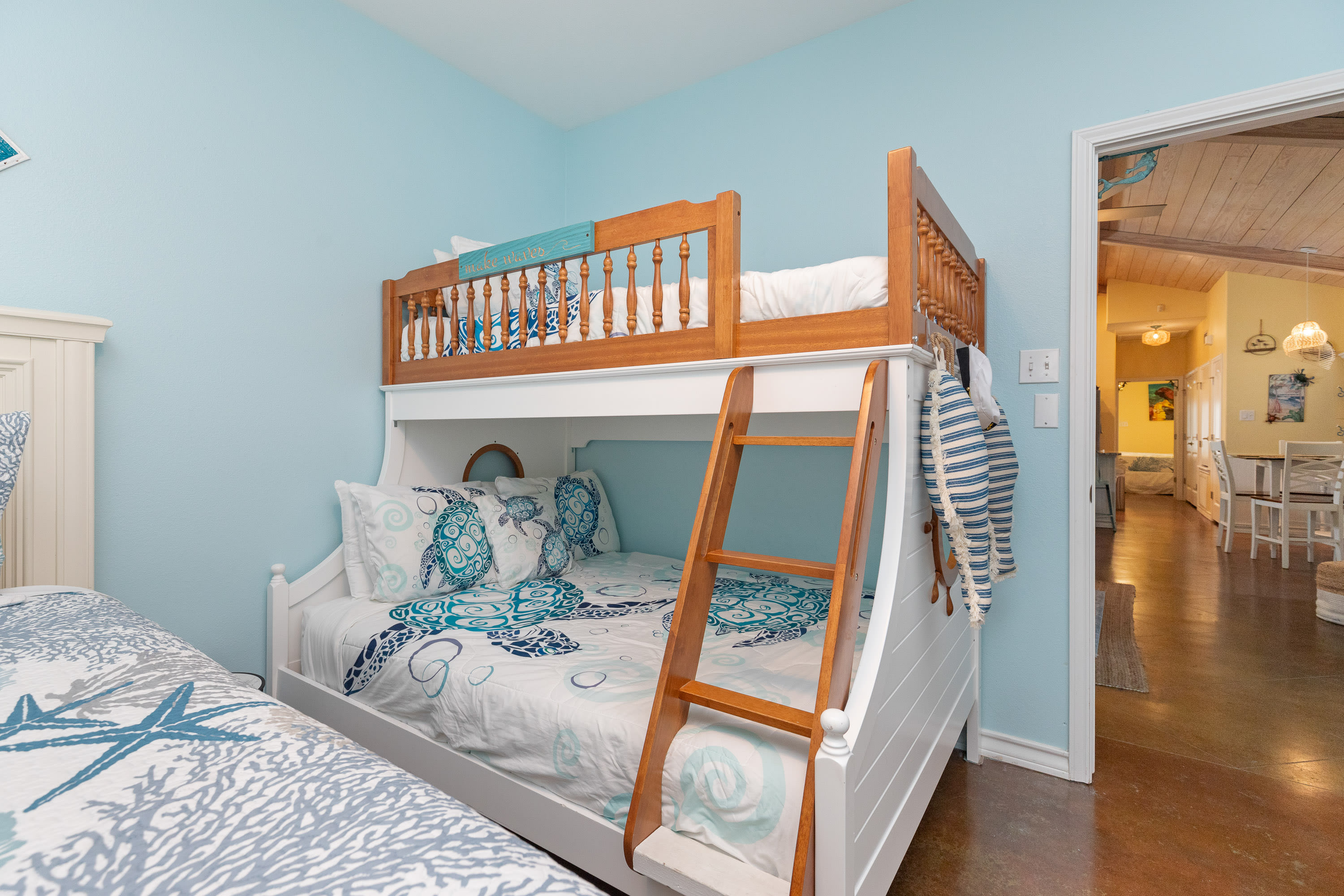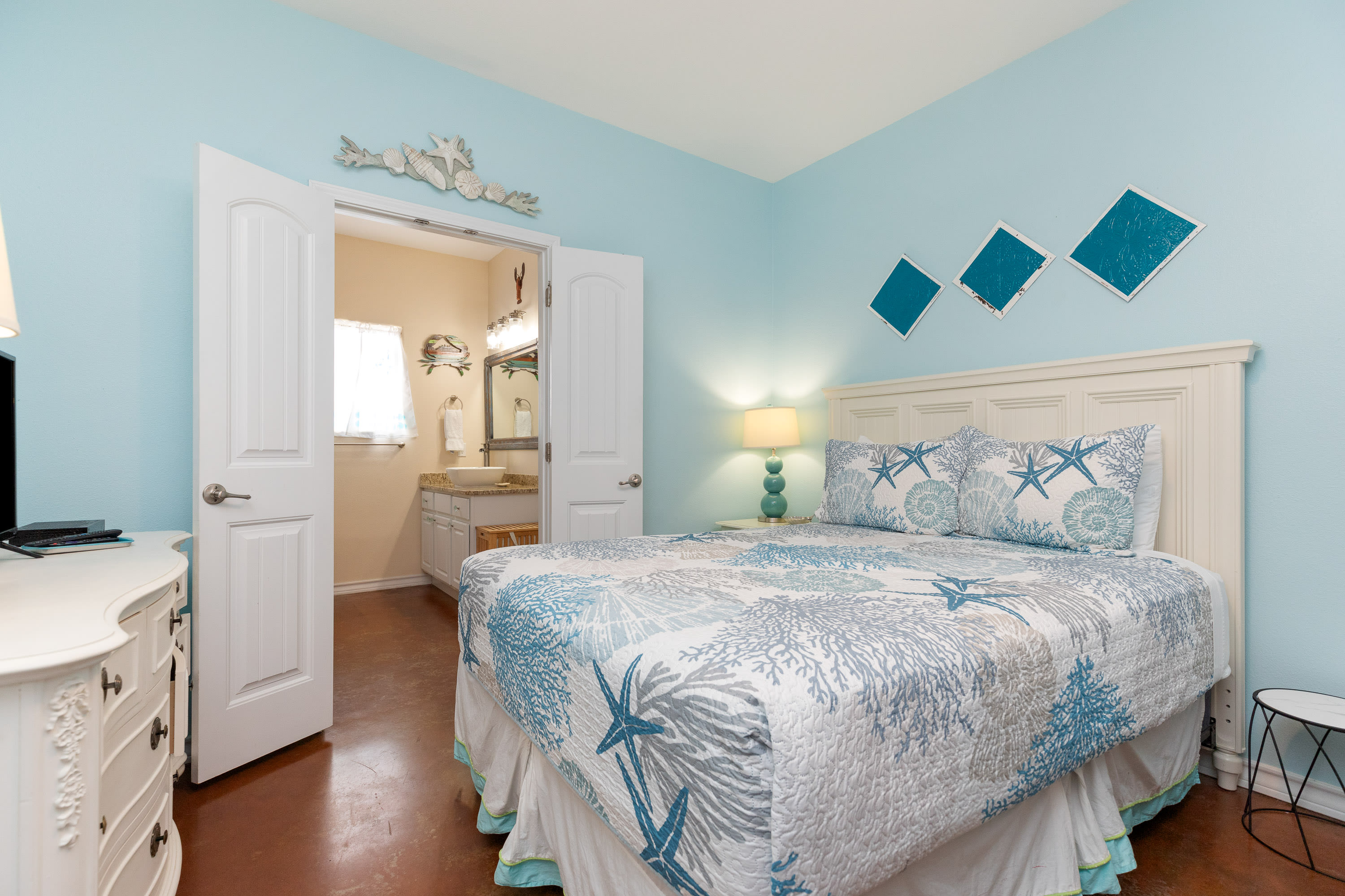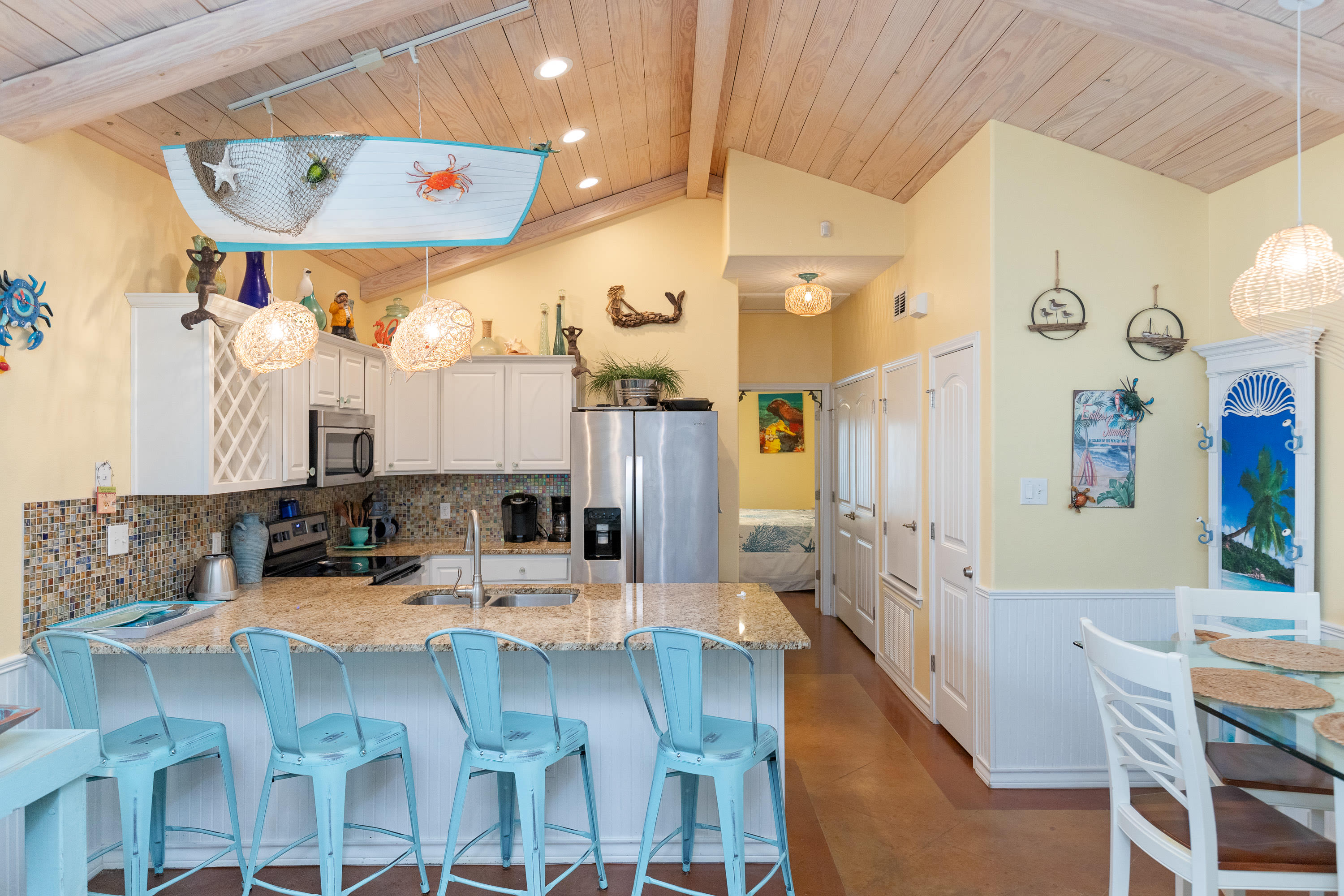 The home’s interior is just as welcoming as its brightly colored exterior, furnished and decorated in theme with its beachy surroundings. The open concept living area seamlessly blends each space together, keeping conversation and connection at the forefront. The living room includes comfortable sofa and armchair seating as well as a mounted smart TV for streaming all your favorite shows – you won’t ever have to worry about missing an episode! The kitchen is full of personality, fully equipped with stainless steel appliances, glossy stone countertops, and a suite of cookware and dining ware for wherever your culinary journeys take you. The generous countertop is perfect for serving up a delicious spread of appetizers as well as casual dining at the high-top stools for 4. Steps away, the chic dining room table can seat another 4 for formal meals or a family game night.