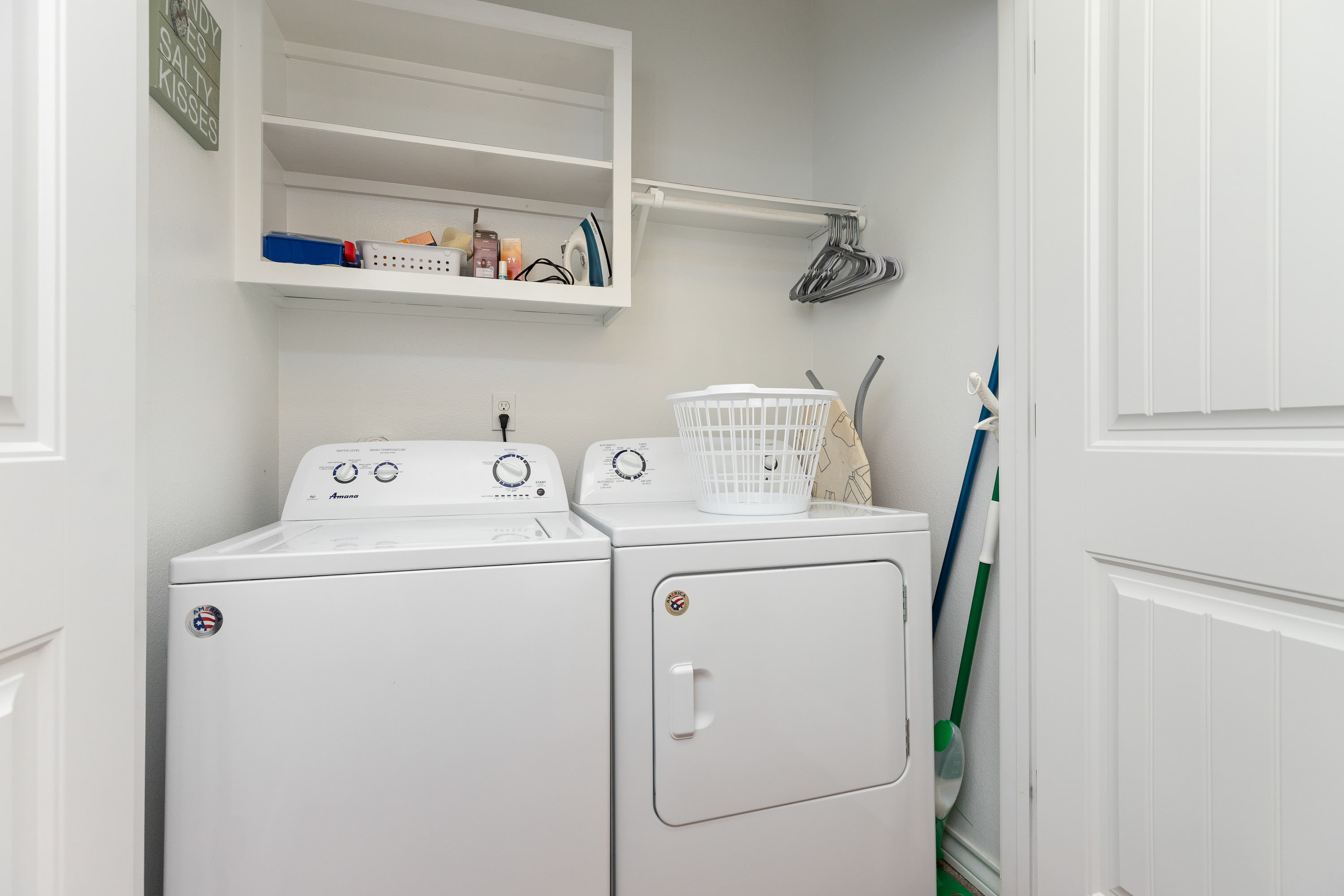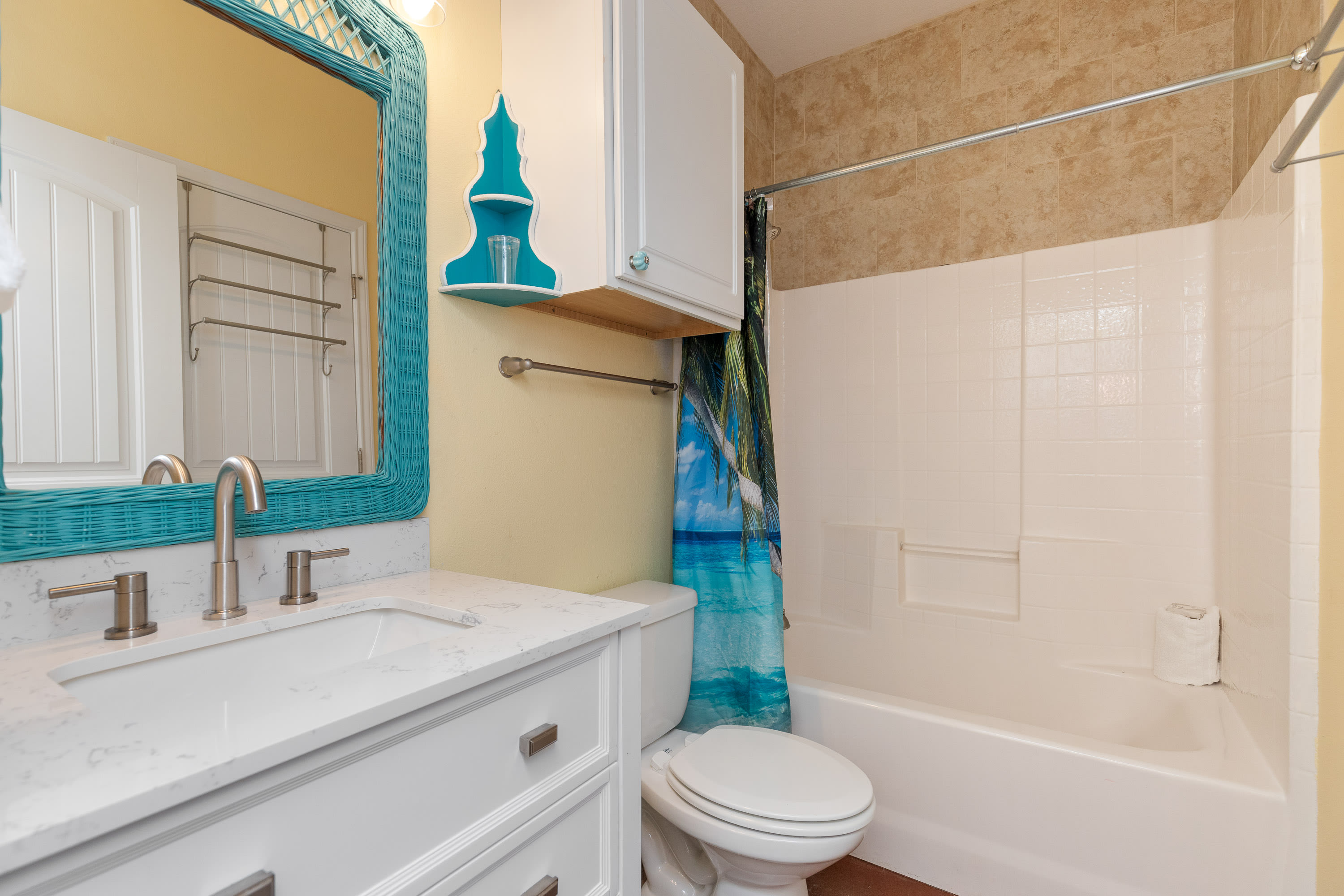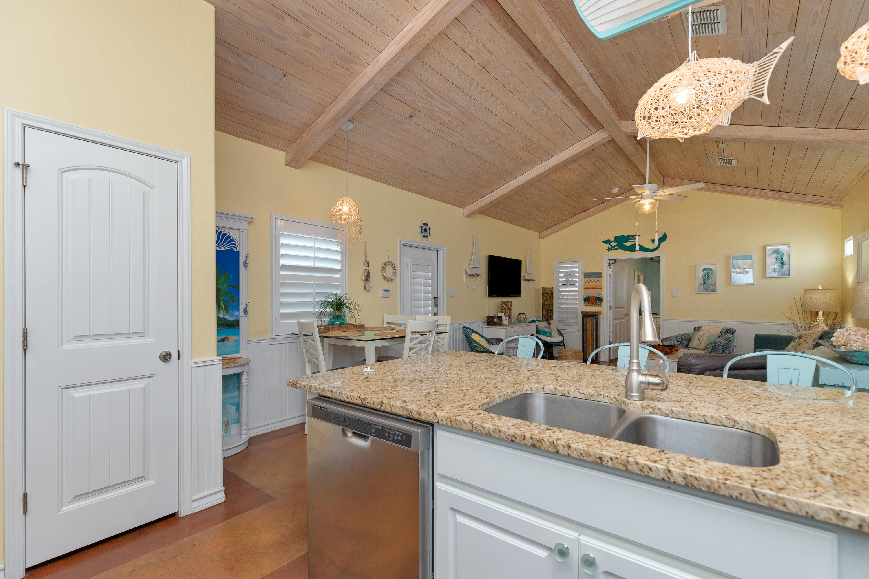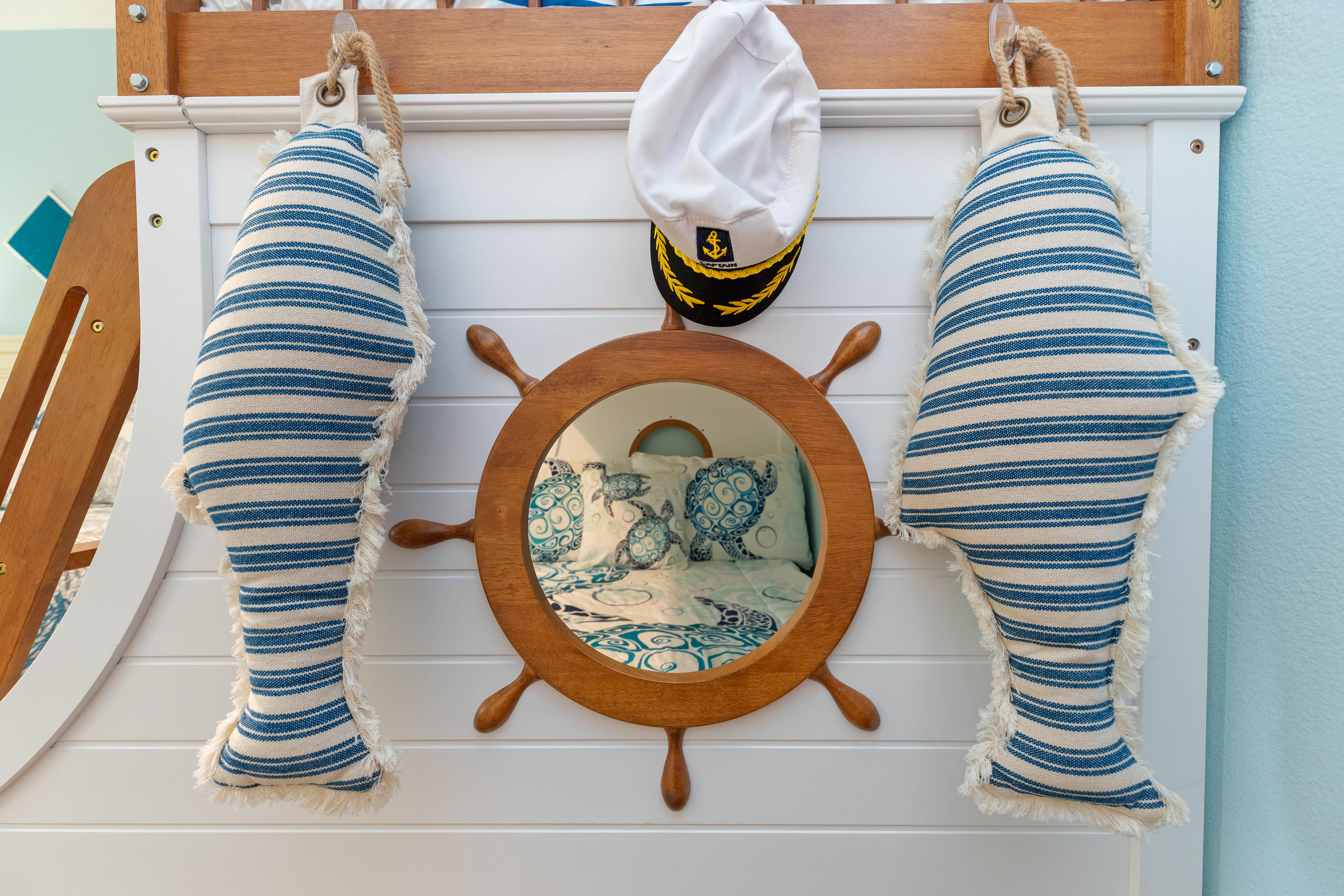 The home’s interior is just as welcoming as its brightly colored exterior, furnished and decorated in theme with its beachy surroundings. The open concept living area seamlessly blends each space together, keeping conversation and connection at the forefront. The living room includes comfortable sofa and armchair seating as well as a mounted smart TV for streaming all your favorite shows – you won’t ever have to worry about missing an episode! The kitchen is full of personality, fully equipped with stainless steel appliances, glossy stone countertops, and a suite of cookware and dining ware for wherever your culinary journeys take you. The generous countertop is perfect for serving up a delicious spread of appetizers as well as casual dining at the high-top stools for 4. Steps away, the chic dining room table can seat another 4 for formal meals or a family game night.