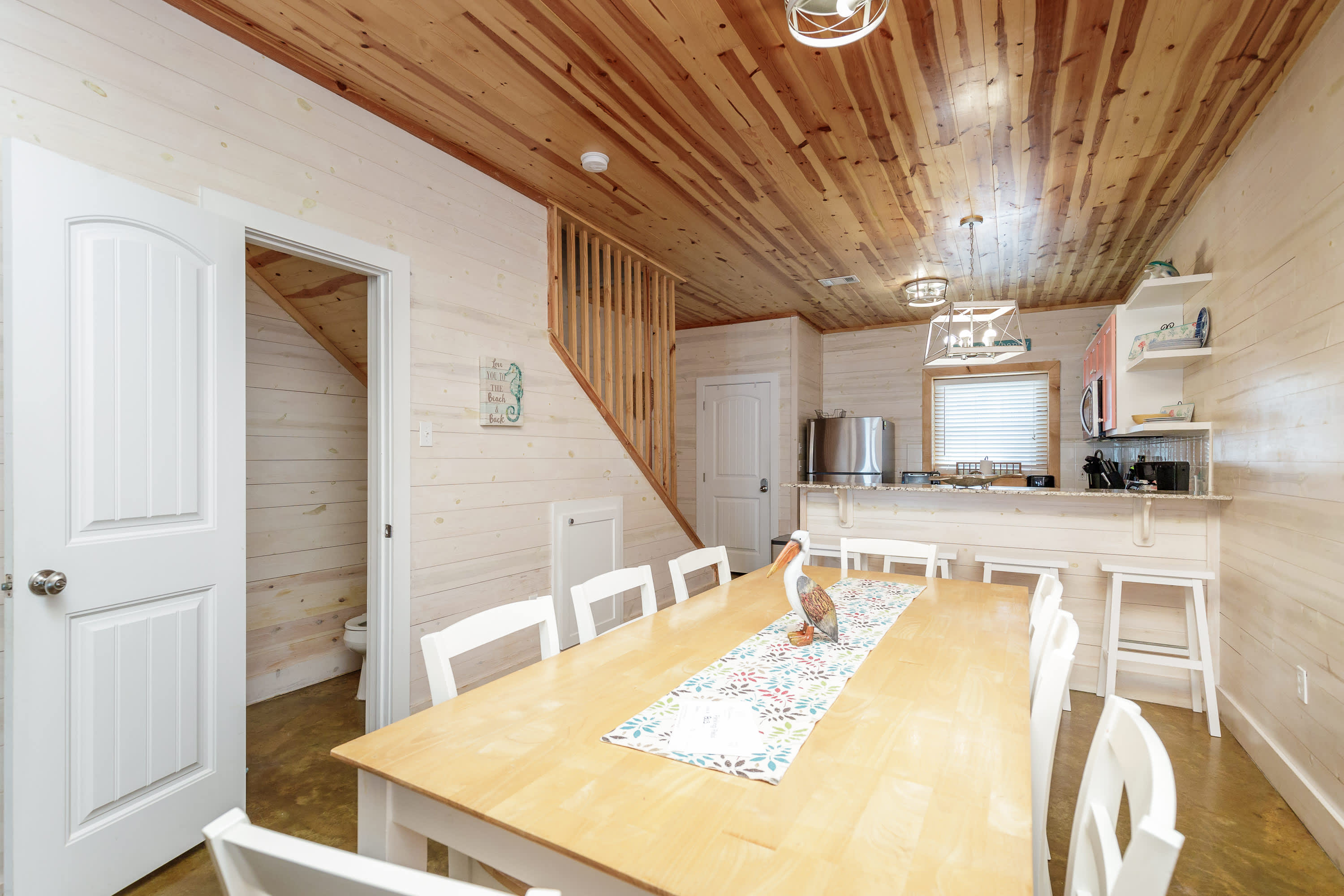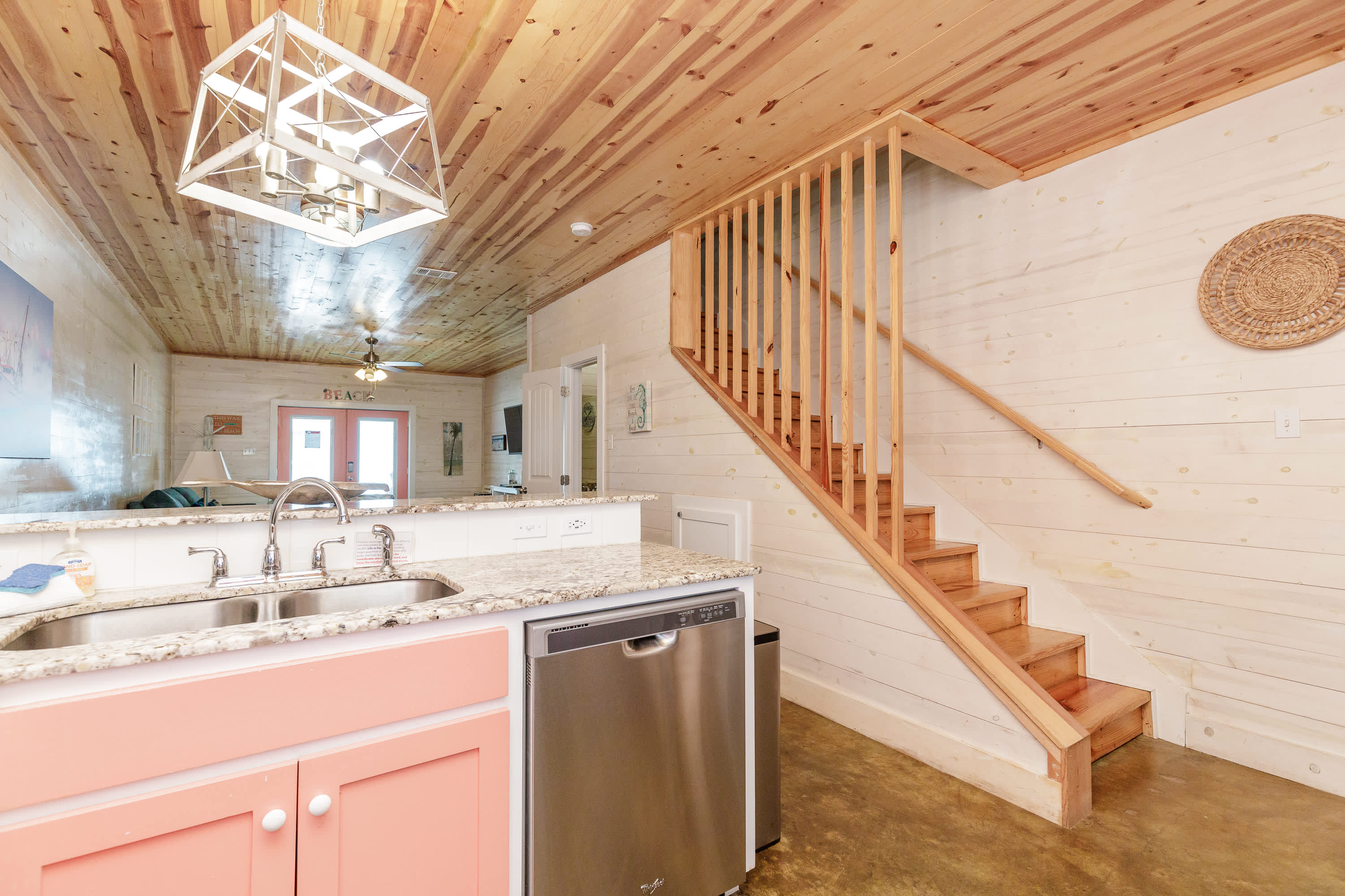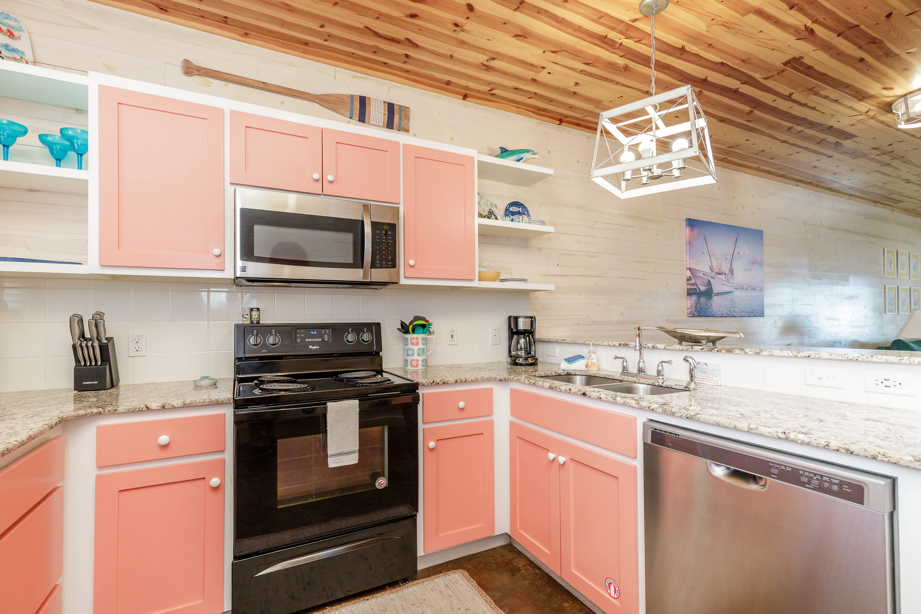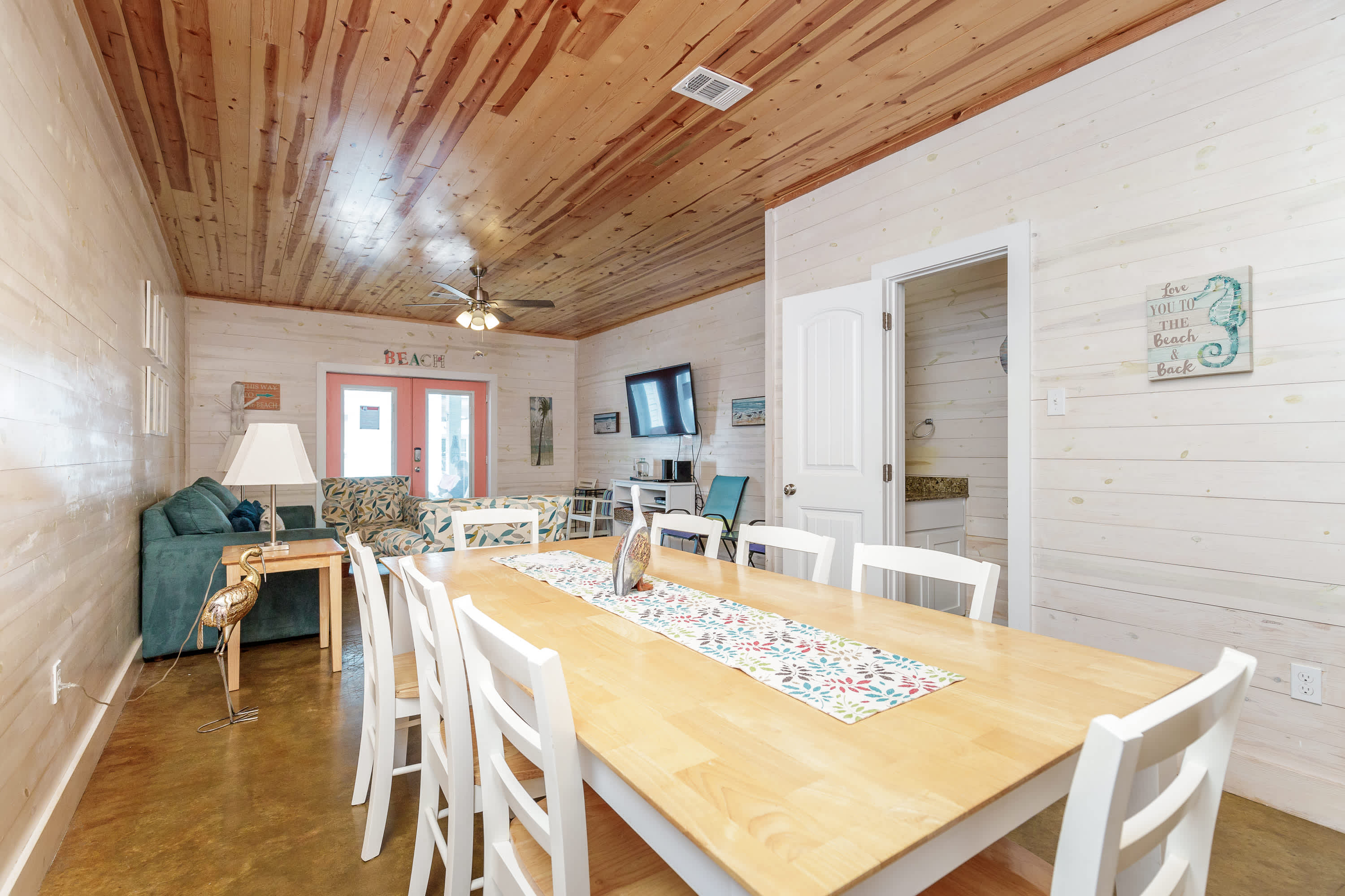 With a tranquil beach theme running from room to room, you’ll feel immediately at peace and immersed in the natural environment while relaxing indoors. But before you head on inside, make sure you take a good rinse off at the outdoor shower to shed yourself of those tricky remnants of sand. The living room features plush sofa and armchair setting as well as a smart TV when you want to chill out and stream a movie or two. The open floor plan carries you into the dining and kitchen areas where you’ll first find a formal dining room table with seating for 8. Continue on to the cheerful kitchen with colorful coral cabinetry, fully equipped with stainless steel appliances, Keurig coffee maker, and full suite of all the cookware and dining ware you need to achieve your culinary aspirations. The kitchen counter offers additional high-top seating for 4 to assist with meal prep or for enjoying a peaceful cup of morning coffee.