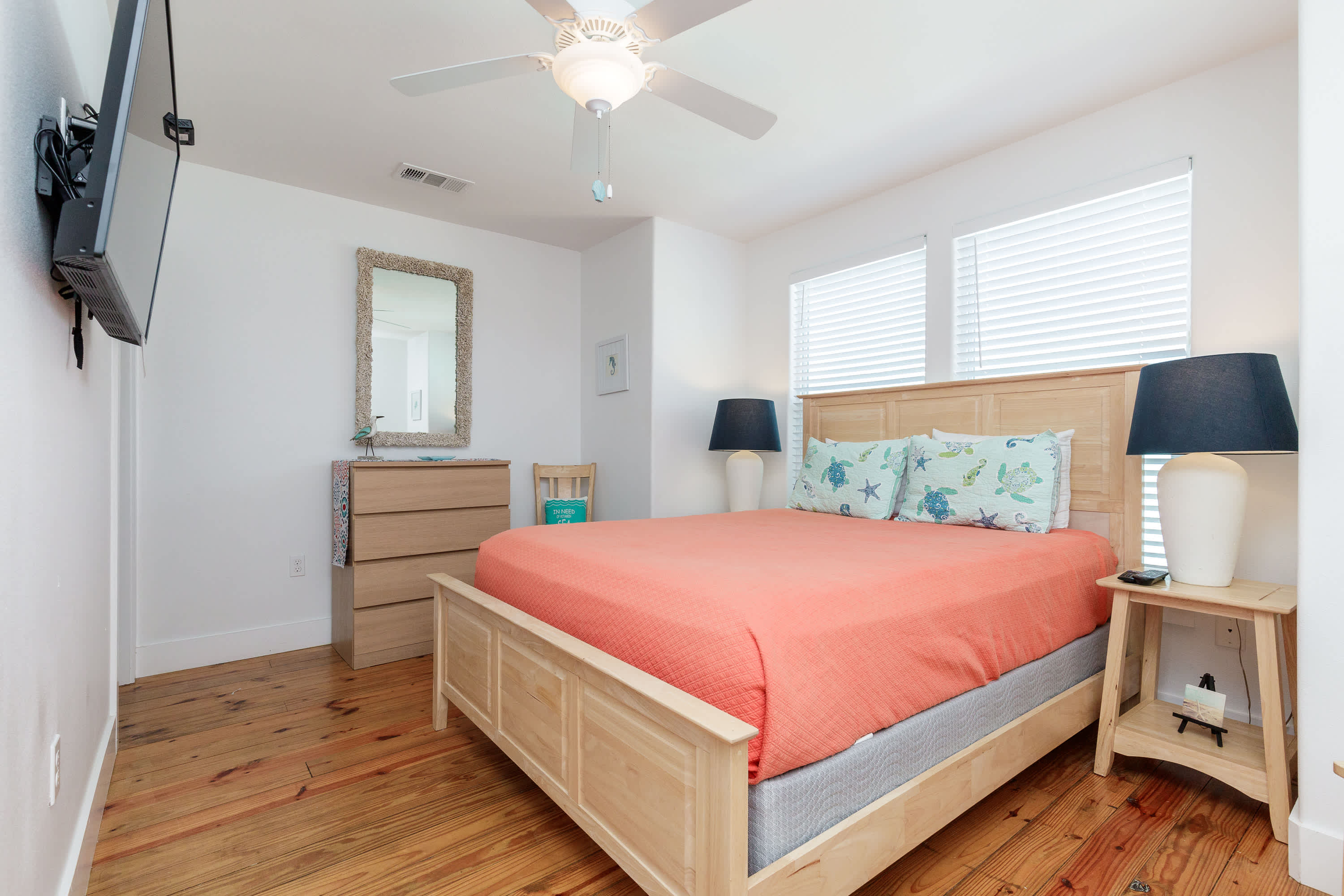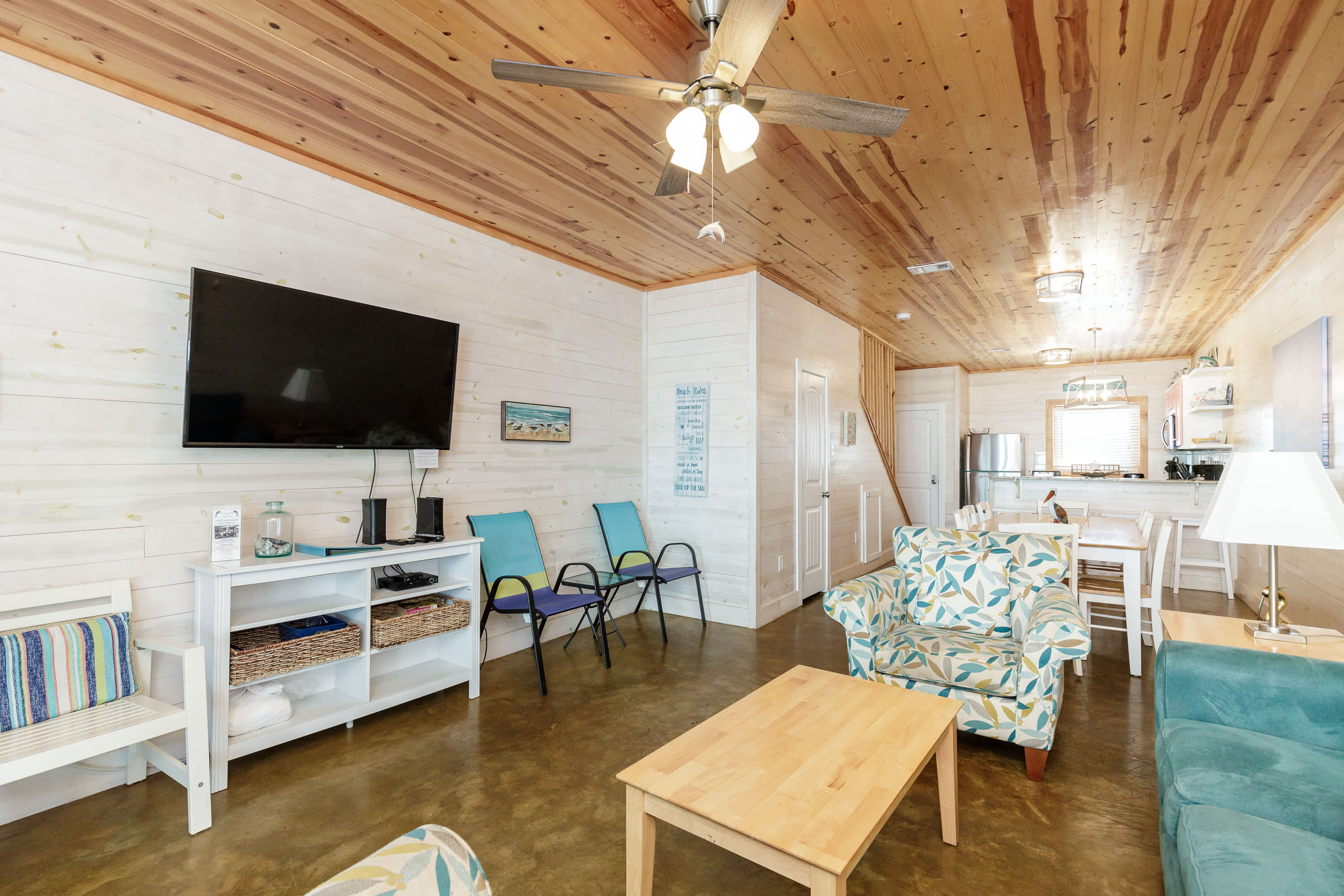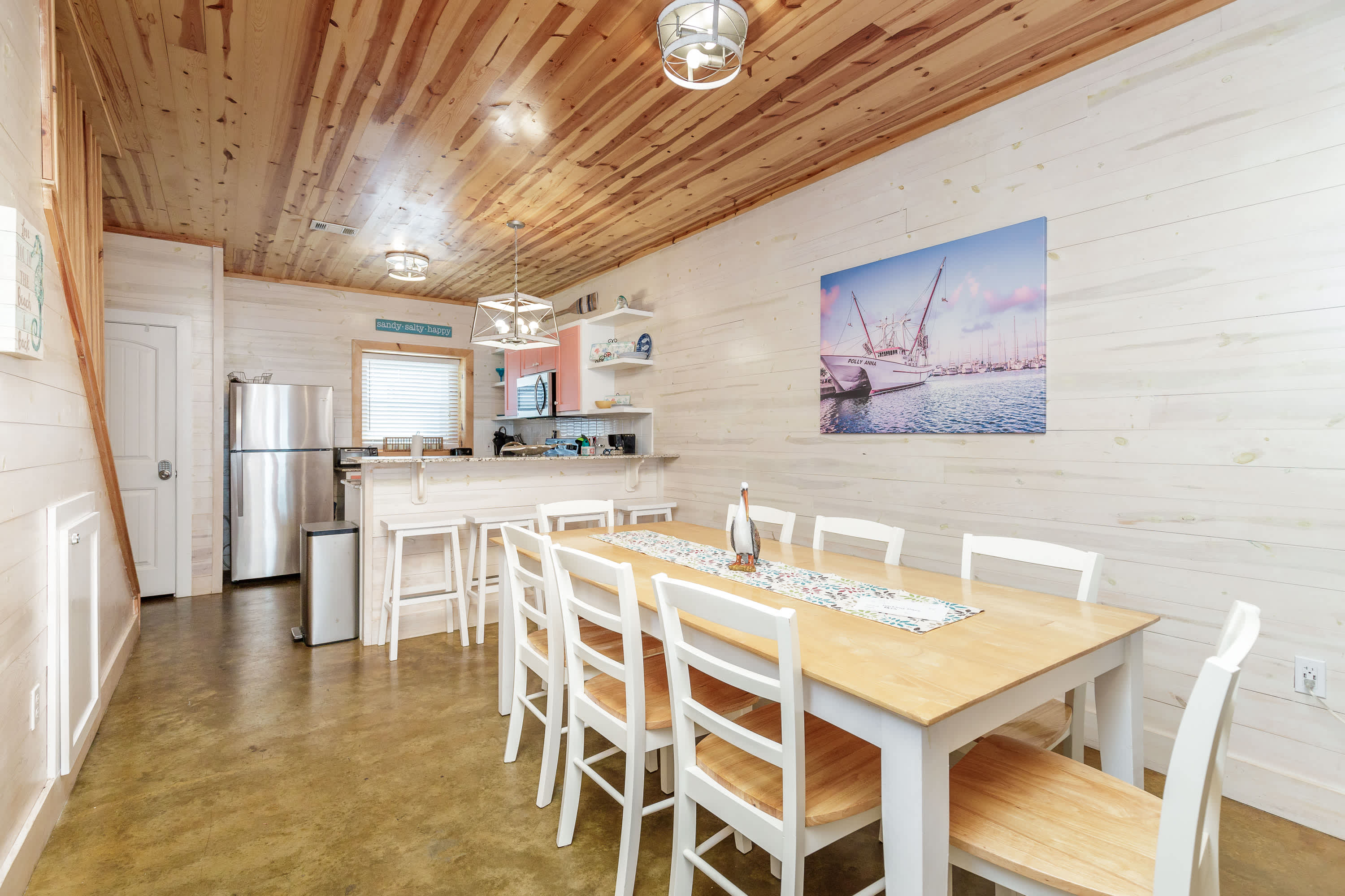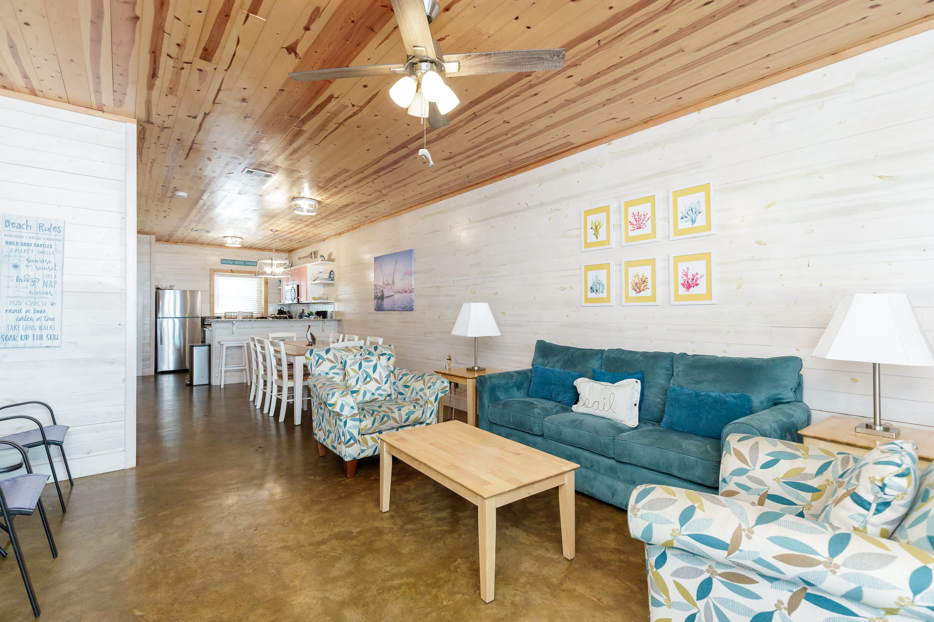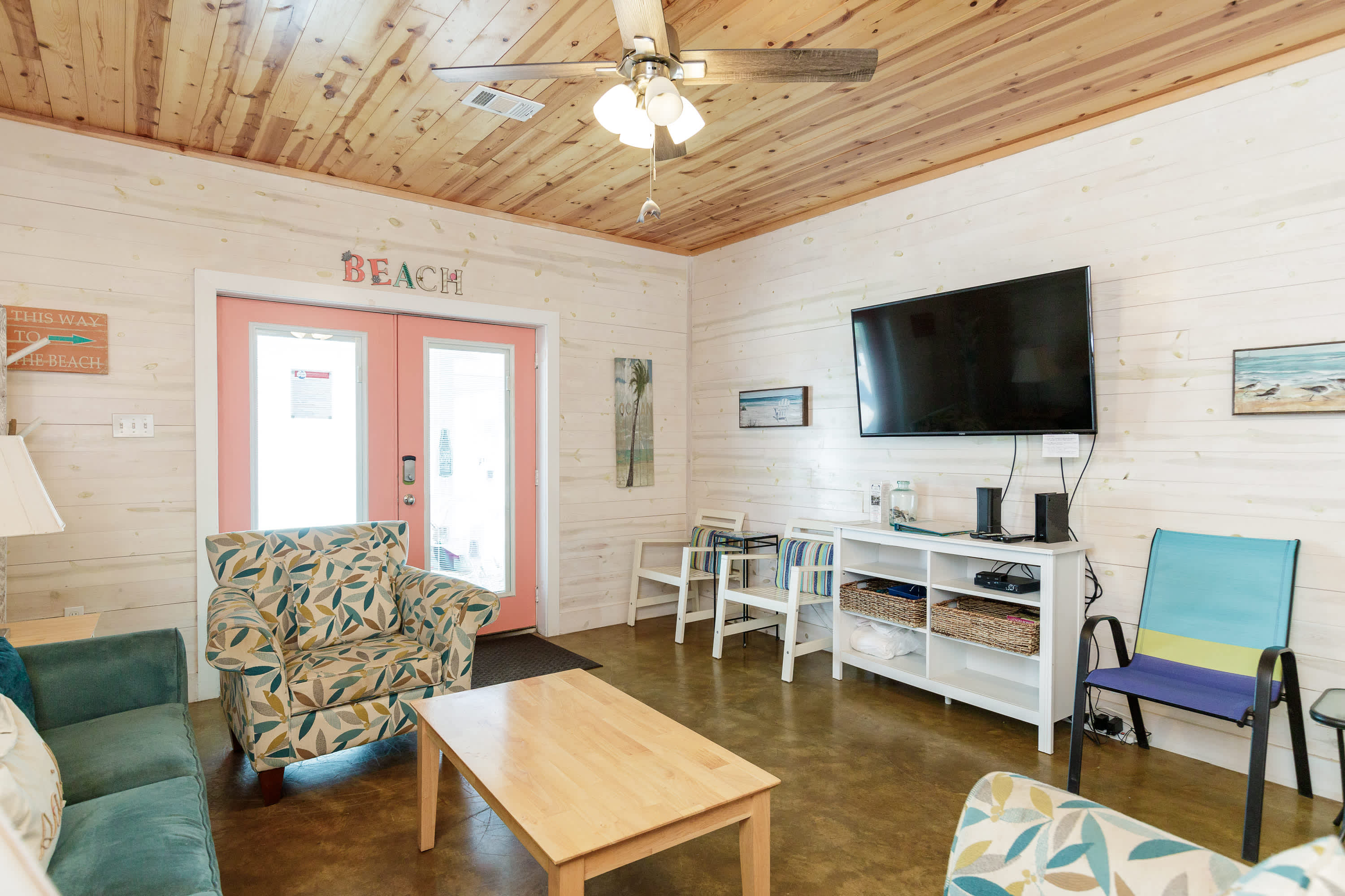 With a tranquil beach theme running from room to room, you’ll feel immediately at peace and immersed in the natural environment while relaxing indoors. But before you head on inside, make sure you take a good rinse off at the outdoor shower to shed yourself of those tricky remnants of sand. The living room features plush sofa and armchair setting as well as a smart TV when you want to chill out and stream a movie or two. The open floor plan carries you into the dining and kitchen areas where you’ll first find a formal dining room table with seating for 8. Continue on to the cheerful kitchen with colorful coral cabinetry, fully equipped with stainless steel appliances, Keurig coffee maker, and full suite of all the cookware and dining ware you need to achieve your culinary aspirations. The kitchen counter offers additional high-top seating for 4 to assist with meal prep or for enjoying a peaceful cup of morning coffee.