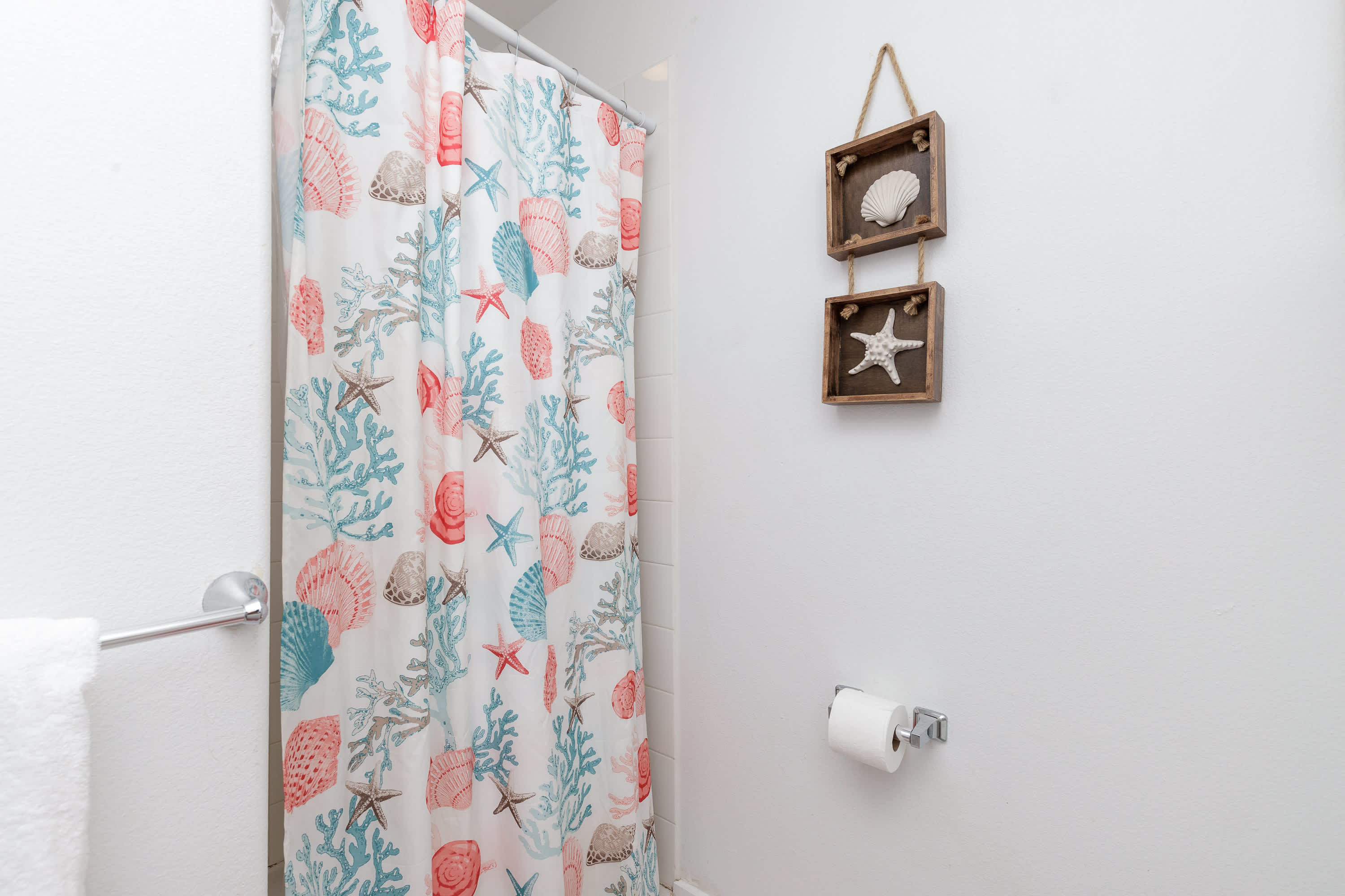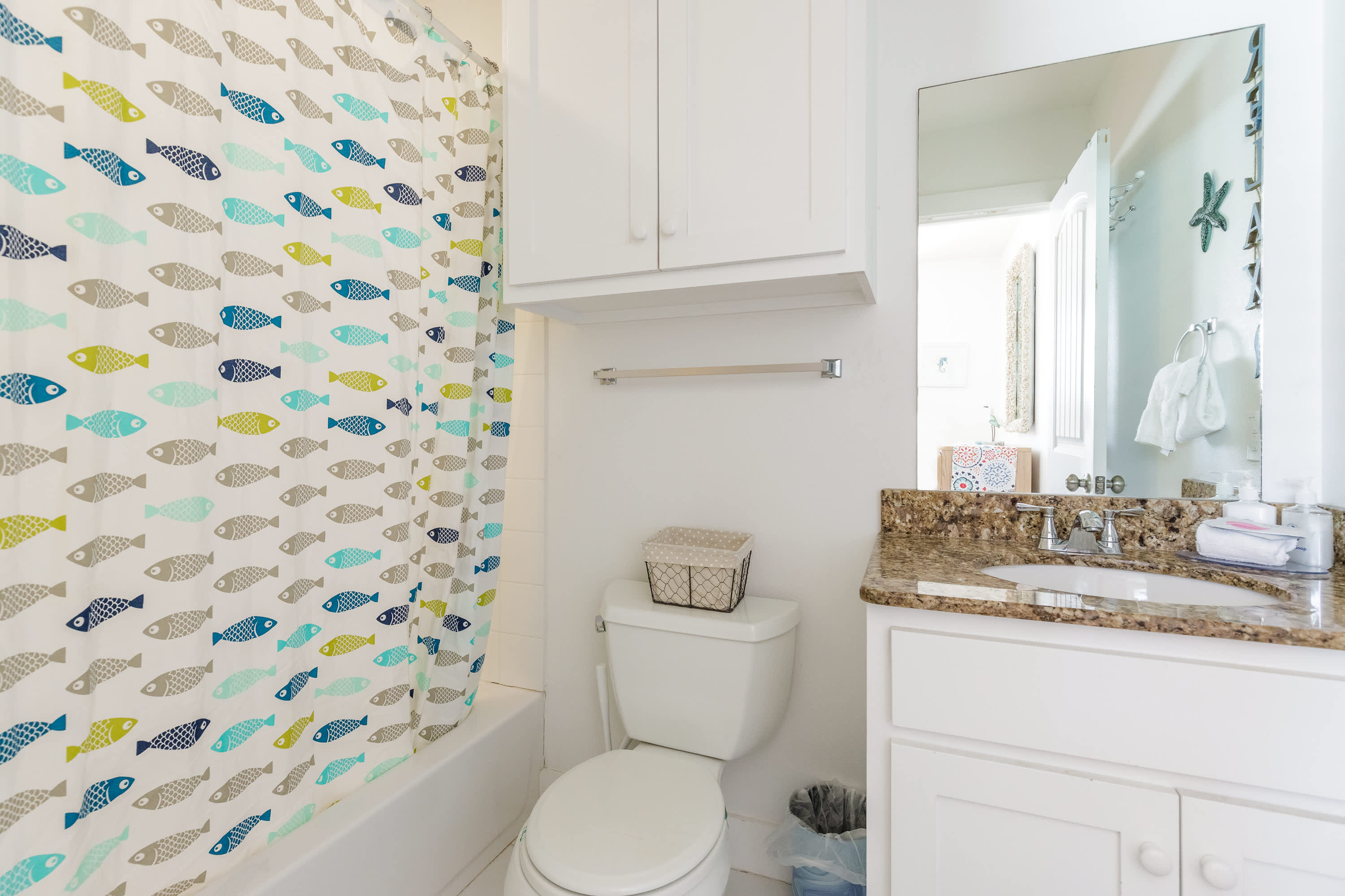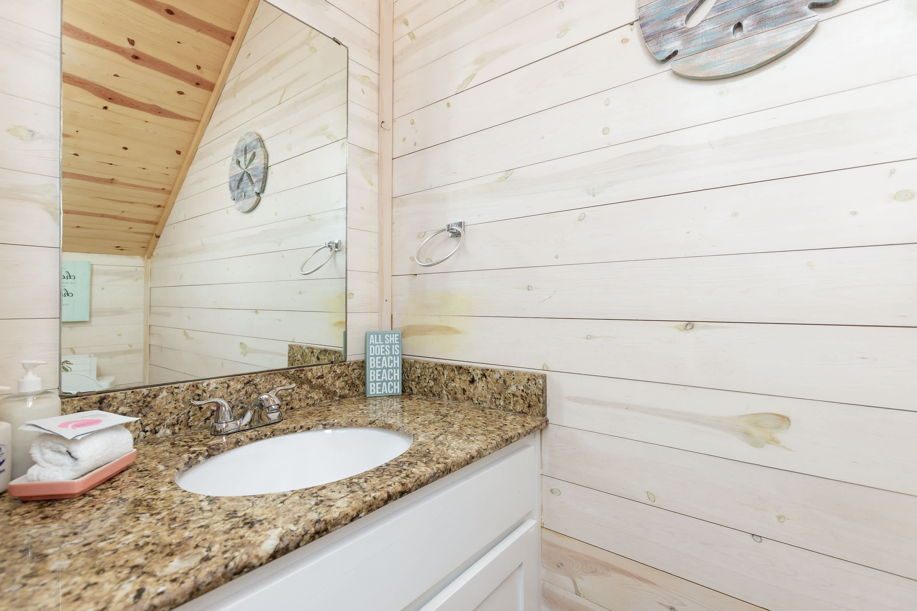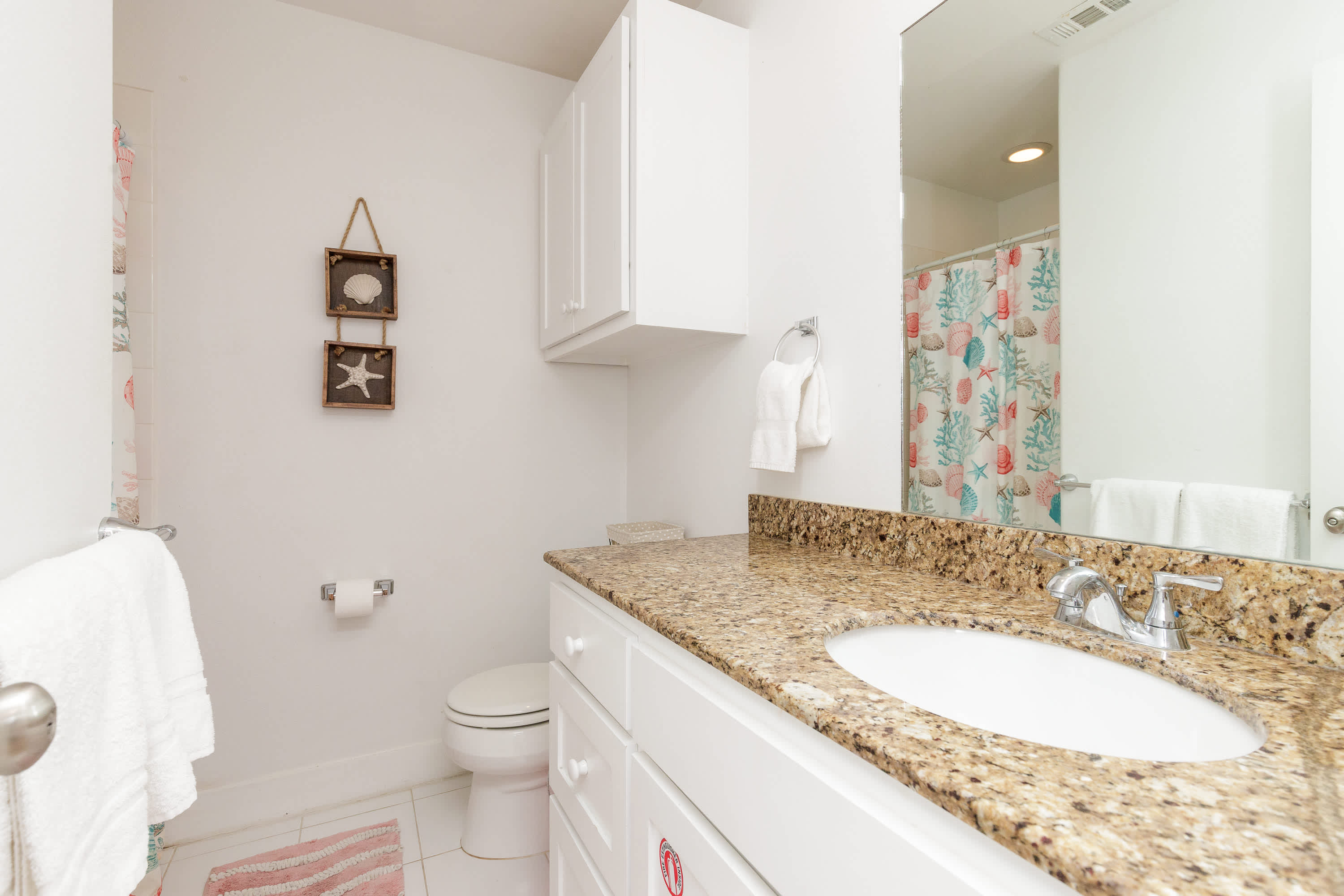 With a tranquil beach theme running from room to room, you’ll feel immediately at peace and immersed in the natural environment while relaxing indoors. But before you head on inside, make sure you take a good rinse off at the outdoor shower to shed yourself of those tricky remnants of sand. The living room features plush sofa and armchair setting as well as a smart TV when you want to chill out and stream a movie or two. The open floor plan carries you into the dining and kitchen areas where you’ll first find a formal dining room table with seating for 8. Continue on to the cheerful kitchen with colorful coral cabinetry, fully equipped with stainless steel appliances, Keurig coffee maker, and full suite of all the cookware and dining ware you need to achieve your culinary aspirations. The kitchen counter offers additional high-top seating for 4 to assist with meal prep or for enjoying a peaceful cup of morning coffee.