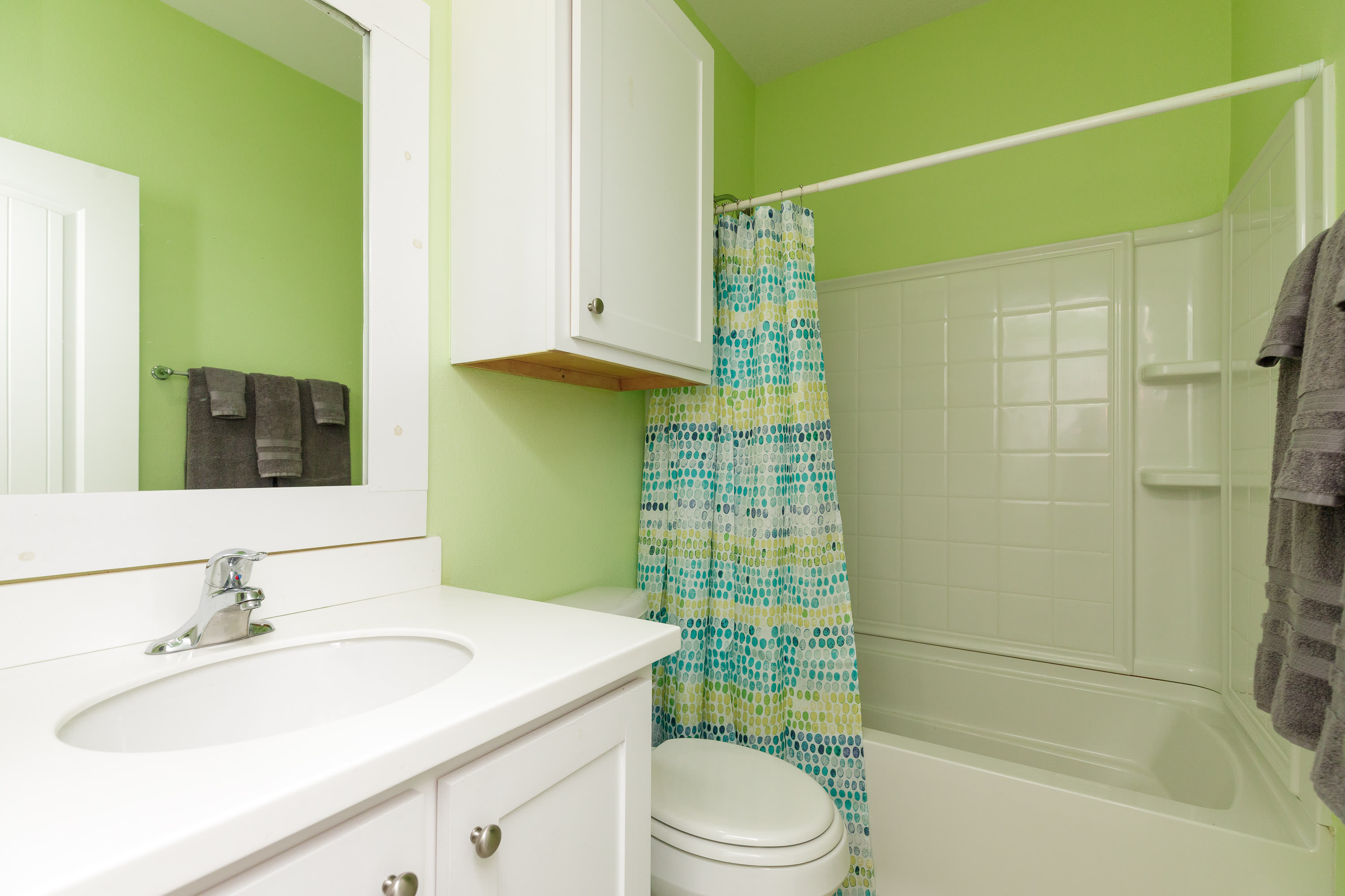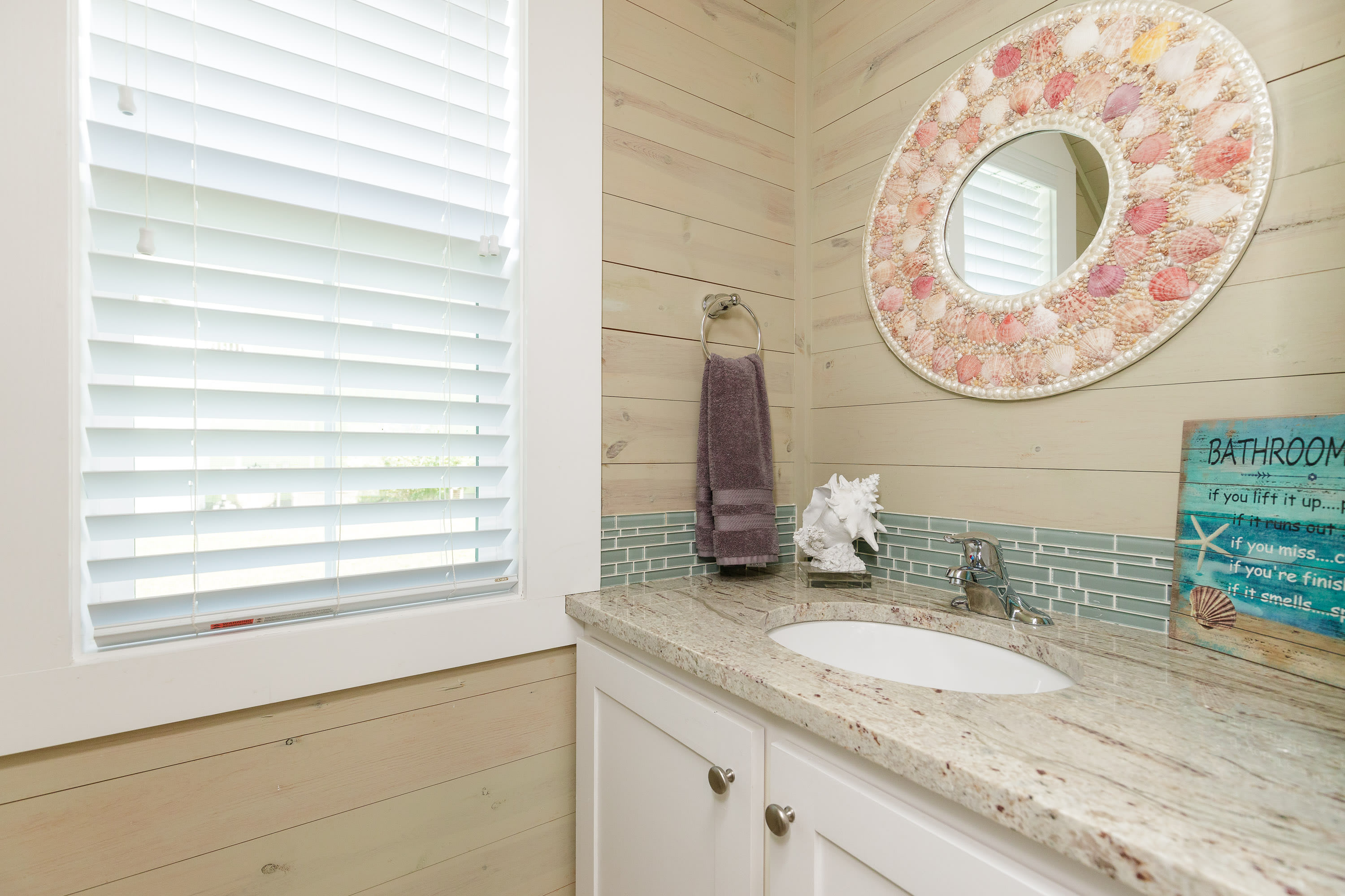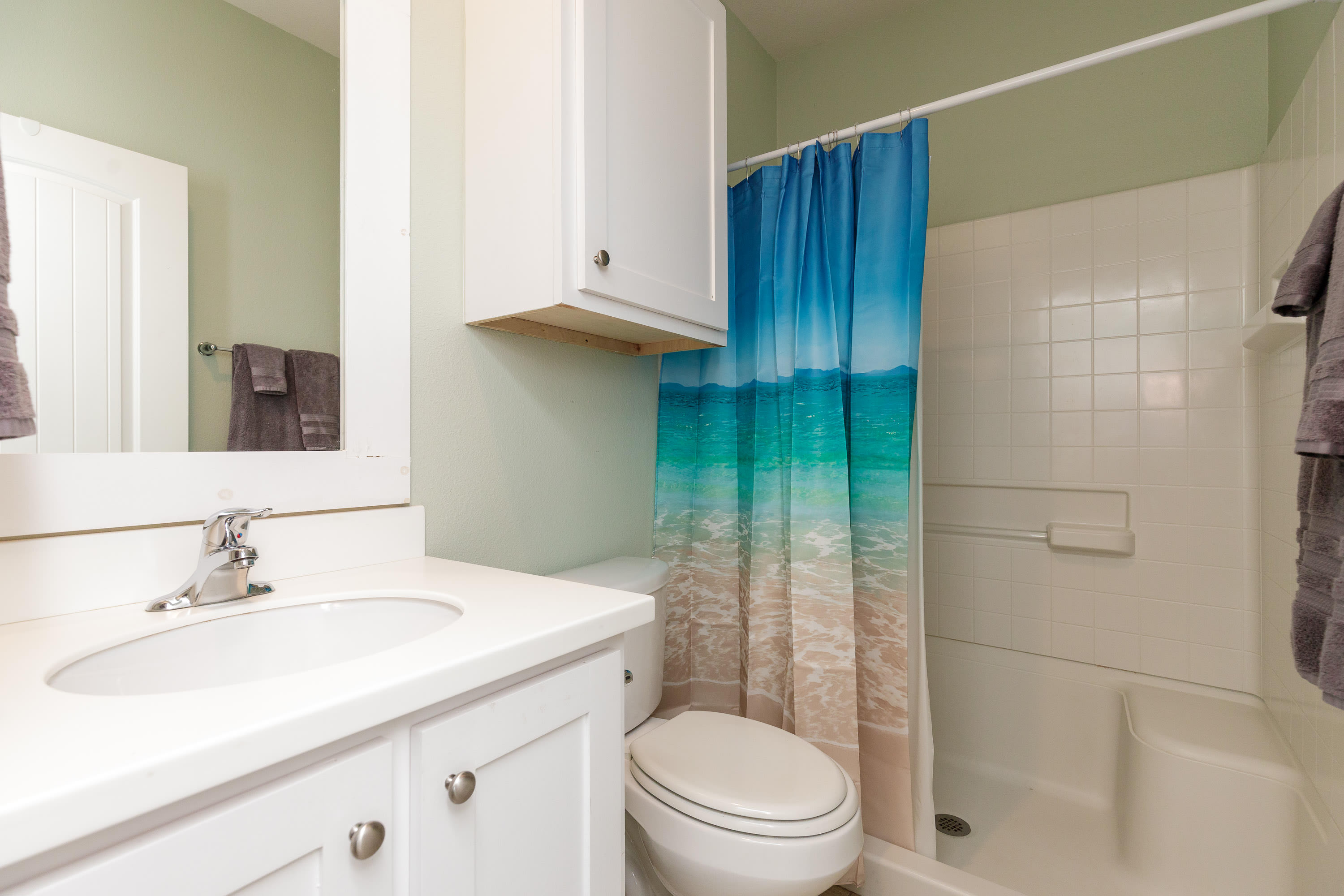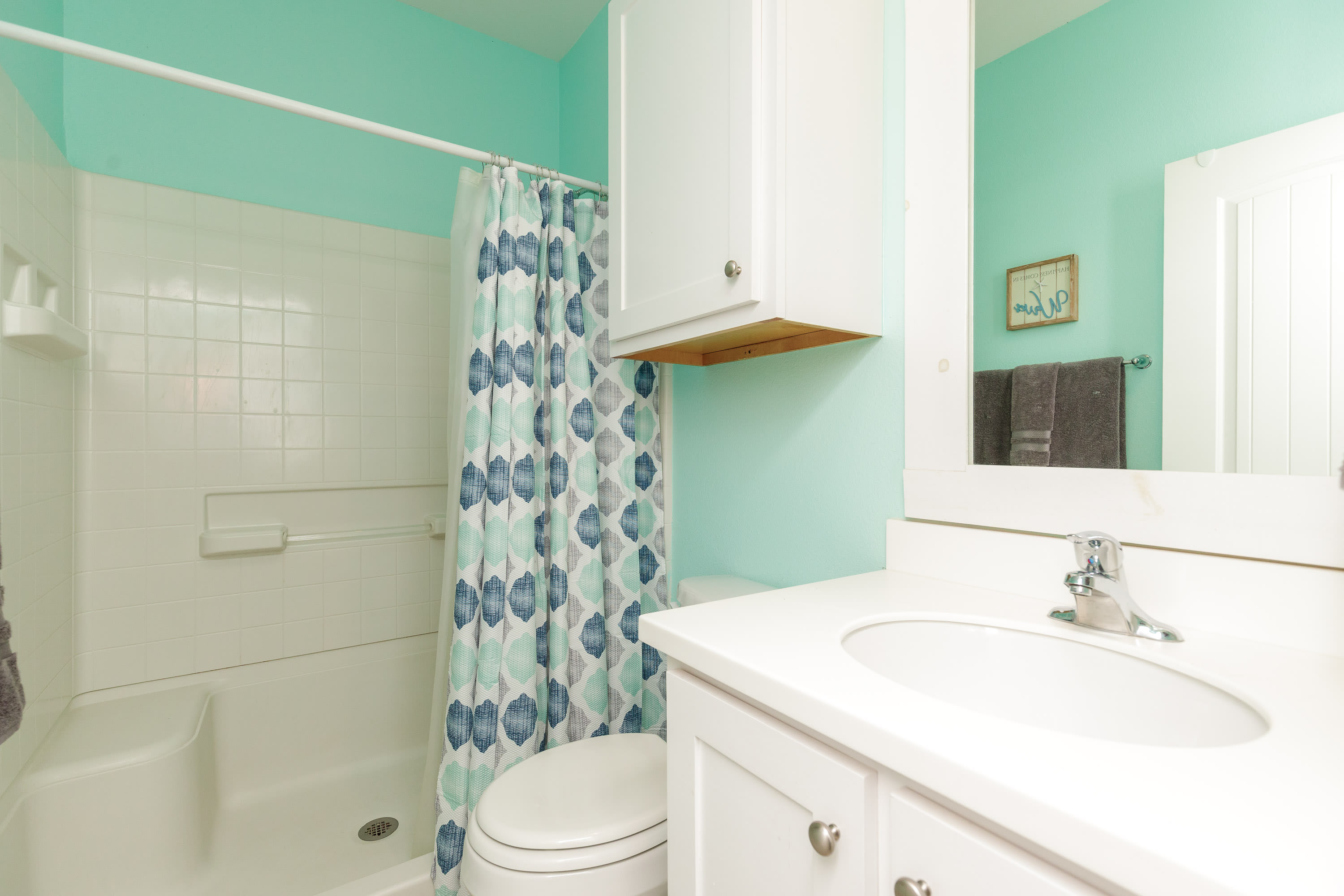 The home also includes a half bathroom and an additional full guest bathroom with a single vanity and walk-in shower.