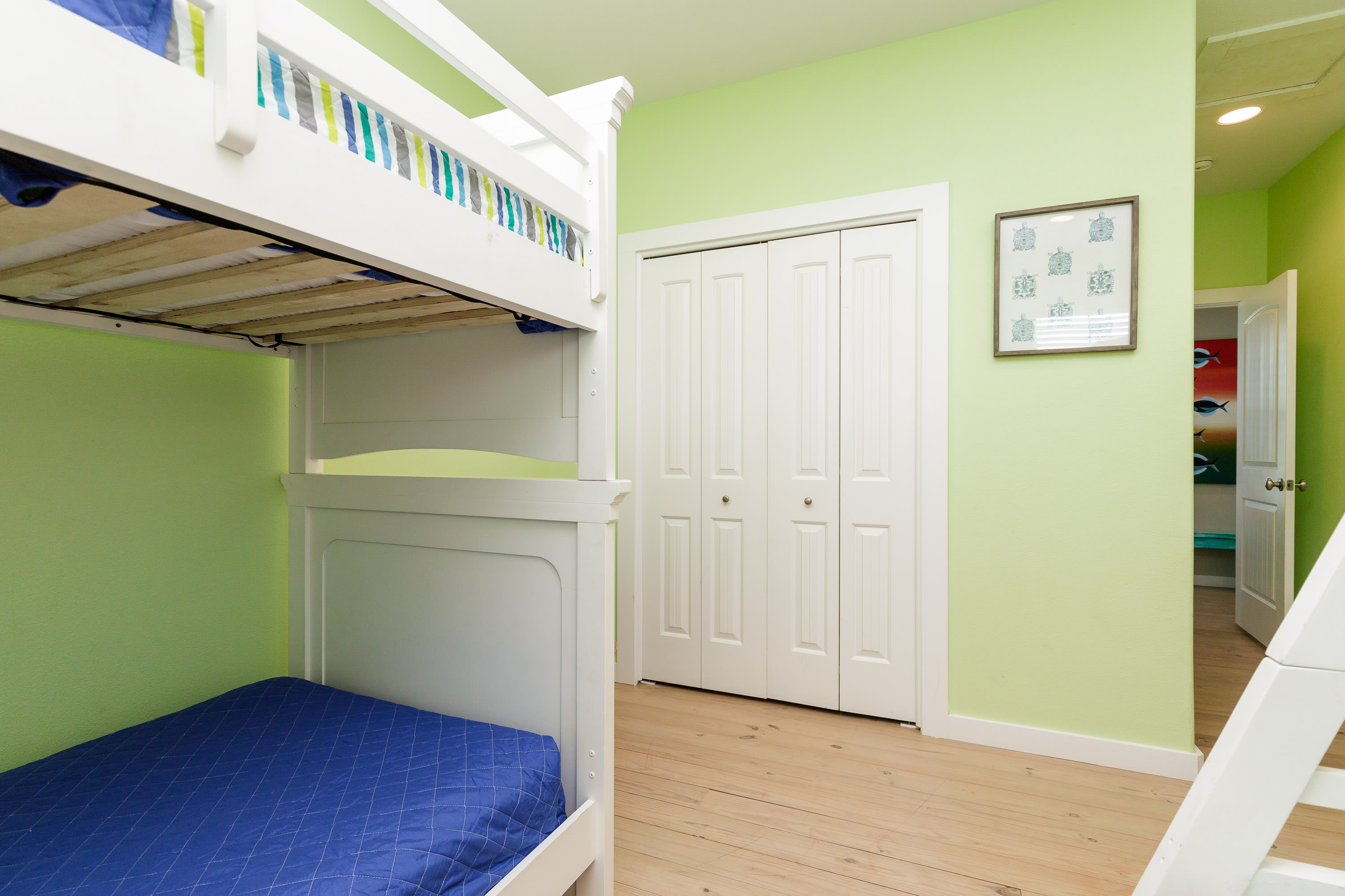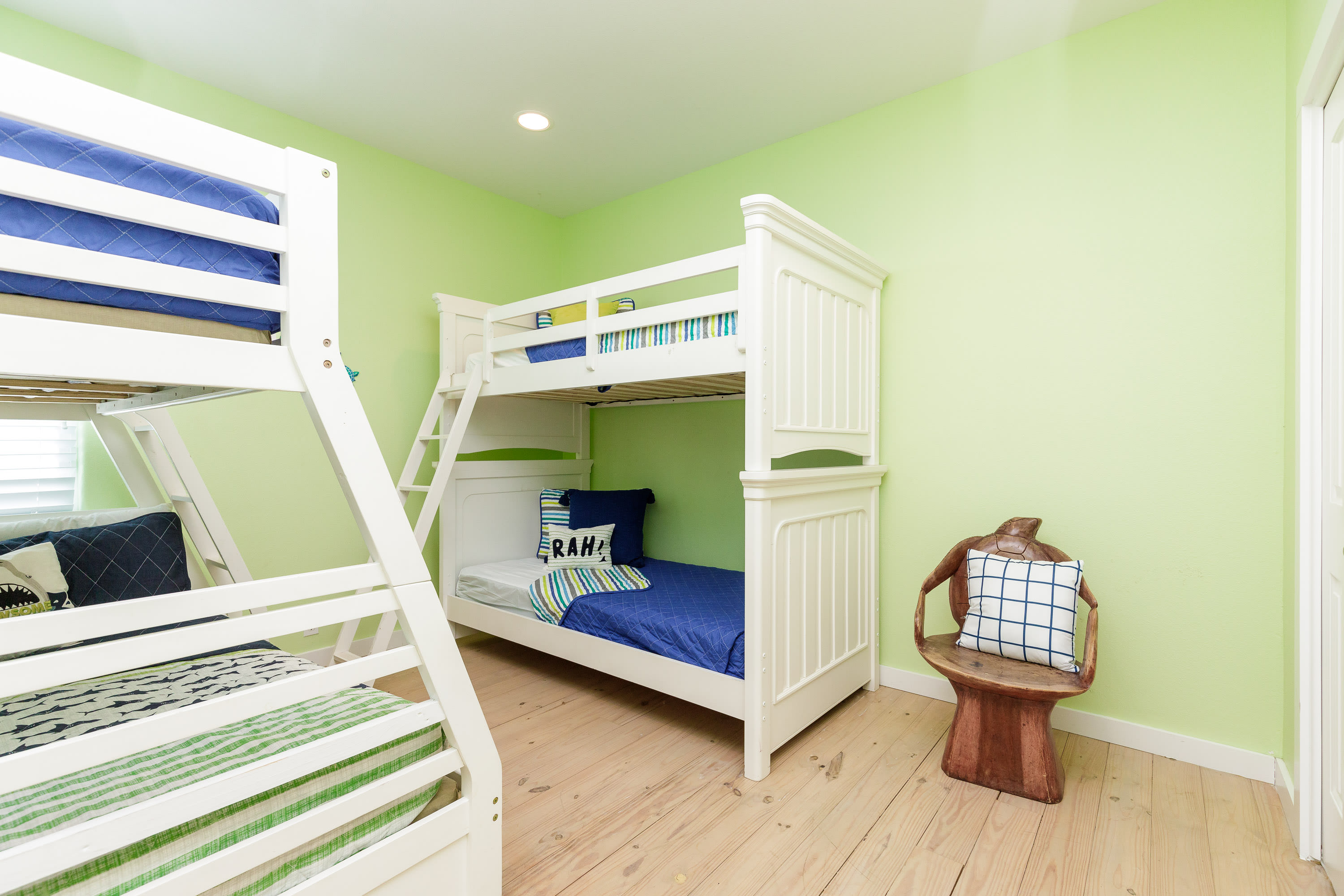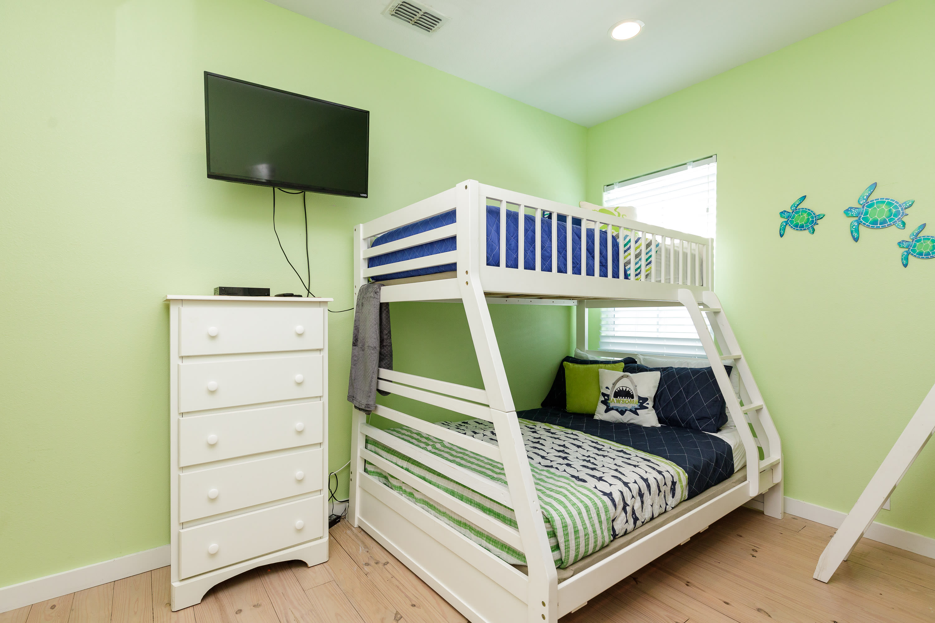 Bedroom #3 includes 2 bunk beds, the first with twin over twin mattress and the second with twin over full. The room also has a smart TV and ensuite bathroom with a single vanity and walk-in shower.