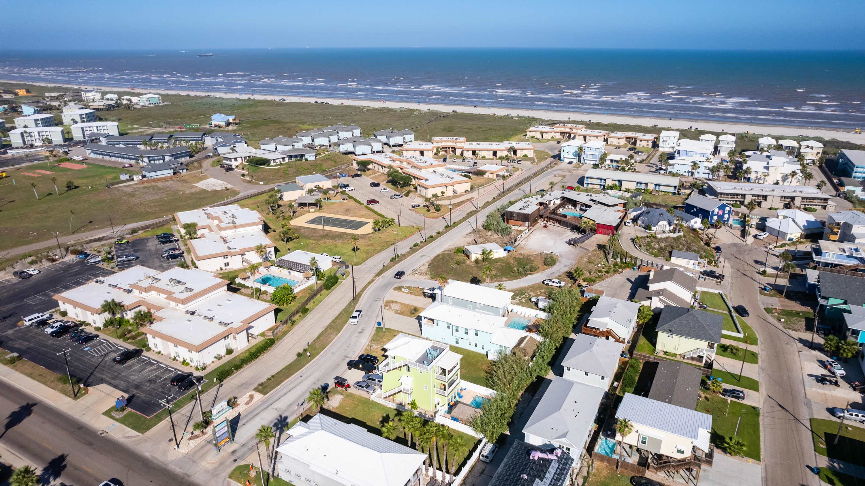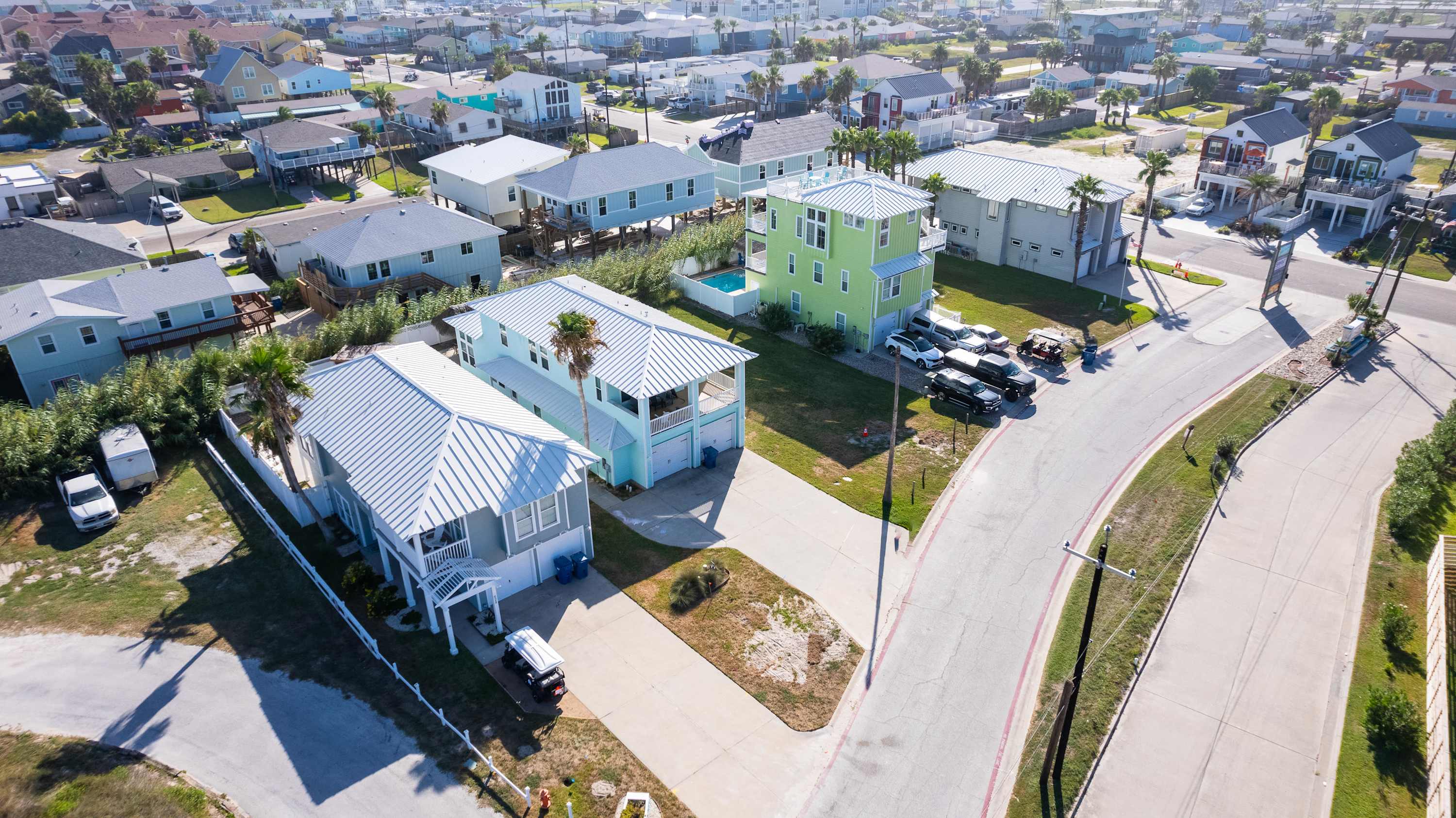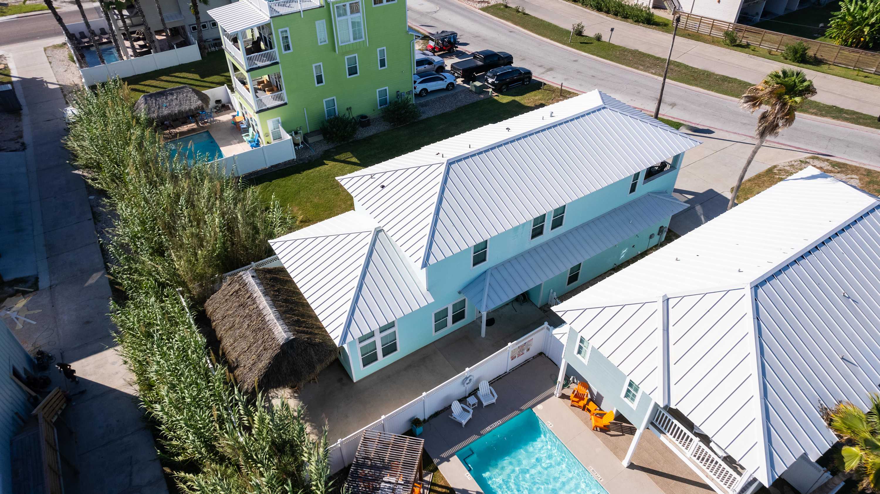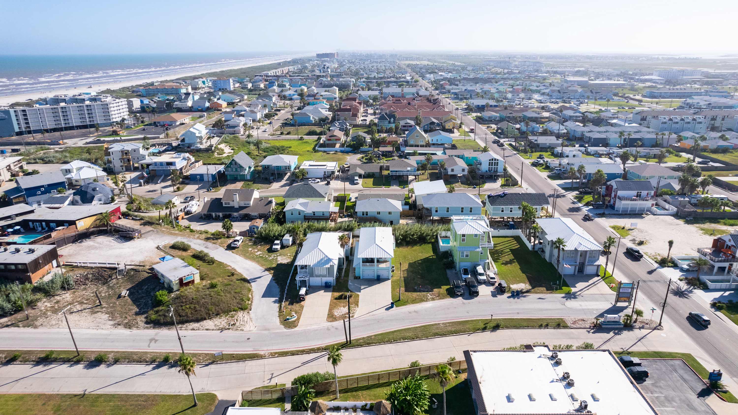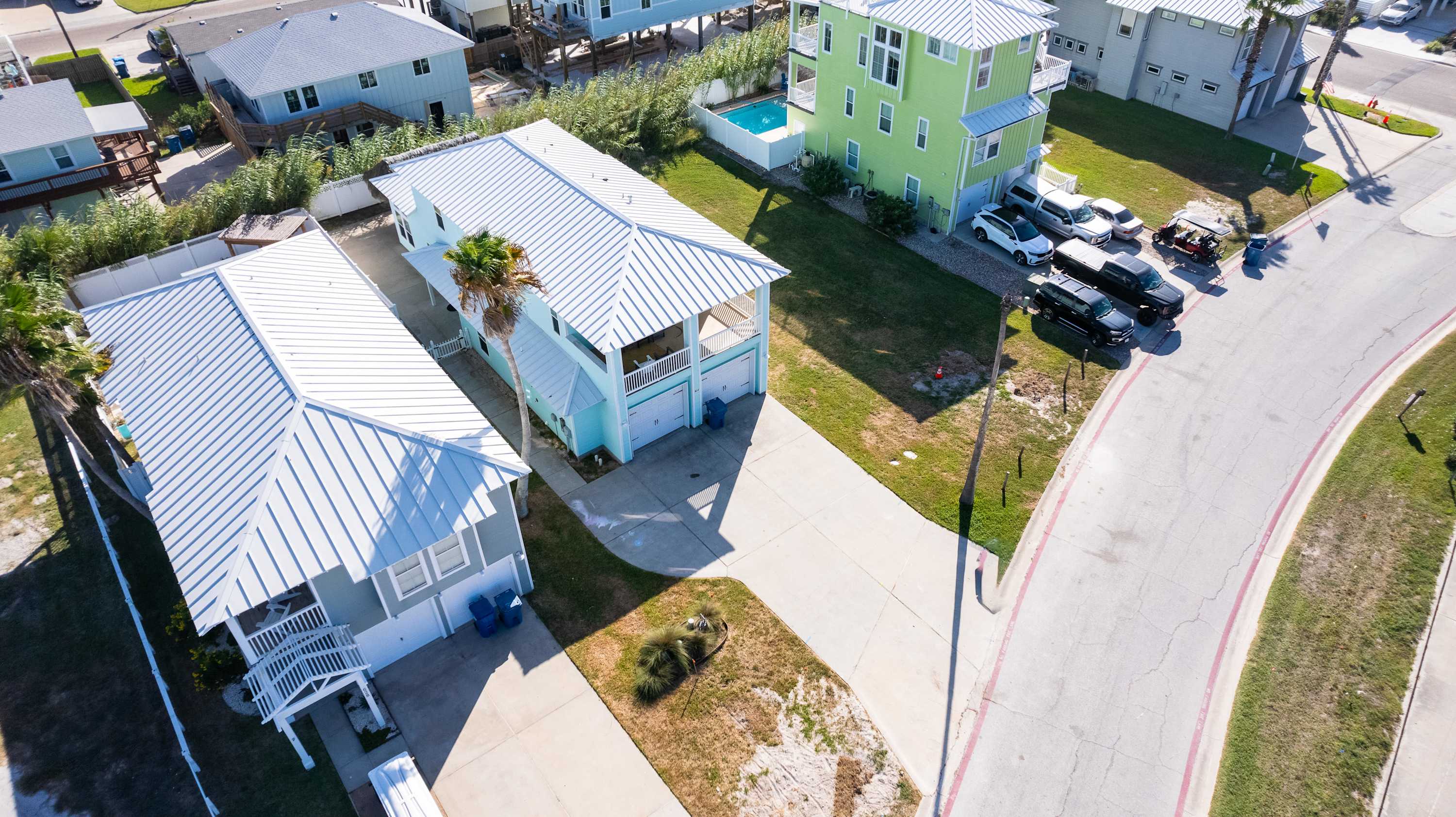 With its soaring ceilings, abundant windows filling open spaces with natural lighting, and special touches added specifically for your enjoyment, you wouldn’t want to spend your upcoming beach vacation anywhere else. Located just a block from the beach, trips to and from the shore will be a breeze. You’ll soon be basking in the warm Texas sun while listening to the waves gently lap ashore. A shared neighborhood pool offers a convenient option to cool off even closer to home or to get in a couple of morning laps before your daily adventures begin. The home is ADA-compliant and inclusive with ground floor access, kitchen and dining, and bedrooms. When you’re ready to find some shade, the outdoor palapa and bar is just the spot. The high-top chairs and built-in tables designed for enjoying afternoon cocktails will make you feel as though you’re in the middle of the Caribbean! Ready to spice things up a bit? The garage has been converted into a game room complete with a ping pong table and pool table. Additionally, the second floor lanai gives you a peek at the ocean plus a view out towards 11th Street where you can stay up to date on the action and easily access restaurants and bars.