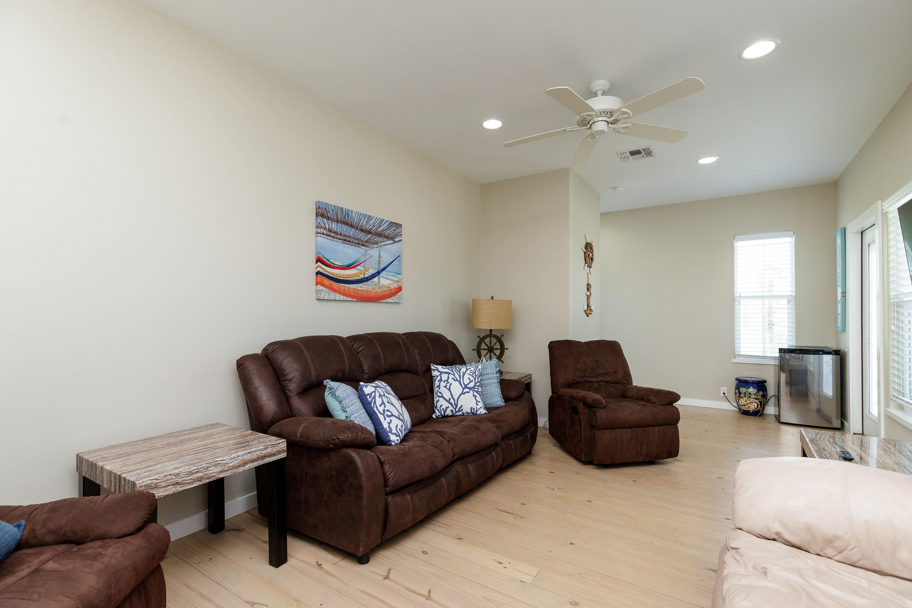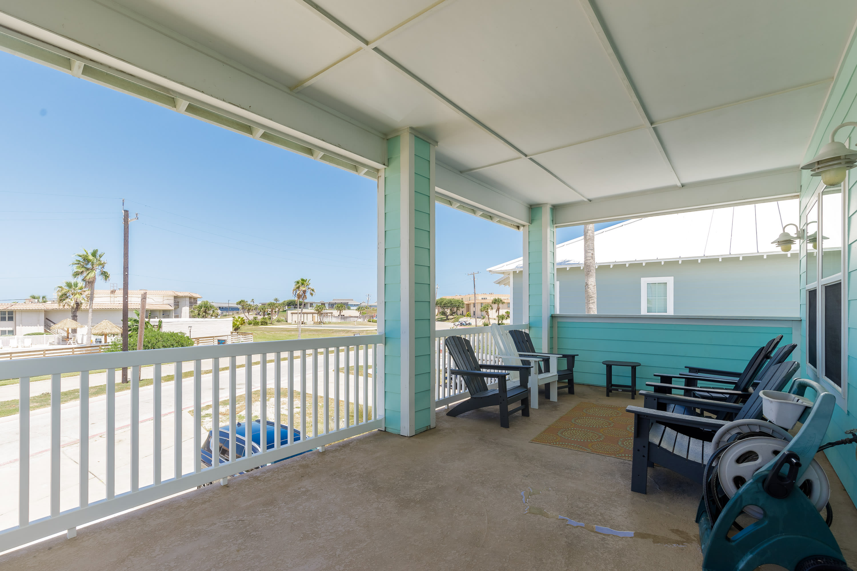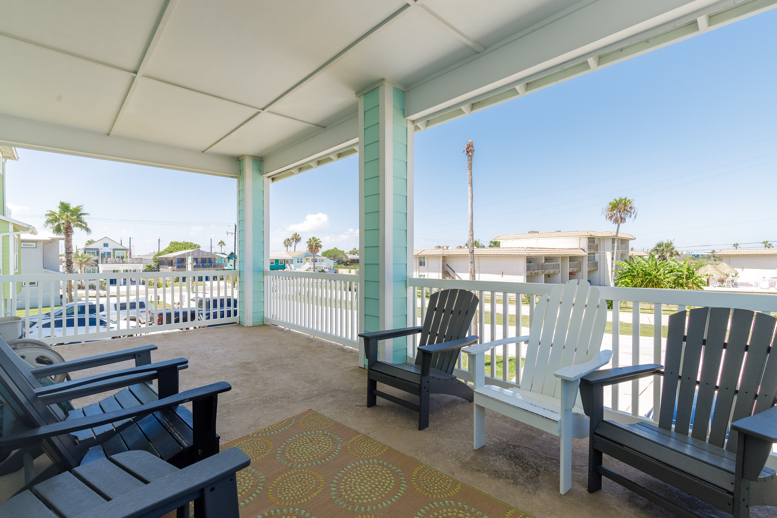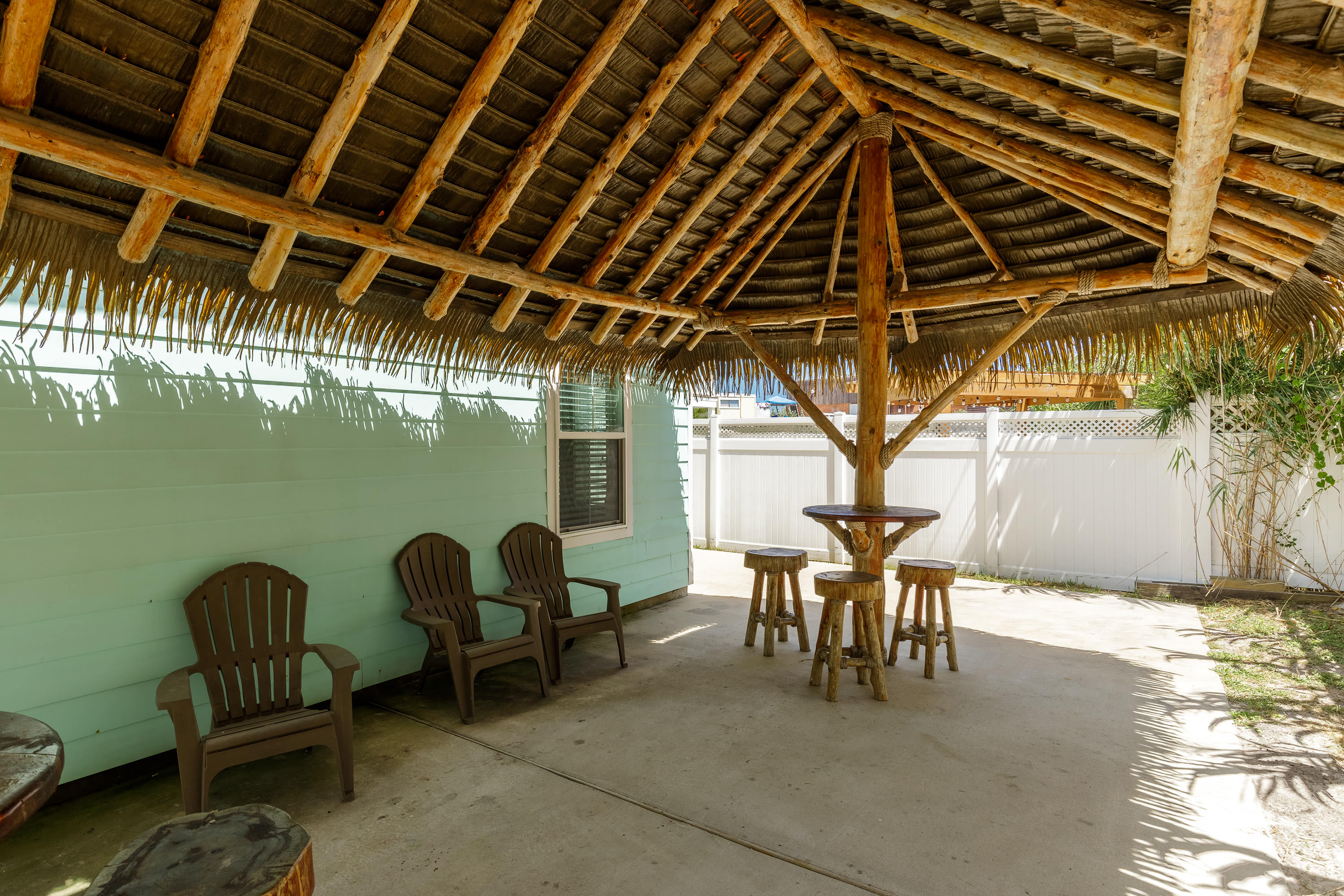 With its soaring ceilings, abundant windows filling open spaces with natural lighting, and special touches added specifically for your enjoyment, you wouldn’t want to spend your upcoming beach vacation anywhere else. Located just a block from the beach, trips to and from the shore will be a breeze. You’ll soon be basking in the warm Texas sun while listening to the waves gently lap ashore. A shared neighborhood pool offers a convenient option to cool off even closer to home or to get in a couple of morning laps before your daily adventures begin. The home is ADA-compliant and inclusive with ground floor access, kitchen and dining, and bedrooms. When you’re ready to find some shade, the outdoor palapa and bar is just the spot. The high-top chairs and built-in tables designed for enjoying afternoon cocktails will make you feel as though you’re in the middle of the Caribbean! Ready to spice things up a bit? The garage has been converted into a game room complete with a ping pong table and pool table. Additionally, the second floor lanai gives you a peek at the ocean plus a view out towards 11th Street where you can stay up to date on the action and easily access restaurants and bars.
