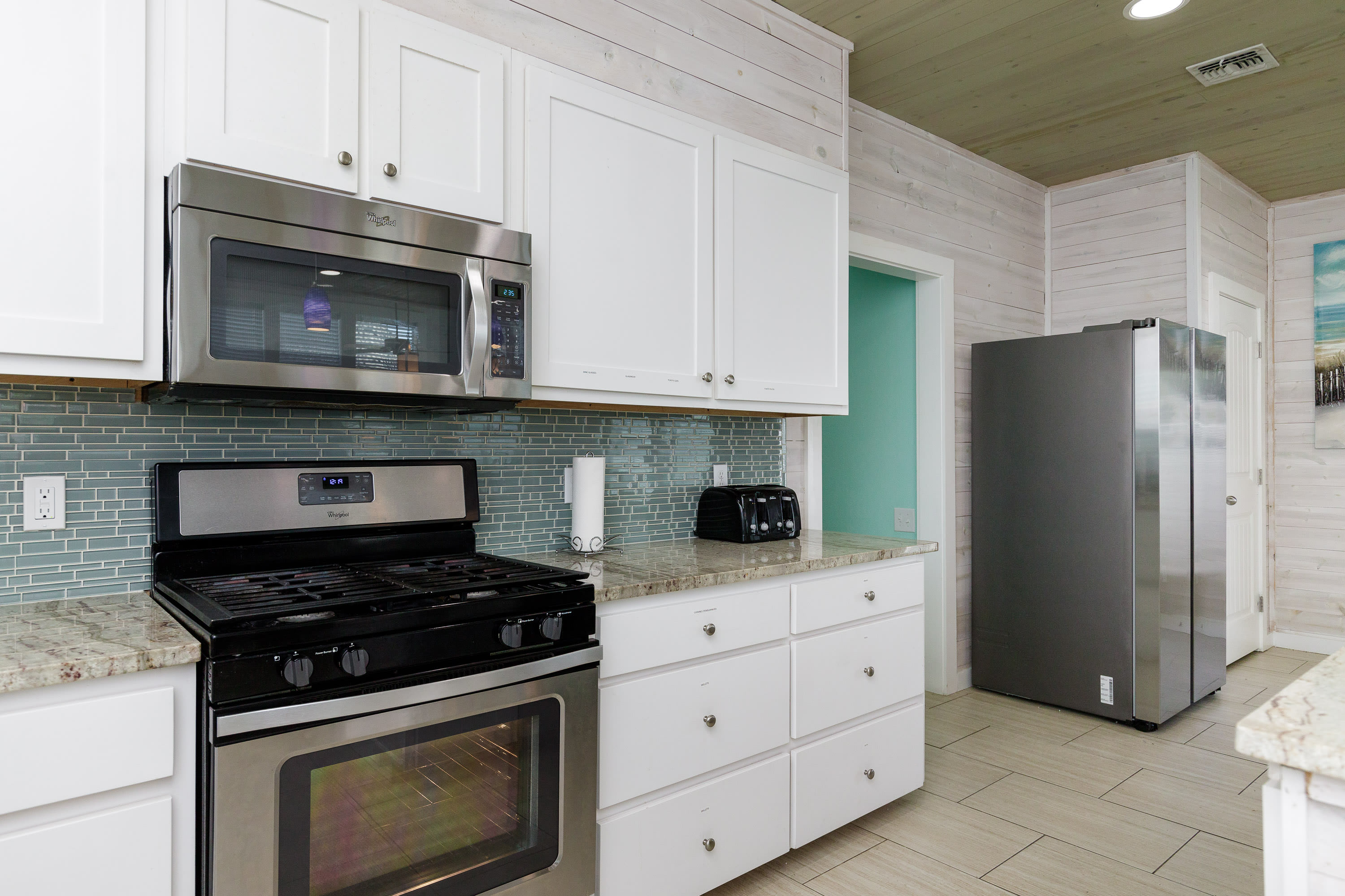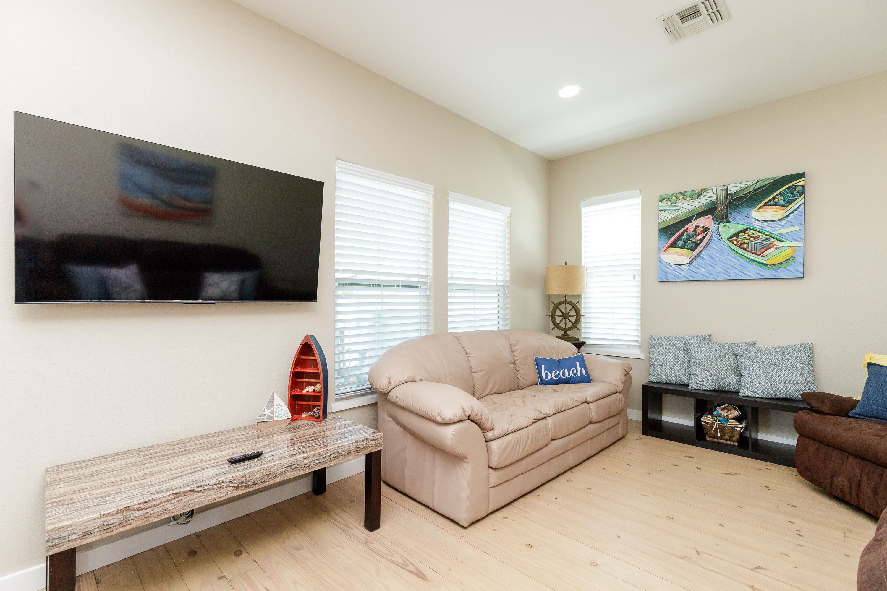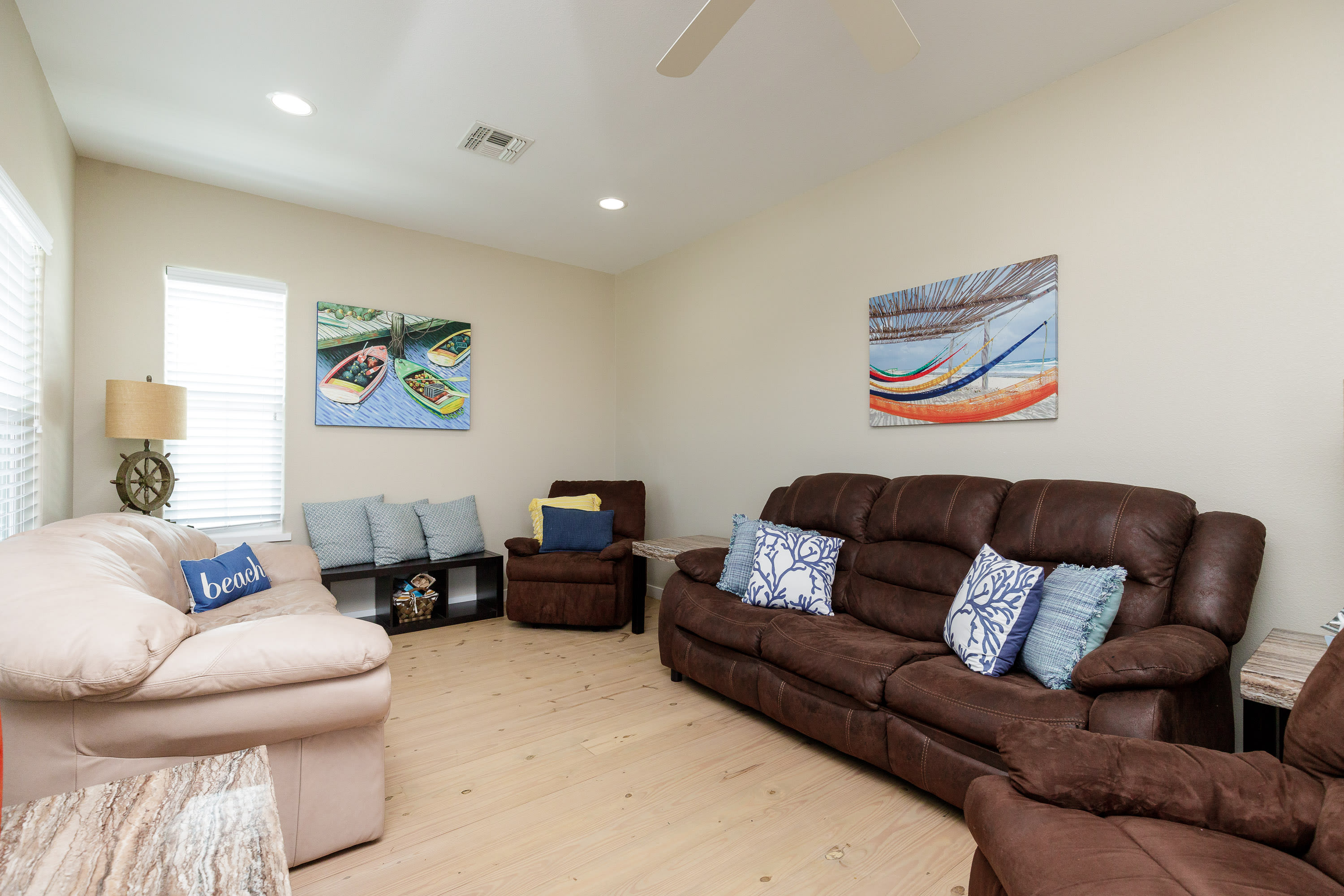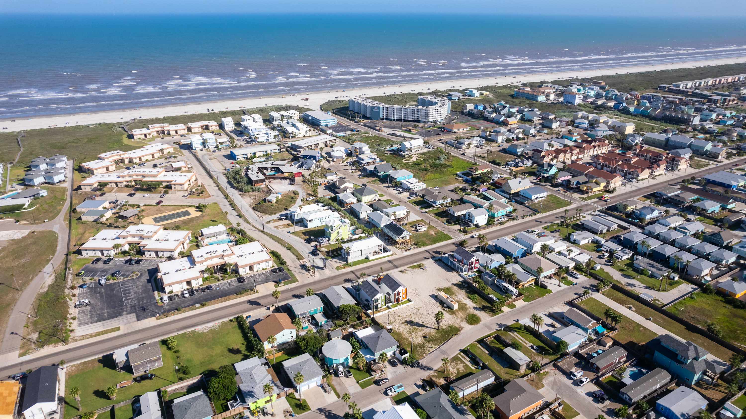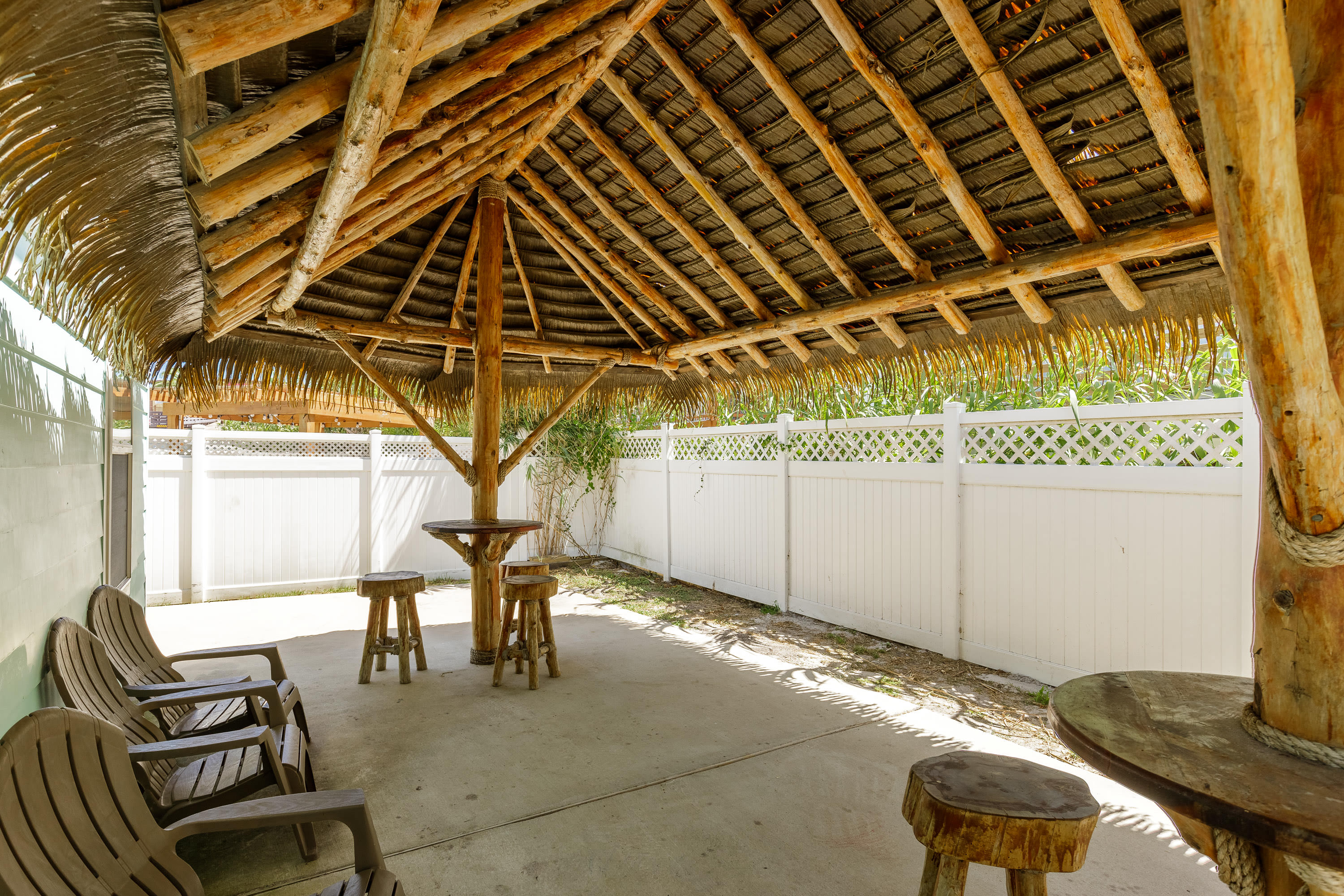 With its soaring ceilings, abundant windows filling open spaces with natural lighting, and special touches added specifically for your enjoyment, you wouldn’t want to spend your upcoming beach vacation anywhere else. Located just a block from the beach, trips to and from the shore will be a breeze. You’ll soon be basking in the warm Texas sun while listening to the waves gently lap ashore. A shared neighborhood pool offers a convenient option to cool off even closer to home or to get in a couple of morning laps before your daily adventures begin. The home is ADA-compliant and inclusive with ground floor access, kitchen and dining, and bedrooms. When you’re ready to find some shade, the outdoor palapa and bar is just the spot. The high-top chairs and built-in tables designed for enjoying afternoon cocktails will make you feel as though you’re in the middle of the Caribbean! Ready to spice things up a bit? The garage has been converted into a game room complete with a ping pong table and pool table. Additionally, the second floor lanai gives you a peek at the ocean plus a view out towards 11th Street where you can stay up to date on the action and easily access restaurants and bars.