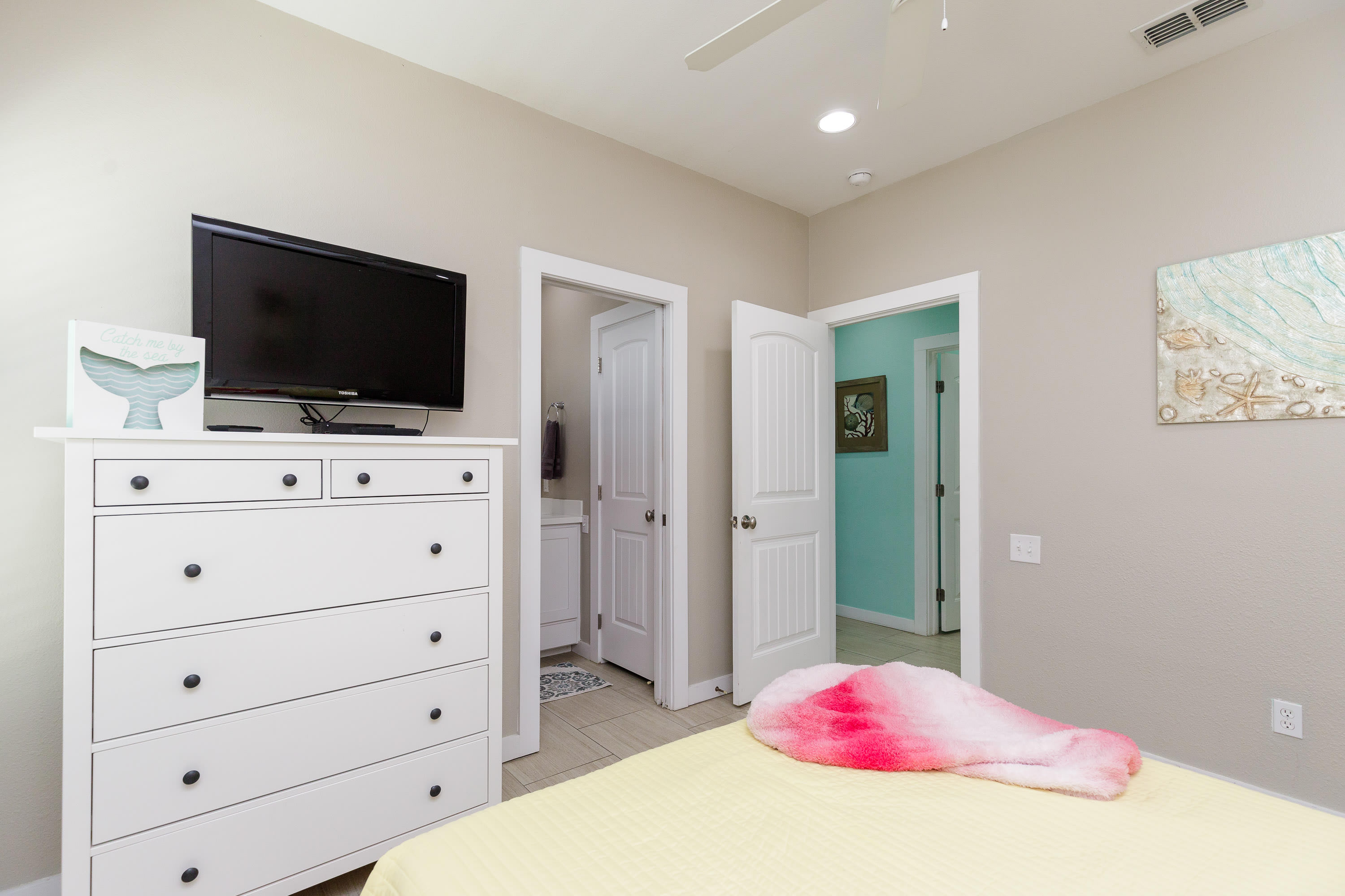 Bedroom #4 includes a queen size bed, smart TV, and ensuite bathroom with a single vanity and shower/tub combo.