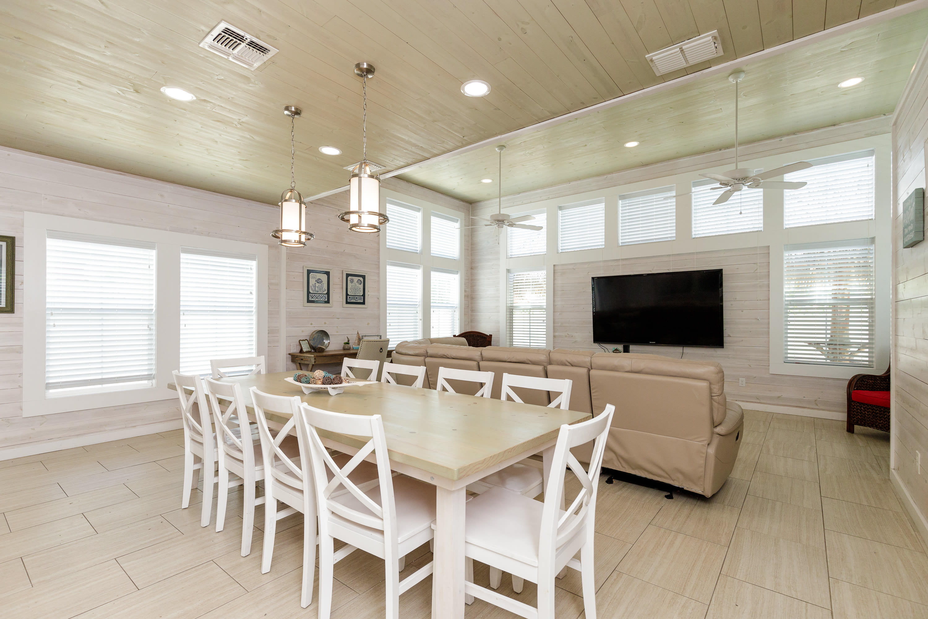 After exploring all these amazing outdoor spaces, the indoors will serve as the perfect relaxing retreat. The open floor plan on the ground level offers a wealth of space, seamlessly transitioning one room to the next and ensuring that everyone stays at the center of the action. Plush leather sofa seating in the living room surrounds a large smart TV, creating an immersive scene for a late-night movie. The generous, modern kitchen features glossy countertops and stainless steel appliances, inclusive of a Keurig coffee maker, blender, toaster, cookware, and dinnerware for all your mealtime needs. Gather the group around the dining room table with seating for 10 for formal meals or a rousing night of games. Additional high-top seating for 4 can be found at the kitchen counter for quick bites and appetizers alike. The second floor also invites you into another living space with comfy couches, smart TV, and view out onto the spacious lanai. If you want to dine outside, the second-floor lanai patio offers plentiful Adirondack seating, an ideal spot for morning sunrise coffee or for dinner watching the sunset, and a view.