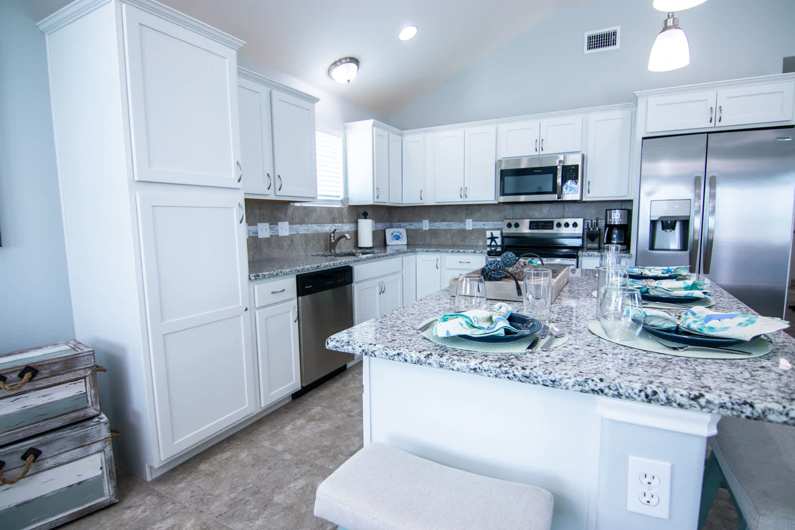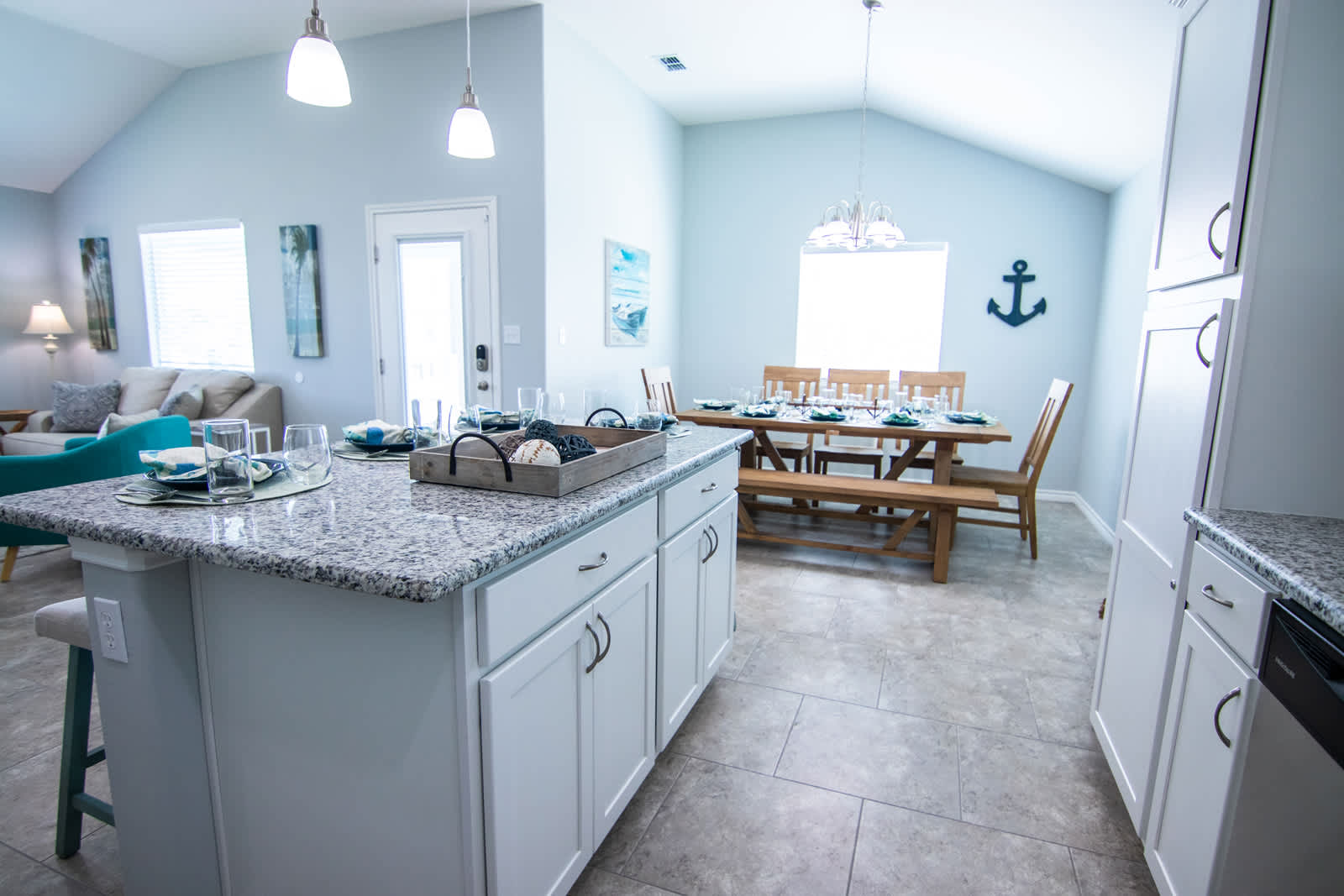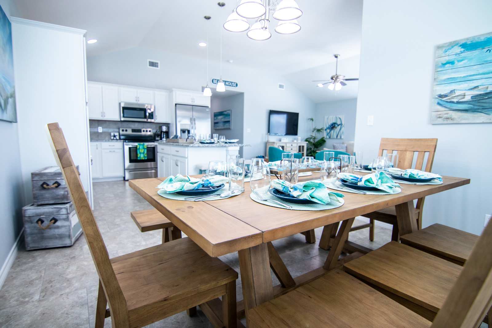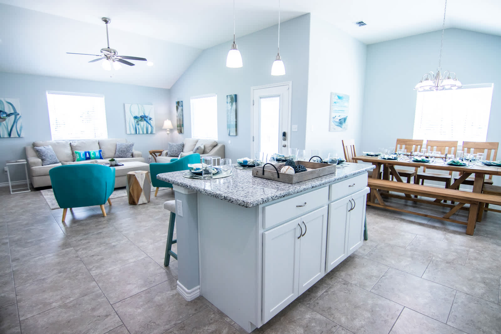 After a fun-filled day on the sand, nothing beats returning to your private retreat to unwind and spend time with loved ones. Our spacious and modern living space is designed with your family's comfort in mind. The integrated kitchen, dining, and living areas provide an inviting ambiance for quality time together, whether you're snuggled up on the cozy couches for a movie night or cooking up a storm in the bright and well-equipped kitchen. With stainless steel appliances at your fingertips and a variety of tools like a blender, crockpot, waffle maker, and electric griddle, you can easily whip up tasty meals to enjoy together. Serve up your delicious creations family-style at the sleek dining table that's set for 8, with additional seating available at the kitchen island. With all of these amenities and more at your disposal, you're sure to have the trip of a lifetime at Off da Hook!