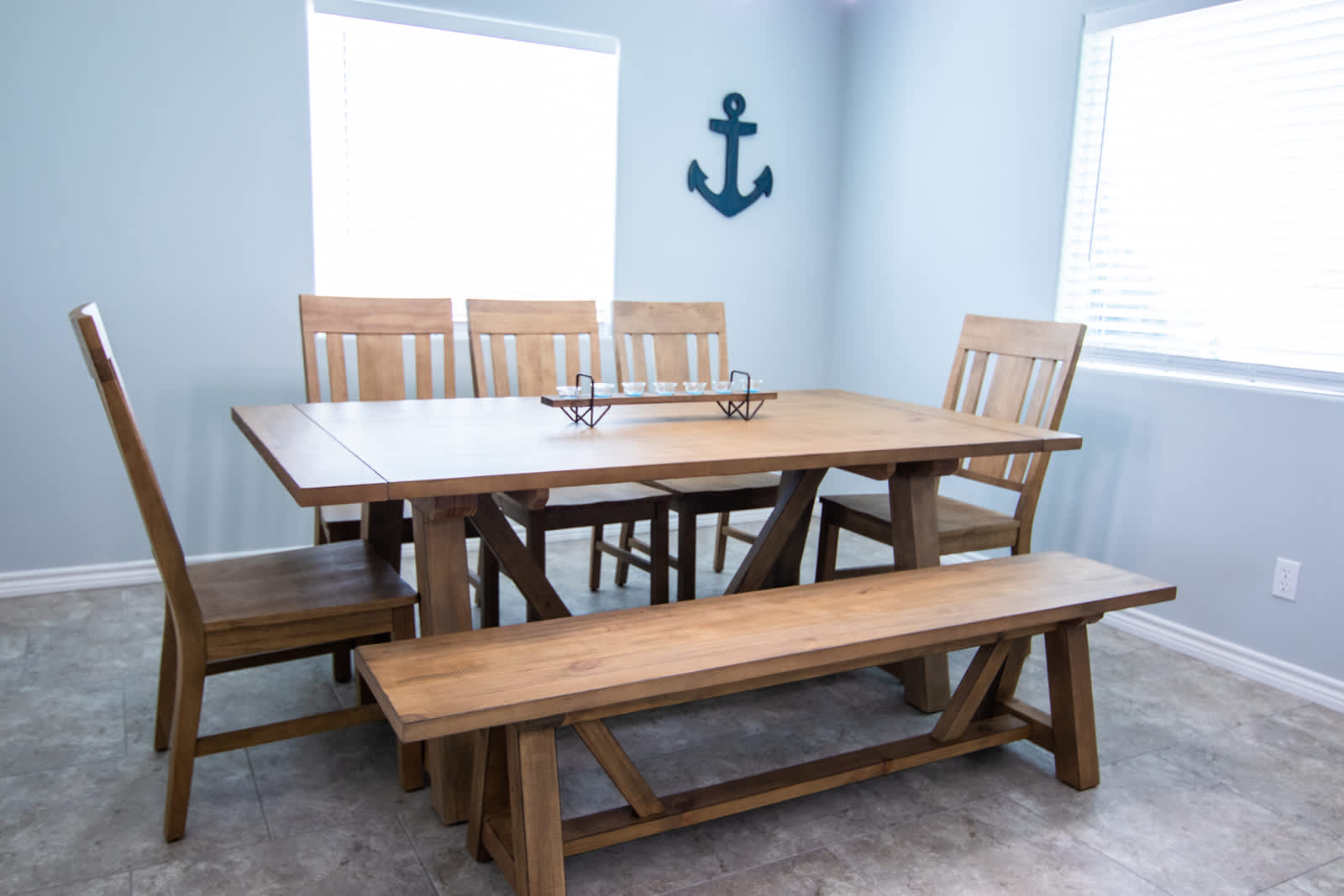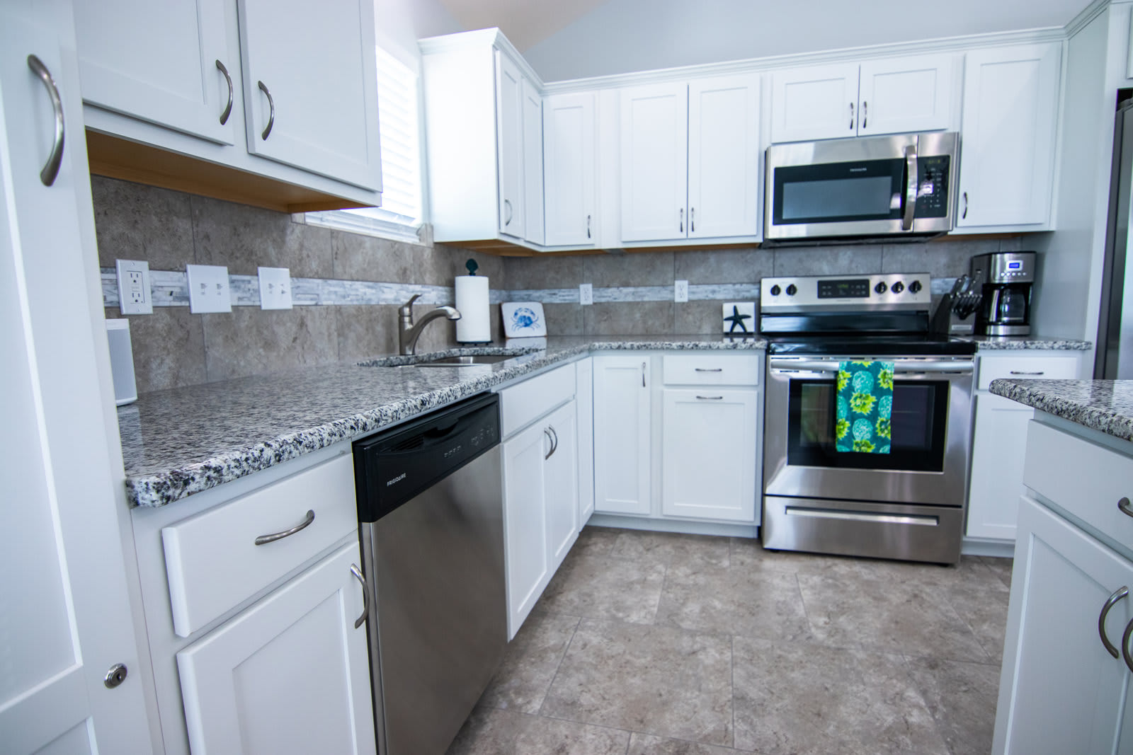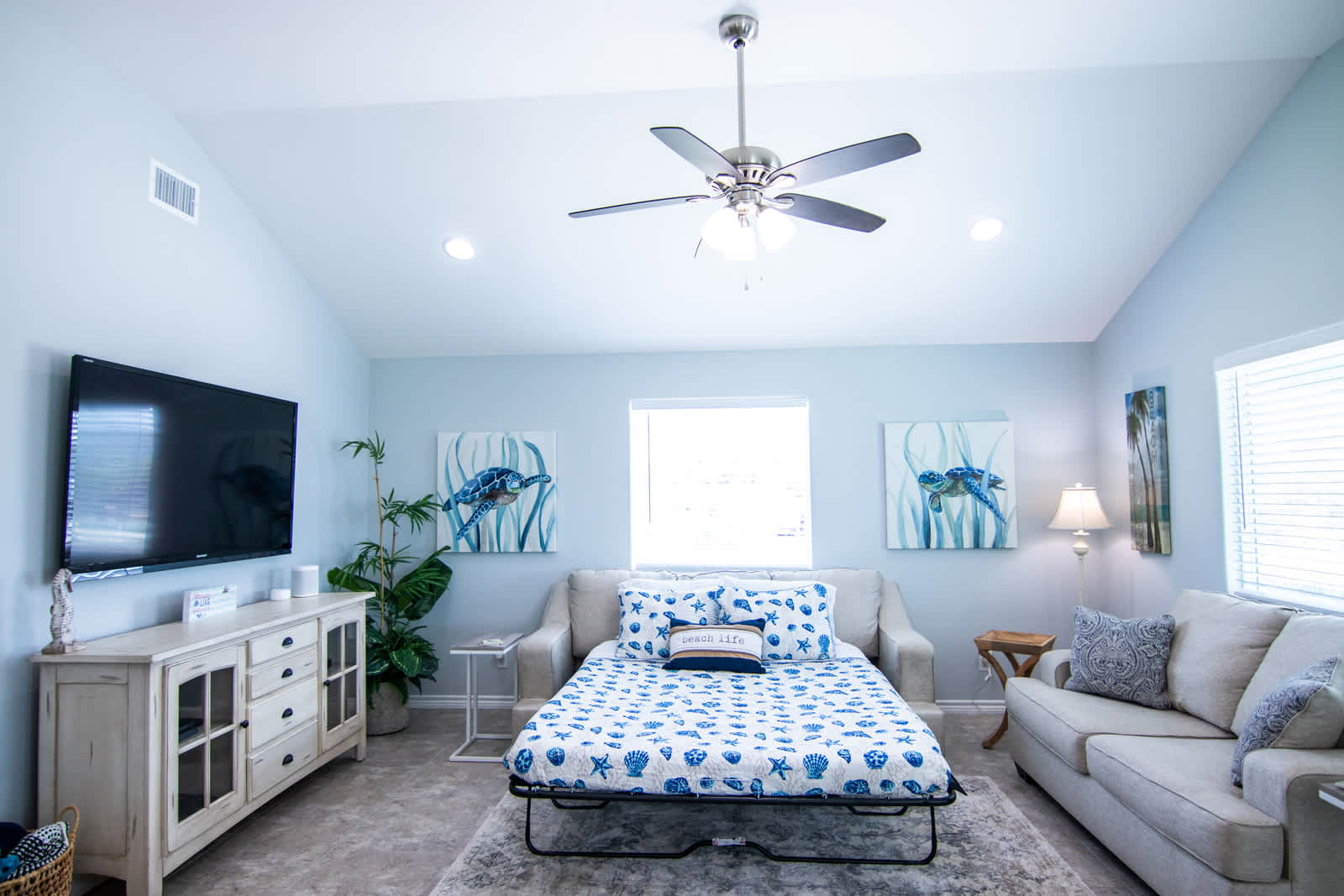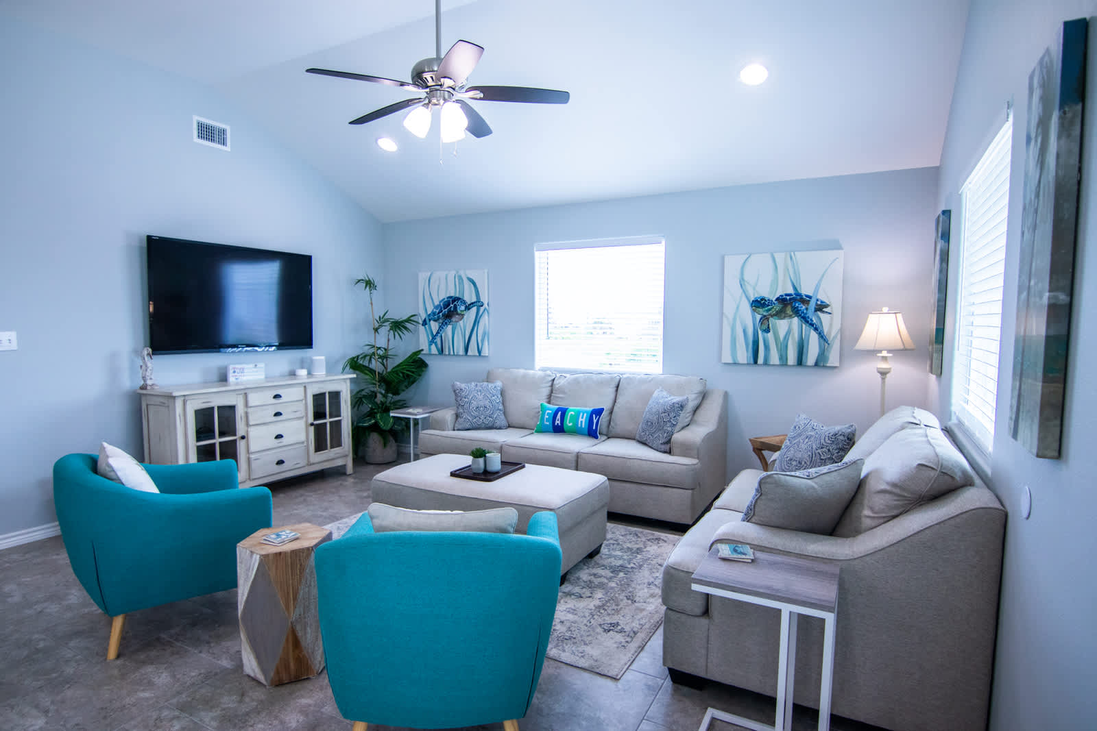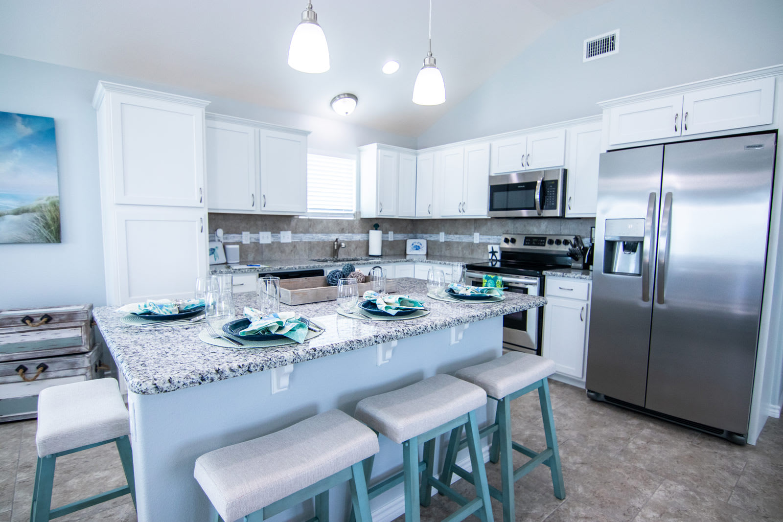 After a fun-filled day on the sand, nothing beats returning to your private retreat to unwind and spend time with loved ones. Our spacious and modern living space is designed with your family's comfort in mind. The integrated kitchen, dining, and living areas provide an inviting ambiance for quality time together, whether you're snuggled up on the cozy couches for a movie night or cooking up a storm in the bright and well-equipped kitchen. With stainless steel appliances at your fingertips and a variety of tools like a blender, crockpot, waffle maker, and electric griddle, you can easily whip up tasty meals to enjoy together. Serve up your delicious creations family-style at the sleek dining table that's set for 8, with additional seating available at the kitchen island. With all of these amenities and more at your disposal, you're sure to have the trip of a lifetime at Off da Hook!