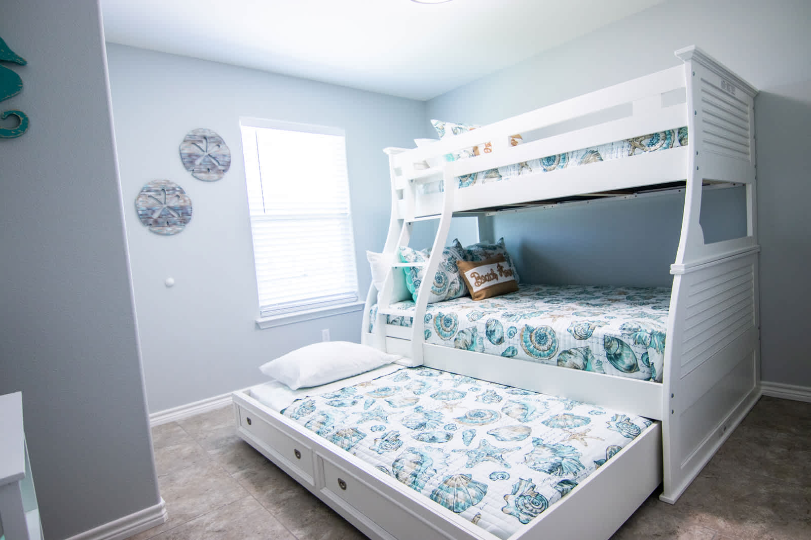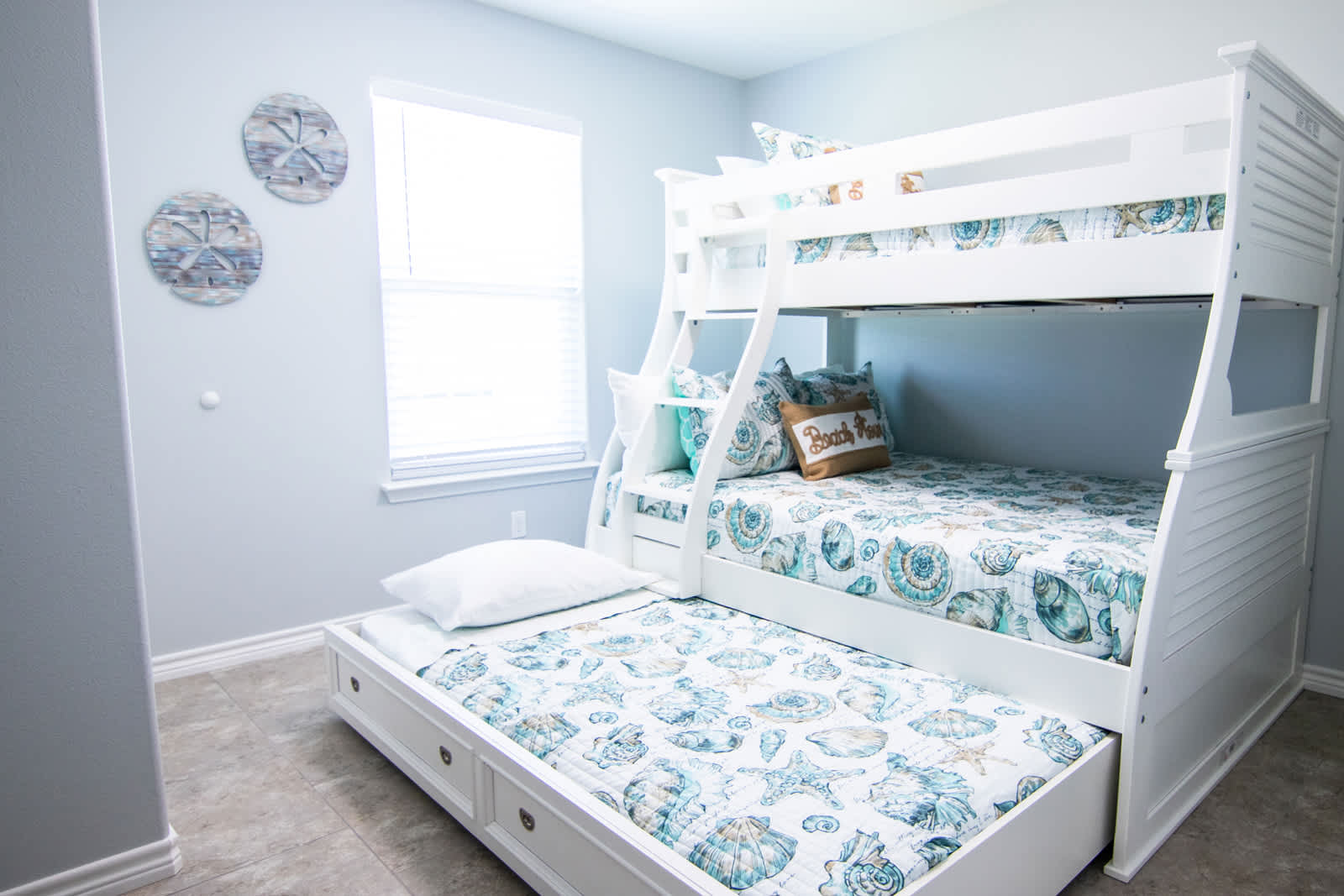 - Bedroom #2 has a bunk bed with a twin size bed on top, full size bed on bottom, and twin size trundle.