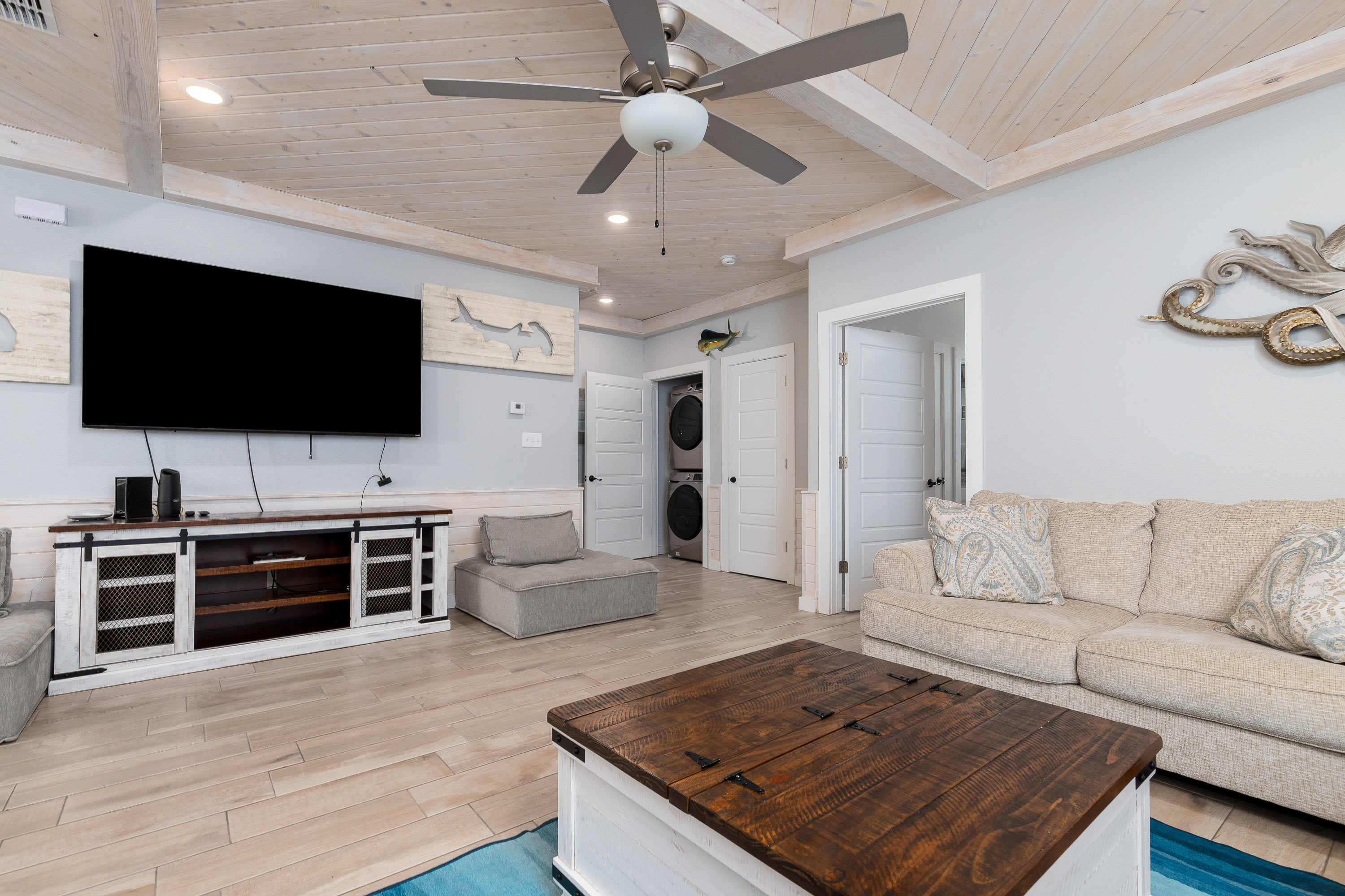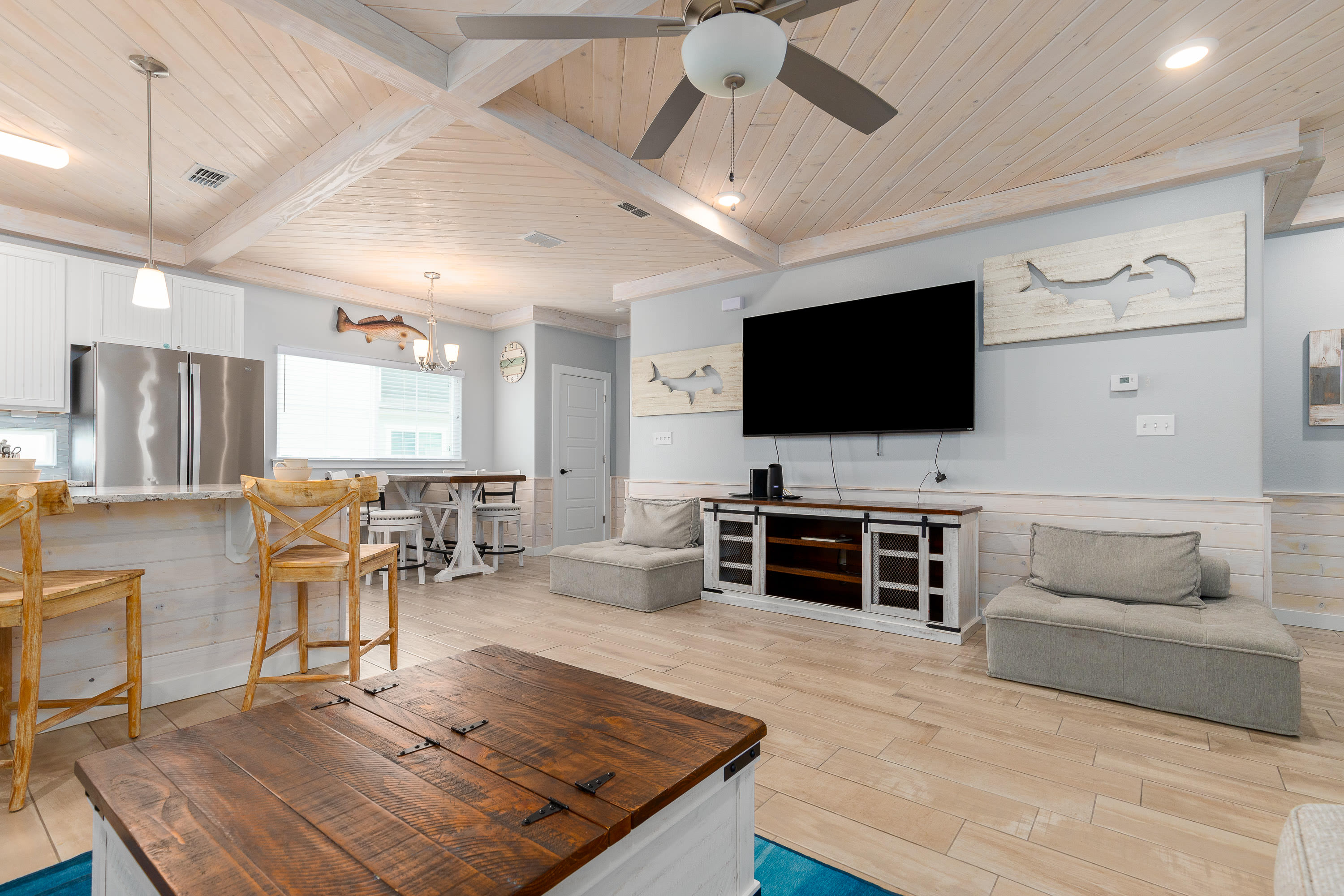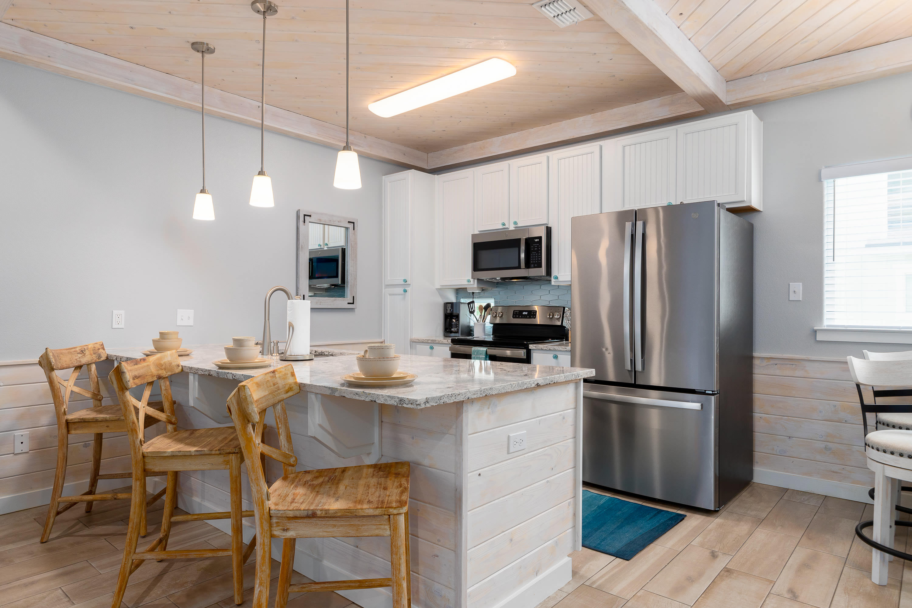 After a day at the beach, head over to the outdoor shower by the pool to rinse off the day’s sand and salt. Once you're refreshed, make your way inside to the open-concept main level. We've combined the kitchen, dining, and living areas to create a space perfect for quality time together. Even if each family member is doing their own thing, you'll still get the chance to enjoy each other's company. The cozy couches are perfect for movie nights on the smart TV. And when hunger strikes, the bright and modern kitchen is equipped with everything you need to make delicious meals from home. Share your culinary creations family-style at the dining table set for 5, with extra seating along the kitchen bar. From the moment you arrive, the high-end furnishings and southern charm of this home will allow you to sink deep into relaxation mode.