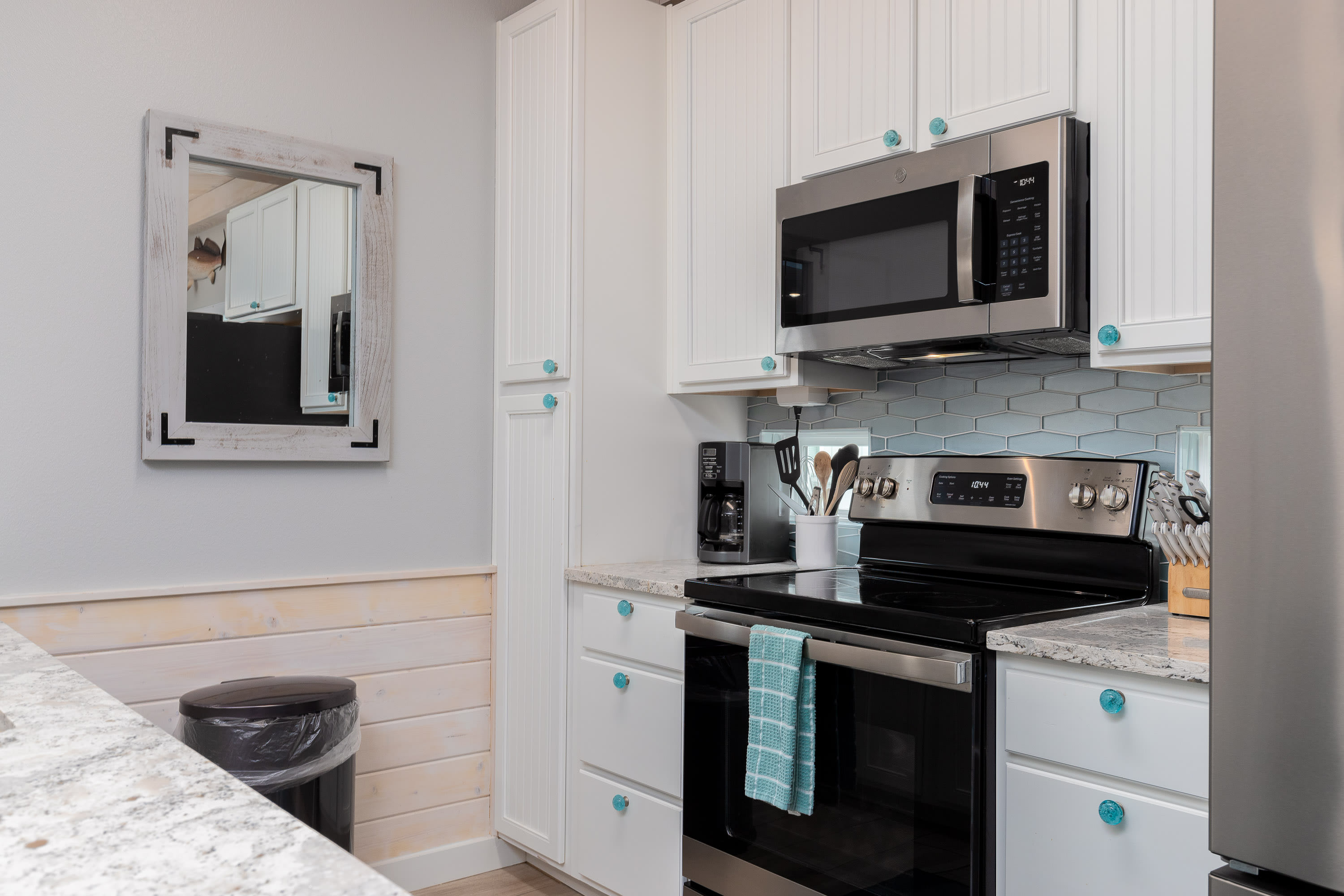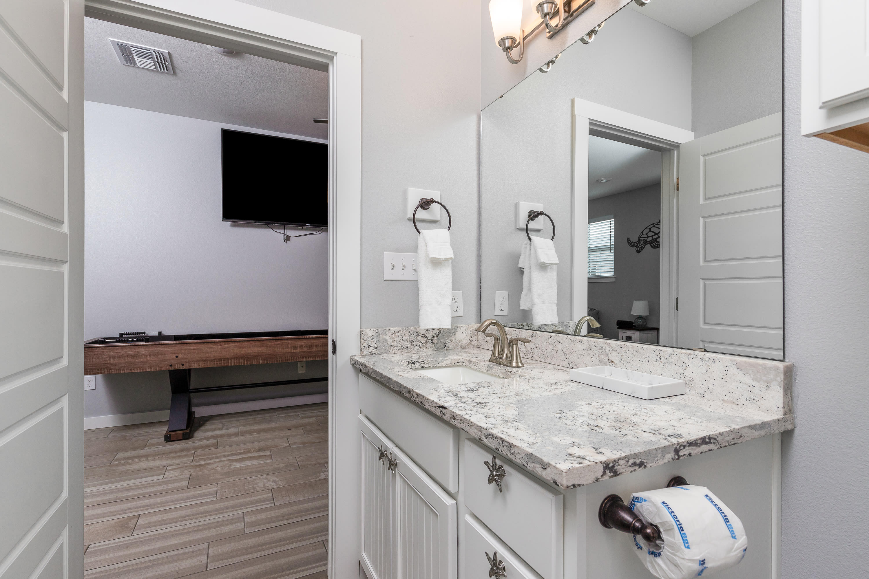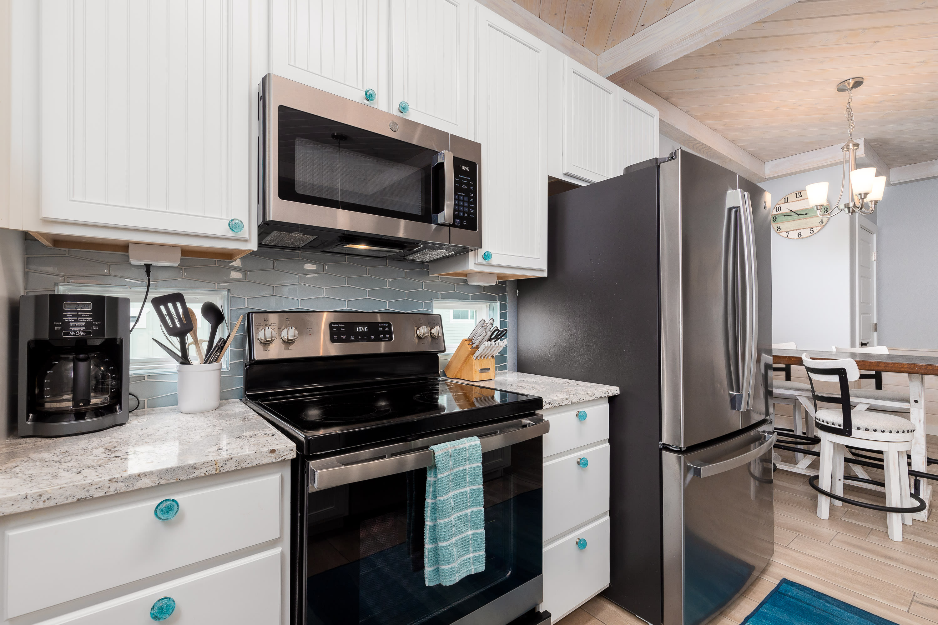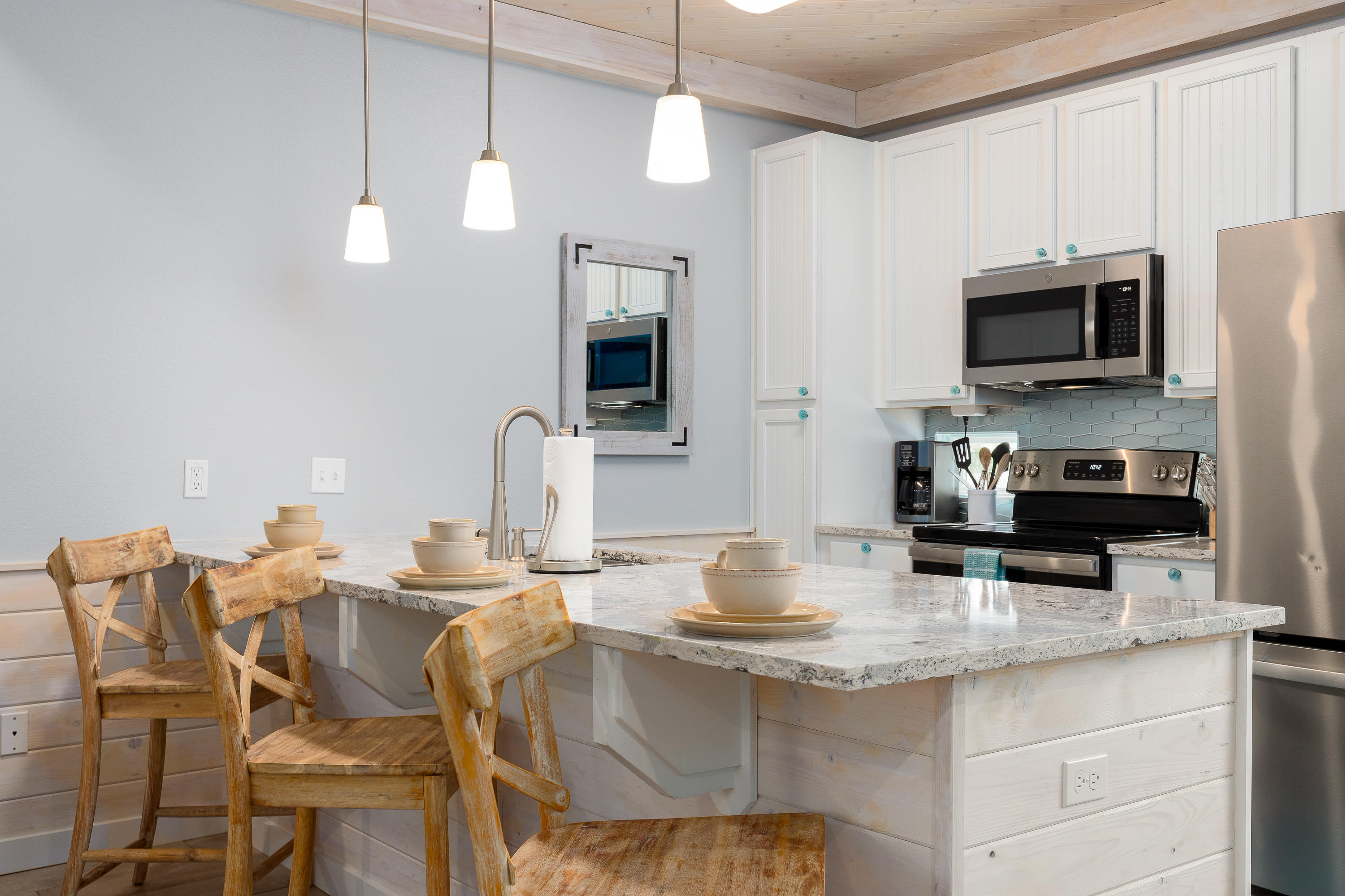 After a day at the beach, head over to the outdoor shower by the pool to rinse off the day’s sand and salt. Once you're refreshed, make your way inside to the open-concept main level. We've combined the kitchen, dining, and living areas to create a space perfect for quality time together. Even if each family member is doing their own thing, you'll still get the chance to enjoy each other's company. The cozy couches are perfect for movie nights on the smart TV. And when hunger strikes, the bright and modern kitchen is equipped with everything you need to make delicious meals from home. Share your culinary creations family-style at the dining table set for 5, with extra seating along the kitchen bar. From the moment you arrive, the high-end furnishings and southern charm of this home will allow you to sink deep into relaxation mode.