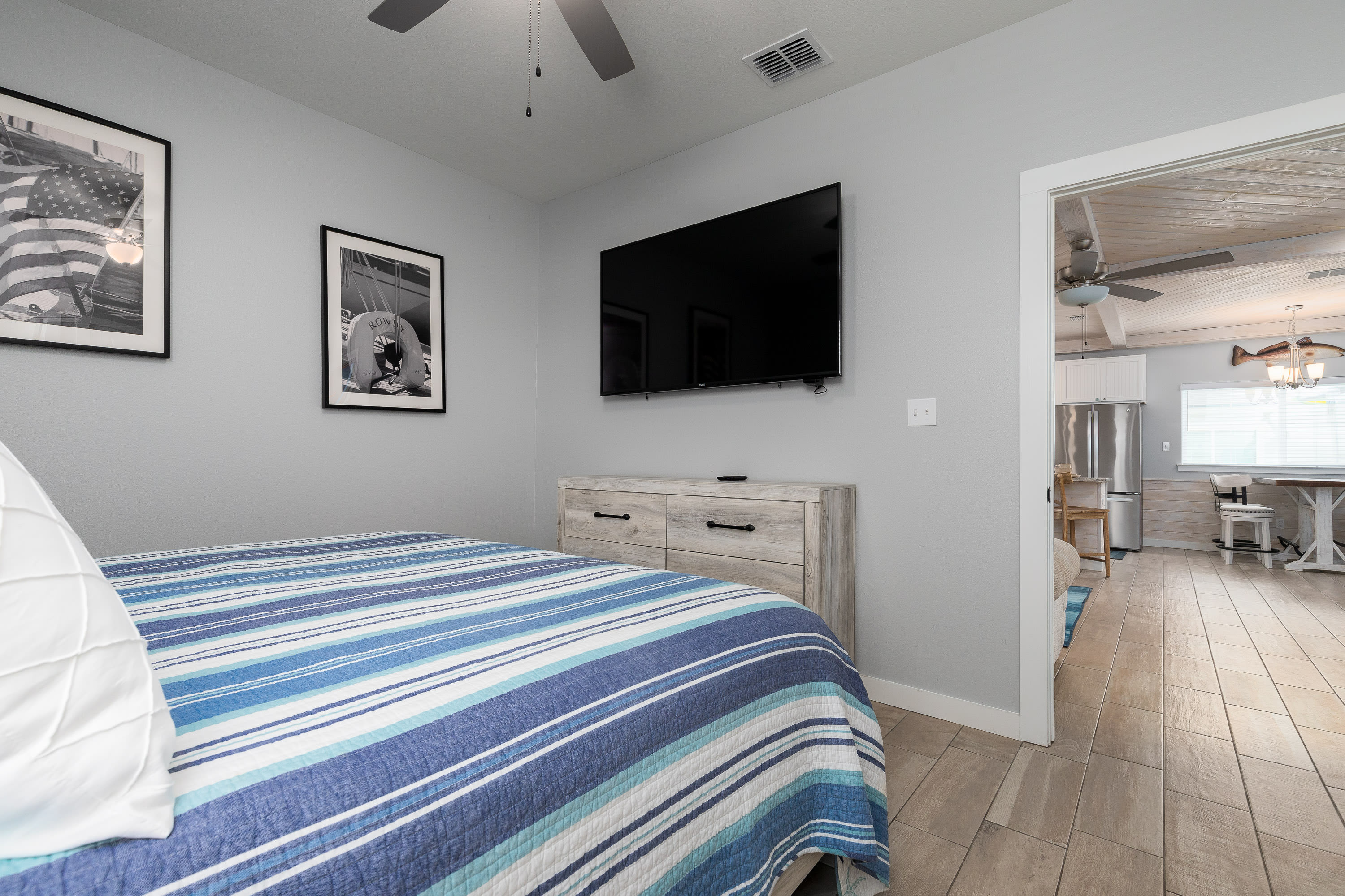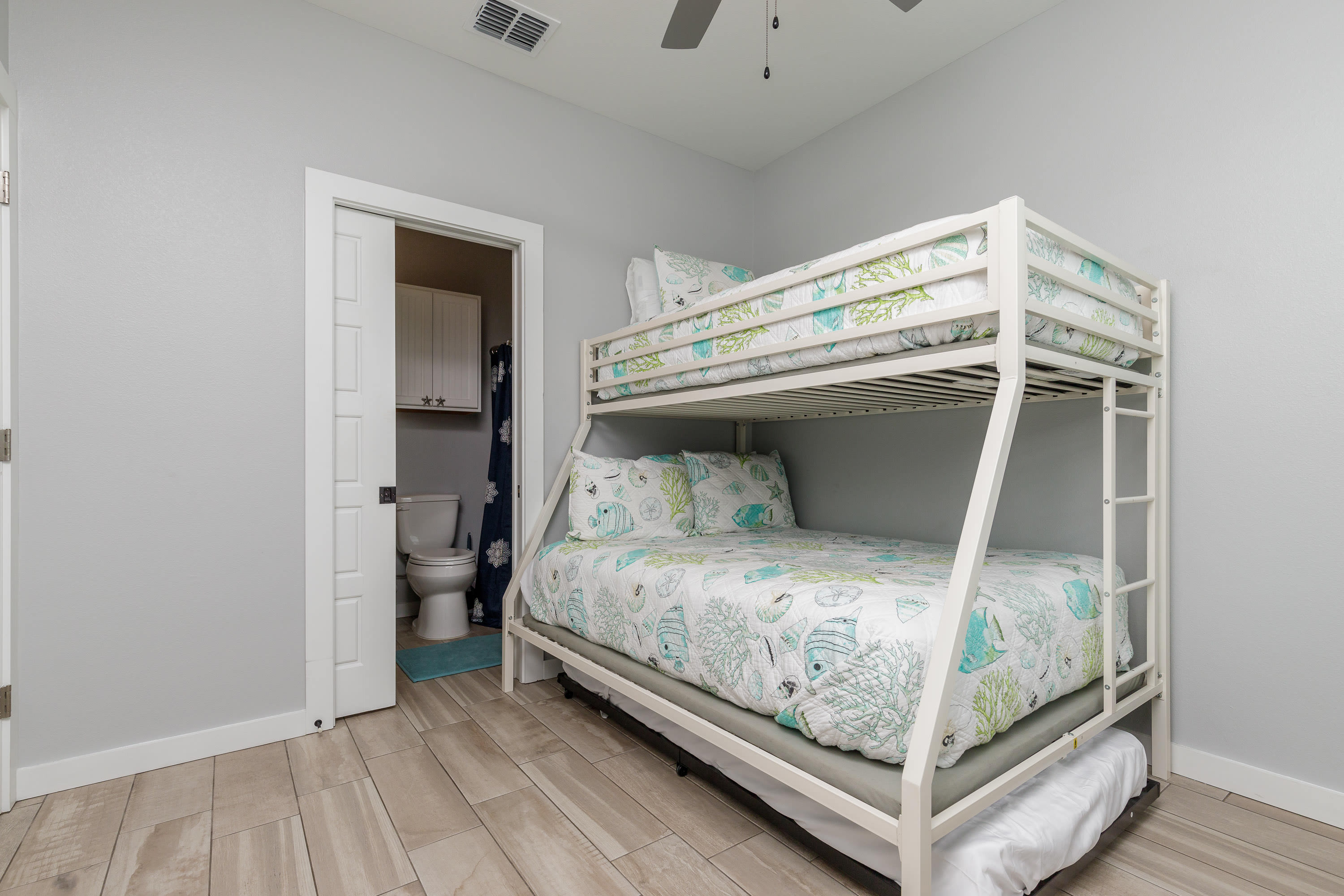 Bedroom #2 has bunk beds with a twin size bed on top, queen size bed on bottom, and an additional twin size trundle bed. This room also has a smart tv and ensuite bathroom with walk-in shower.