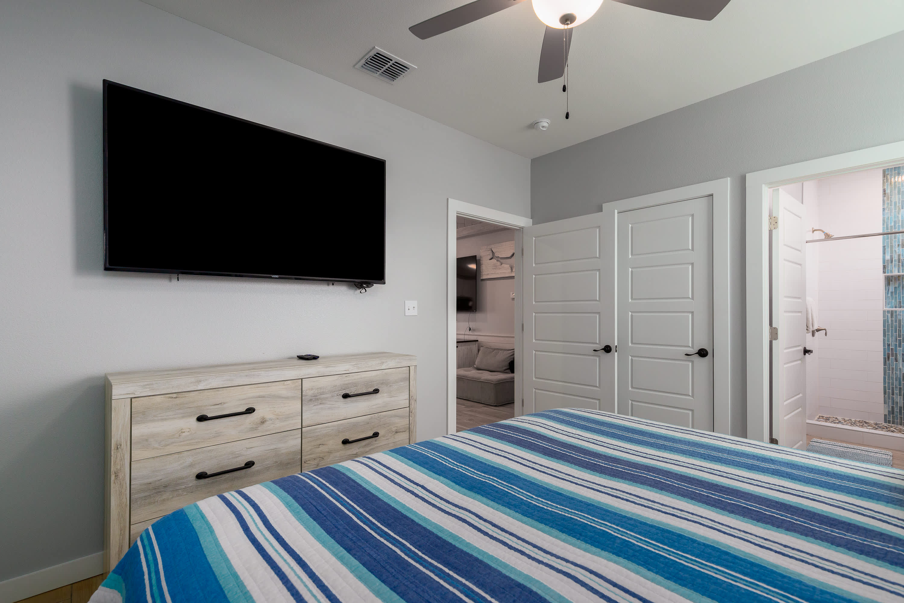 Bedroom #3 has a queen size bed, smart tv, and ensuite bathroom with shower/tub combo.