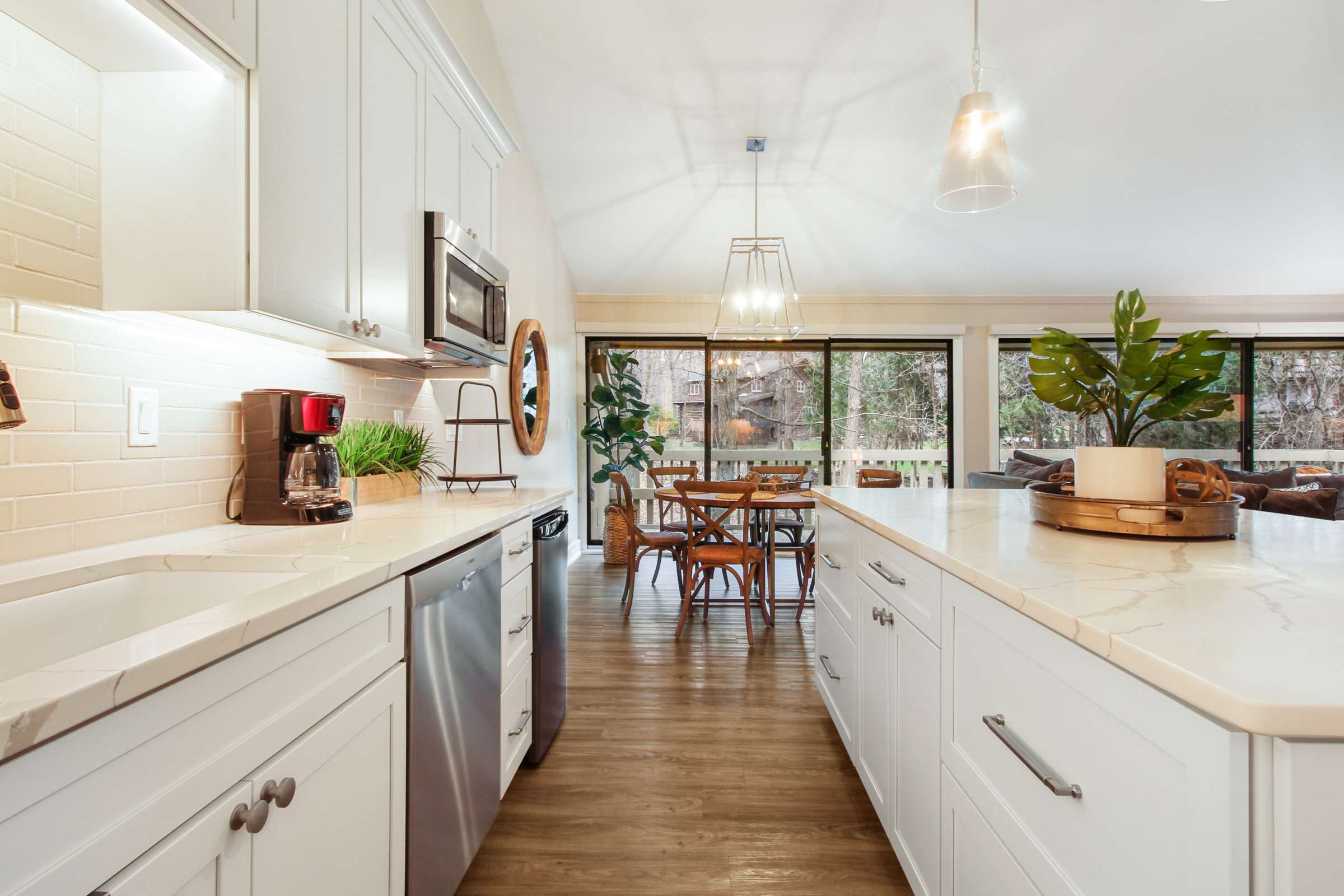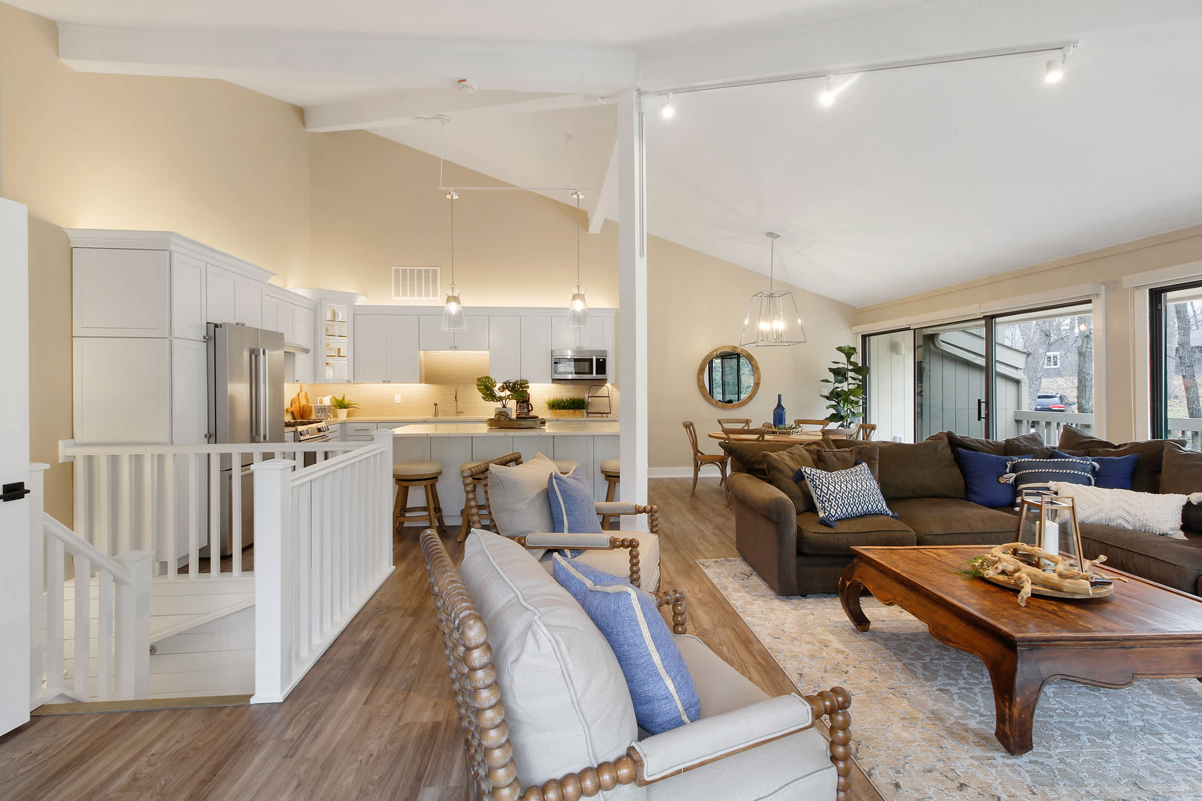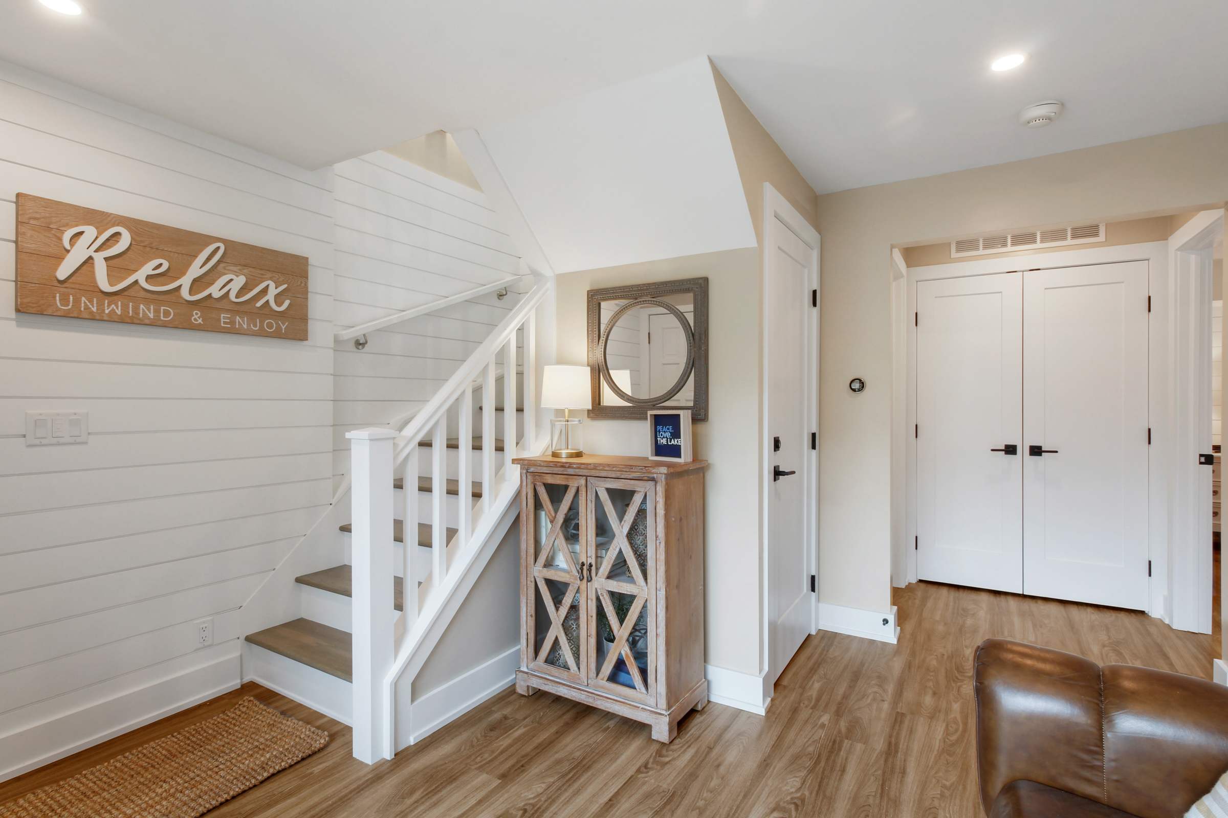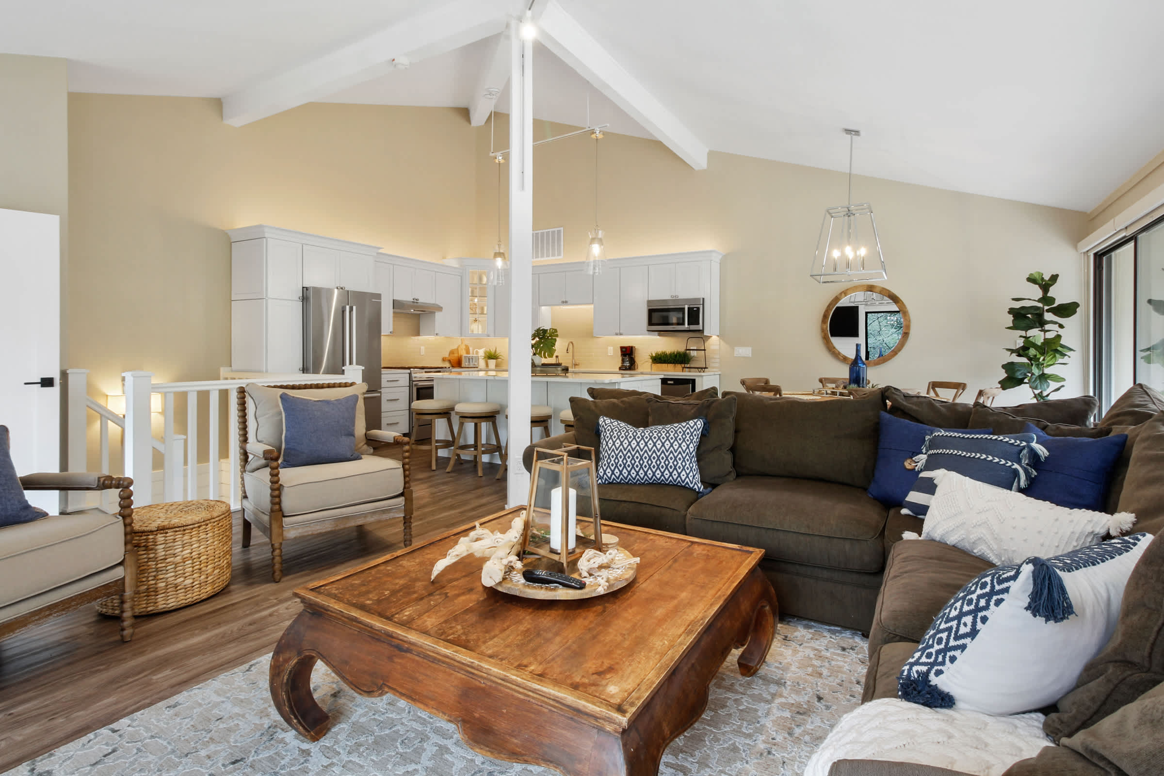 Heading indoors, bright and modern spaces provide much-needed rest and rejuvenation after long days adventuring in and around the lake, where everyone can spread out and find their own cozy corner. Sink into plush sofa seating in the living room while you stream all your favorite shows and movies on the smart TV. The open floor plan flows you right into the stylish kitchen, where home cooked meals come to life with help from stainless steel appliances, glossy stone countertops, and sleek cabinetry stocked with all the comforts of home. Gather the whole crew for formal dining at the circular table with seating for 6 or keep things casual up at the island on high-top stools for 4.