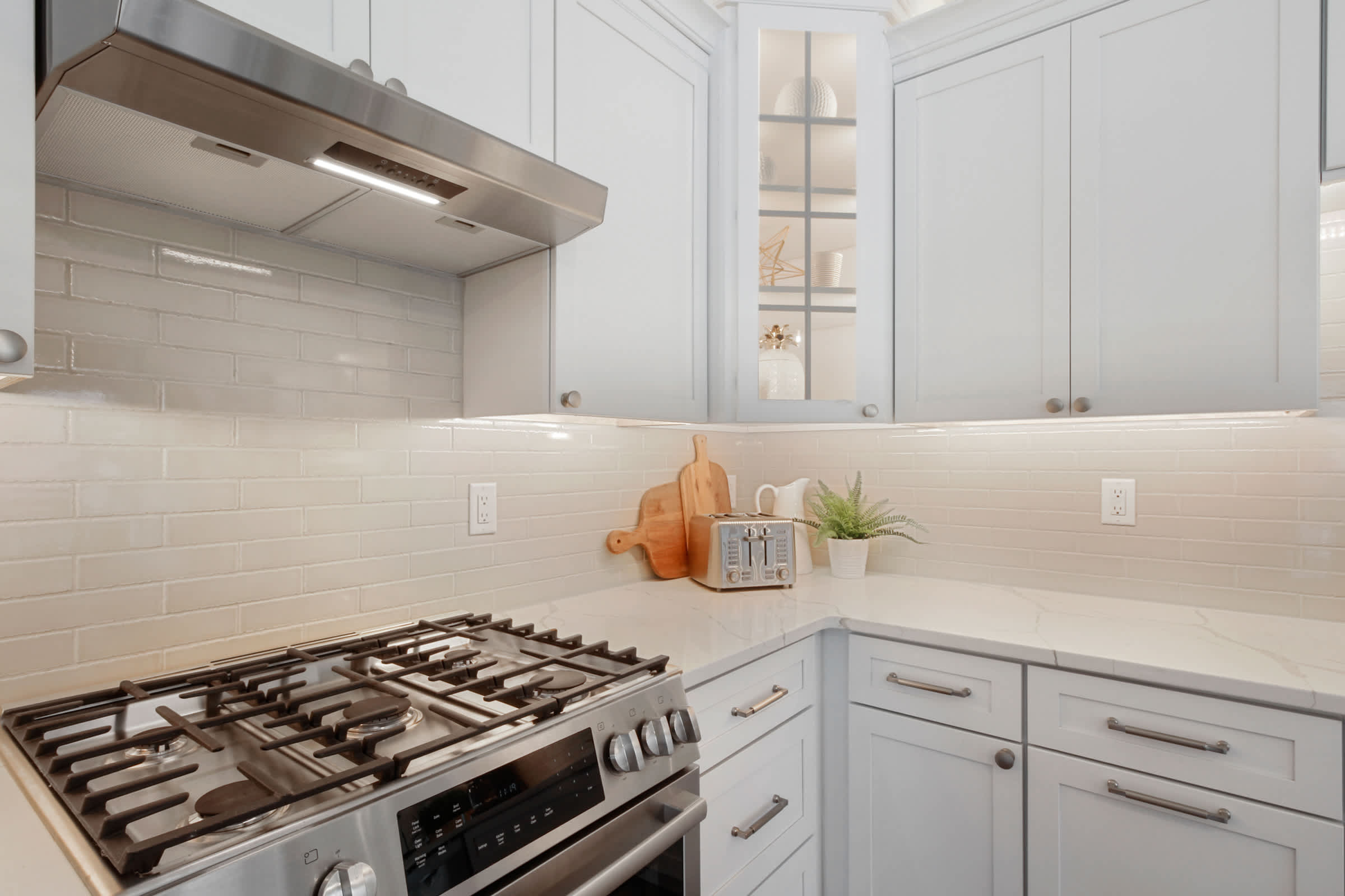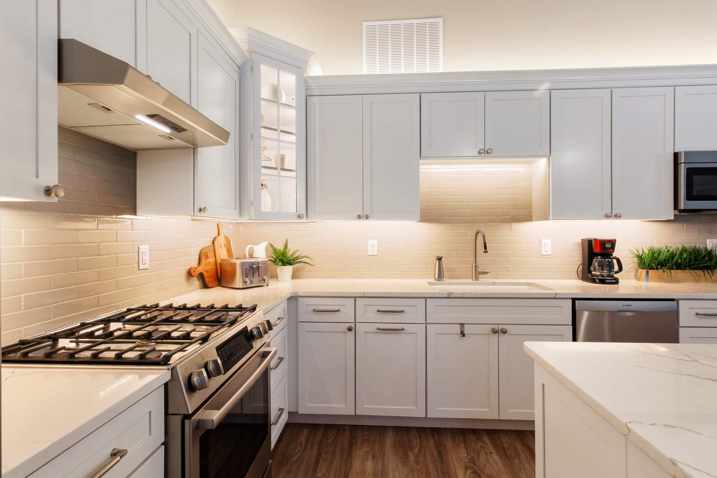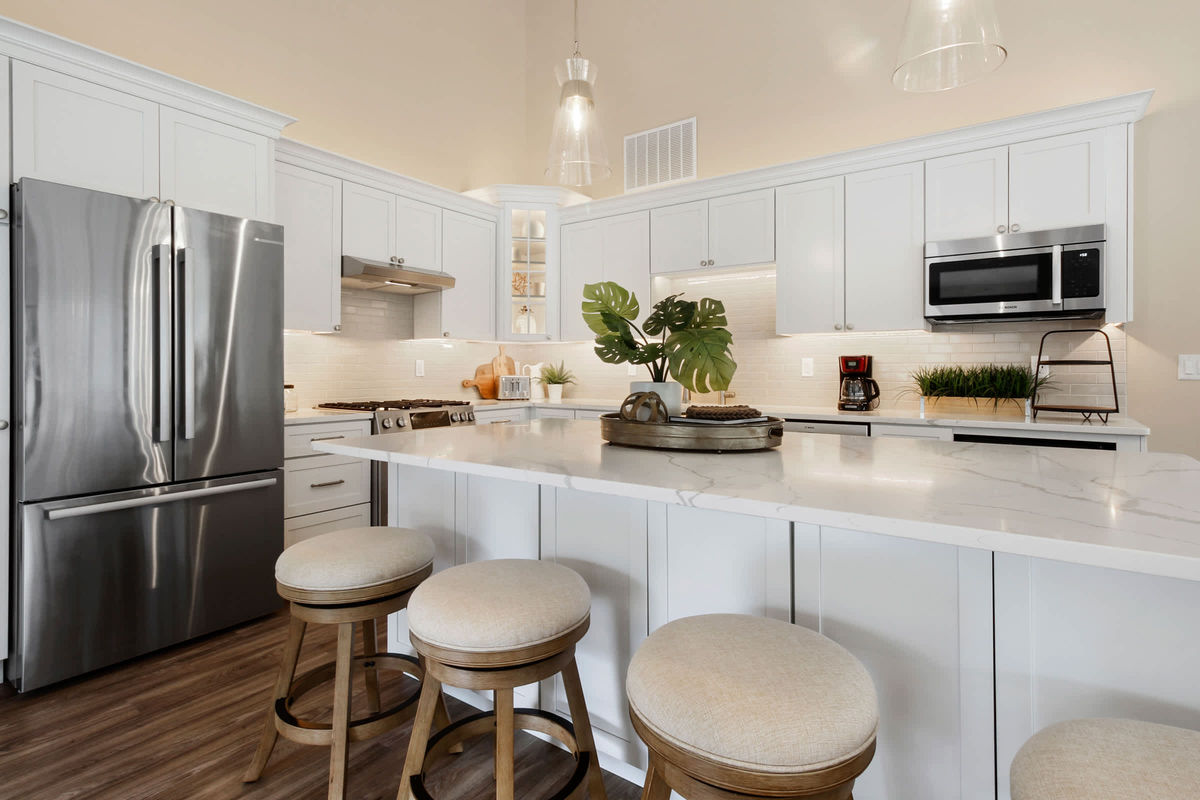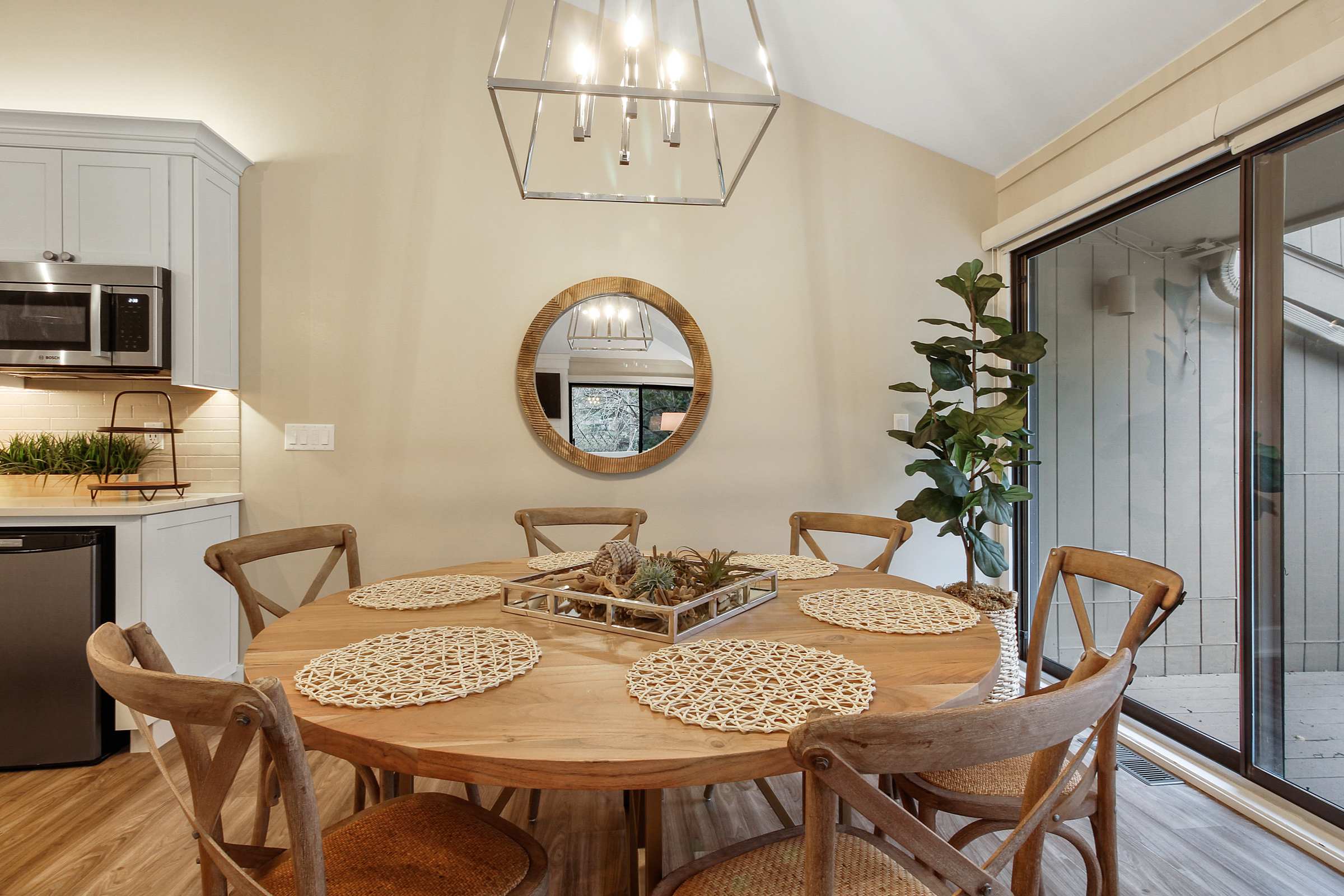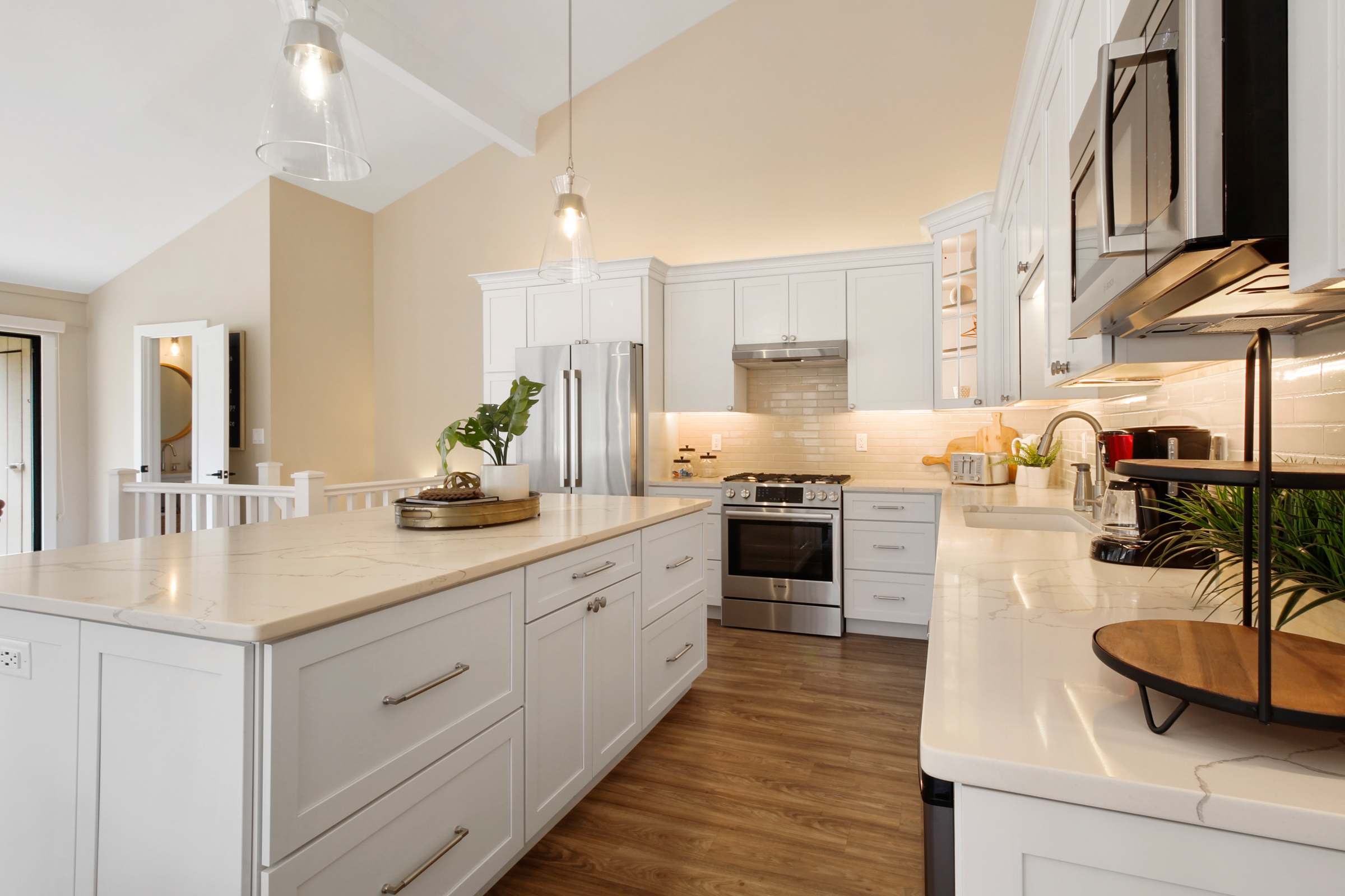 Heading indoors, bright and modern spaces provide much-needed rest and rejuvenation after long days adventuring in and around the lake, where everyone can spread out and find their own cozy corner. Sink into plush sofa seating in the living room while you stream all your favorite shows and movies on the smart TV. The open floor plan flows you right into the stylish kitchen, where home cooked meals come to life with help from stainless steel appliances, glossy stone countertops, and sleek cabinetry stocked with all the comforts of home. Gather the whole crew for formal dining at the circular table with seating for 6 or keep things casual up at the island on high-top stools for 4.